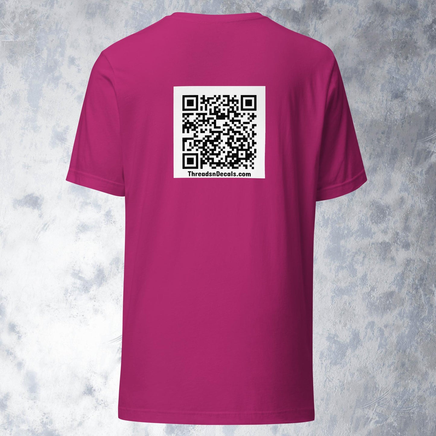 Get ready to turn heads with this unique QR code shirt. The clean front design keeps you casual, while the QR code on the back brings the person scanning it to an uplifting positive message.