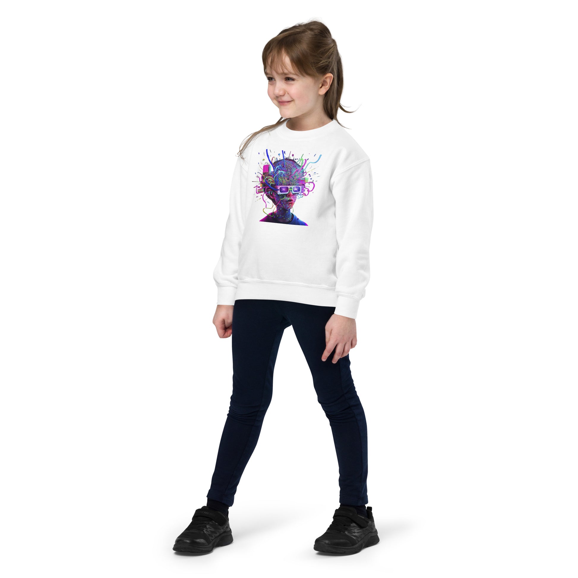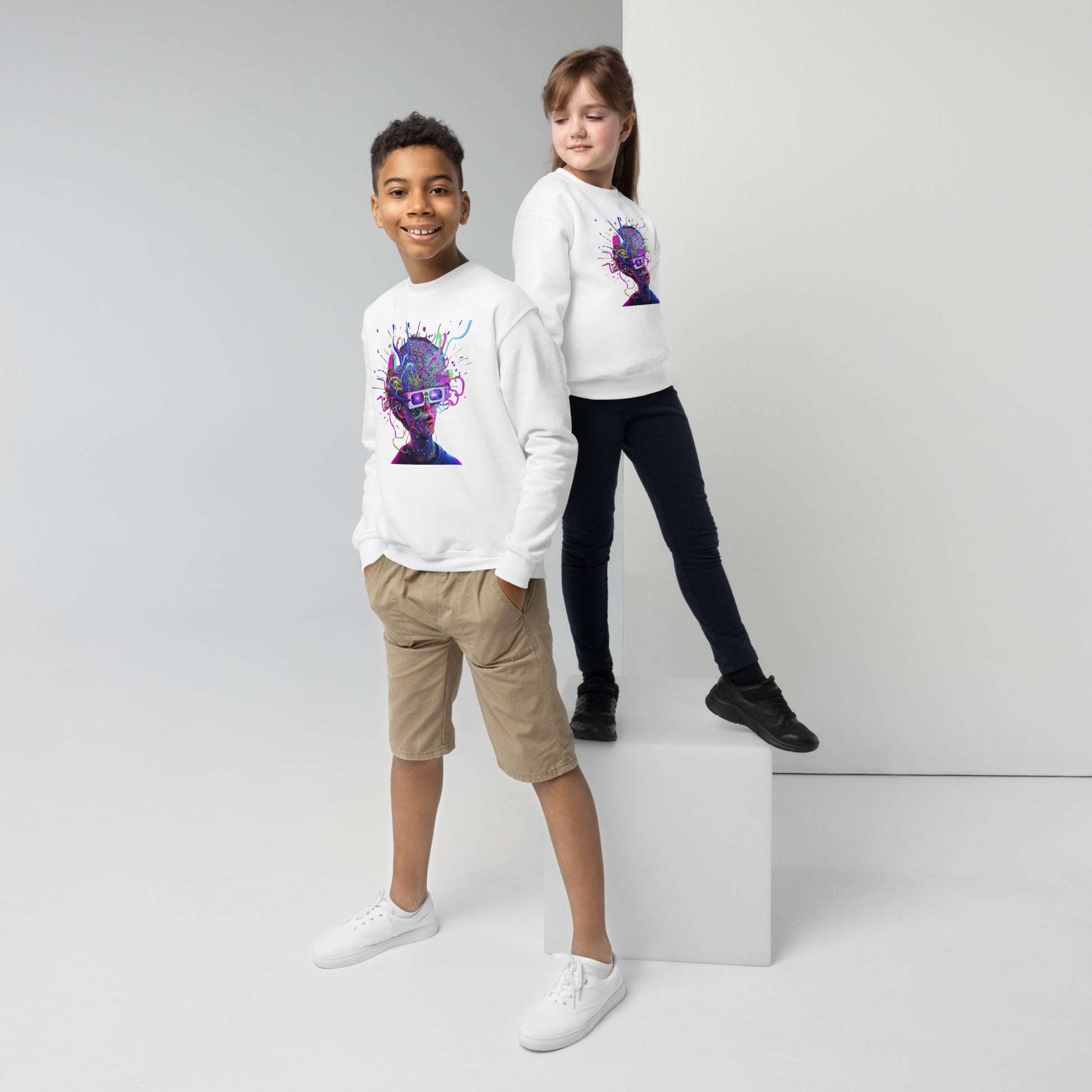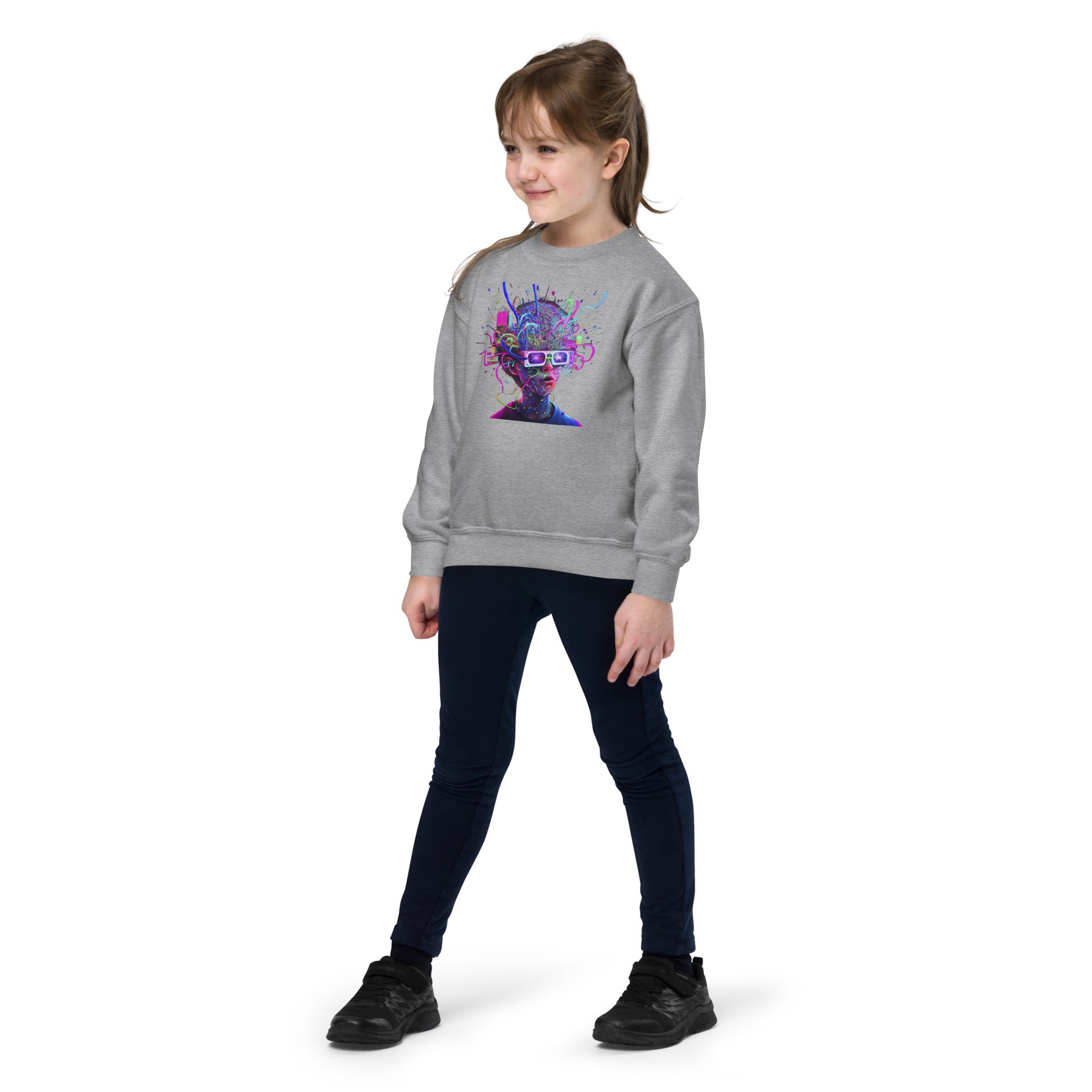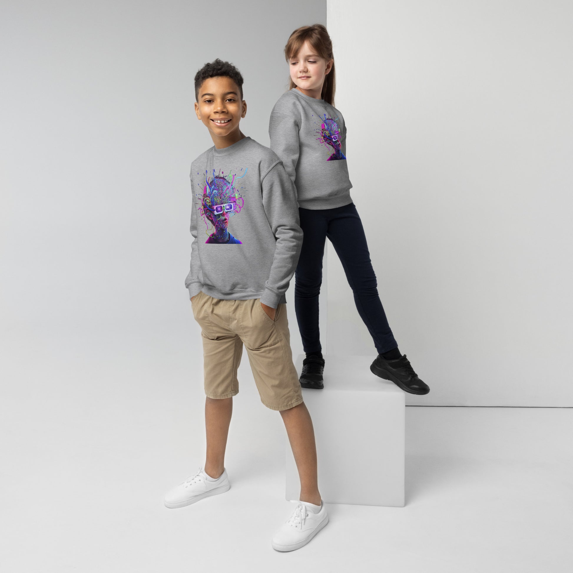This is an expression of pure joy and dynamic energy of youth with "Beautiful 3D Chaos by Fanzo." The design, featuring a burst of colorful 3D elements, is printed on a classic sweatshirt that's paired with a whimsical tulle skirt, showcasing the creativity and freedom of children's fashion. This image radiates happiness and movement, as the young girl leaps with a backdrop that's just as playful and bright as her outfit, perfectly blending the lines between everyday wear and the imagination-fueled playtime of childhood. Cozy and cool, this youth crewneck sweatshirt is designed for every adventure. Made from soft fleece fabric, it’s easy to wear and hassle-free to wash. Whether headed out or snuggled up on the couch, the younger crowd will love the look and feel of this sweatshirt.