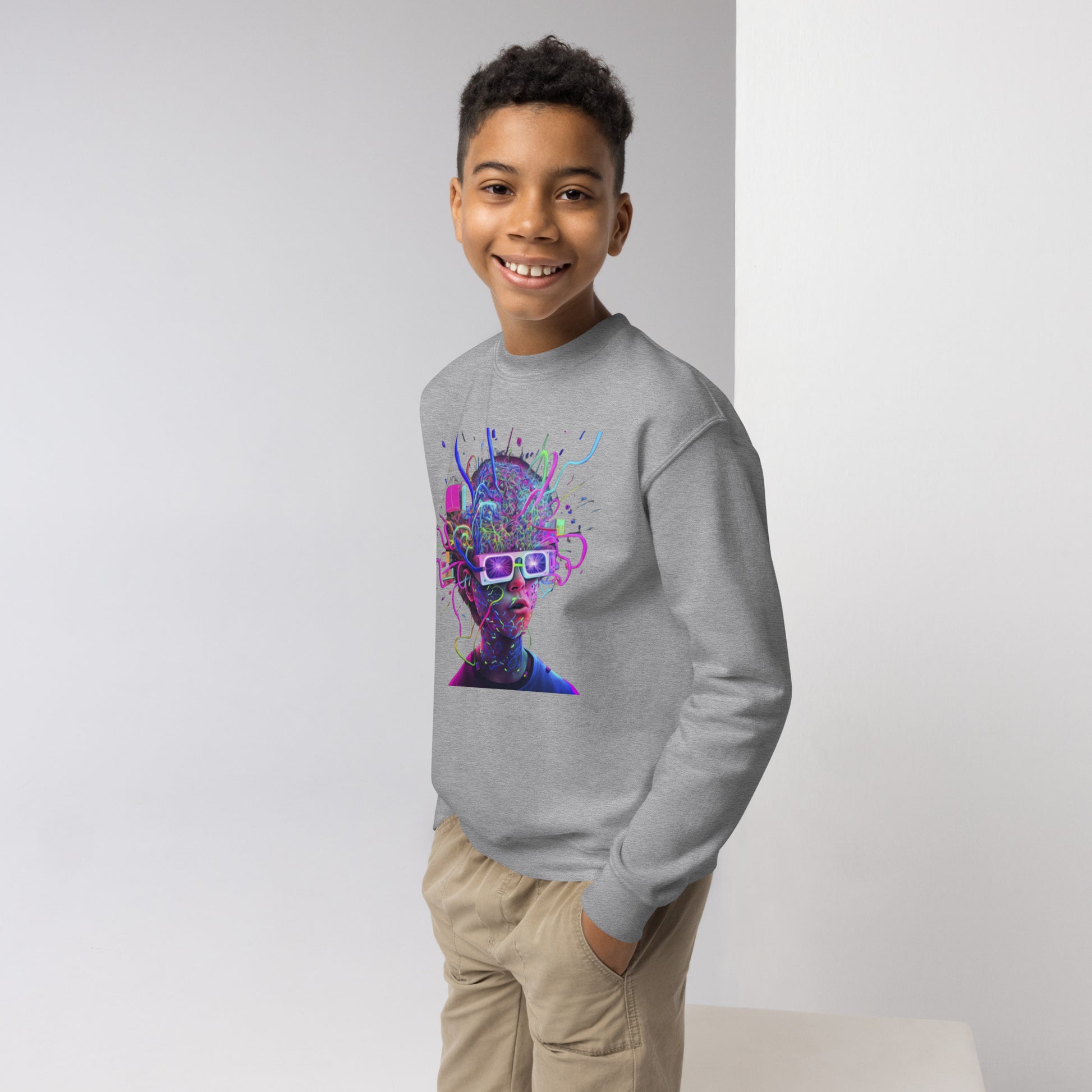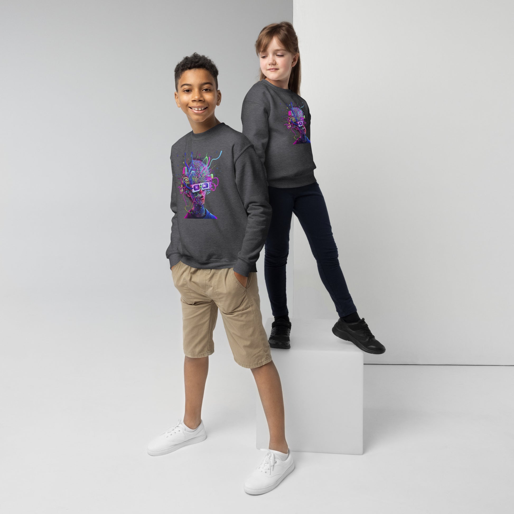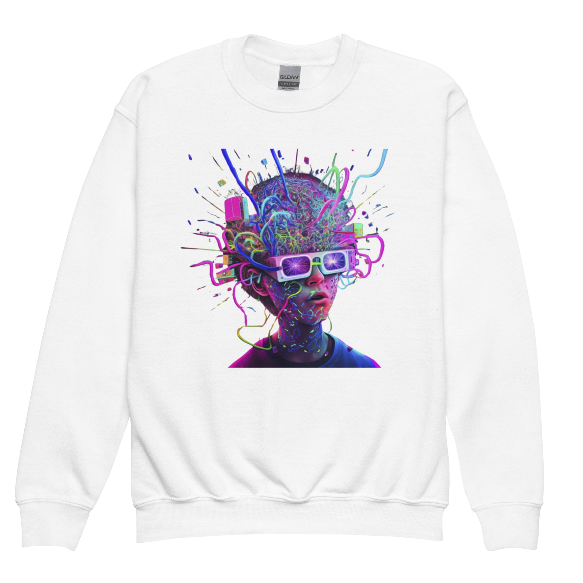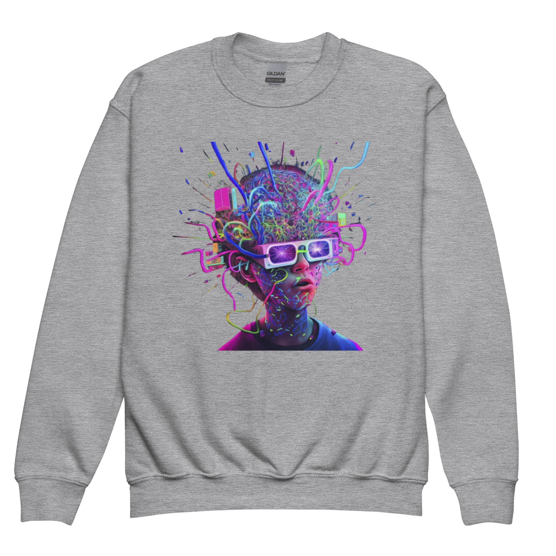 This is an expression of pure joy and dynamic energy of youth with "Beautiful 3D Chaos by Fanzo." The design, featuring a burst of colorful 3D elements, is printed on a classic sweatshirt that's paired with a whimsical tulle skirt, showcasing the creativity and freedom of children's fashion. This image radiates happiness and movement, as the young girl leaps with a backdrop that's just as playful and bright as her outfit, perfectly blending the lines between everyday wear and the imagination-fueled playtime of childhood. Cozy and cool, this youth crewneck sweatshirt is designed for every adventure. Made from soft fleece fabric, it’s easy to wear and hassle-free to wash. Whether headed out or snuggled up on the couch, the younger crowd will love the look and feel of this sweatshirt.