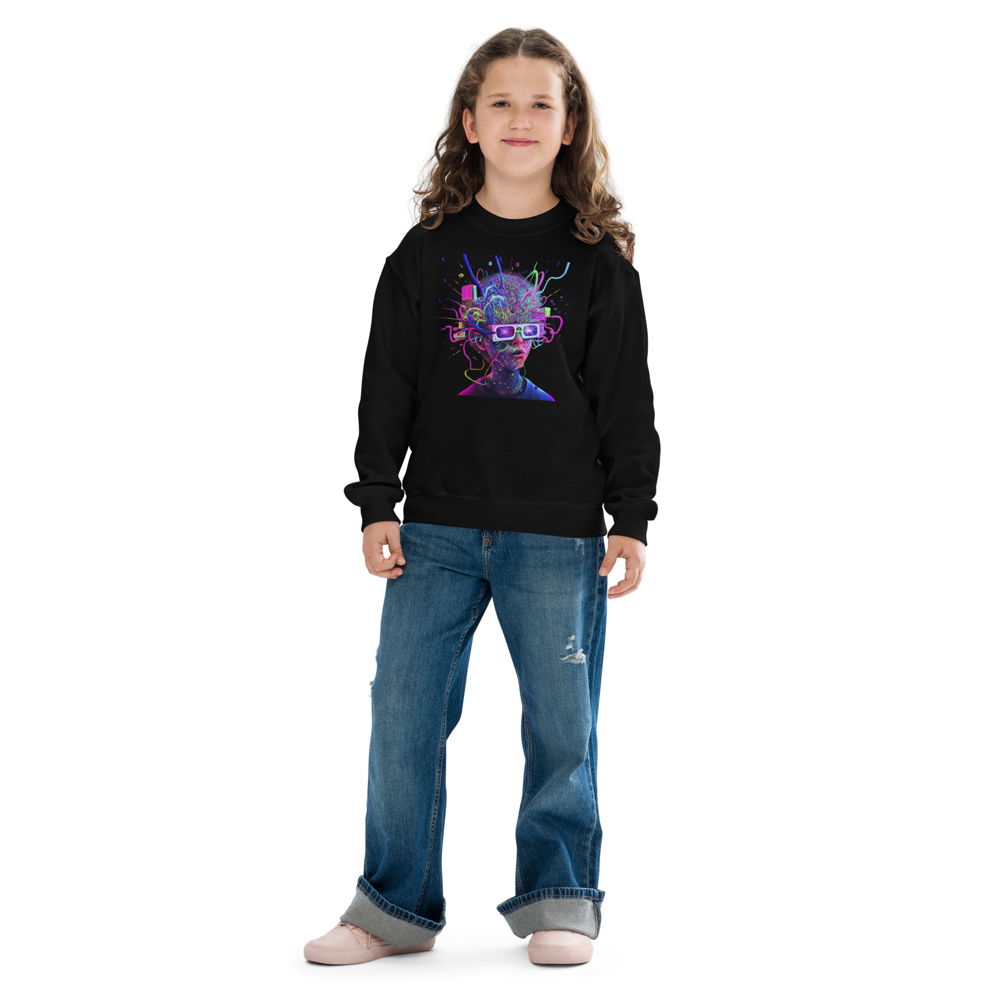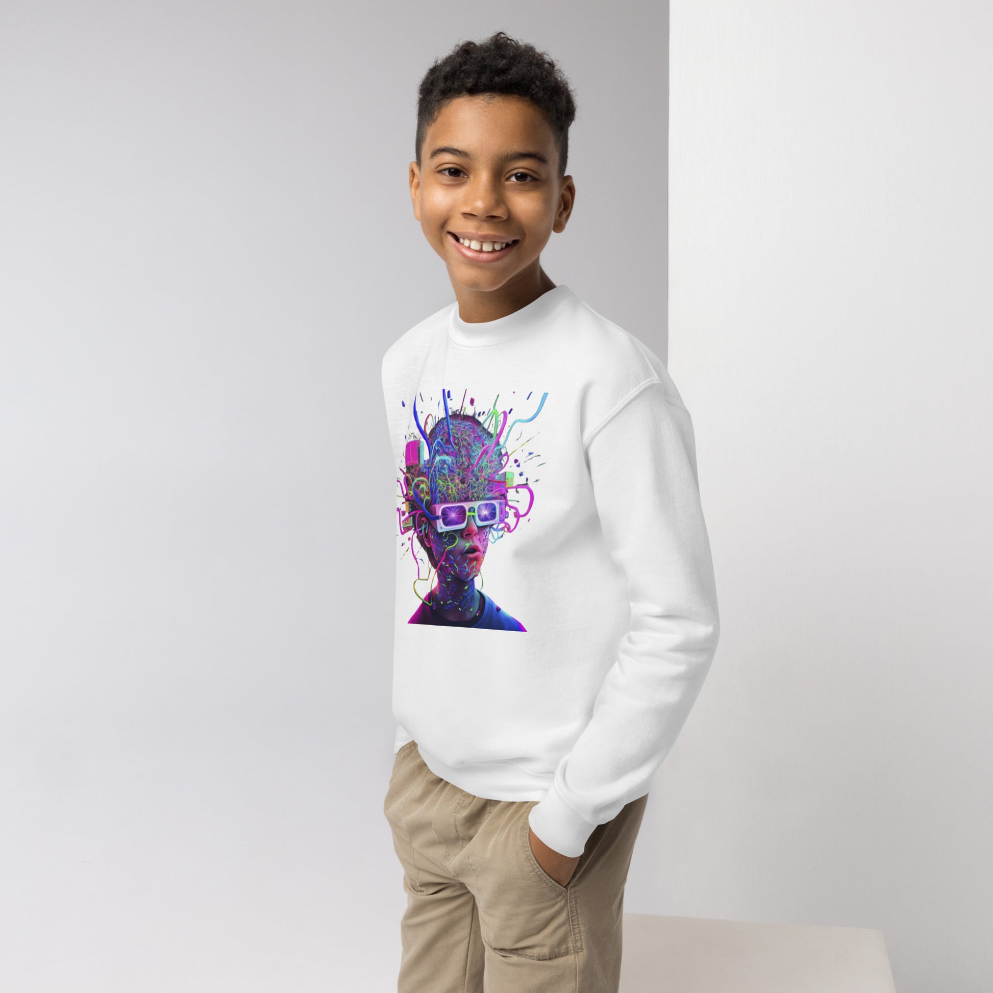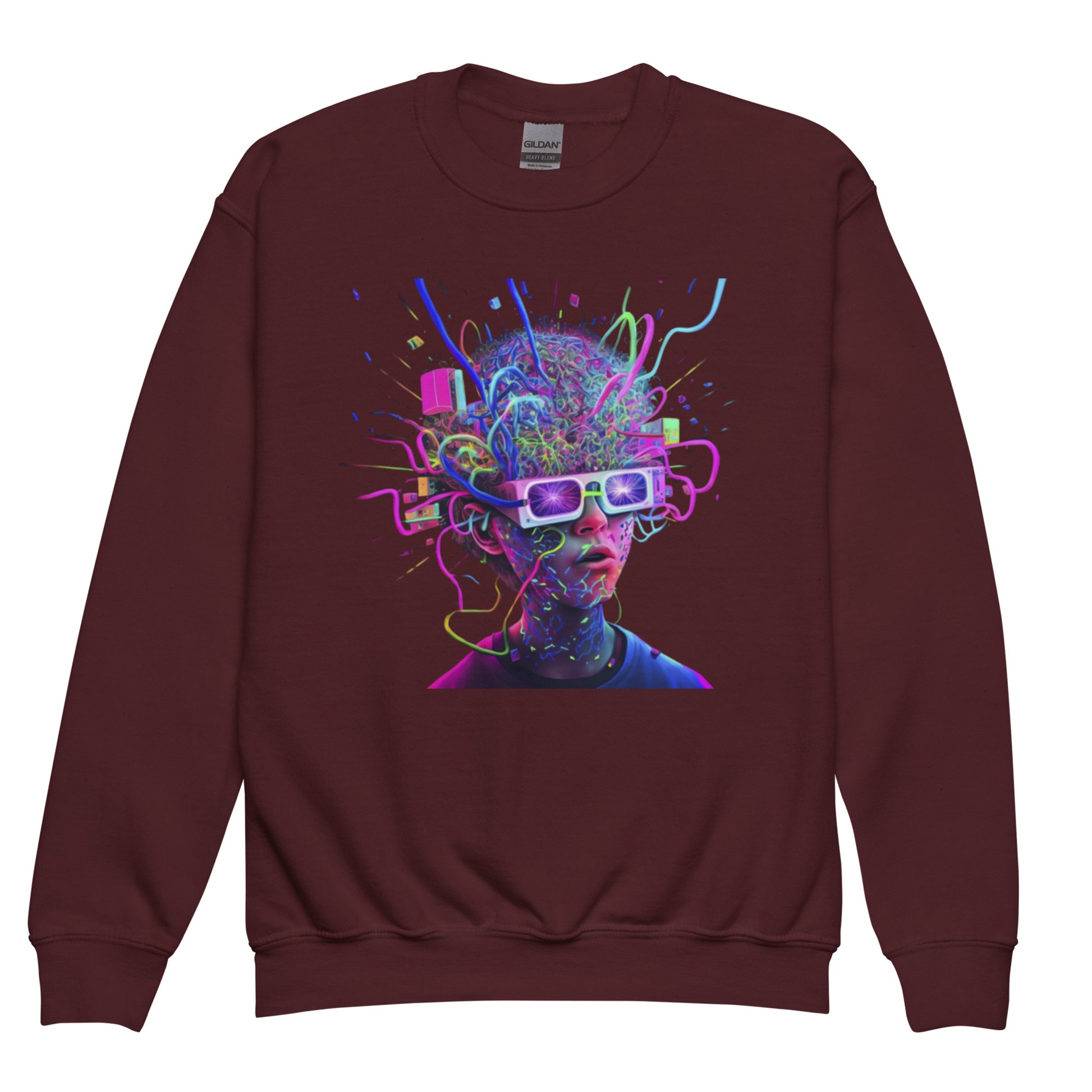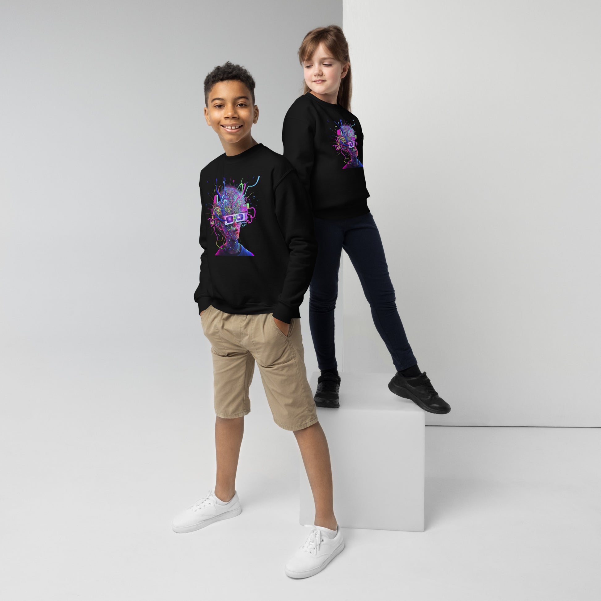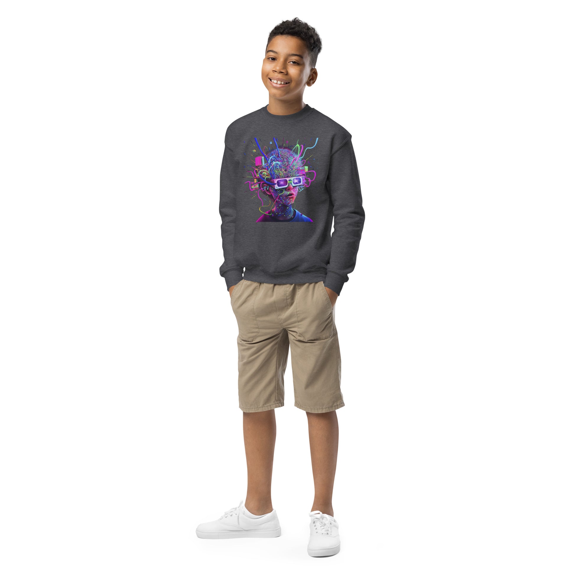 This is an expression of pure joy and dynamic energy of youth with "Beautiful 3D Chaos by Fanzo." The design, featuring a burst of colorful 3D elements, is printed on a classic sweatshirt that's paired with a whimsical tulle skirt, showcasing the creativity and freedom of children's fashion. This image radiates happiness and movement, as the young girl leaps with a backdrop that's just as playful and bright as her outfit, perfectly blending the lines between everyday wear and the imagination-fueled playtime of childhood. Cozy and cool, this youth crewneck sweatshirt is designed for every adventure. Made from soft fleece fabric, it’s easy to wear and hassle-free to wash. Whether headed out or snuggled up on the couch, the younger crowd will love the look and feel of this sweatshirt.
