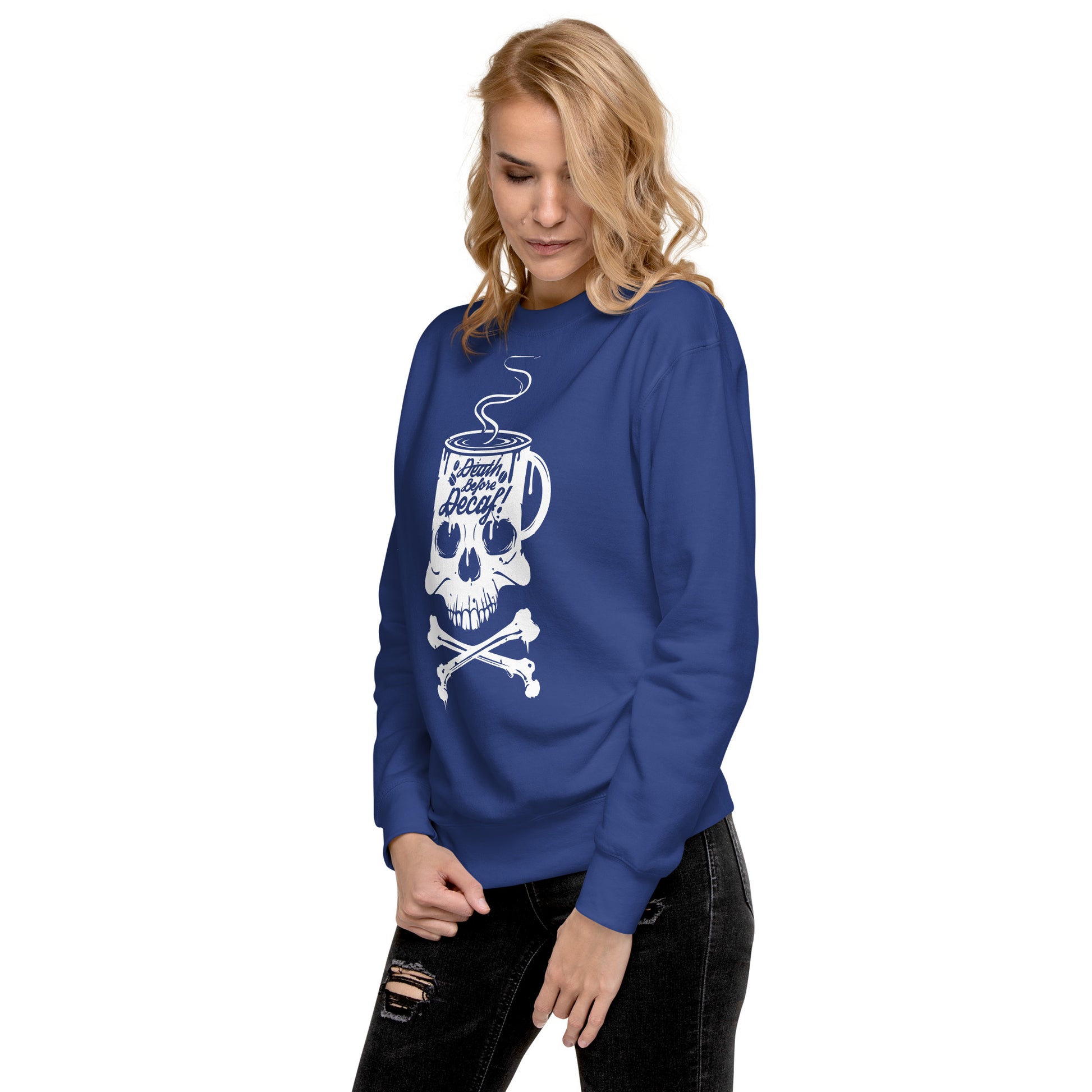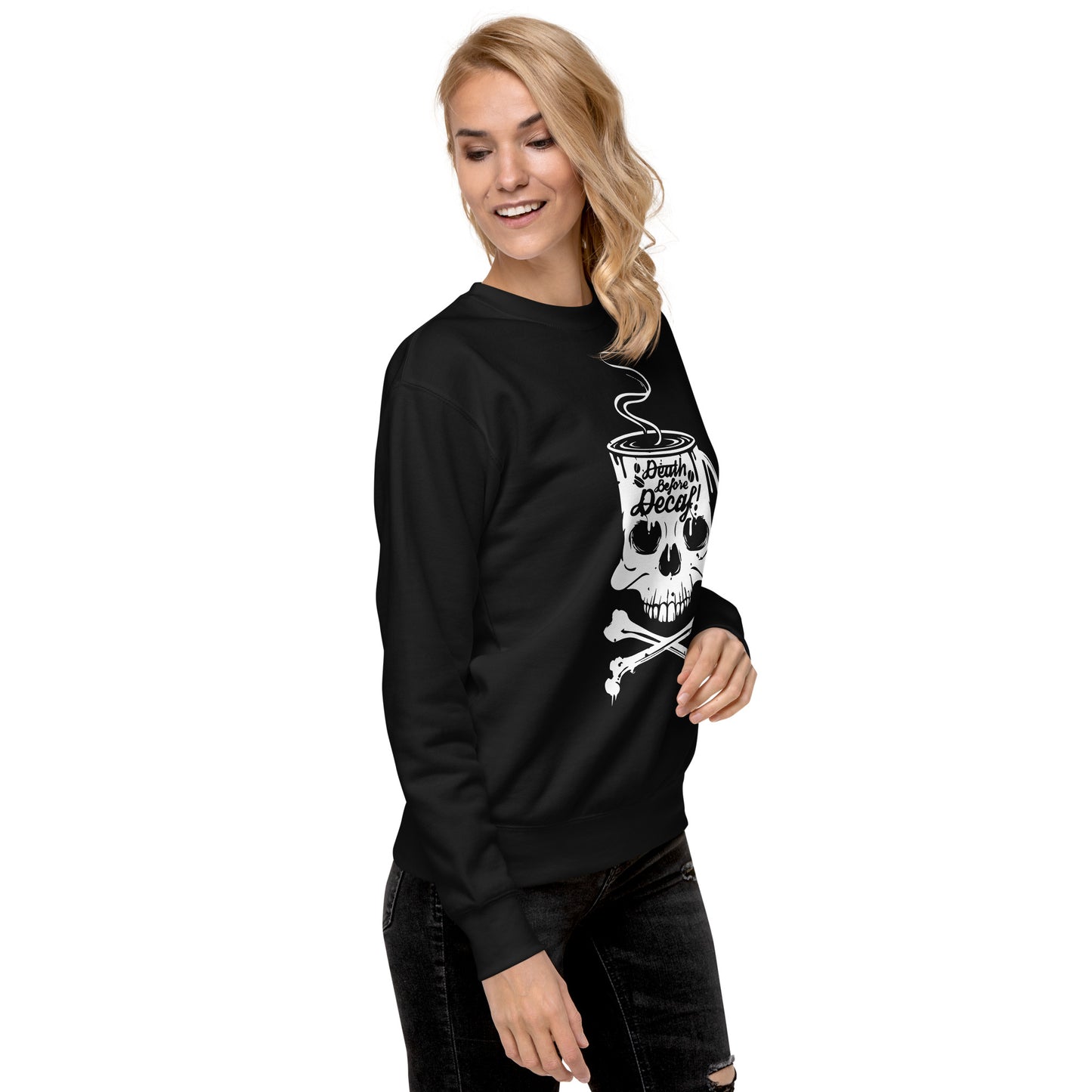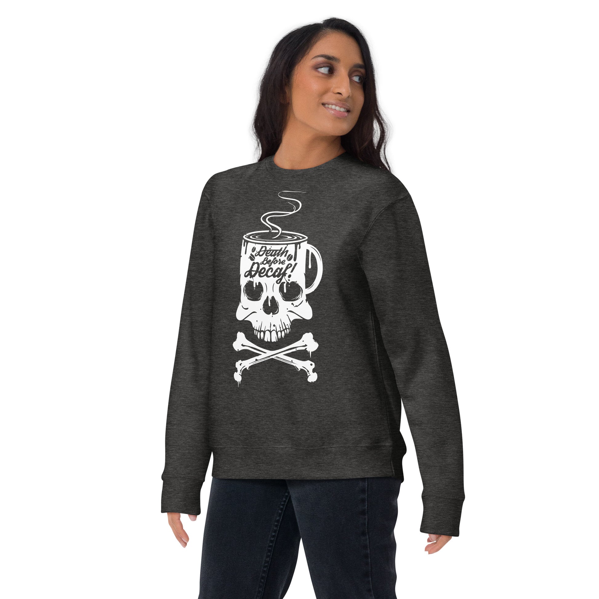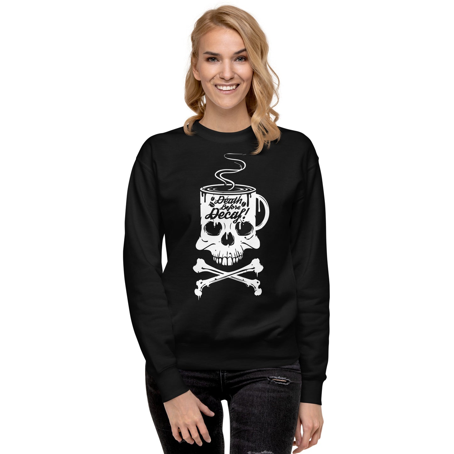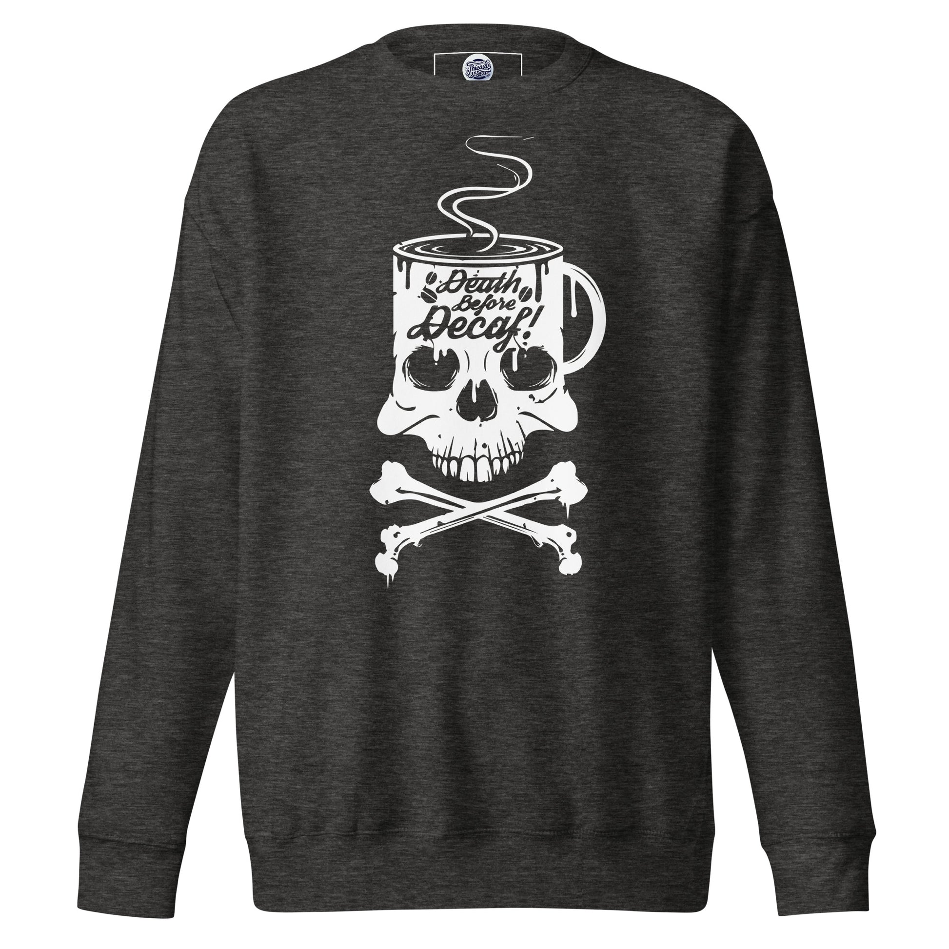 Unleash the rebel barista within you with our "Death Before Decaf" sweatshirt! It's the ultimate statement piece for those who believe life’s too short for bad coffee. This sweatshirt features a skull and crossbones with a twist—where the skull enjoys a steamy cup of the good stuff. It's not just a bold fashion choice; it's a lifestyle decree for the caffeine devotees who take their coffee like they take life: full-strength and unfiltered. Dare to wear this emblem of resistance against the tyranny of decaffeinated beverages. Perfect for those chilly mornings when only the darkest roast will do to resurrect your spirit. Get ready to rattle the coffee cups of the world with this audacious display of devotion to the bean! Rock a classic sweatshirt silhouette with ribbed crew neck, long sleeve cuffs, and a flat hem. Layer it up or wear it on its own for a contemporary streetwear look. With the soft fleece inside and comfortable fit, it’s sure to become your favorite everyday sweater right away!