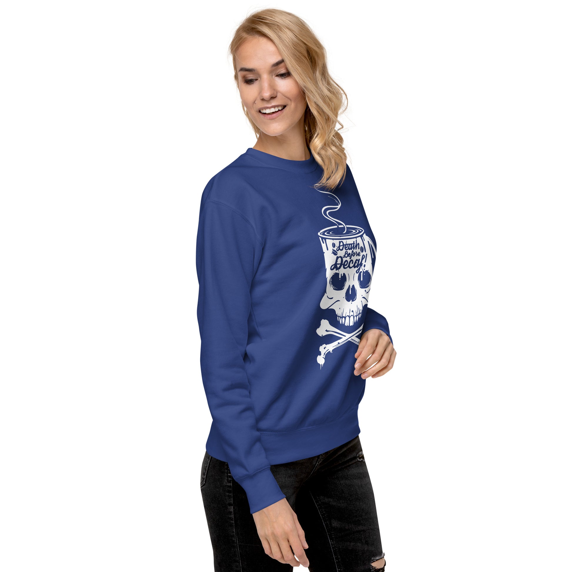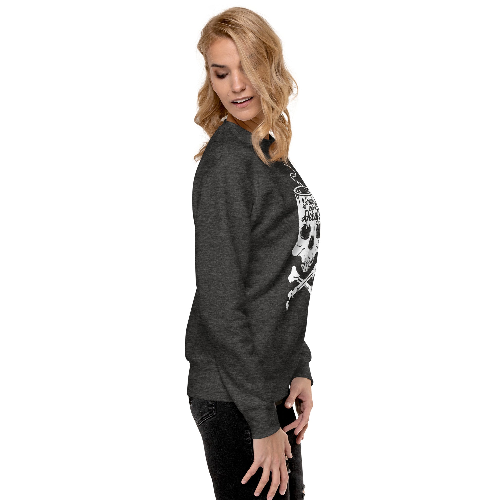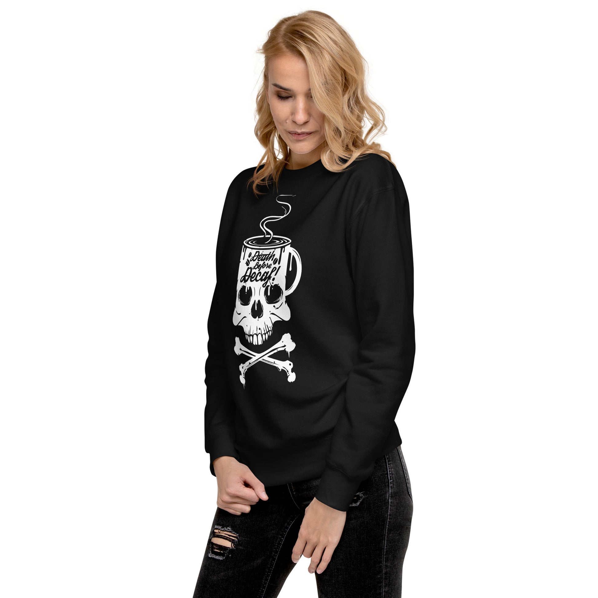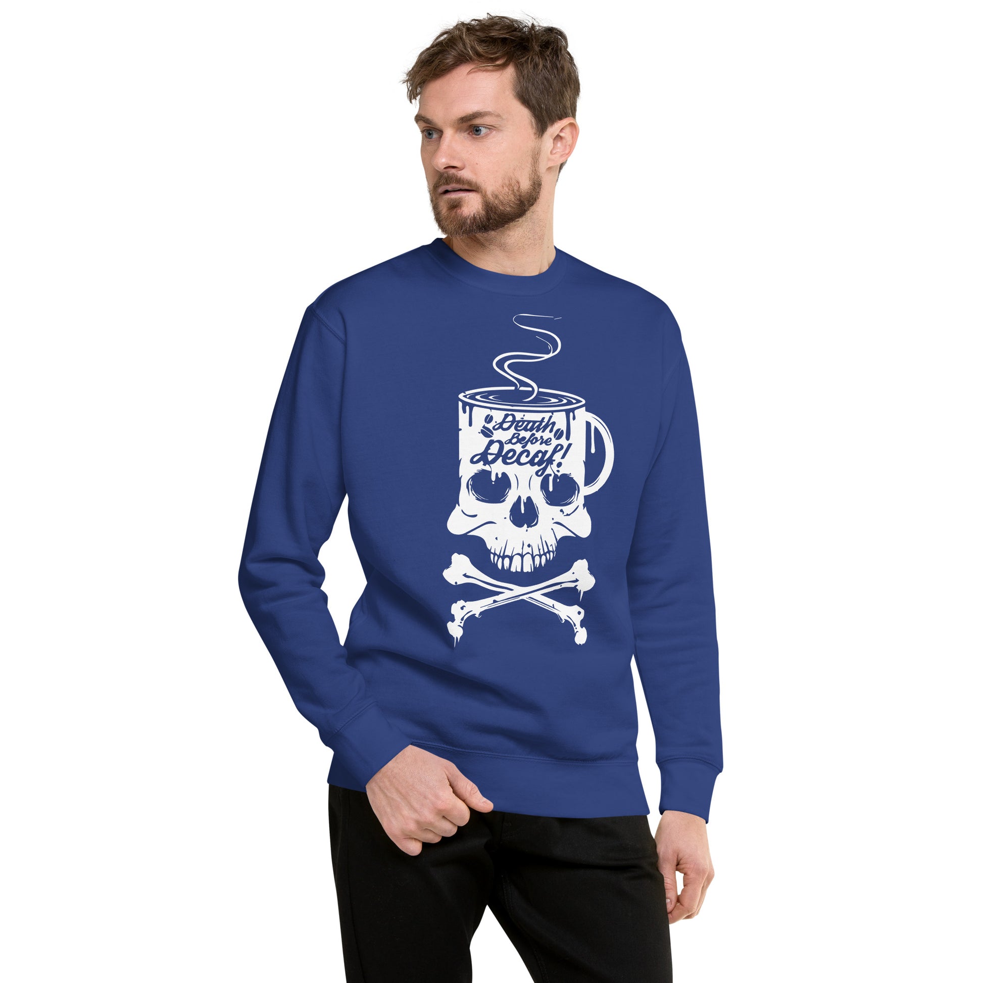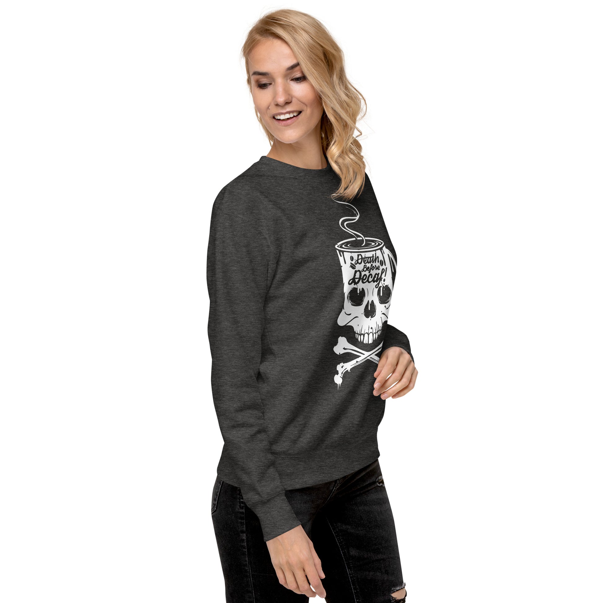 Unleash the rebel barista within you with our "Death Before Decaf" sweatshirt! It's the ultimate statement piece for those who believe life’s too short for bad coffee. This sweatshirt features a skull and crossbones with a twist—where the skull enjoys a steamy cup of the good stuff. It's not just a bold fashion choice; it's a lifestyle decree for the caffeine devotees who take their coffee like they take life: full-strength and unfiltered. Dare to wear this emblem of resistance against the tyranny of decaffeinated beverages. Perfect for those chilly mornings when only the darkest roast will do to resurrect your spirit. Get ready to rattle the coffee cups of the world with this audacious display of devotion to the bean! Rock a classic sweatshirt silhouette with ribbed crew neck, long sleeve cuffs, and a flat hem. Layer it up or wear it on its own for a contemporary streetwear look. With the soft fleece inside and comfortable fit, it’s sure to become your favorite everyday sweater right away!
