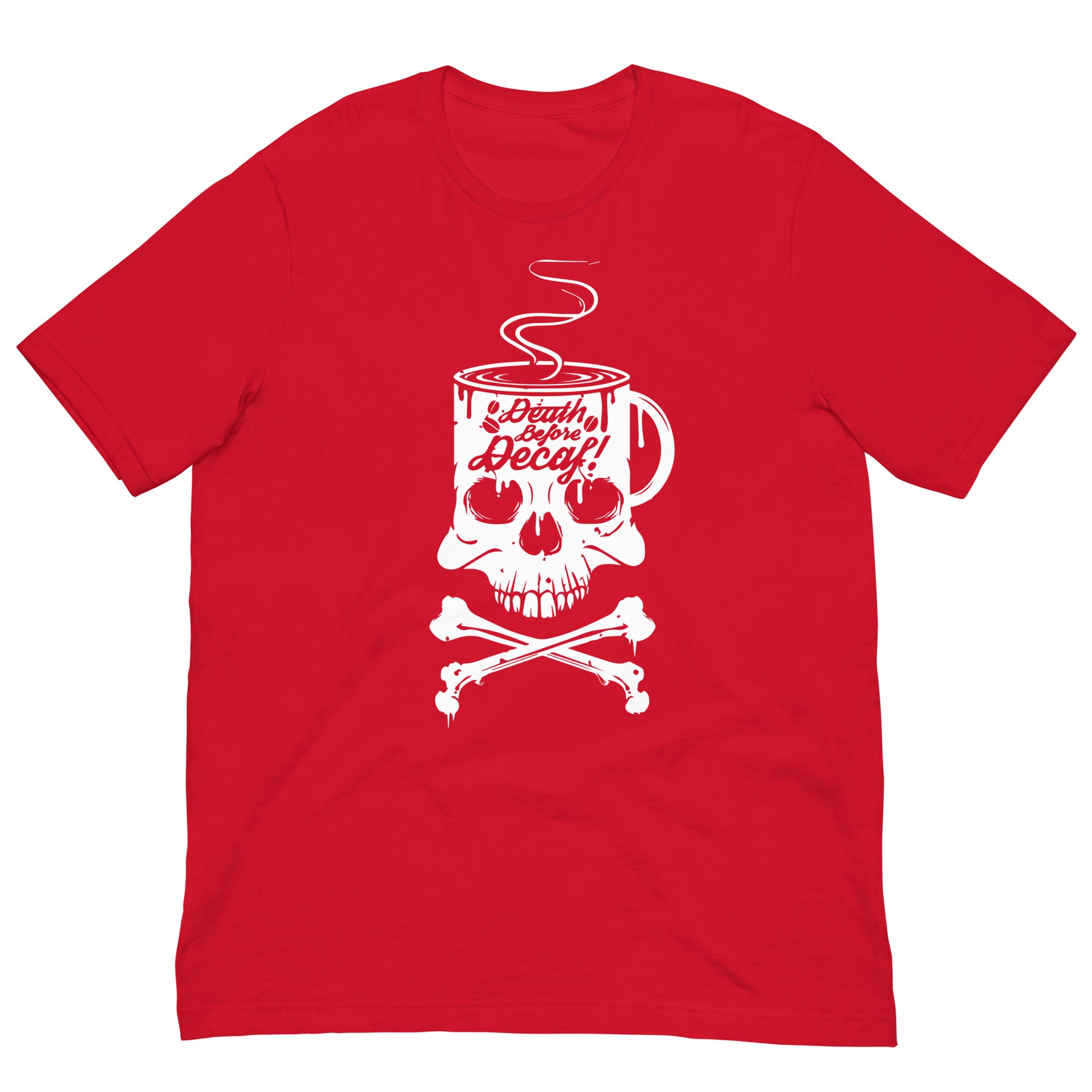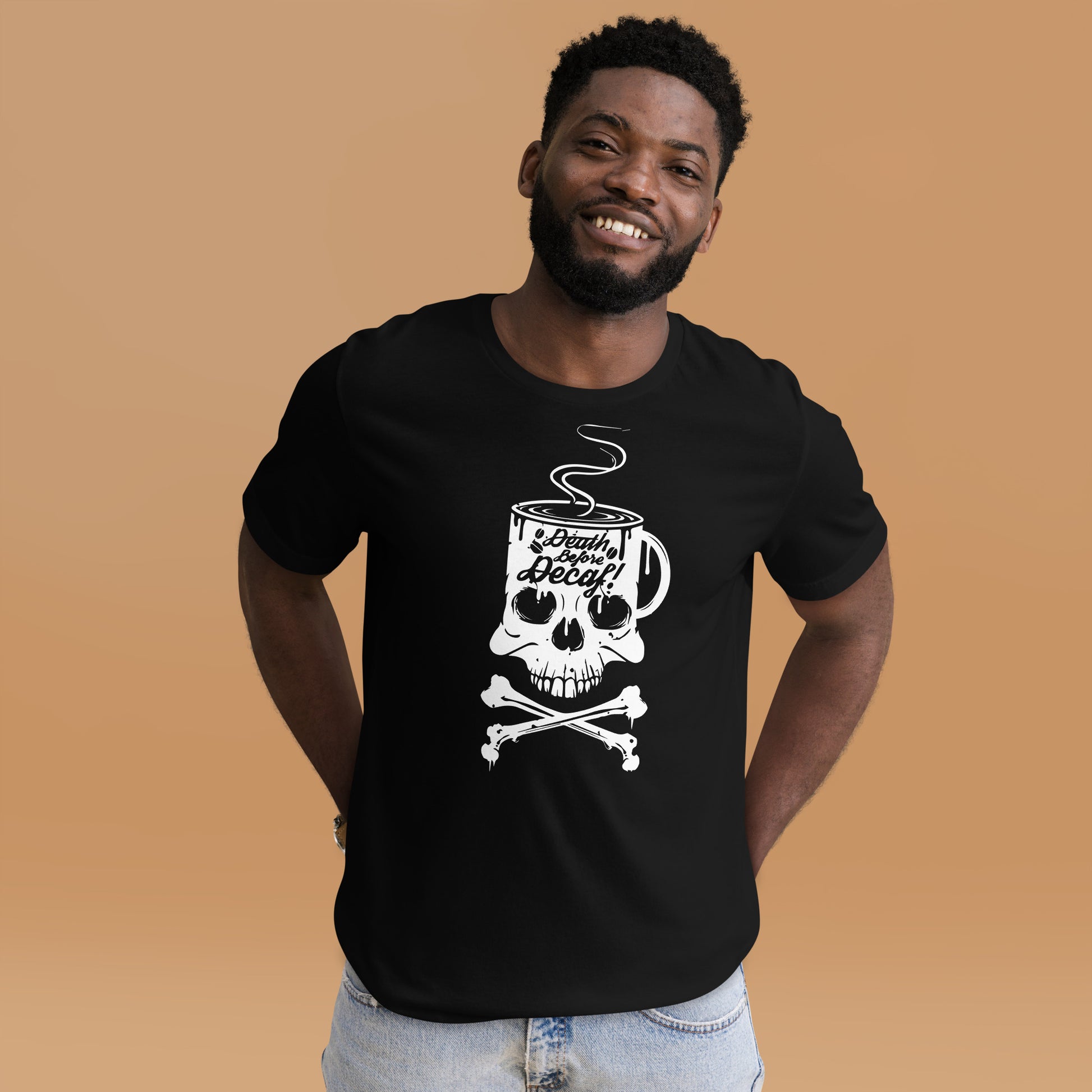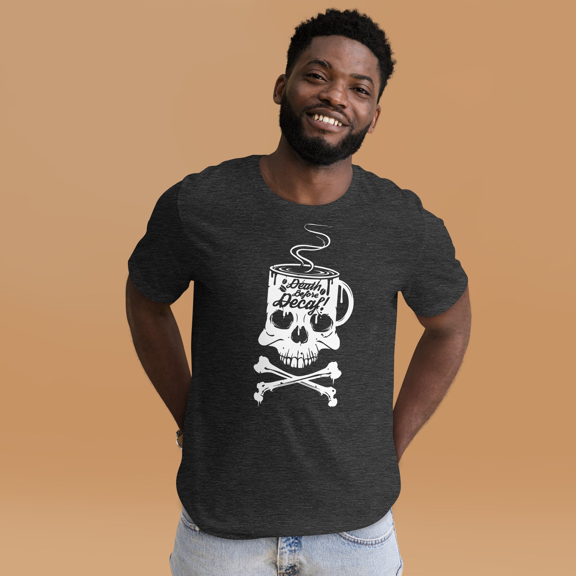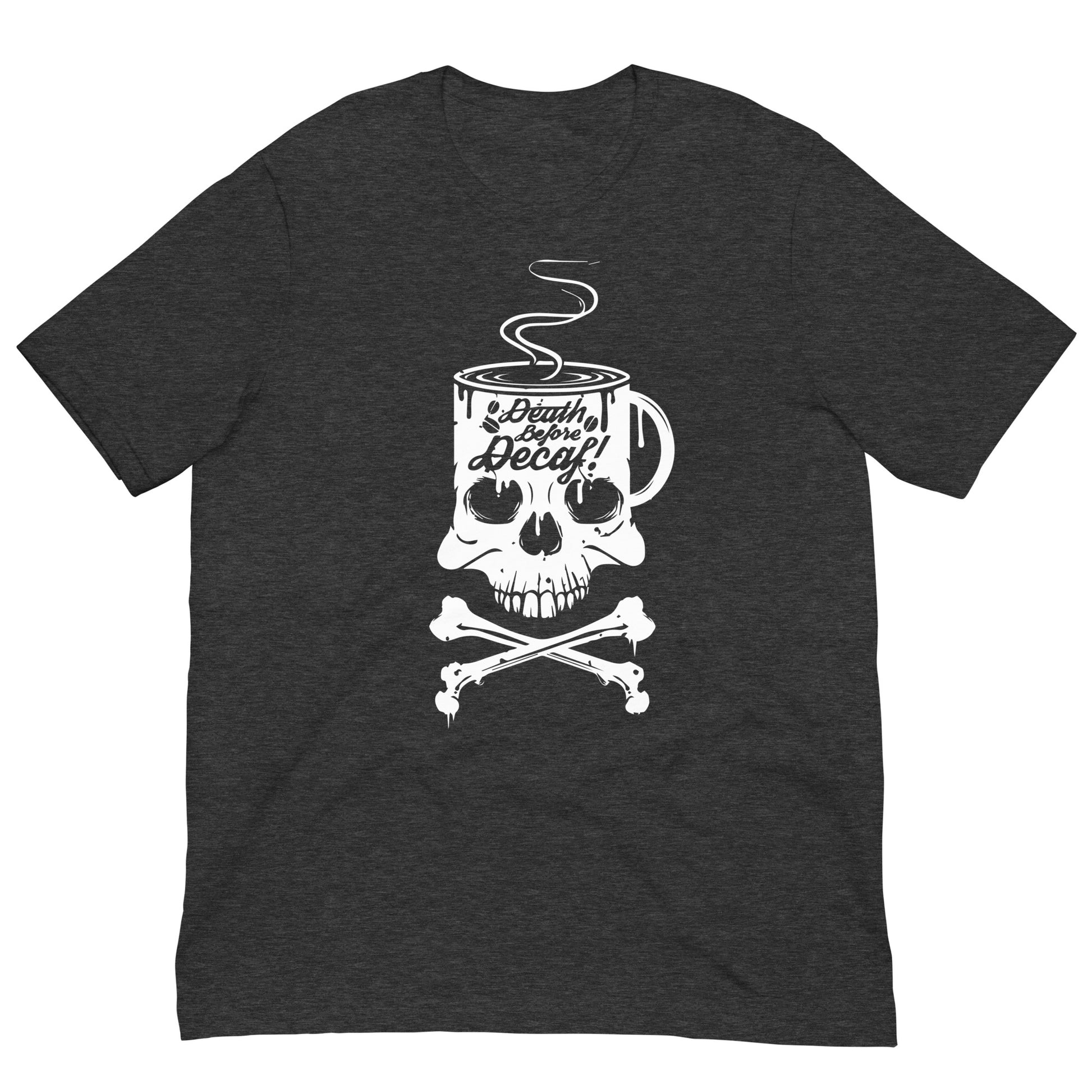 Unleash the rebel barista within you with our "Death Before Decaf" T-Shirt! It's the ultimate statement piece for those who believe life’s too short for bad coffee. This T-Shirt features a skull and crossbones with a twist—where the skull enjoys a steamy cup of the good stuff. It's not just a bold fashion choice; it's a lifestyle decree for the caffeine devotees who take their coffee like they take life: full-strength and unfiltered. Dare to wear this emblem of resistance against the tyranny of decaffeinated beverages. Perfect for those chilly mornings when only the darkest roast will do to resurrect your spirit. Get ready to rattle the coffee cups of the world with this audacious display of devotion to the bean!This t-shirt is everything you've dreamed of and more. It feels soft and lightweight, with the right amount of stretch. It's comfortable and flattering for all.