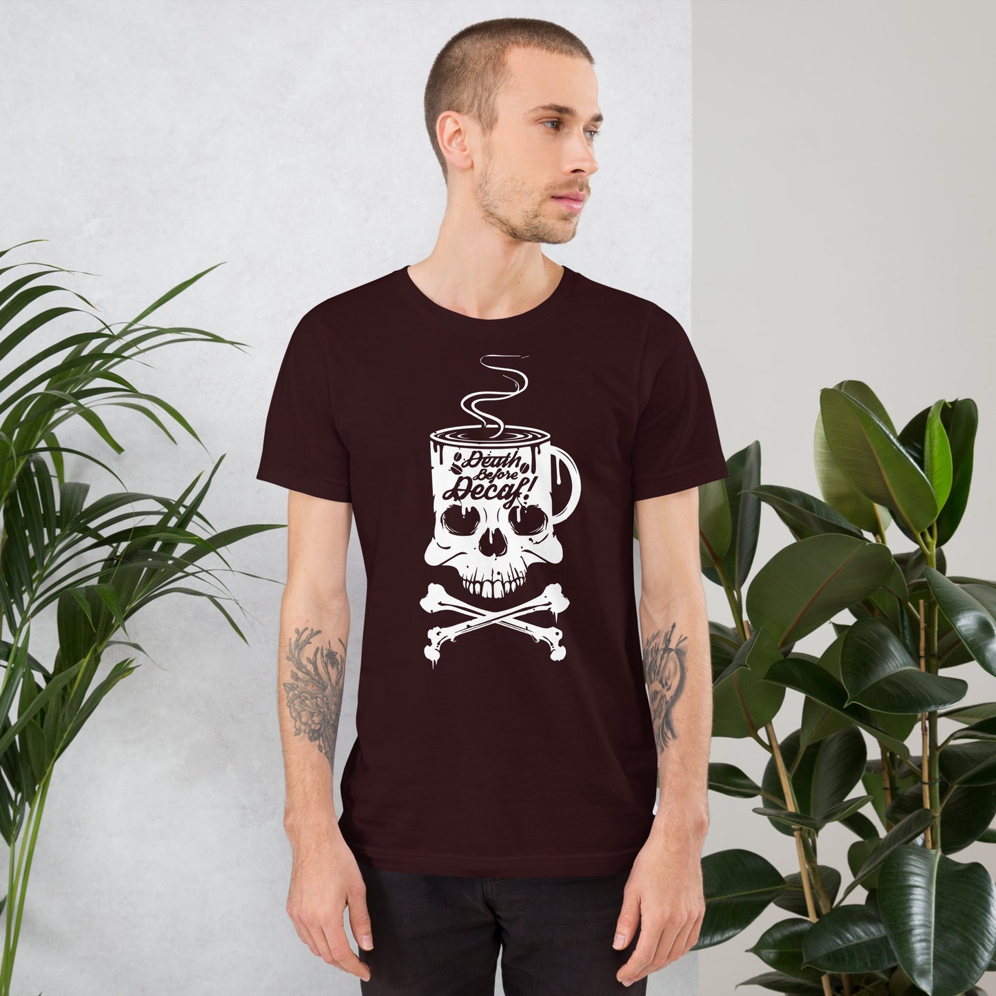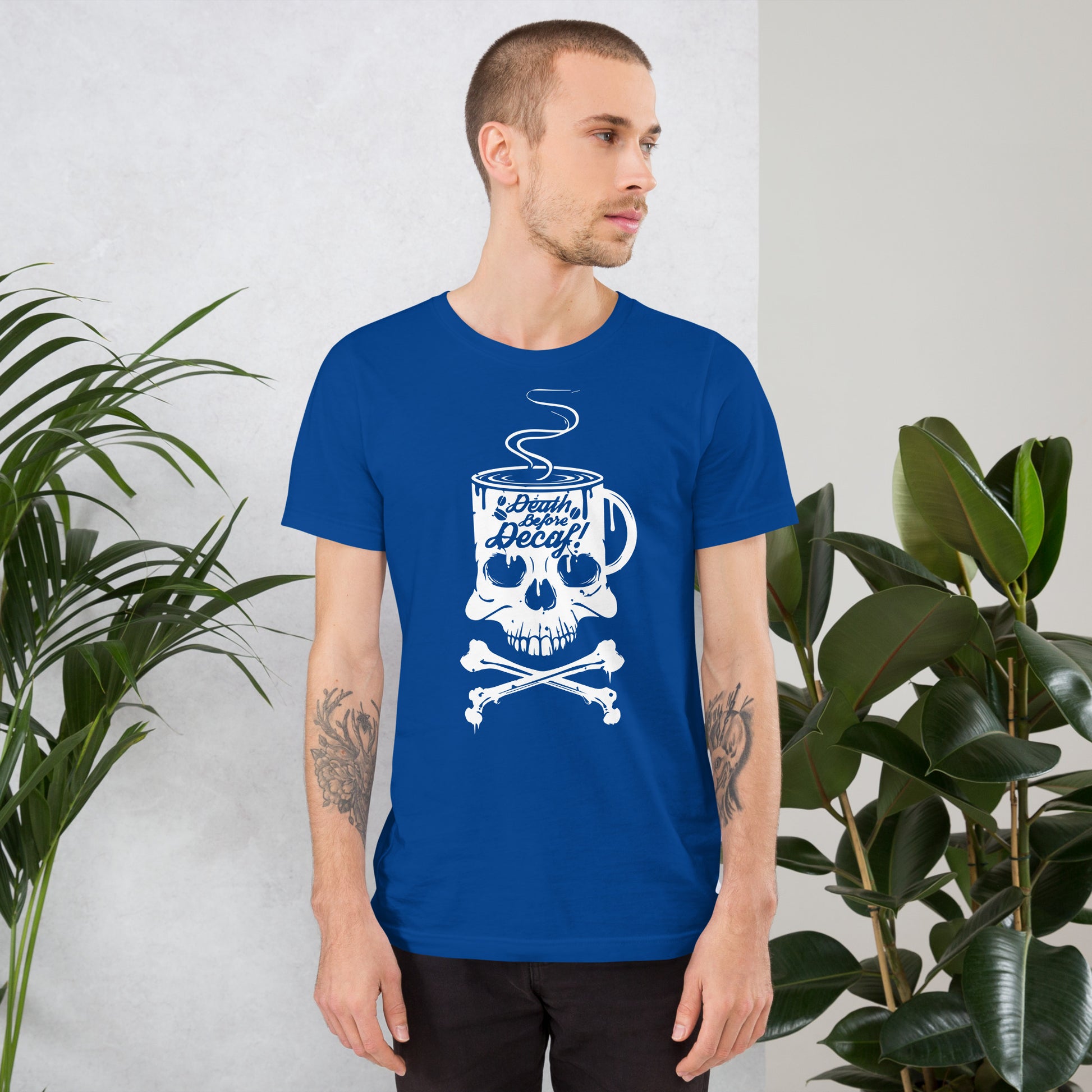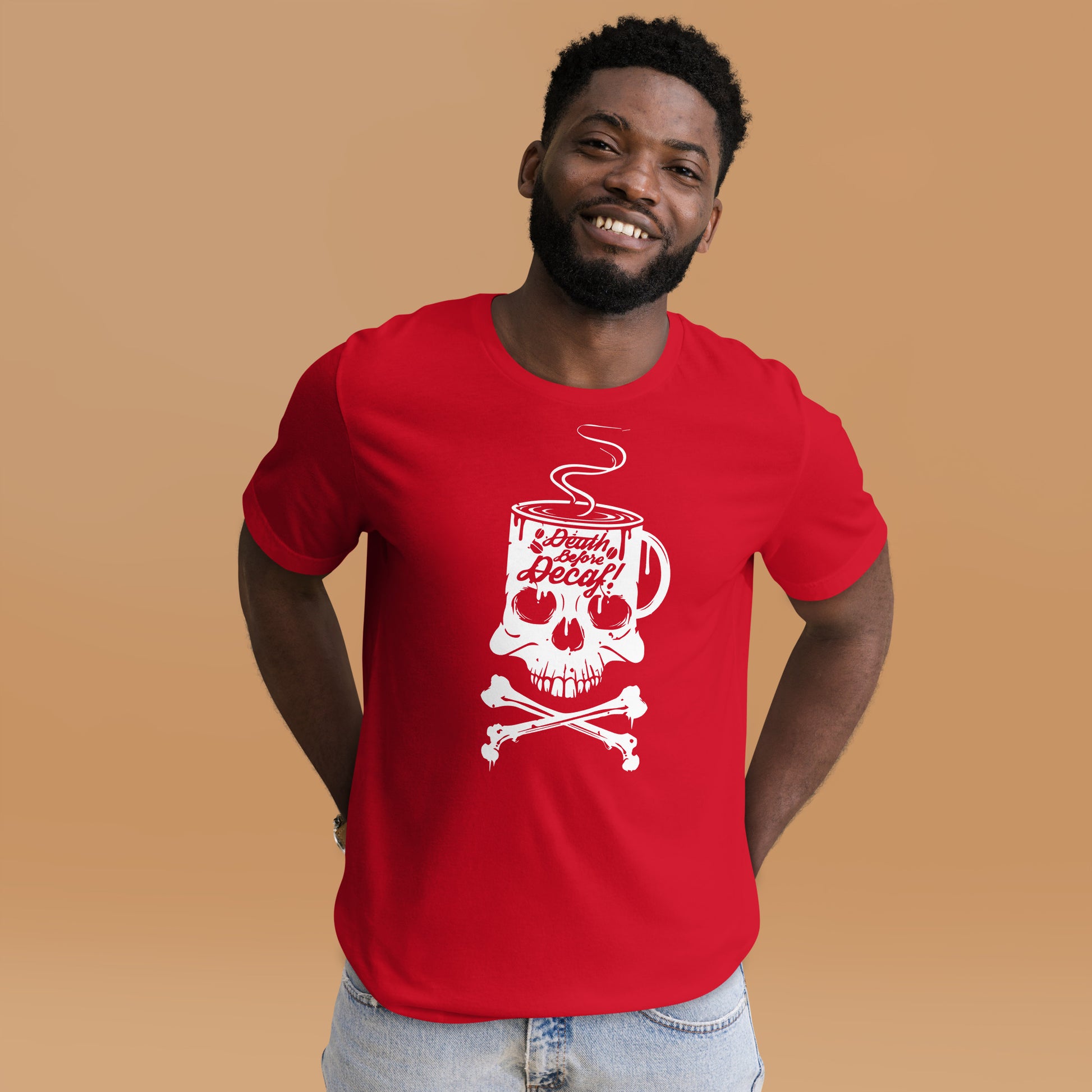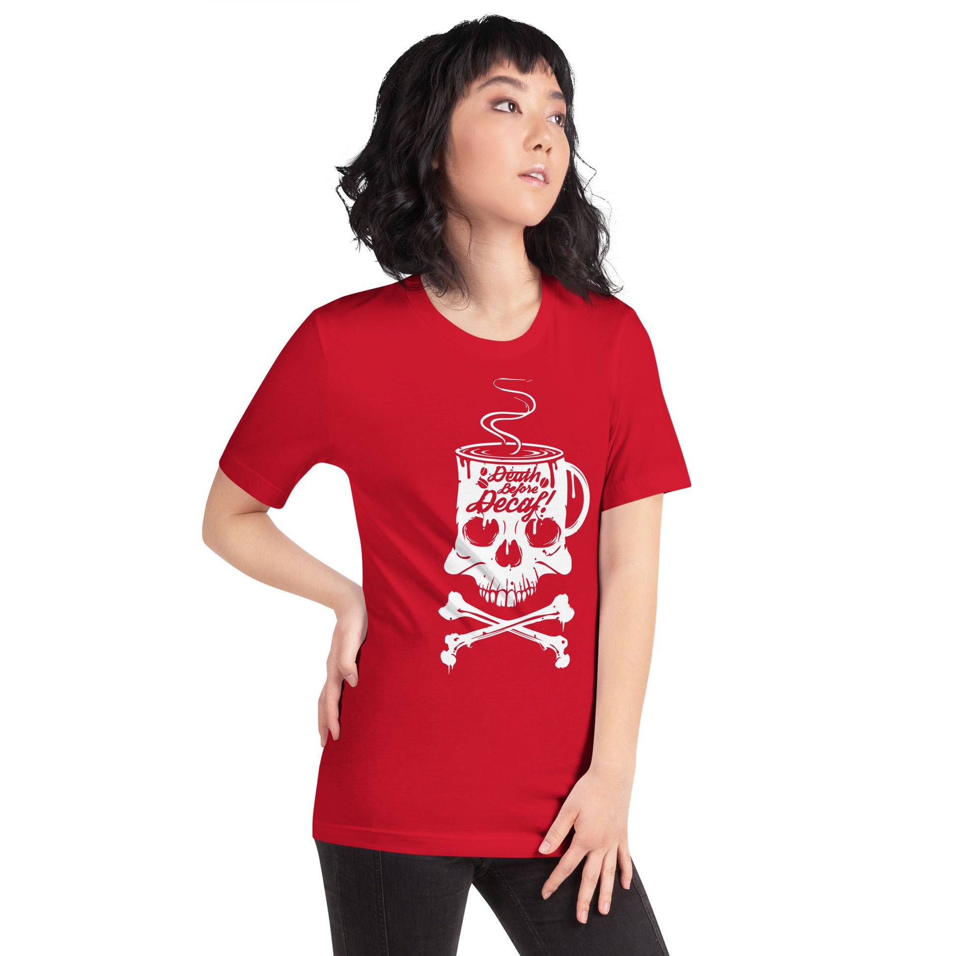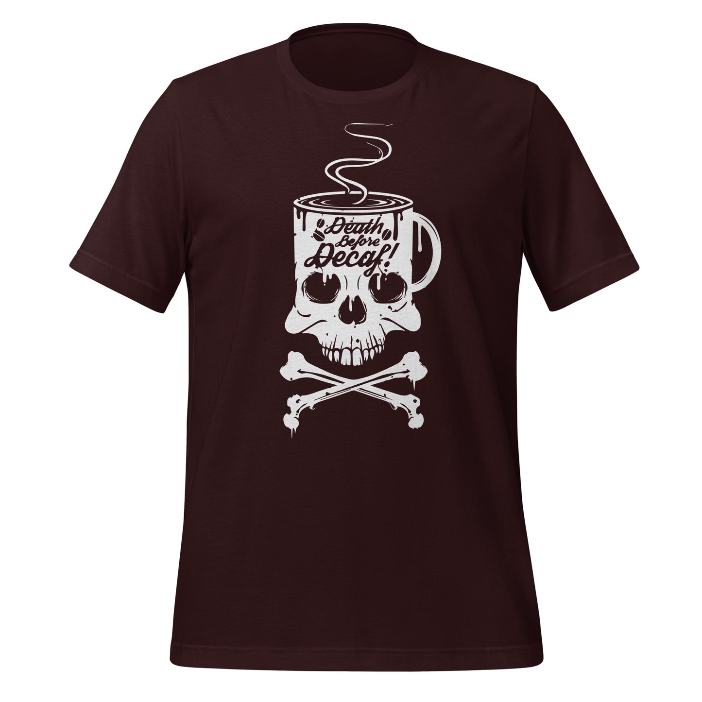 Unleash the rebel barista within you with our "Death Before Decaf" T-Shirt! It's the ultimate statement piece for those who believe life’s too short for bad coffee. This T-Shirt features a skull and crossbones with a twist—where the skull enjoys a steamy cup of the good stuff. It's not just a bold fashion choice; it's a lifestyle decree for the caffeine devotees who take their coffee like they take life: full-strength and unfiltered. Dare to wear this emblem of resistance against the tyranny of decaffeinated beverages. Perfect for those chilly mornings when only the darkest roast will do to resurrect your spirit. Get ready to rattle the coffee cups of the world with this audacious display of devotion to the bean!This t-shirt is everything you've dreamed of and more. It feels soft and lightweight, with the right amount of stretch. It's comfortable and flattering for all.
