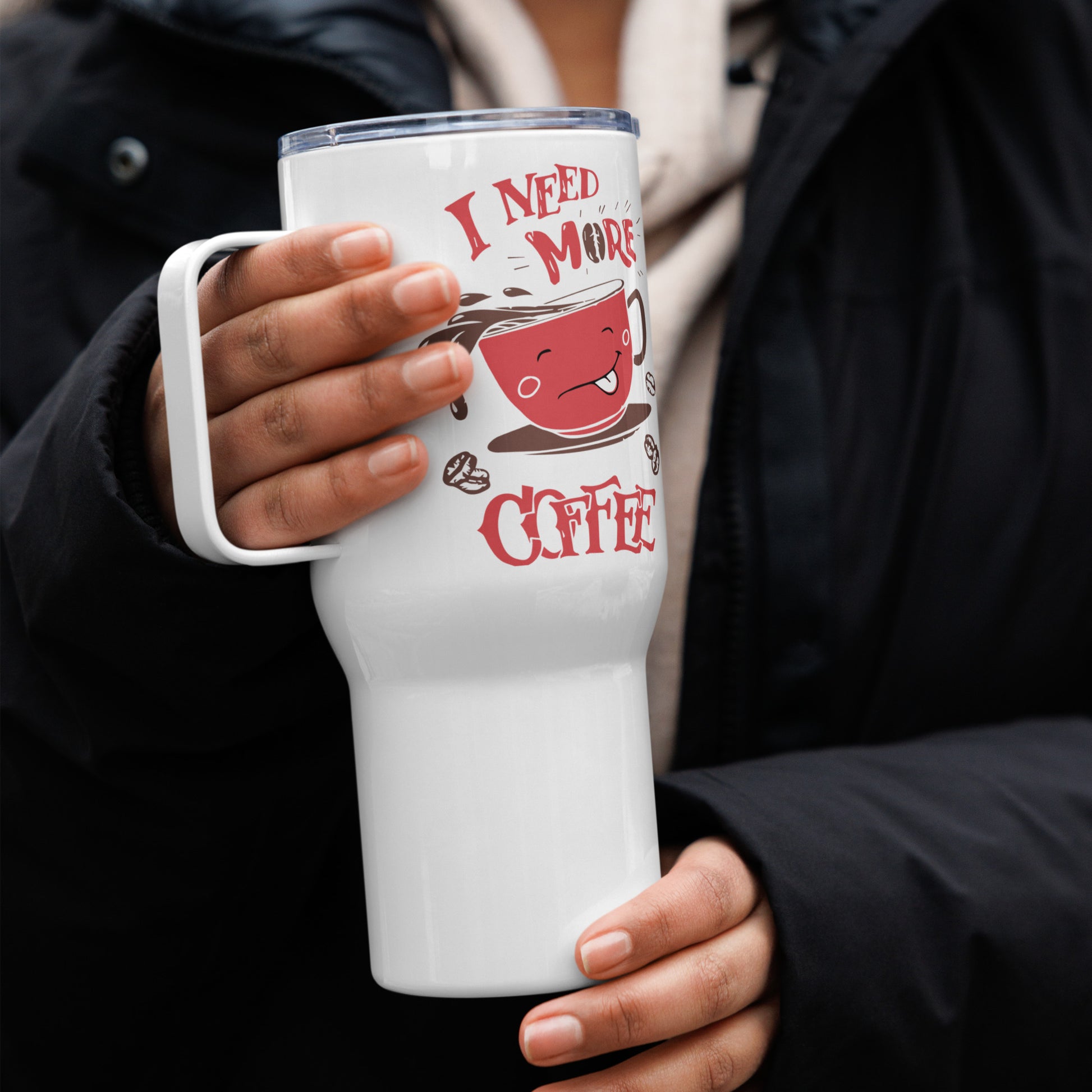 The "Caffeine Craving" Travel Mug is a coffee lover's trusty sidekick for those days when the caffeine just can’t come quick enough. With a charming declaration of your need for that beloved bean juice, this tumbler holds your brew with the promise of endless warmth and energy. It's more than a drink container; it's a statement of necessity for anyone who’s ever faced a morning monster before their first sip. Sip in style and comfort with an elevated travel mug. With its sleek and durable design, you’ll love taking this mug wherever you go. It fits into most car cup holders and has a spill-proof plastic lid. Commute to work or go on new adventures—this travel mug will keep your beverage safe and at just the right temperature.
