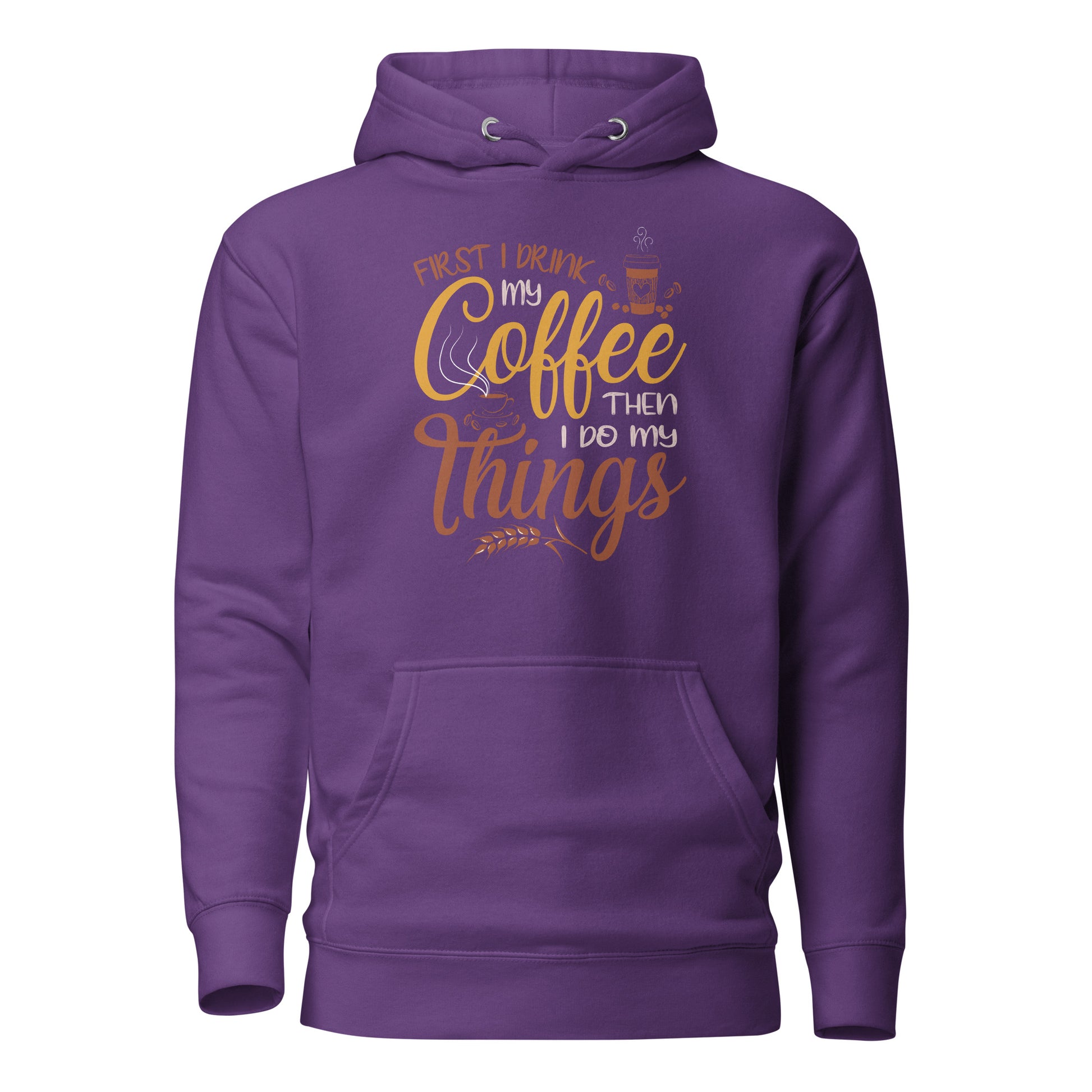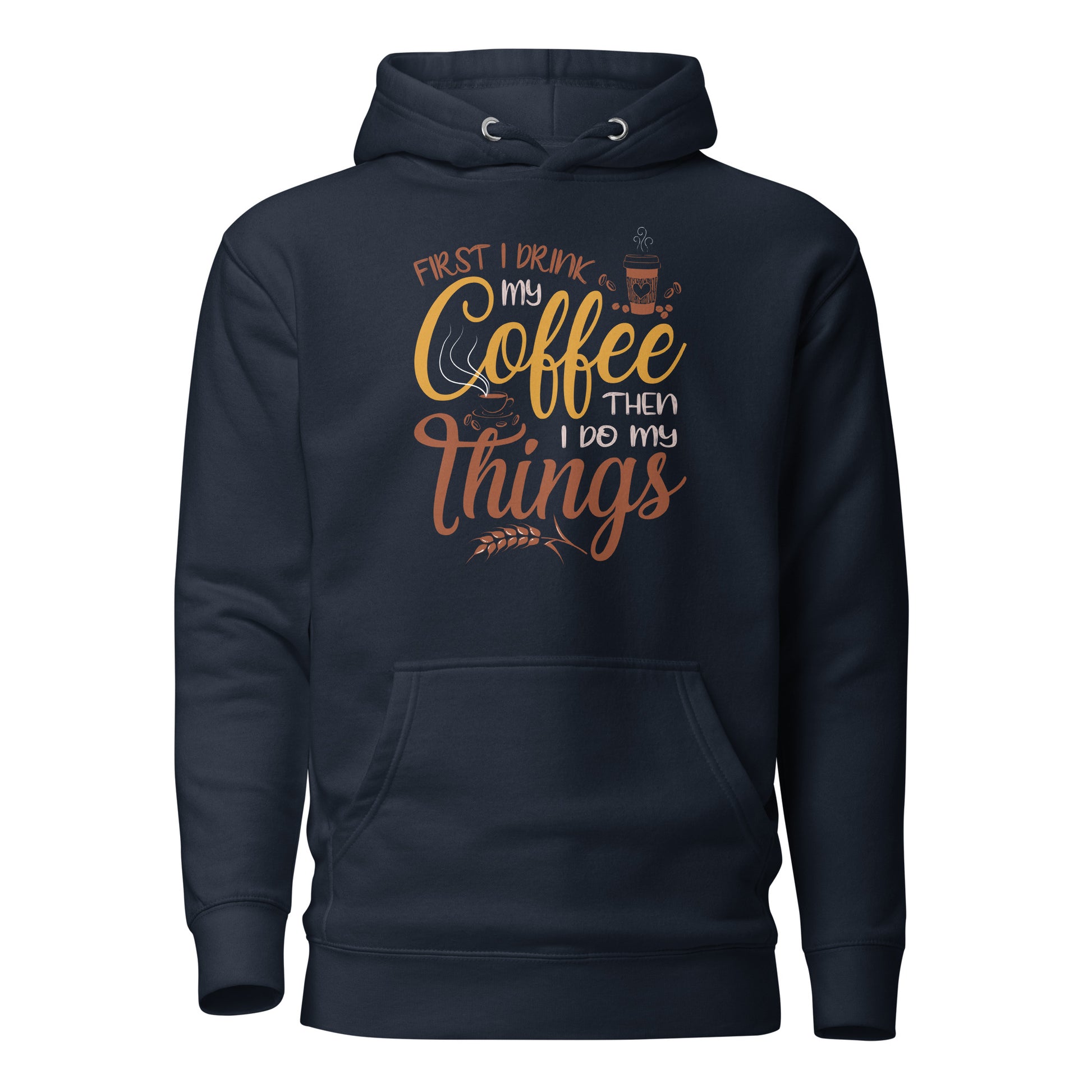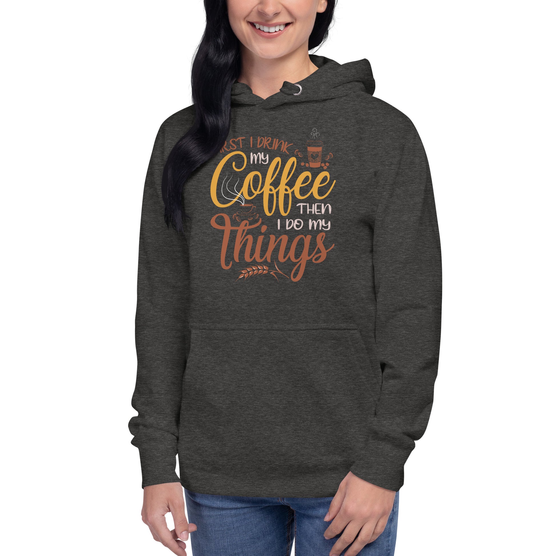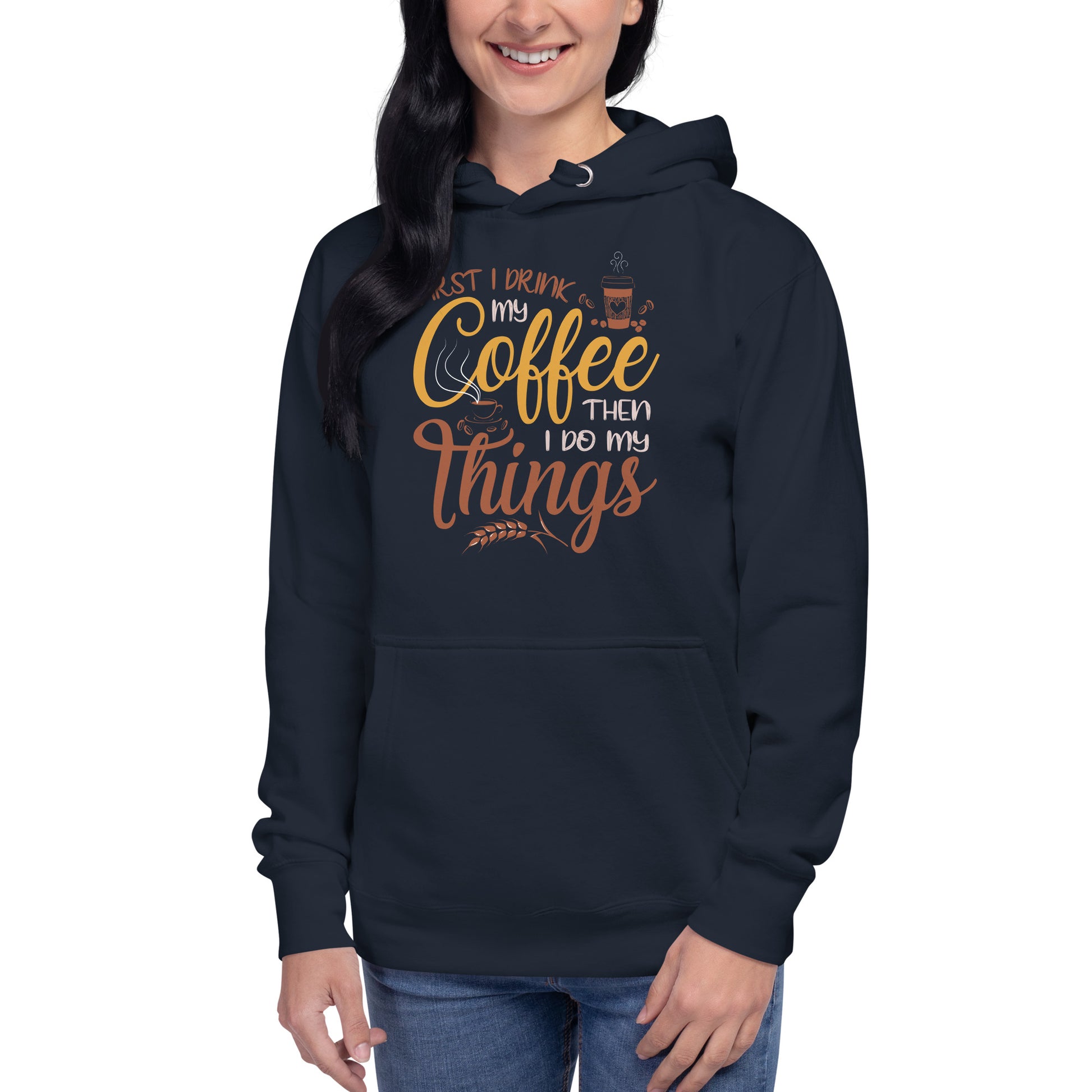 Embrace your inner morning ritual with our "Caffeine Mantra Hoodie," where priorities are as clear as black coffee! This is the garment that coffee lovers have bean dreaming of – it's where comfort meets the unabashed truth of daily life. The script flows like the perfect pour-over, proclaiming, "First I Drink My Coffee, Then I Do My Things." It’s not just a piece of clothing, it's your daily agenda written in bold script for the world to see. Perfect for the planner, the achiever, the caffeine connoisseur who knows the day only starts after that first magical sip. Wear this manifesto of motivation and declare your love for the brew that powers you through. Who knew that the softest hoodie you'll ever own comes with such a cool design. You won't regret buying this classic streetwear piece of apparel with a convenient pouch pocket and warm hood for chilly evenings.