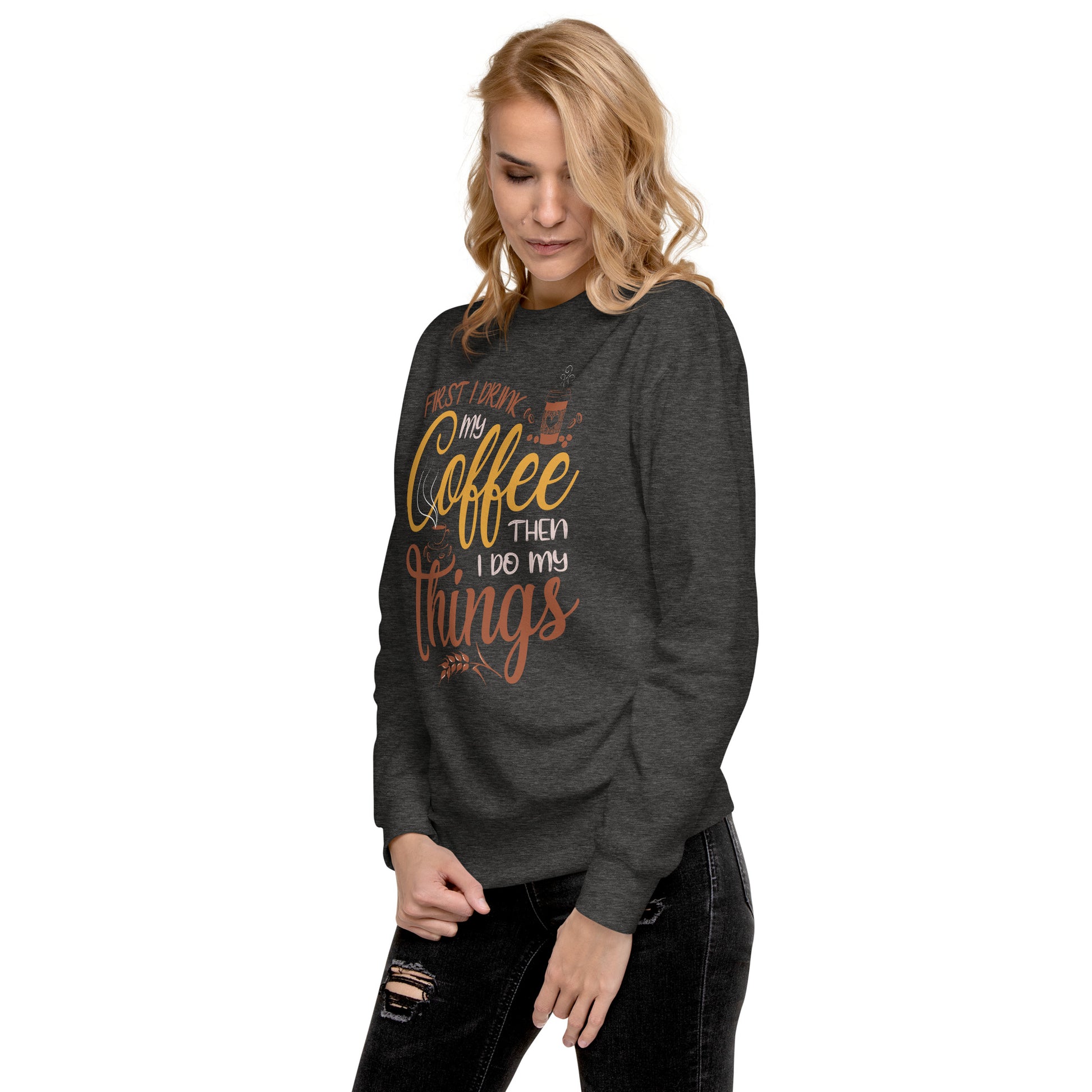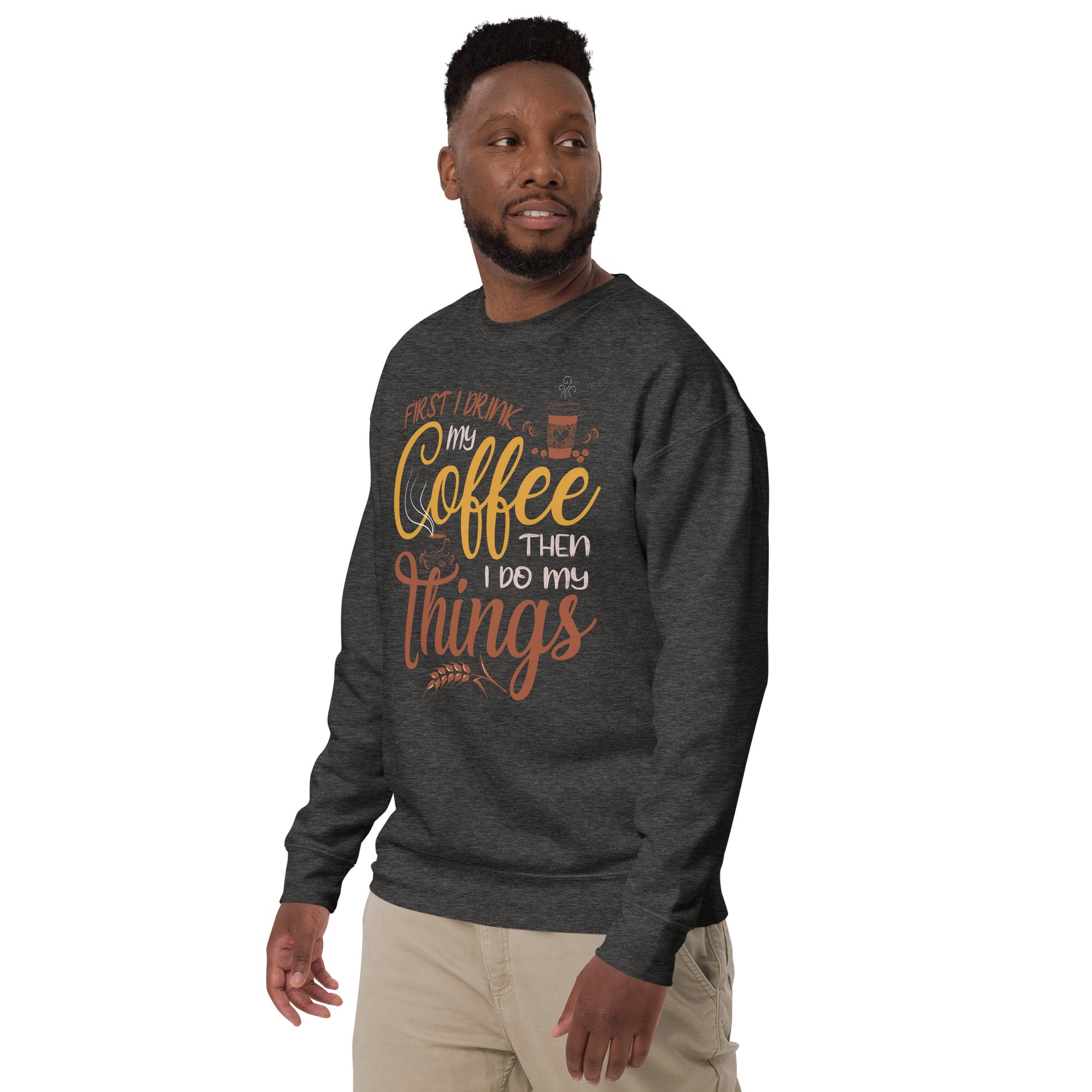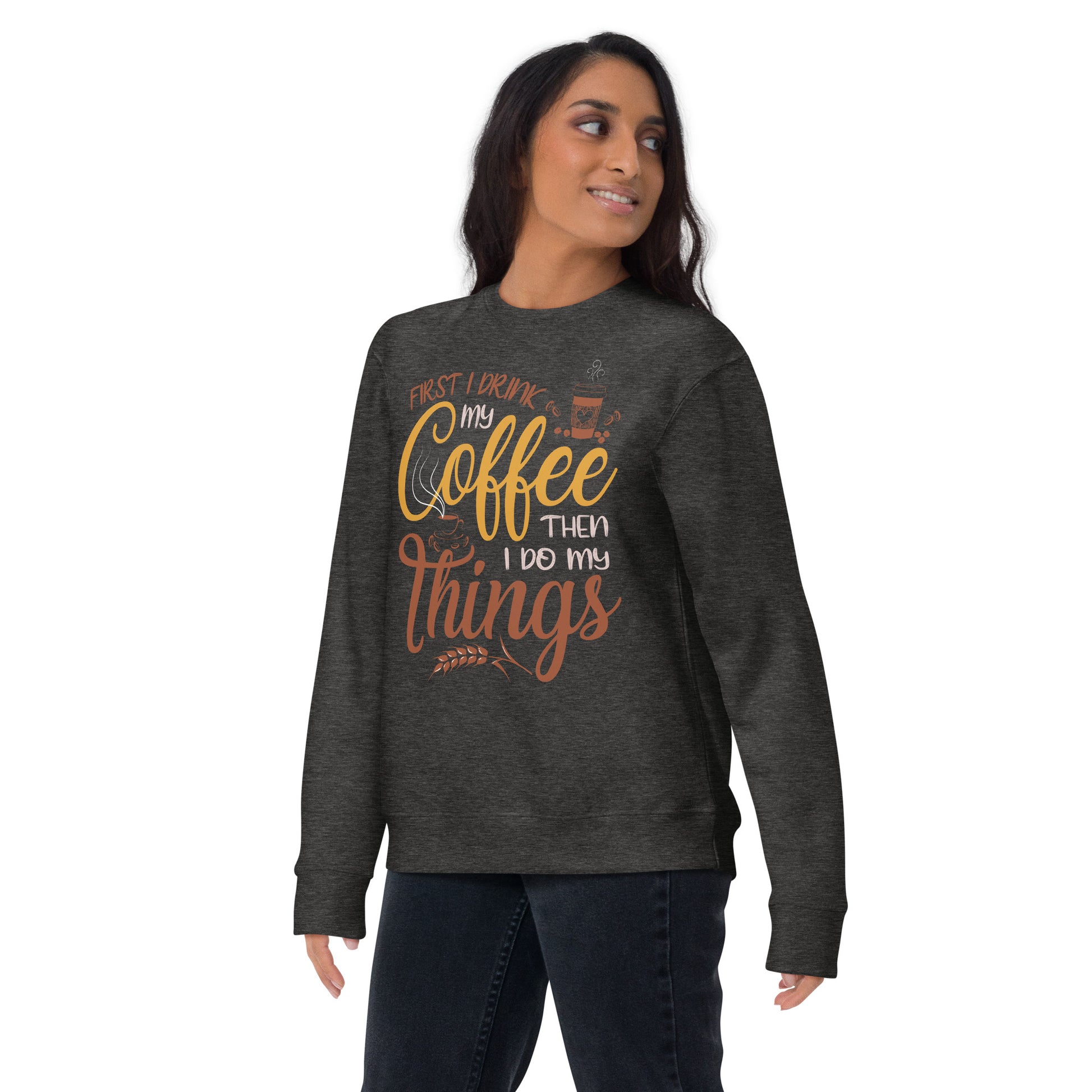 Embrace your inner morning ritual with our "Caffeine Mantra Sweatshirt," where priorities are as clear as black coffee! This is the garment that coffee lovers have bean dreaming of – it's where comfort meets the unabashed truth of daily life. The script flows like the perfect pour-over, proclaiming, "First I Drink My Coffee, Then I Do My Things." It’s not just a piece of clothing, it's your daily agenda written in bold script for the world to see. Perfect for the planner, the achiever, the caffeine connoisseur who knows the day only starts after that first magical sip. Wear this manifesto of motivation and declare your love for the brew that powers you through. Rock a classic sweatshirt silhouette with ribbed crew neck, long sleeve cuffs, and a flat hem. Layer it up or wear it on its own for a contemporary streetwear look. With the soft fleece inside and comfortable fit, it’s sure to become your favorite everyday sweater right away!