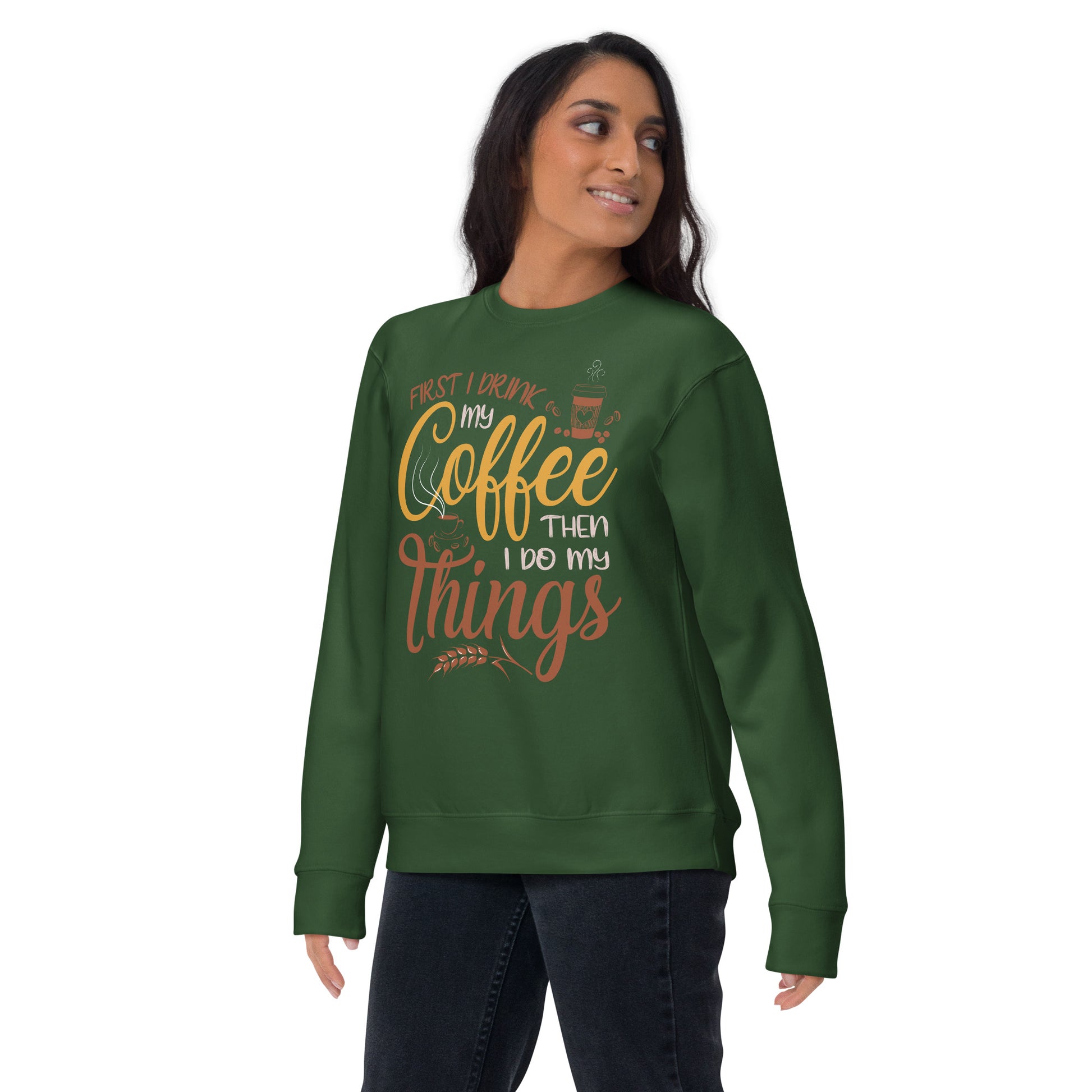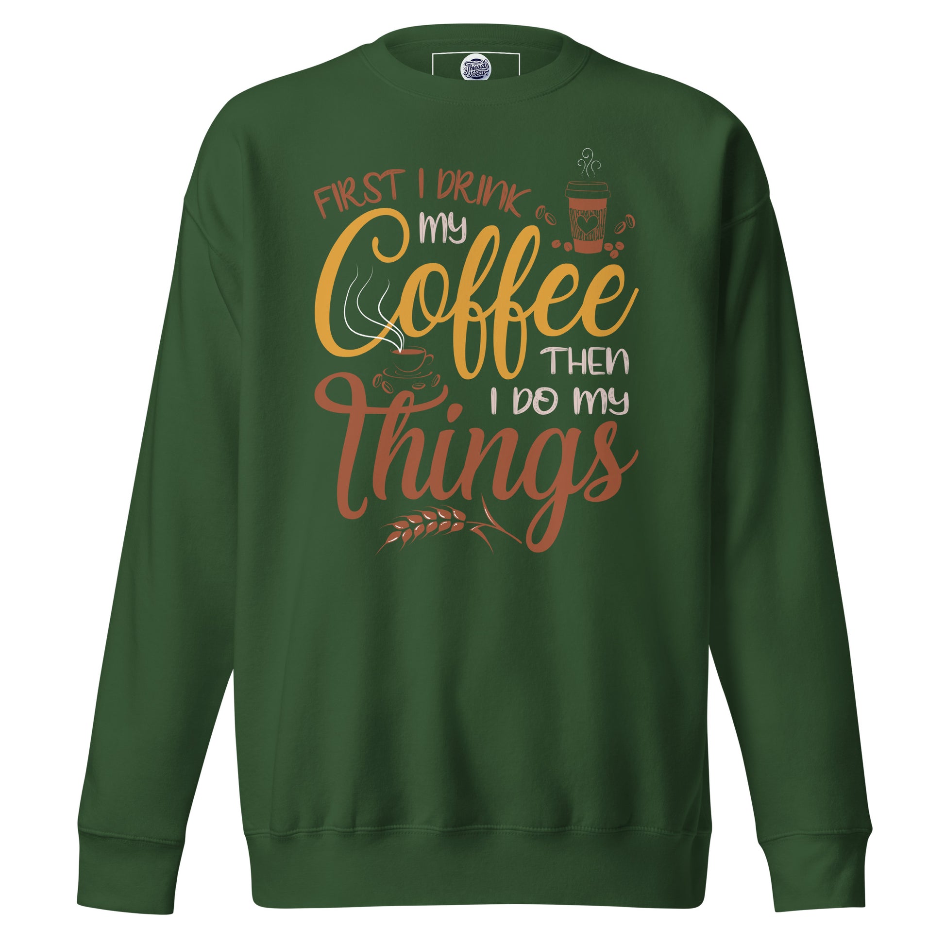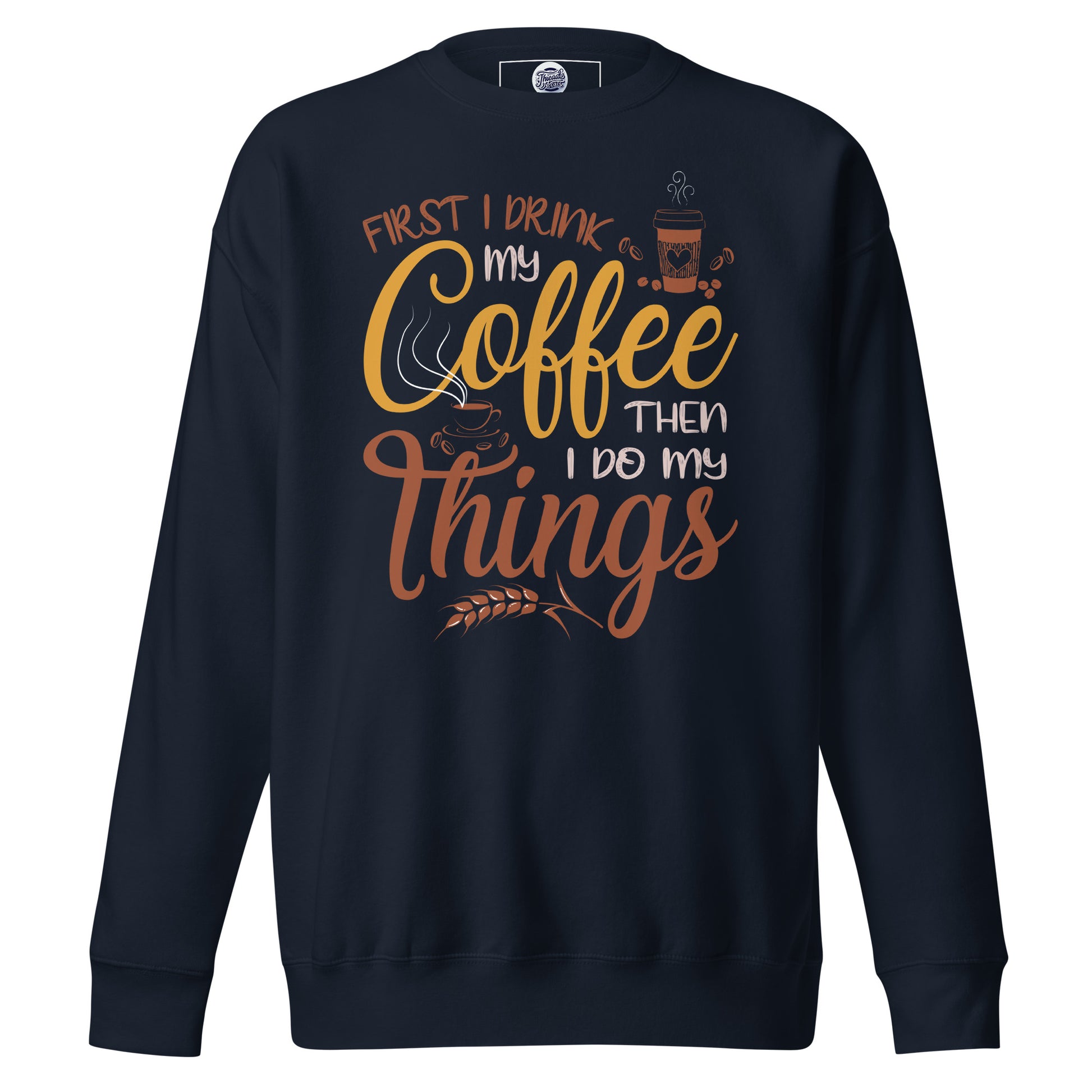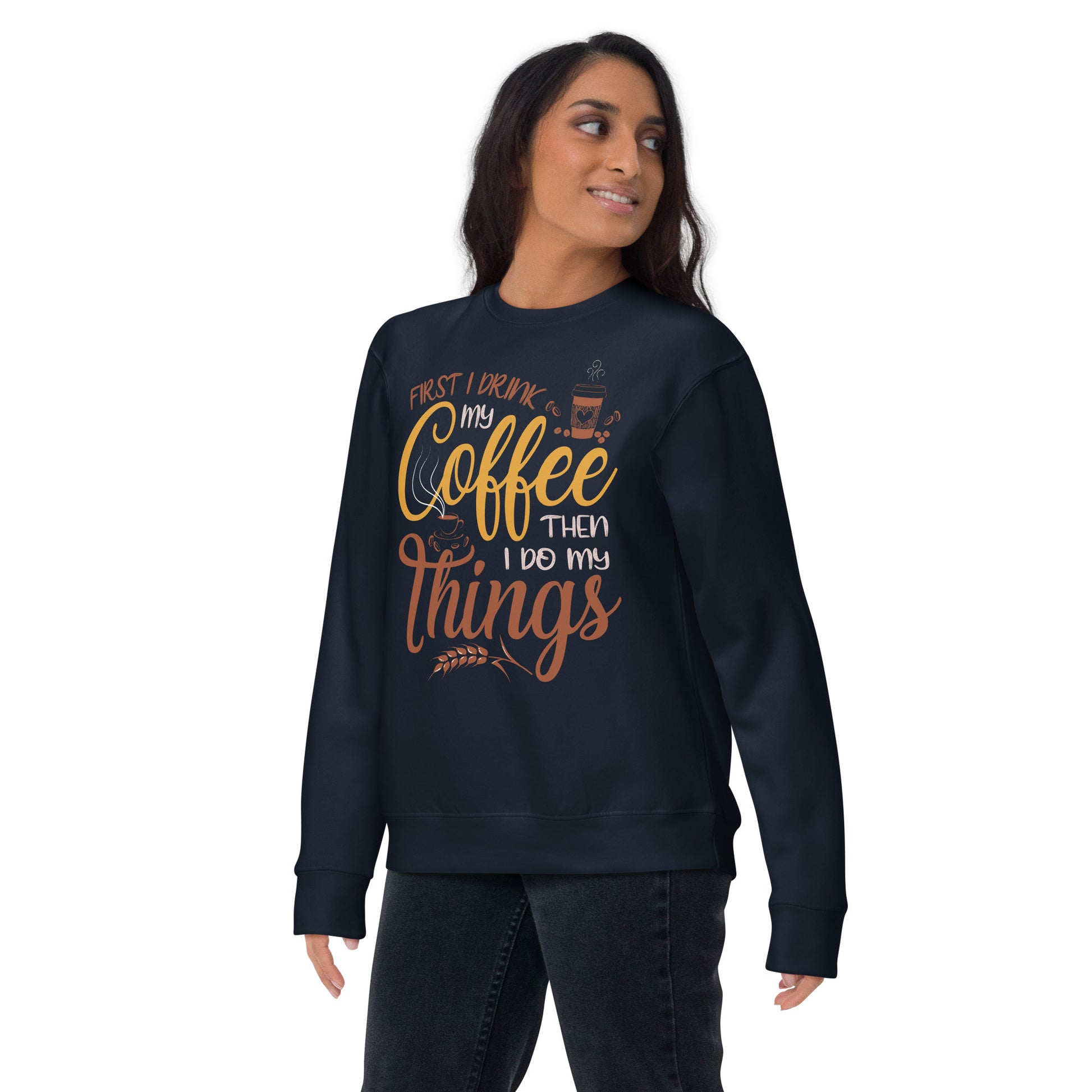 Embrace your inner morning ritual with our "Caffeine Mantra Sweatshirt," where priorities are as clear as black coffee! This is the garment that coffee lovers have bean dreaming of – it's where comfort meets the unabashed truth of daily life. The script flows like the perfect pour-over, proclaiming, "First I Drink My Coffee, Then I Do My Things." It’s not just a piece of clothing, it's your daily agenda written in bold script for the world to see. Perfect for the planner, the achiever, the caffeine connoisseur who knows the day only starts after that first magical sip. Wear this manifesto of motivation and declare your love for the brew that powers you through. Rock a classic sweatshirt silhouette with ribbed crew neck, long sleeve cuffs, and a flat hem. Layer it up or wear it on its own for a contemporary streetwear look. With the soft fleece inside and comfortable fit, it’s sure to become your favorite everyday sweater right away!