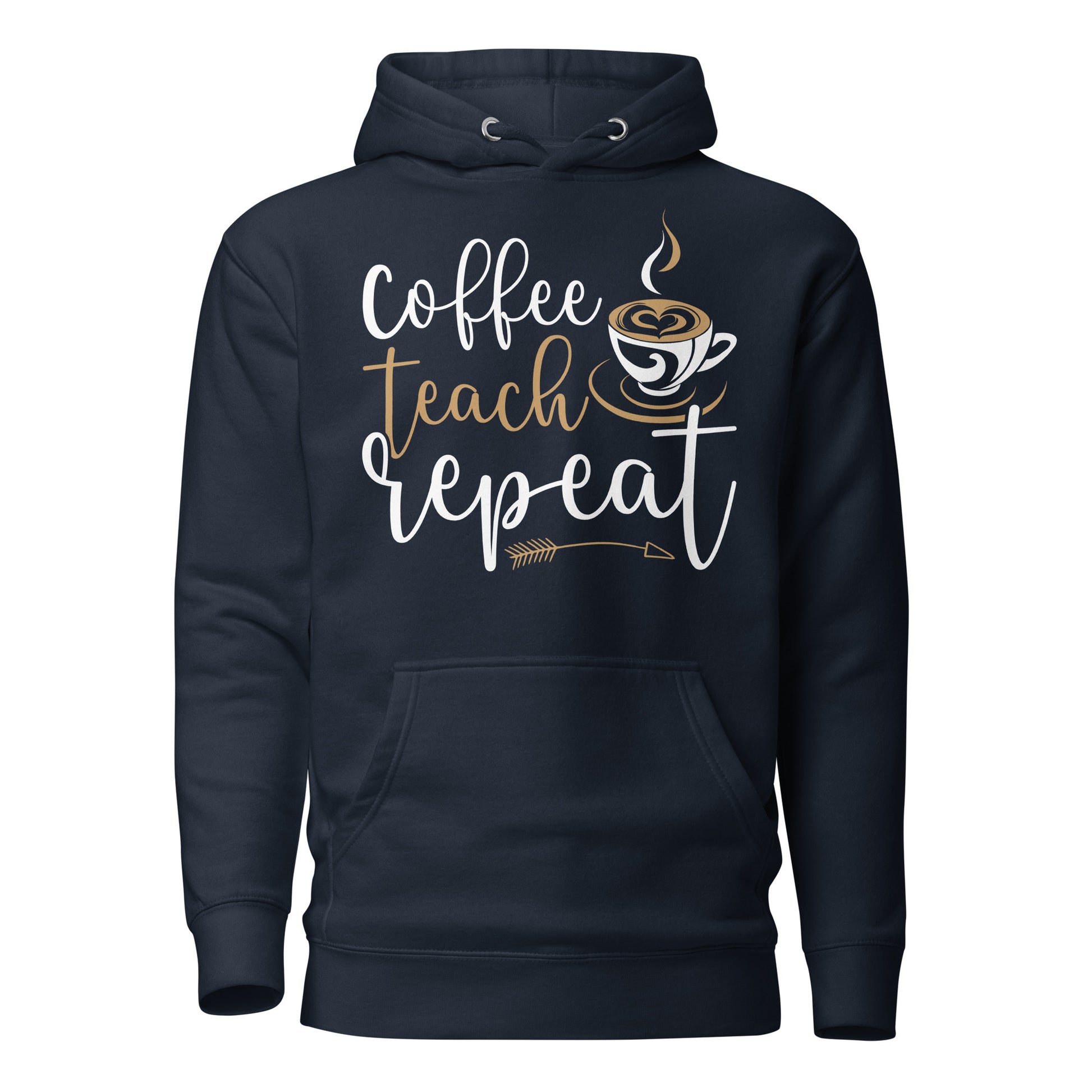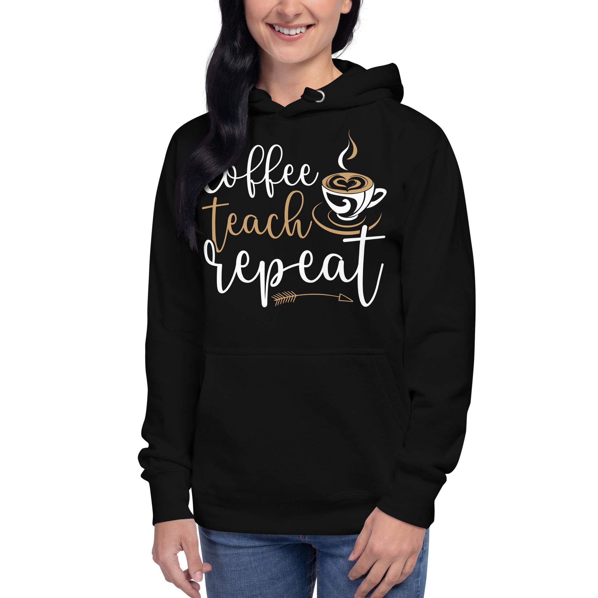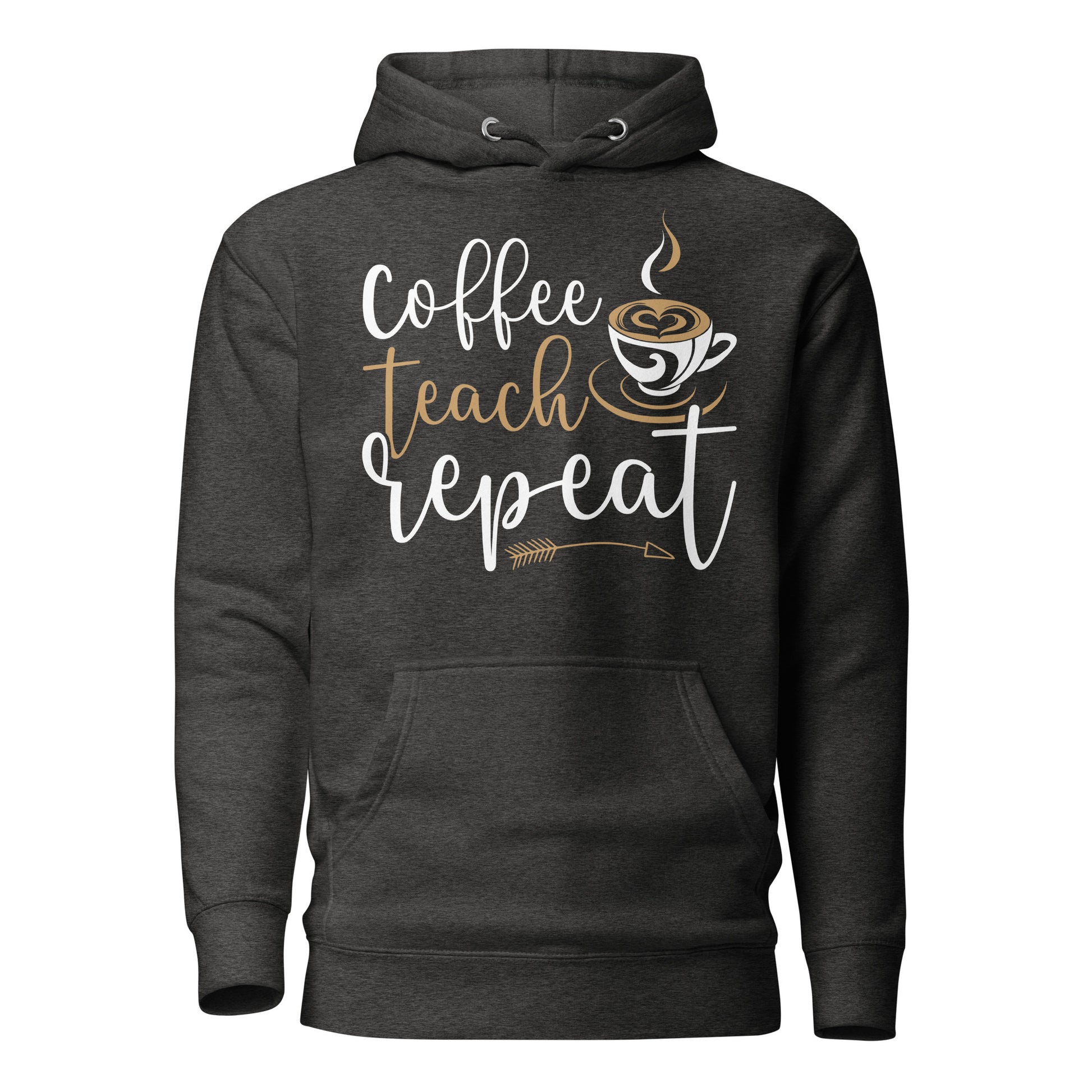 "Coffee Teach Repeat," making it a perfect choice for educators and coffee enthusiasts alike. The shirt's bold white lettering is complemented by a graphic of a steaming coffee cup, symbolizing the wearer's love for caffeine and passion for teaching. This high-quality, crew-neck T-shirt is not only comfortable but also a great conversation starter, ideal for casual wear or as a gift for a favorite teacher. Who knew that the softest hoodie you'll ever own comes with such a cool design. You won't regret buying this classic streetwear piece of apparel with a convenient pouch pocket and warm hood for chilly evenings.