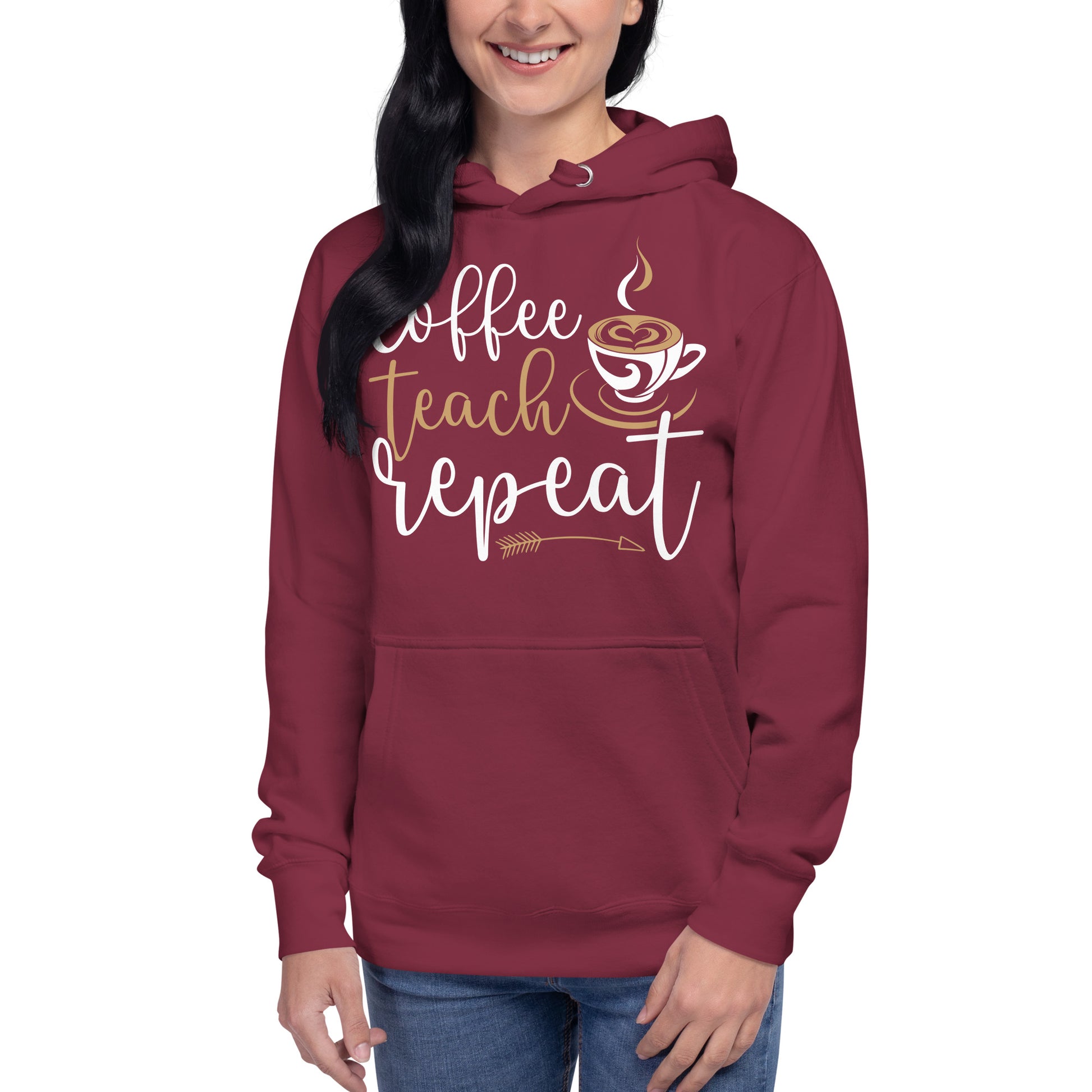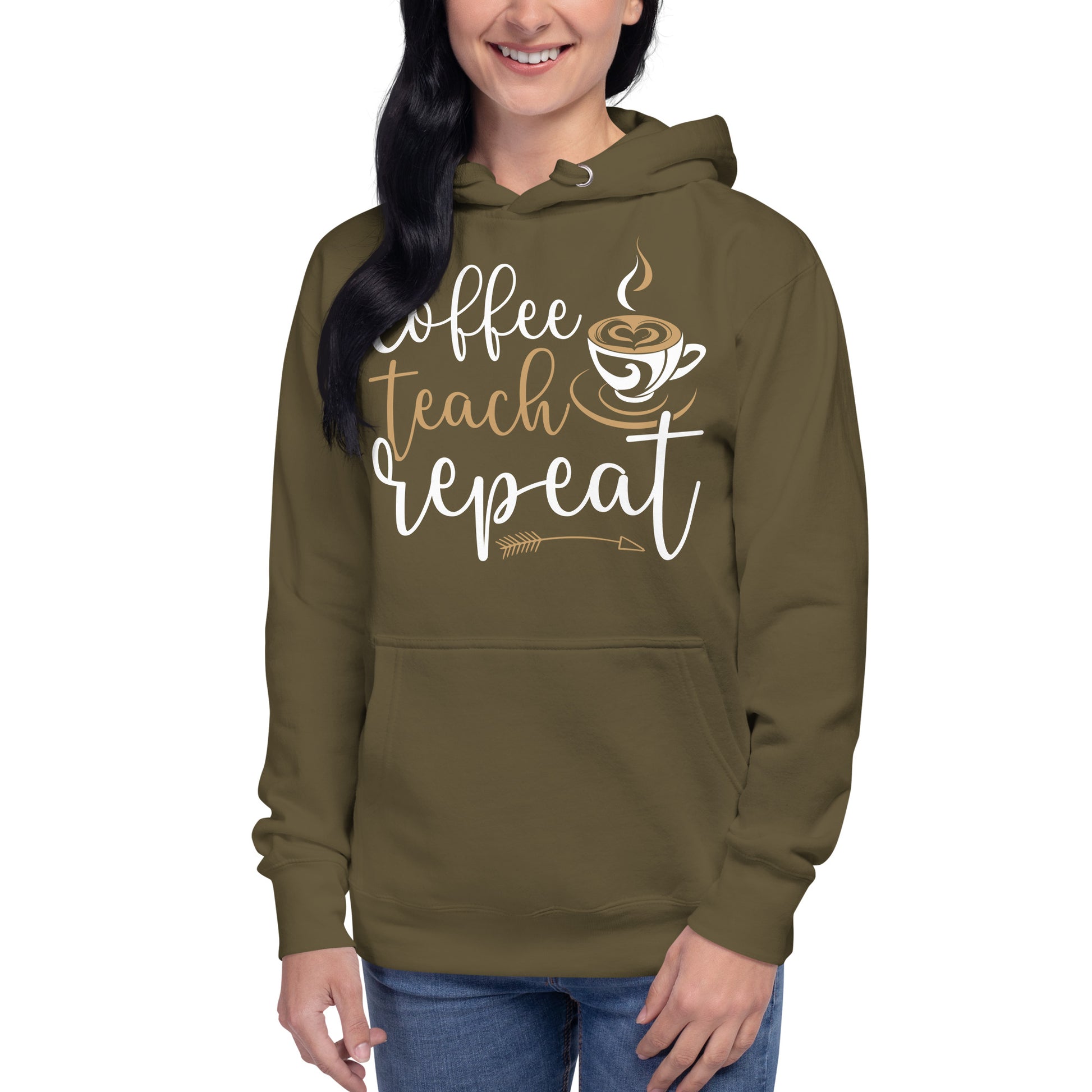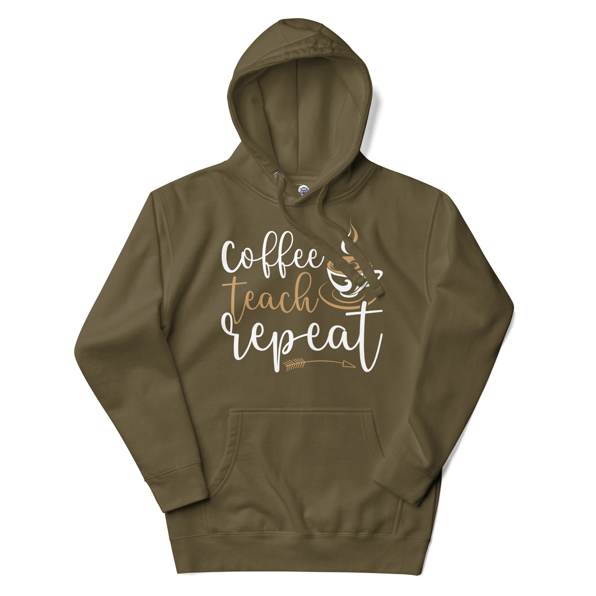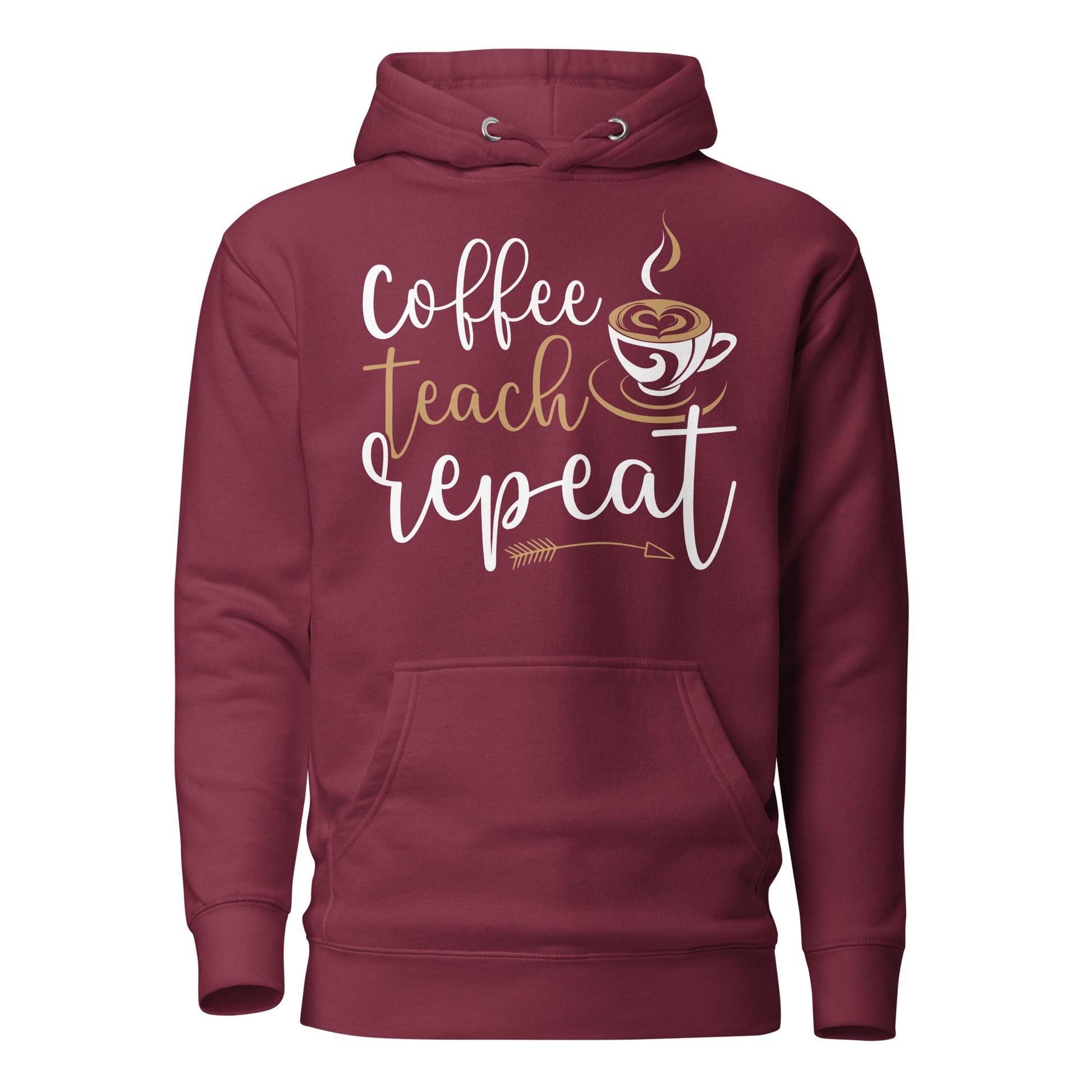 "Coffee Teach Repeat," making it a perfect choice for educators and coffee enthusiasts alike. The shirt's bold white lettering is complemented by a graphic of a steaming coffee cup, symbolizing the wearer's love for caffeine and passion for teaching. This high-quality, crew-neck T-shirt is not only comfortable but also a great conversation starter, ideal for casual wear or as a gift for a favorite teacher. Who knew that the softest hoodie you'll ever own comes with such a cool design. You won't regret buying this classic streetwear piece of apparel with a convenient pouch pocket and warm hood for chilly evenings.