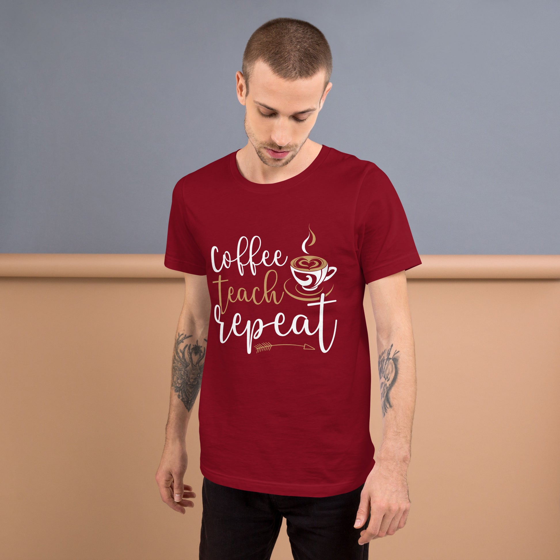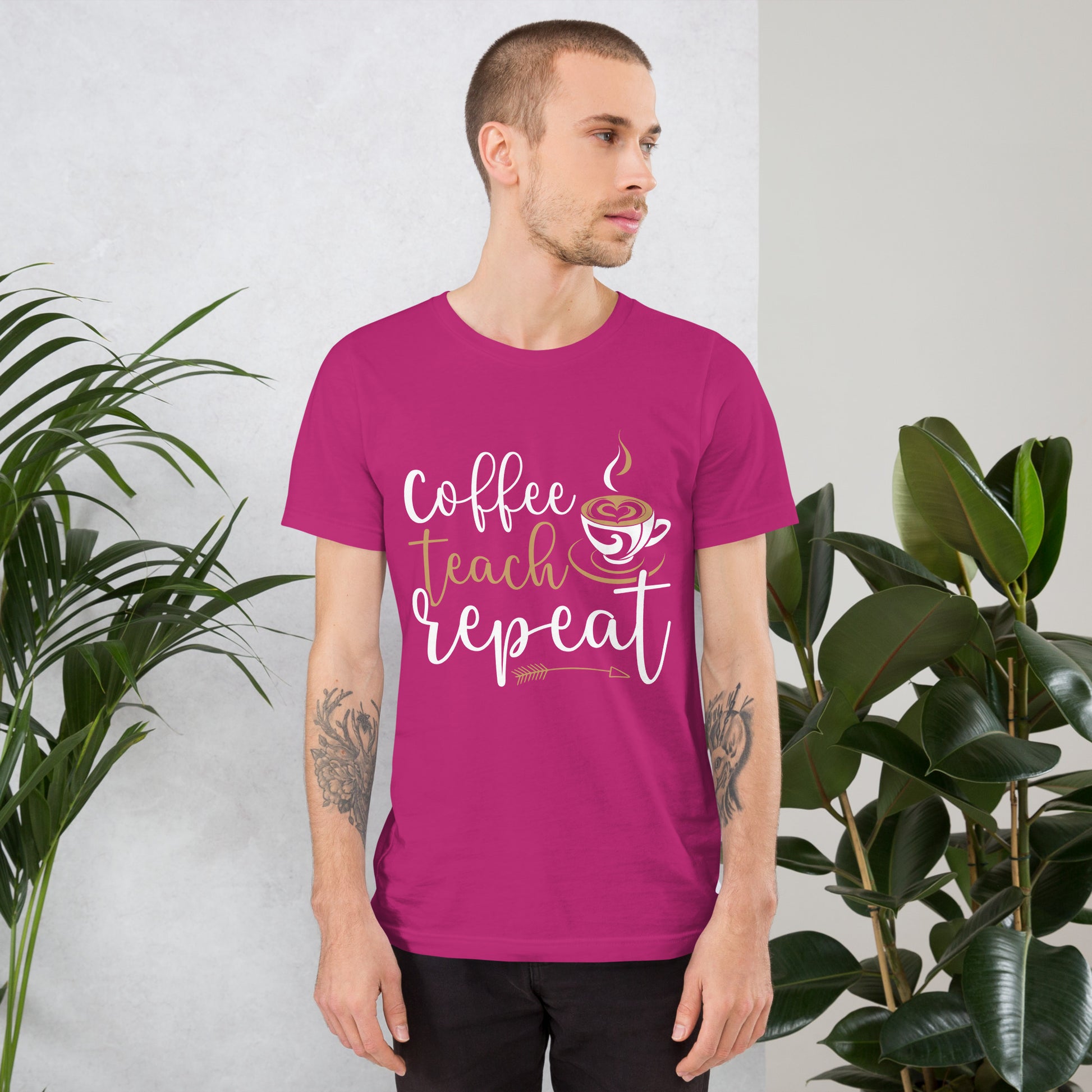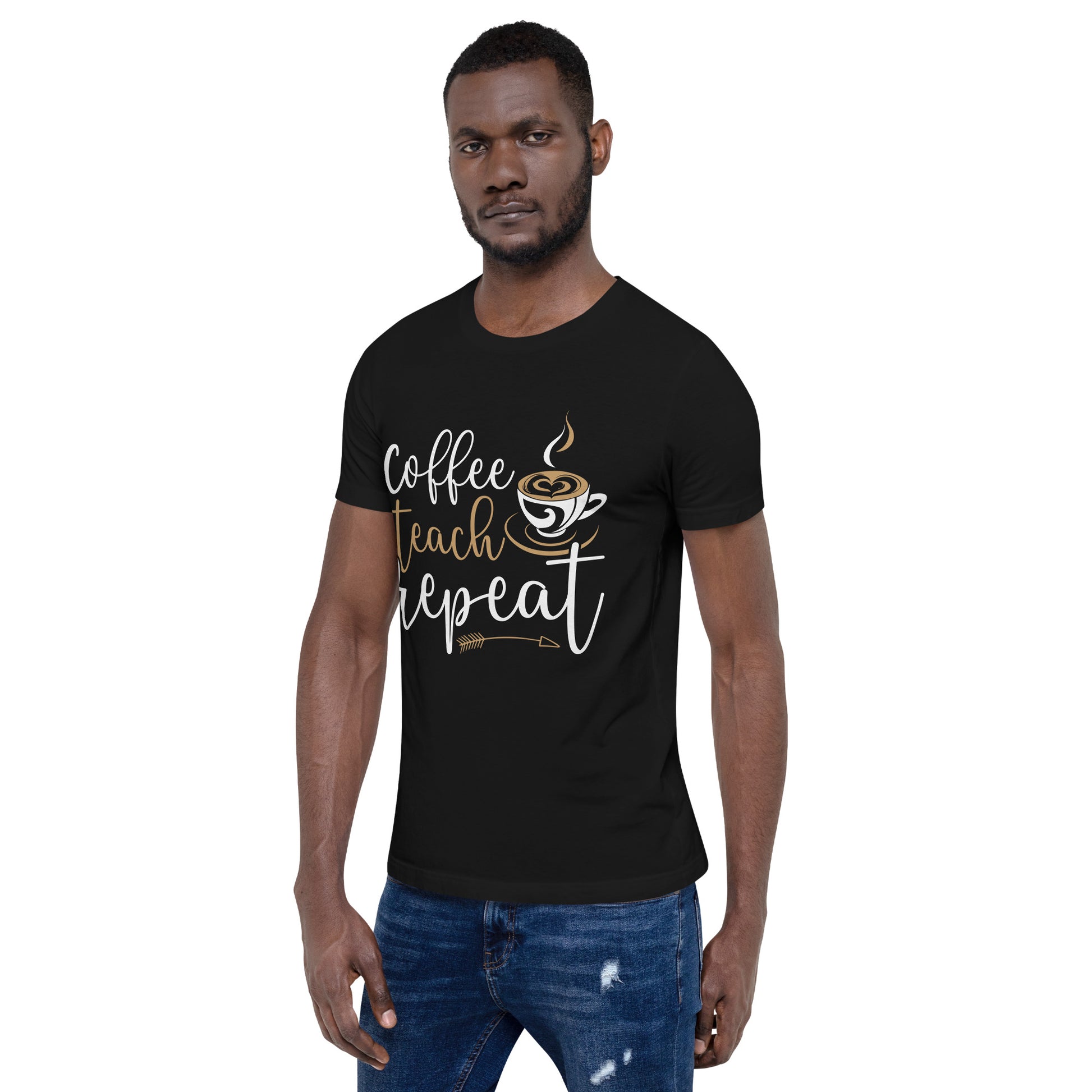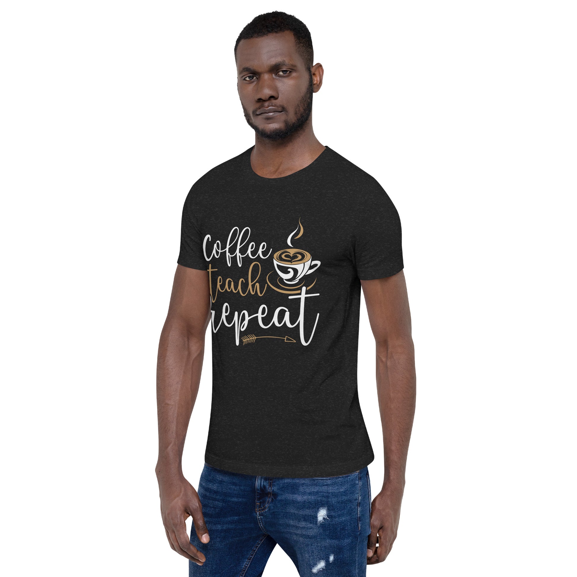 "Coffee Teach Repeat," makes this the perfect choice for educators and coffee enthusiasts alike. The shirt's bold white lettering is complemented by a graphic of a steaming coffee cup, symbolizing the wearer's love for caffeine and passion for teaching. This high-quality, crew-neck T-shirt is not only comfortable but also a great conversation starter, ideal for casual wear or as a gift for a favorite teacher.This t-shirt is everything you've dreamed of and more. It feels soft and lightweight, with the right amount of stretch. It's comfortable and flattering for all.