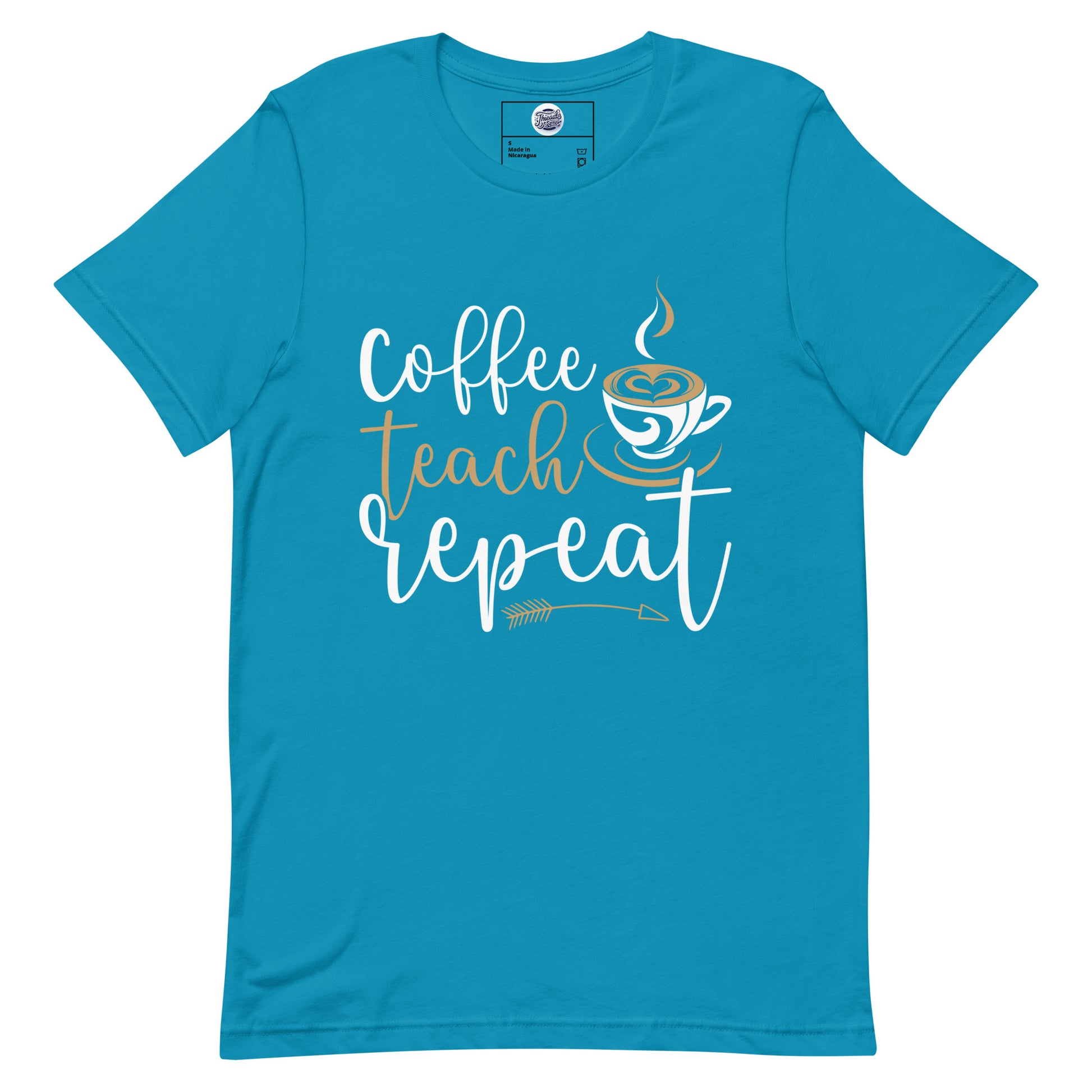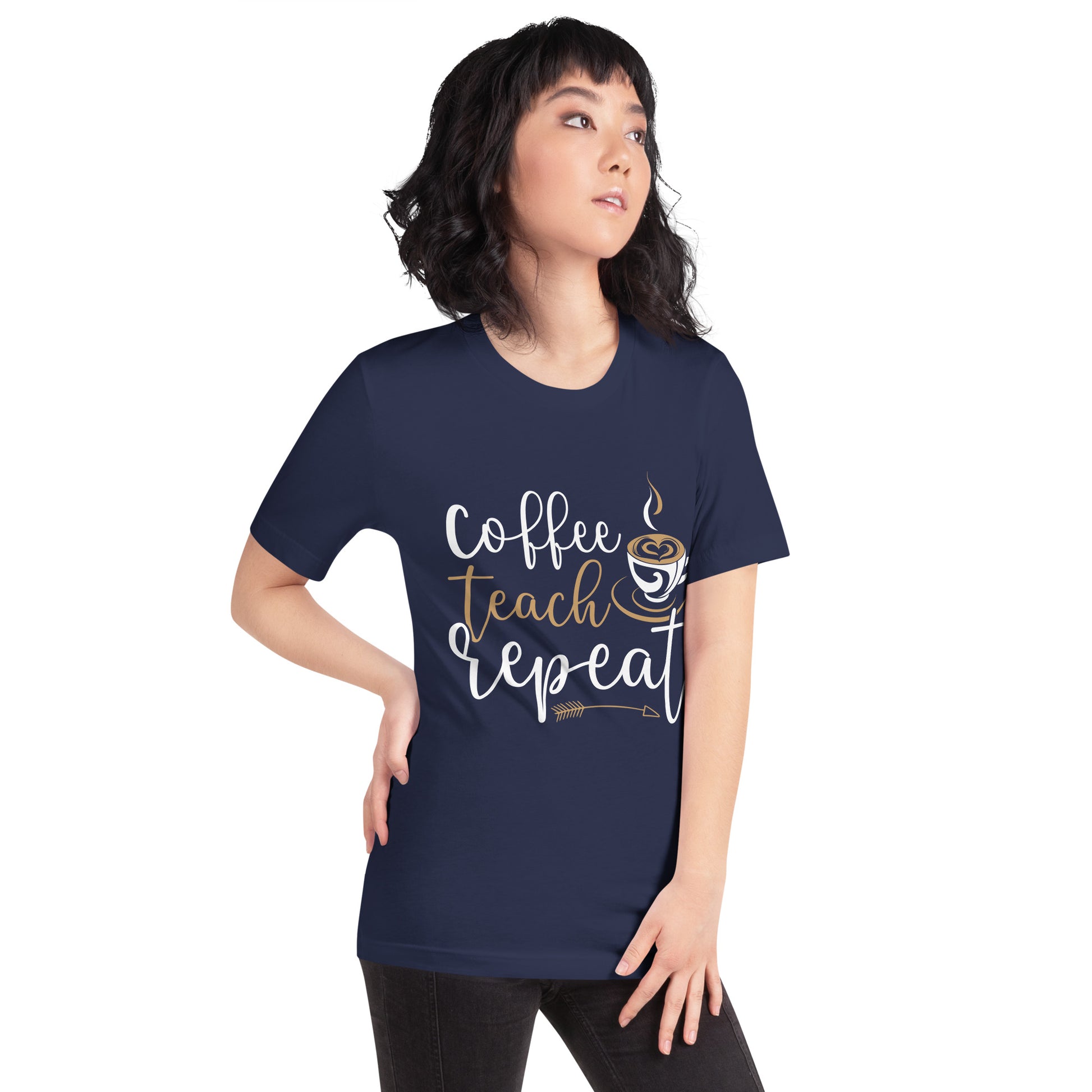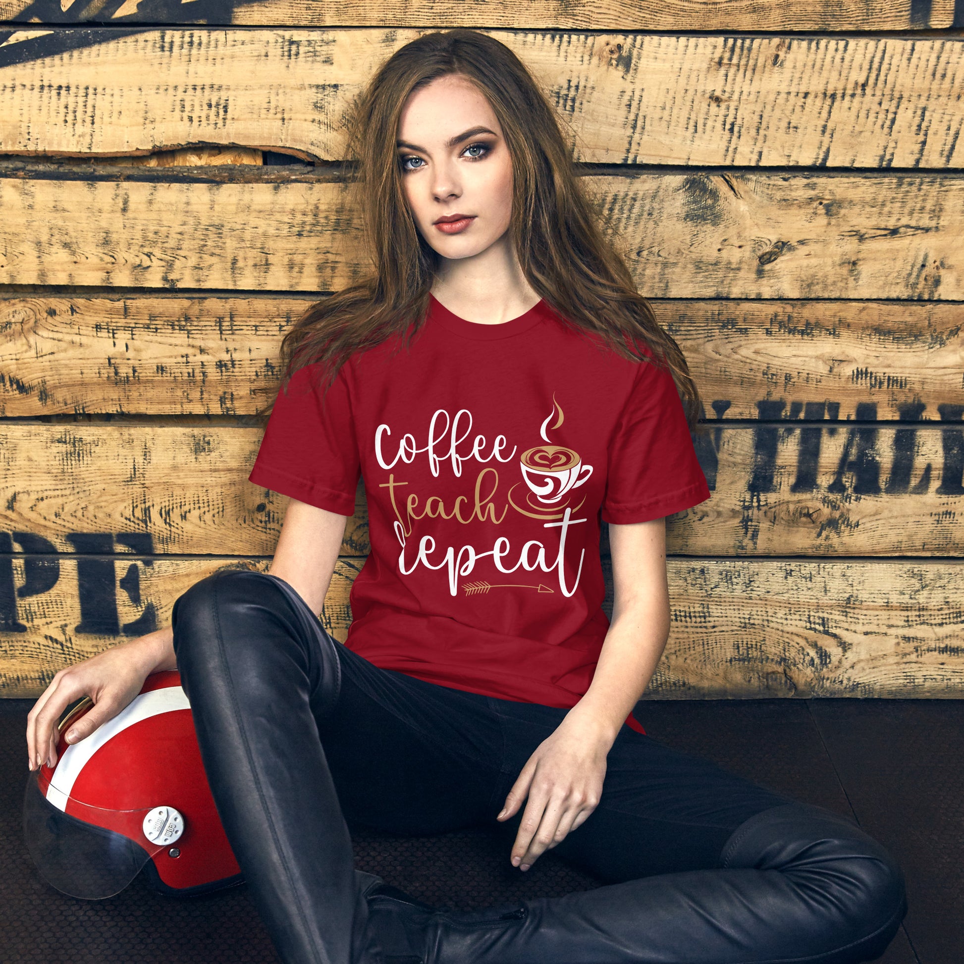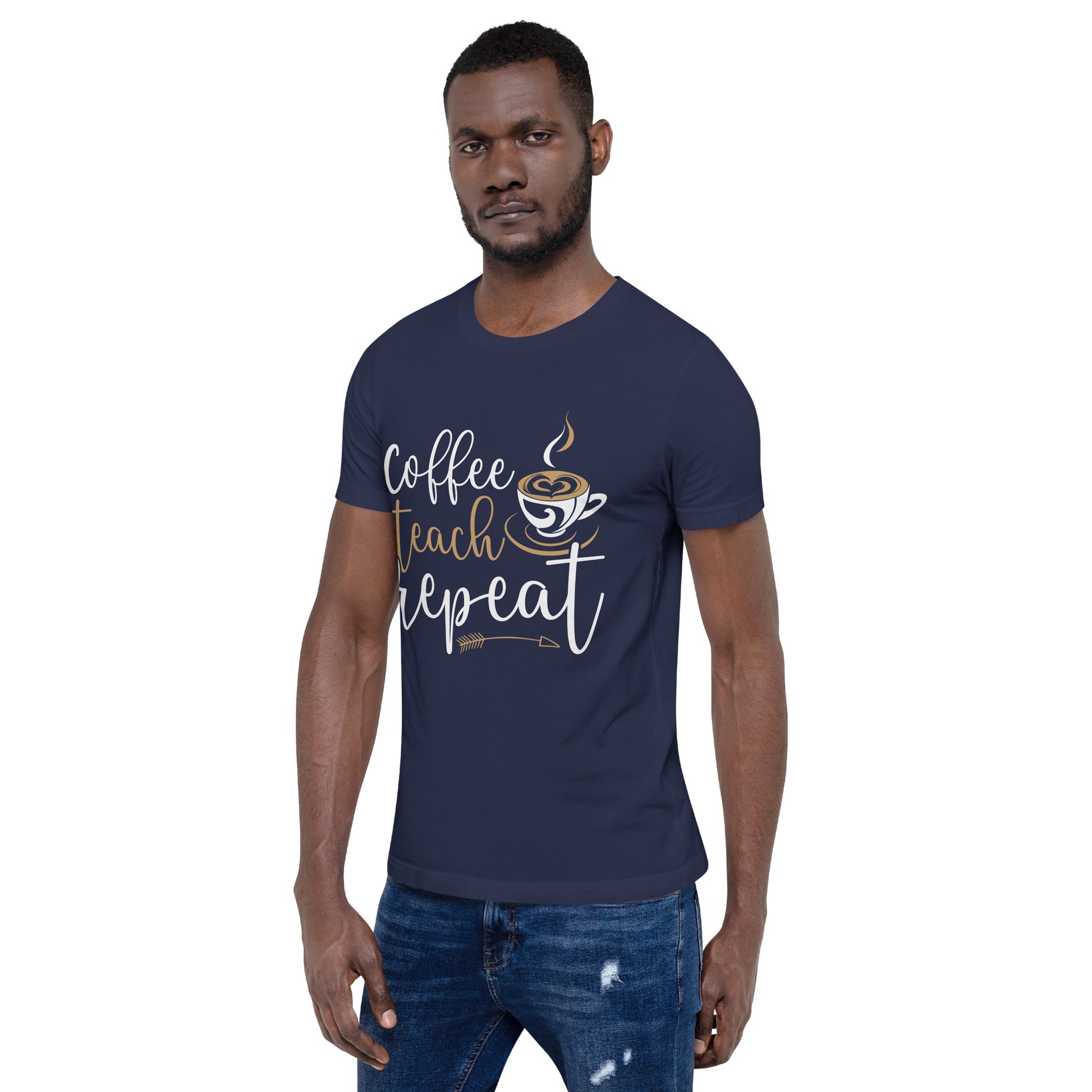 "Coffee Teach Repeat," makes this the perfect choice for educators and coffee enthusiasts alike. The shirt's bold white lettering is complemented by a graphic of a steaming coffee cup, symbolizing the wearer's love for caffeine and passion for teaching. This high-quality, crew-neck T-shirt is not only comfortable but also a great conversation starter, ideal for casual wear or as a gift for a favorite teacher.This t-shirt is everything you've dreamed of and more. It feels soft and lightweight, with the right amount of stretch. It's comfortable and flattering for all.