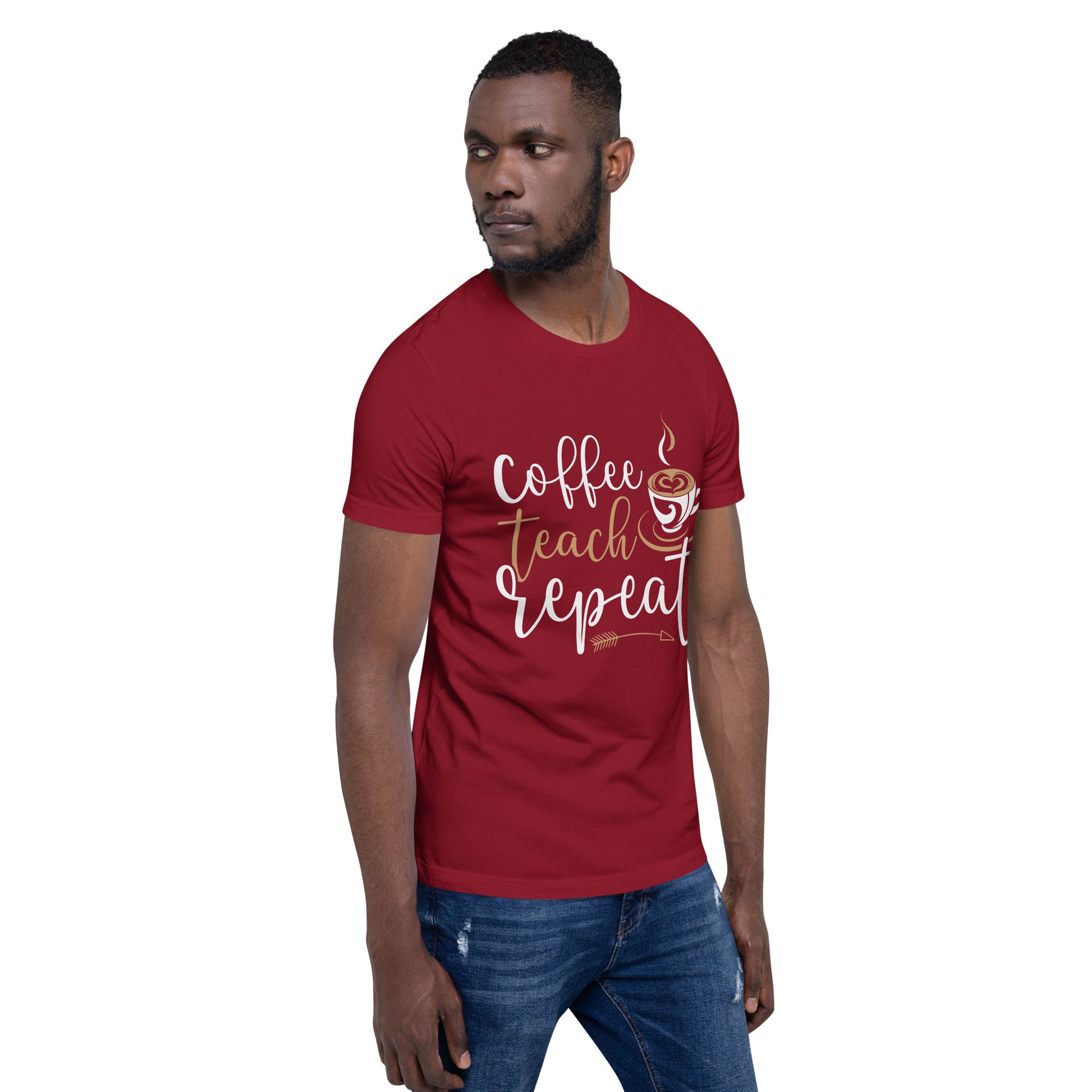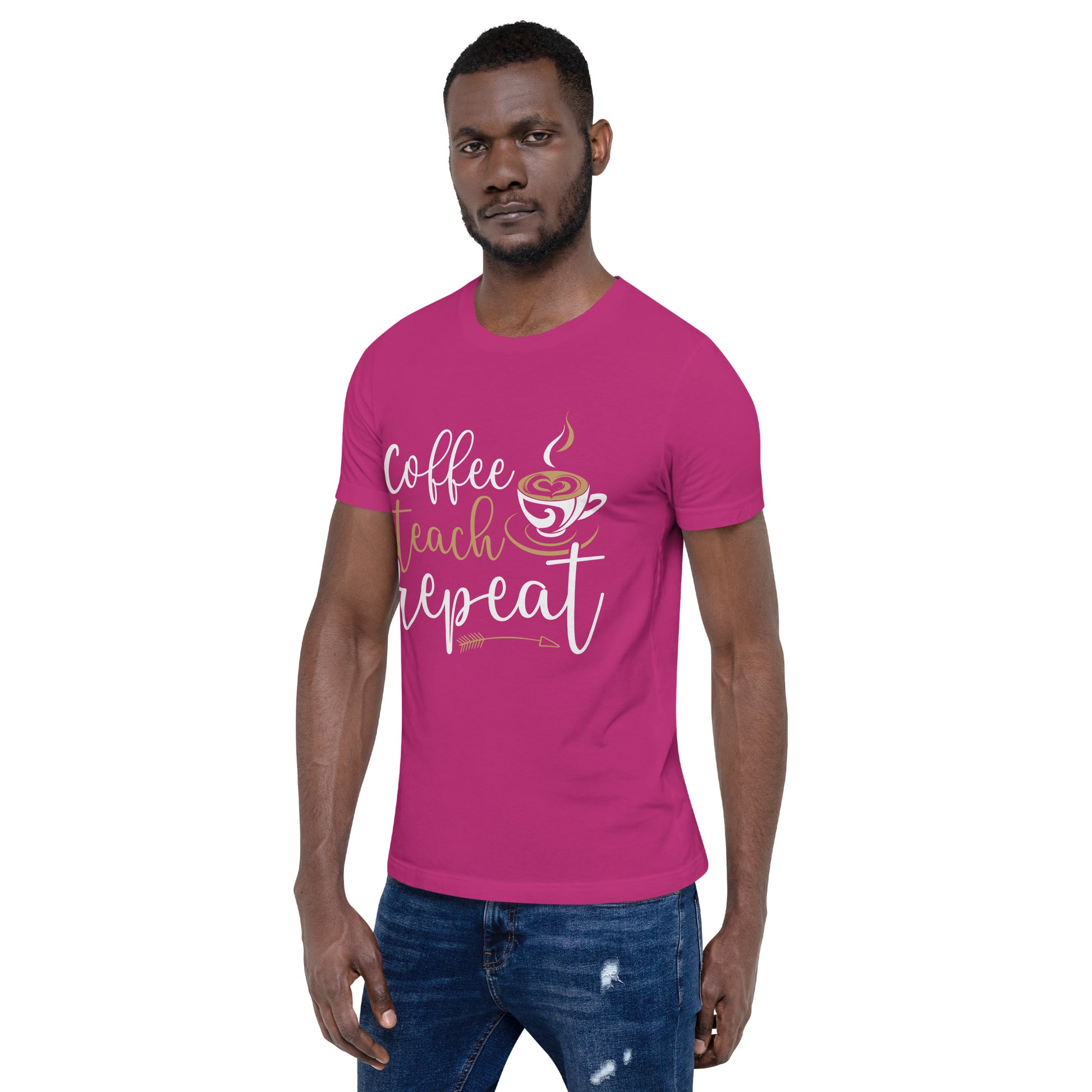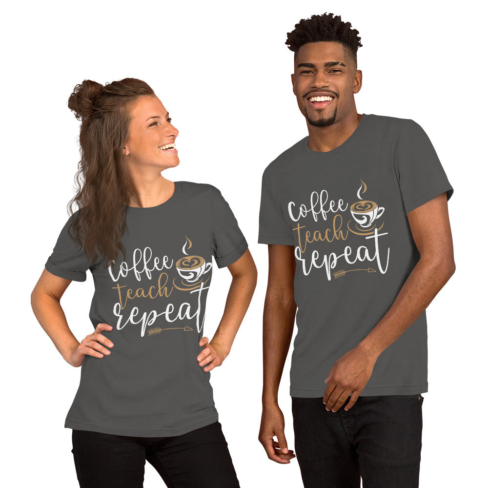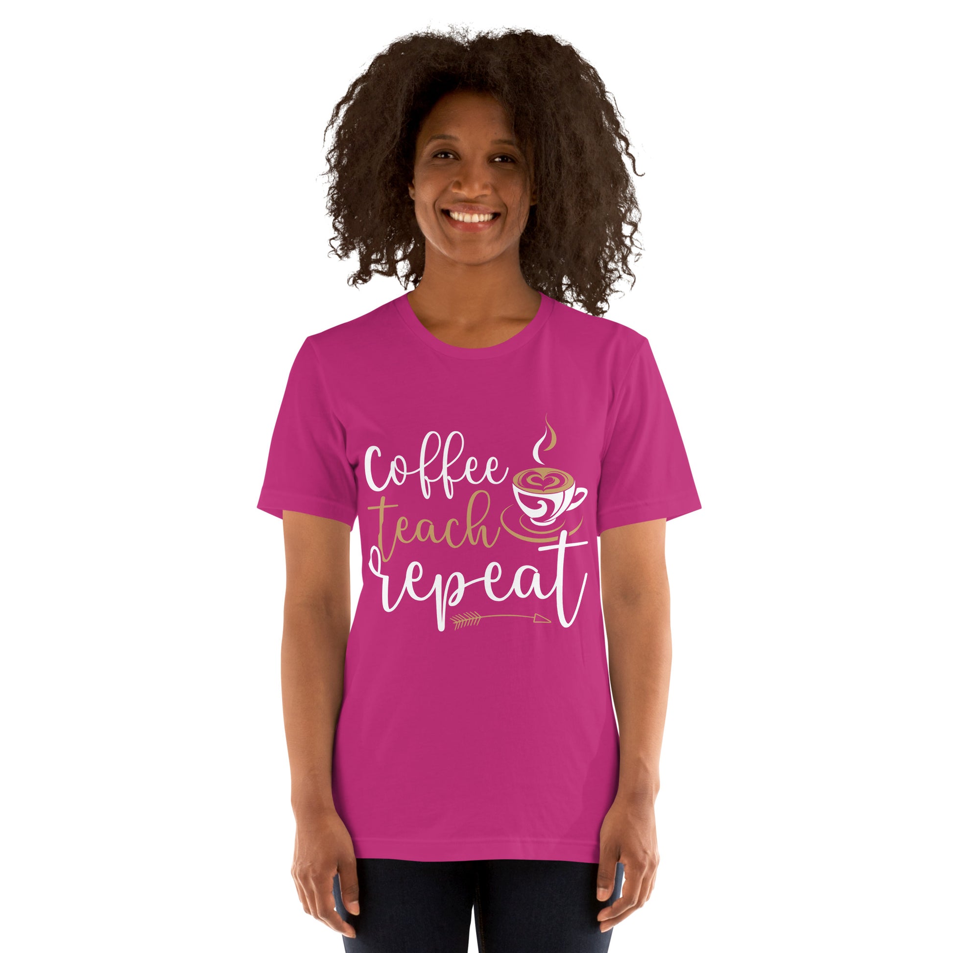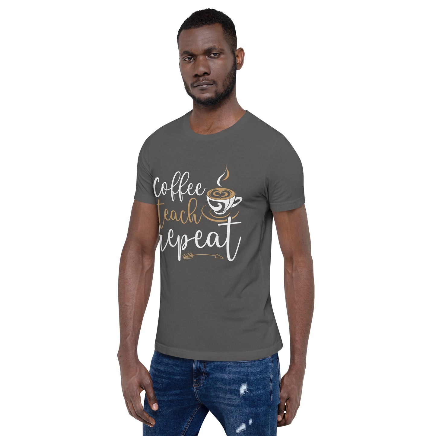"Coffee Teach Repeat," makes this the perfect choice for educators and coffee enthusiasts alike. The shirt's bold white lettering is complemented by a graphic of a steaming coffee cup, symbolizing the wearer's love for caffeine and passion for teaching. This high-quality, crew-neck T-shirt is not only comfortable but also a great conversation starter, ideal for casual wear or as a gift for a favorite teacher.This t-shirt is everything you've dreamed of and more. It feels soft and lightweight, with the right amount of stretch. It's comfortable and flattering for all.