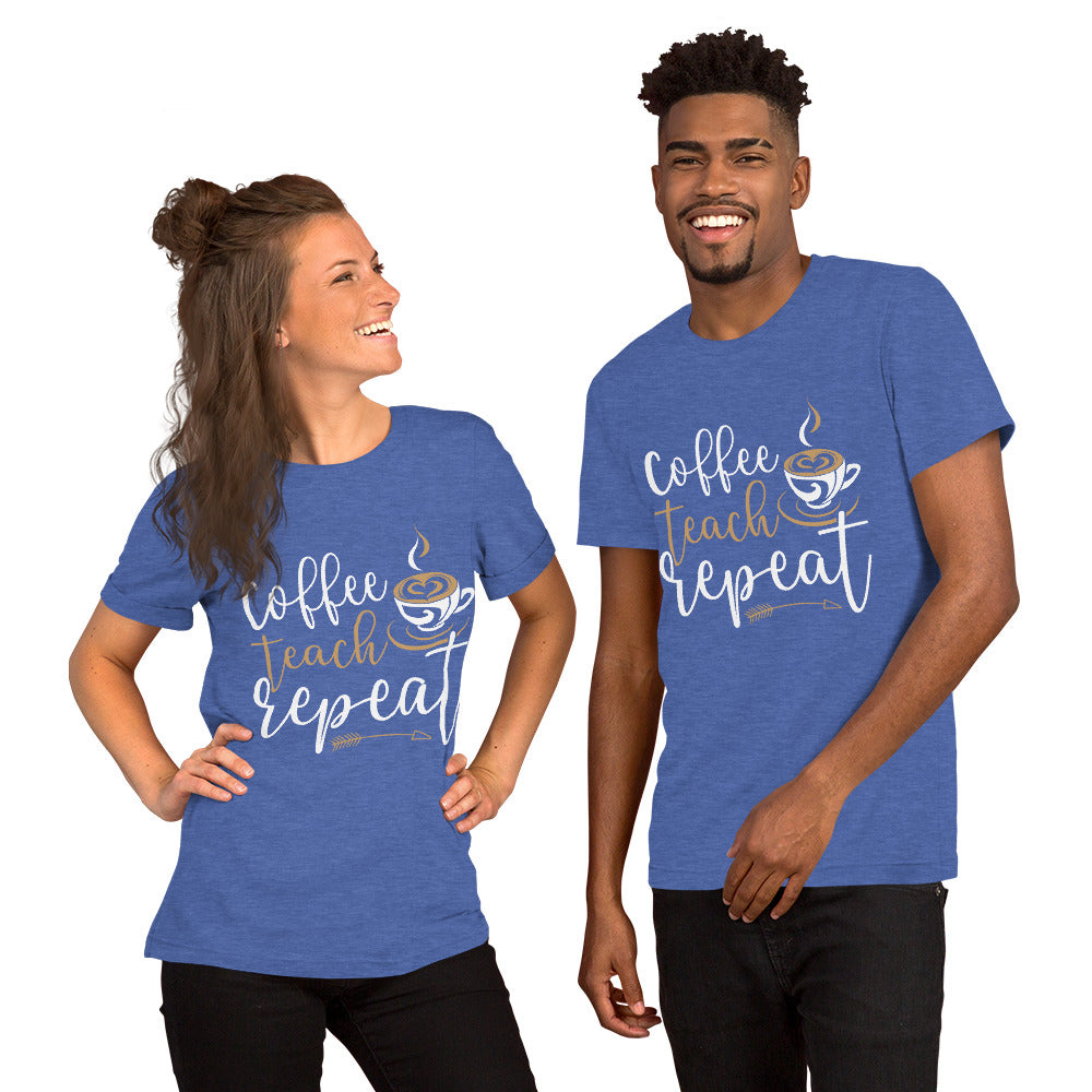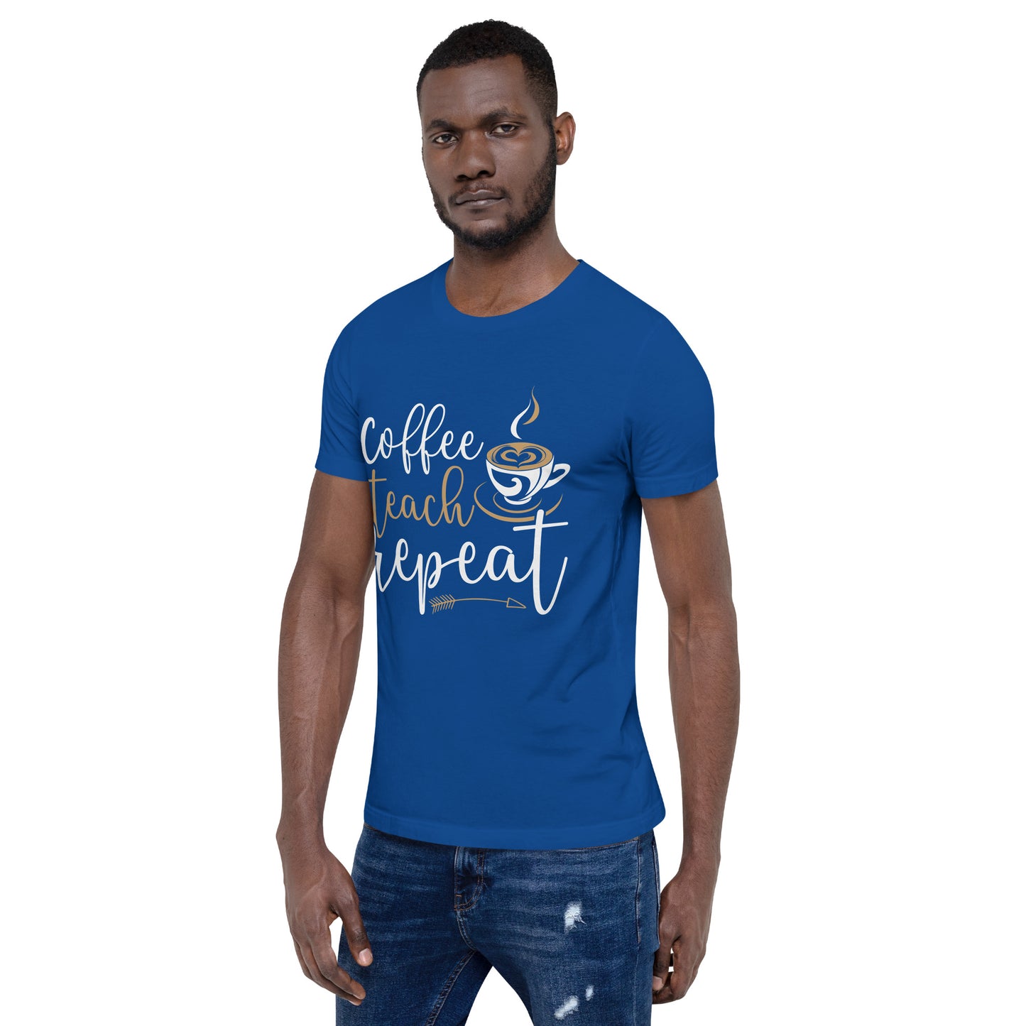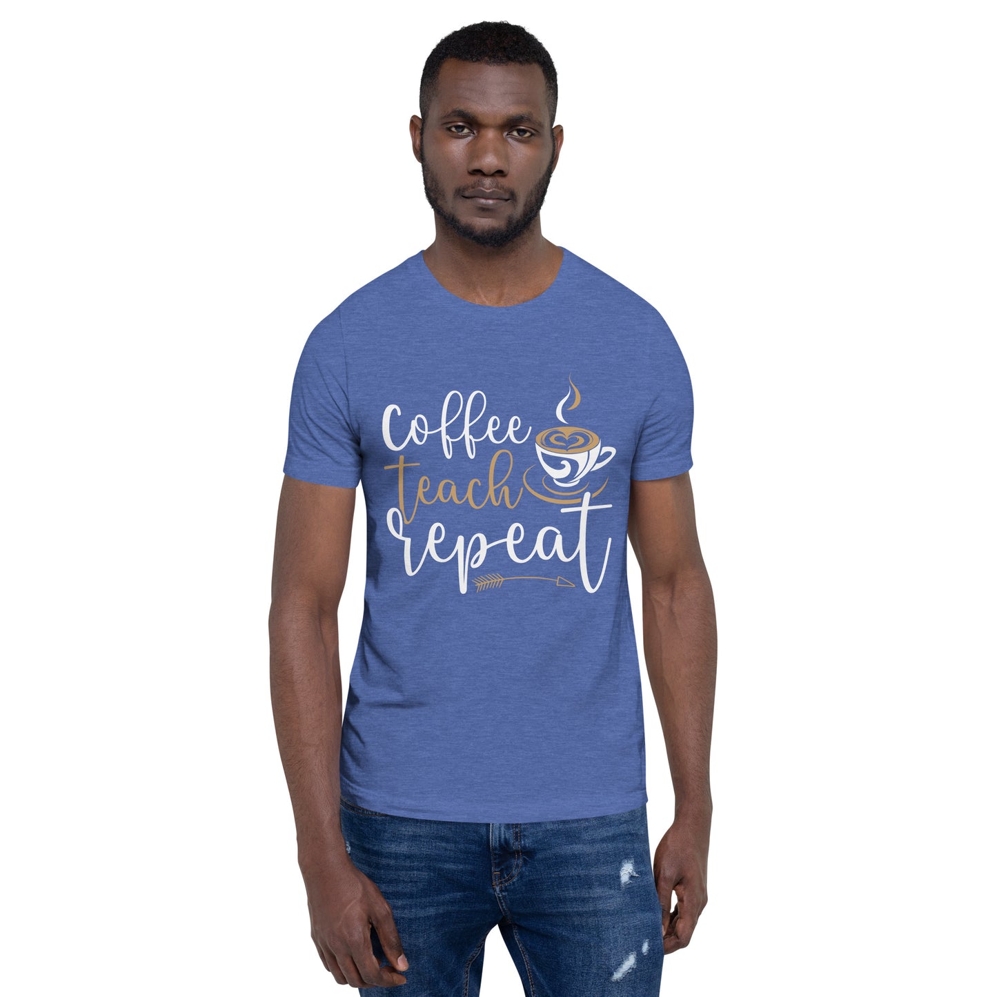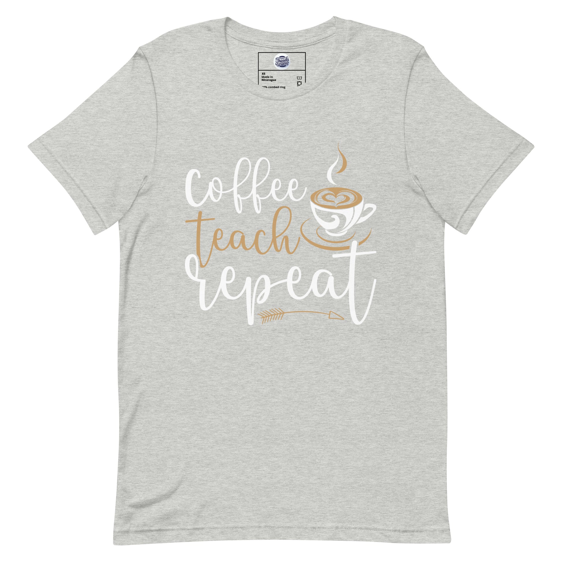 "Coffee Teach Repeat," makes this the perfect choice for educators and coffee enthusiasts alike. The shirt's bold white lettering is complemented by a graphic of a steaming coffee cup, symbolizing the wearer's love for caffeine and passion for teaching. This high-quality, crew-neck T-shirt is not only comfortable but also a great conversation starter, ideal for casual wear or as a gift for a favorite teacher.This t-shirt is everything you've dreamed of and more. It feels soft and lightweight, with the right amount of stretch. It's comfortable and flattering for all.