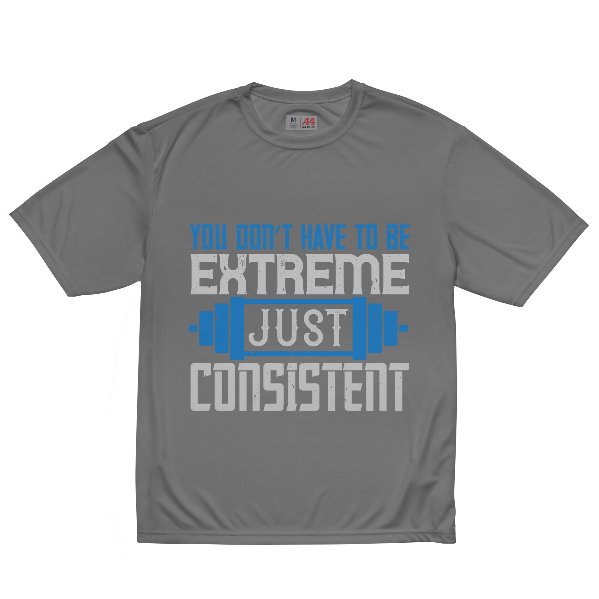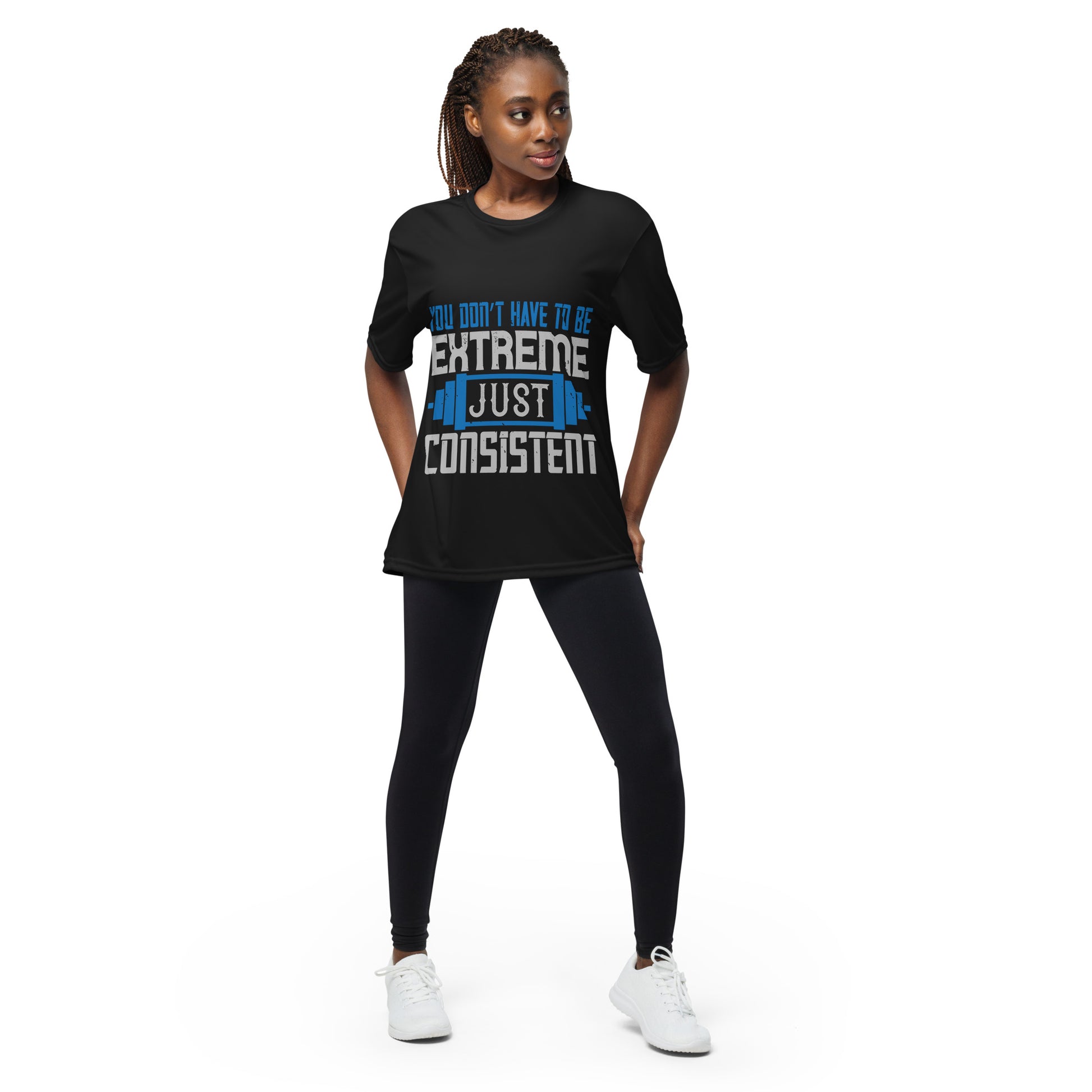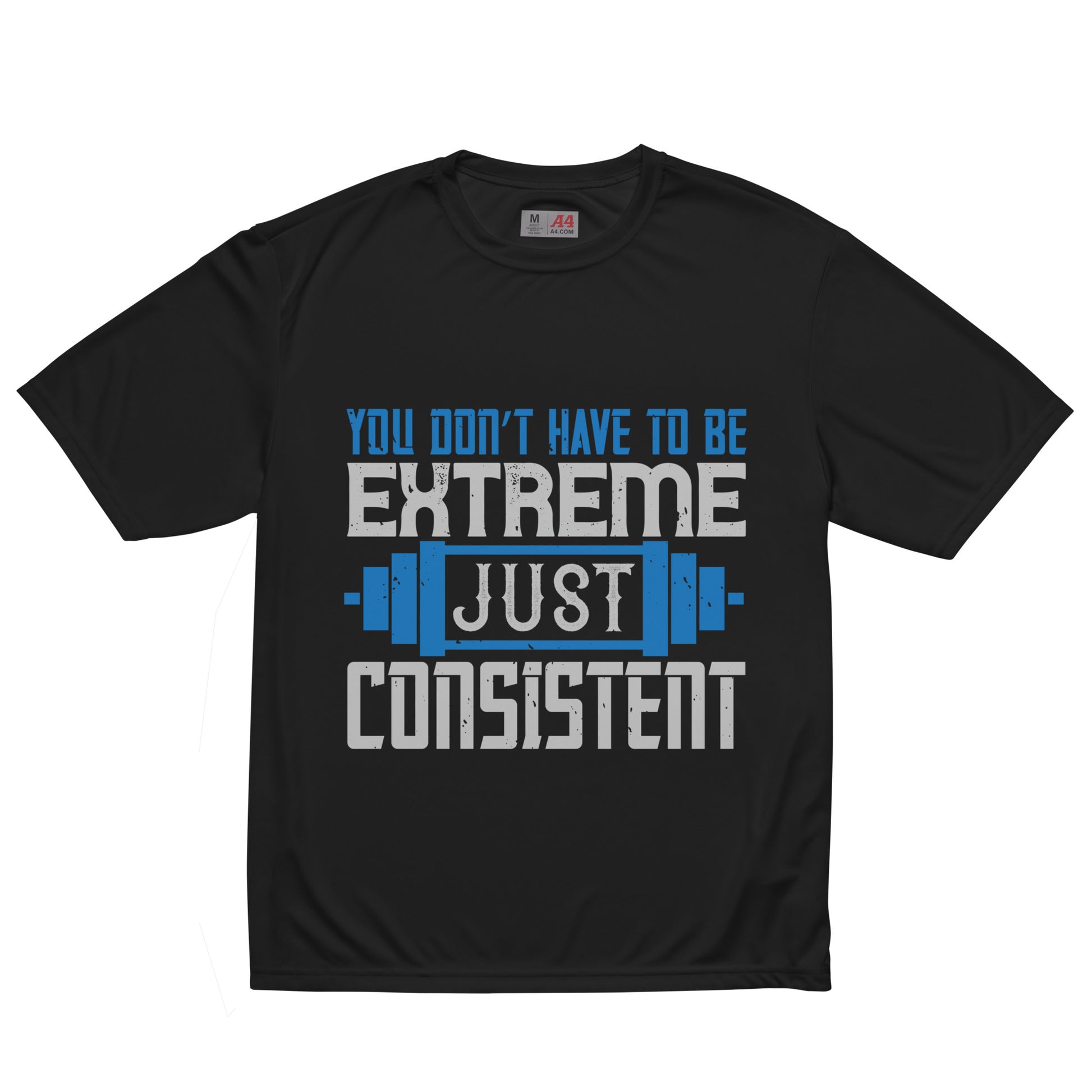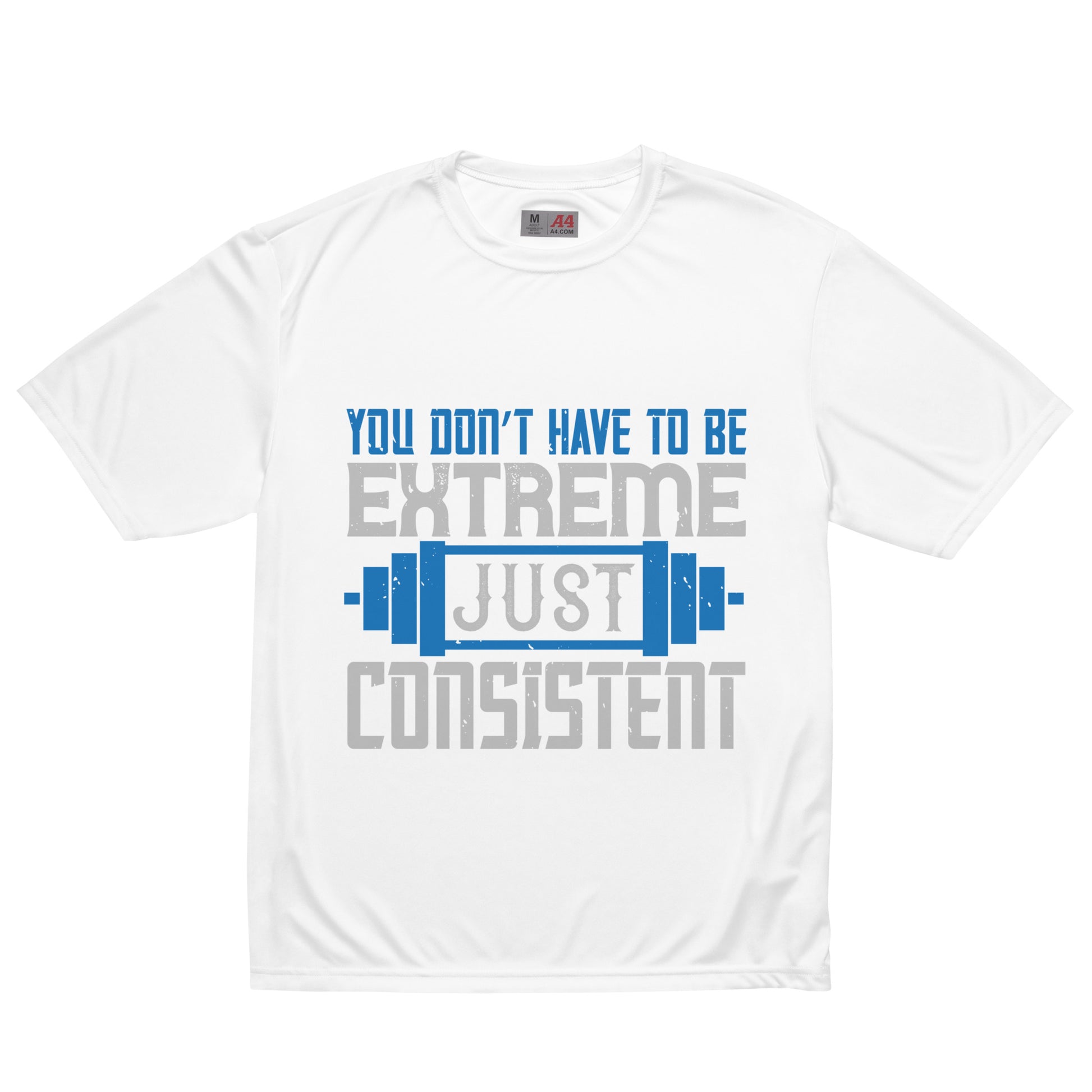 Wrap yourself in the wisdom of wellness with our "Consistency Counts" Perfromance T-Shirt, a tribute to the power of steady action over flashy extremes. This hoodie whispers a mantra for the ages: "You don't have to be extreme, just consistent." It's not just clothing; it's your daily reminder that the race is won not by the swift, but by the steady. Displayed in cool, calm blues and sharp whites against a deep black canvas, this hoodie is for those who find their strength in regularity, their power in persistence. Crafted for comfort and long-lasting wear, it's the ideal companion for your daily routine, be it grinding at the gym or grinding at life. Slip this on and let it be known—you're in it for the long haul, where every small step is a leap in building your legacy. Stay cool, dry, and confident even during the most intense activities in this unisex performance crew neck t-shirt. Made from premium, moisture-wicking fabric with odor resistance, stain release, and UV protection, this shirt’s perfect for going to the gym, playing sports, hiking, or any other activity.