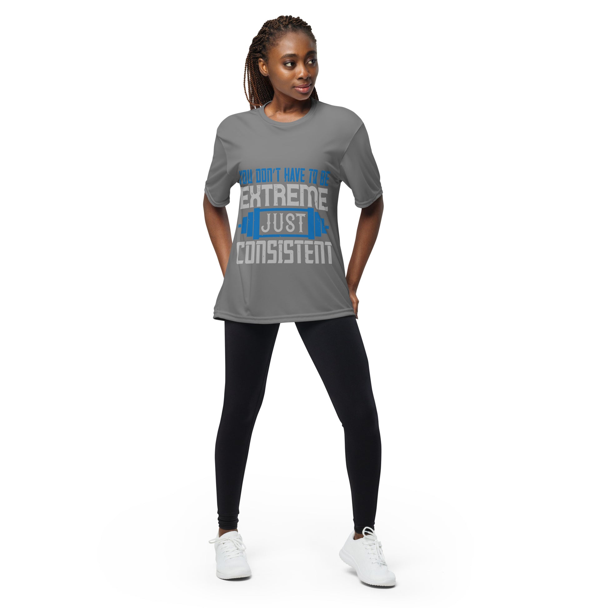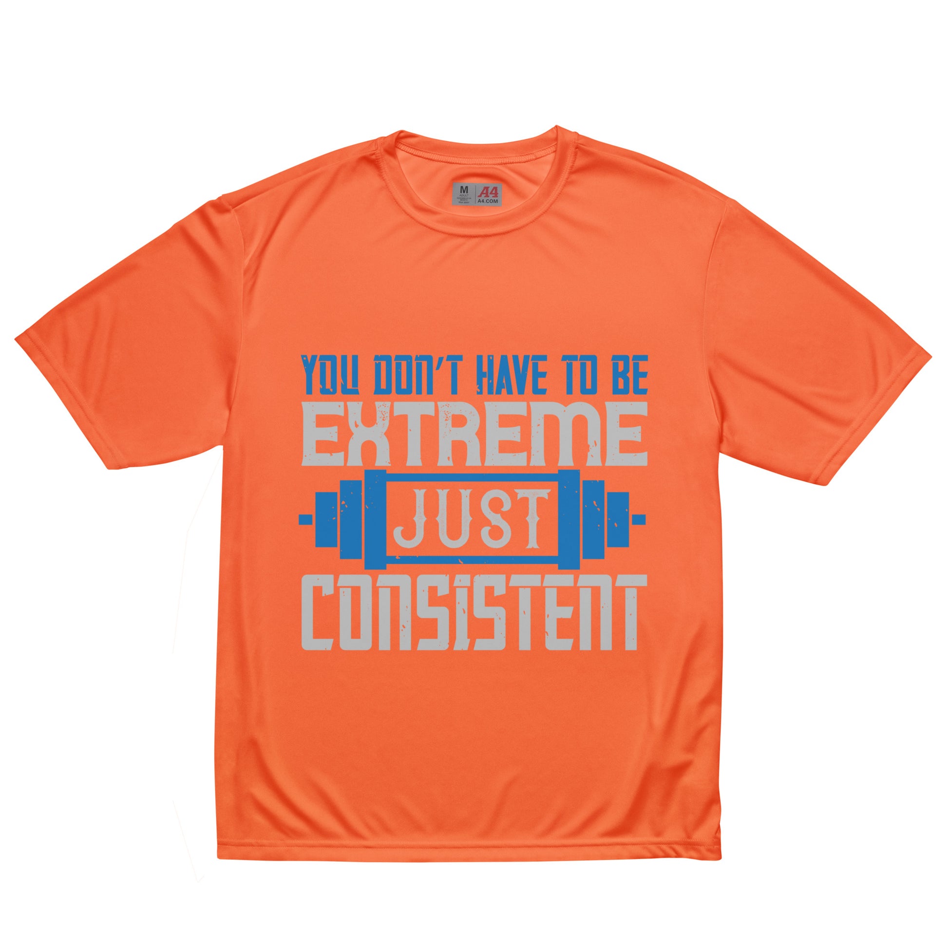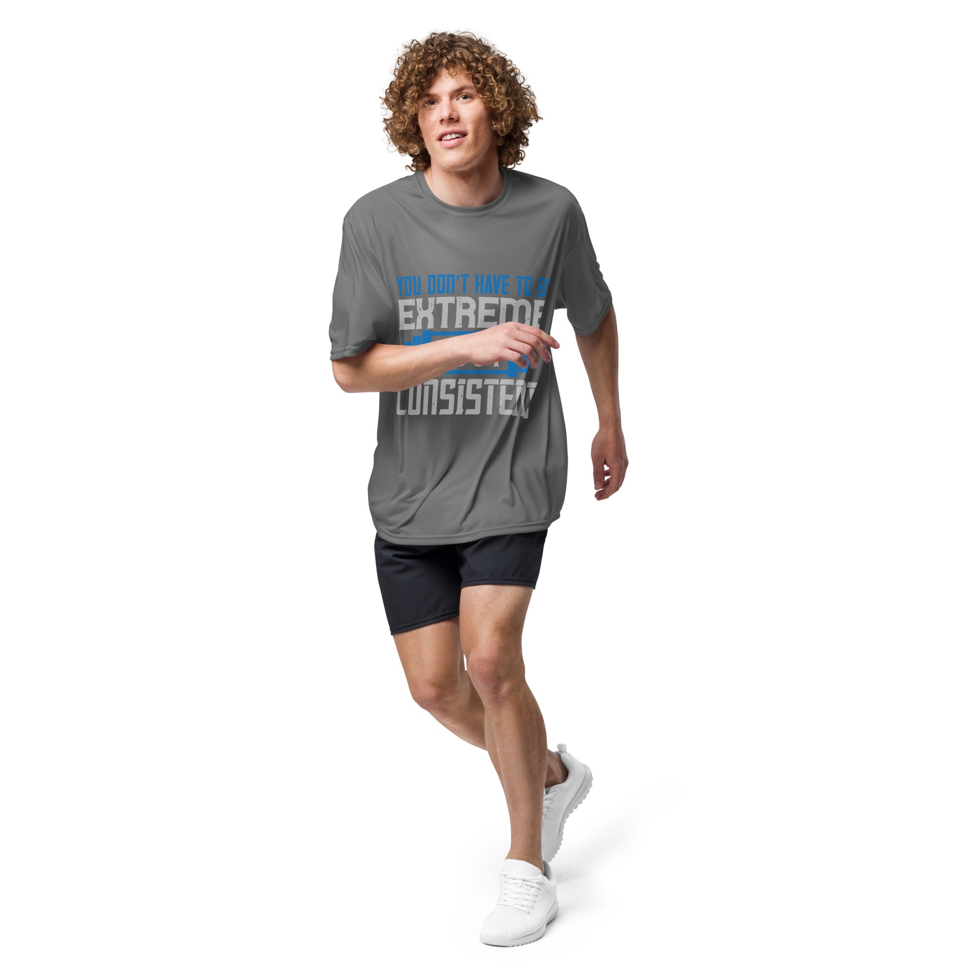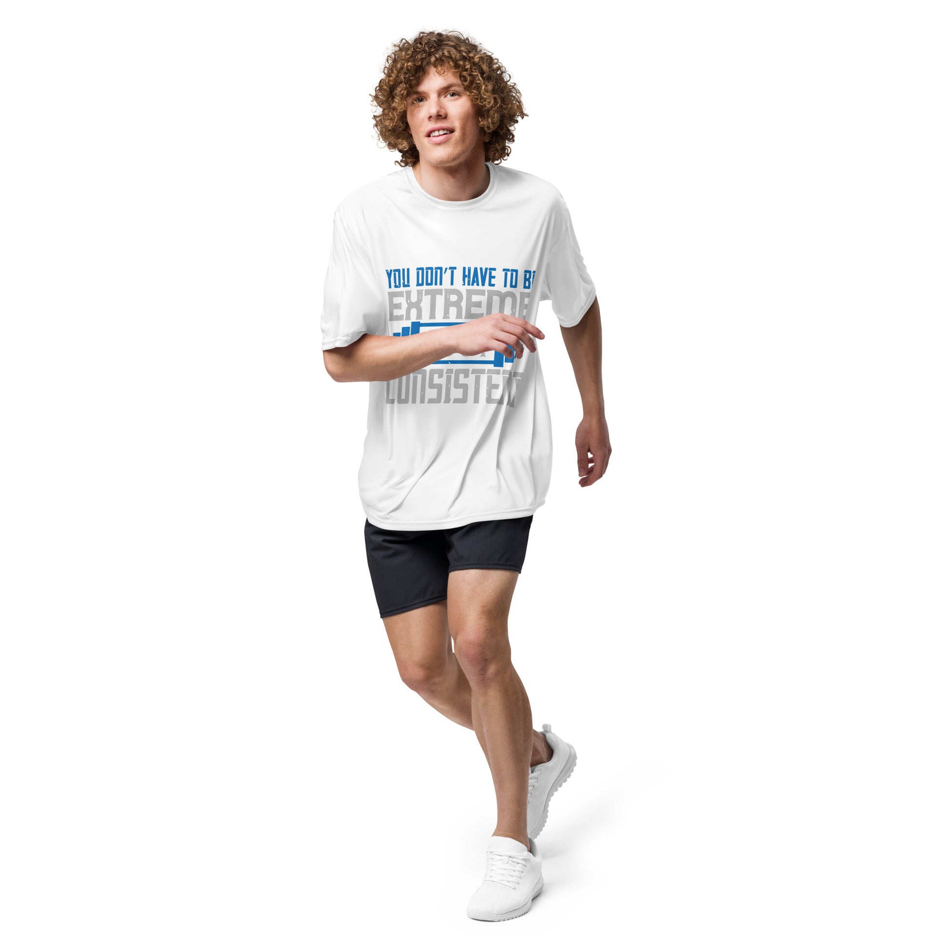 Wrap yourself in the wisdom of wellness with our "Consistency Counts" Perfromance T-Shirt, a tribute to the power of steady action over flashy extremes. This hoodie whispers a mantra for the ages: "You don't have to be extreme, just consistent." It's not just clothing; it's your daily reminder that the race is won not by the swift, but by the steady. Displayed in cool, calm blues and sharp whites against a deep black canvas, this hoodie is for those who find their strength in regularity, their power in persistence. Crafted for comfort and long-lasting wear, it's the ideal companion for your daily routine, be it grinding at the gym or grinding at life. Slip this on and let it be known—you're in it for the long haul, where every small step is a leap in building your legacy. Stay cool, dry, and confident even during the most intense activities in this unisex performance crew neck t-shirt. Made from premium, moisture-wicking fabric with odor resistance, stain release, and UV protection, this shirt’s perfect for going to the gym, playing sports, hiking, or any other activity.
