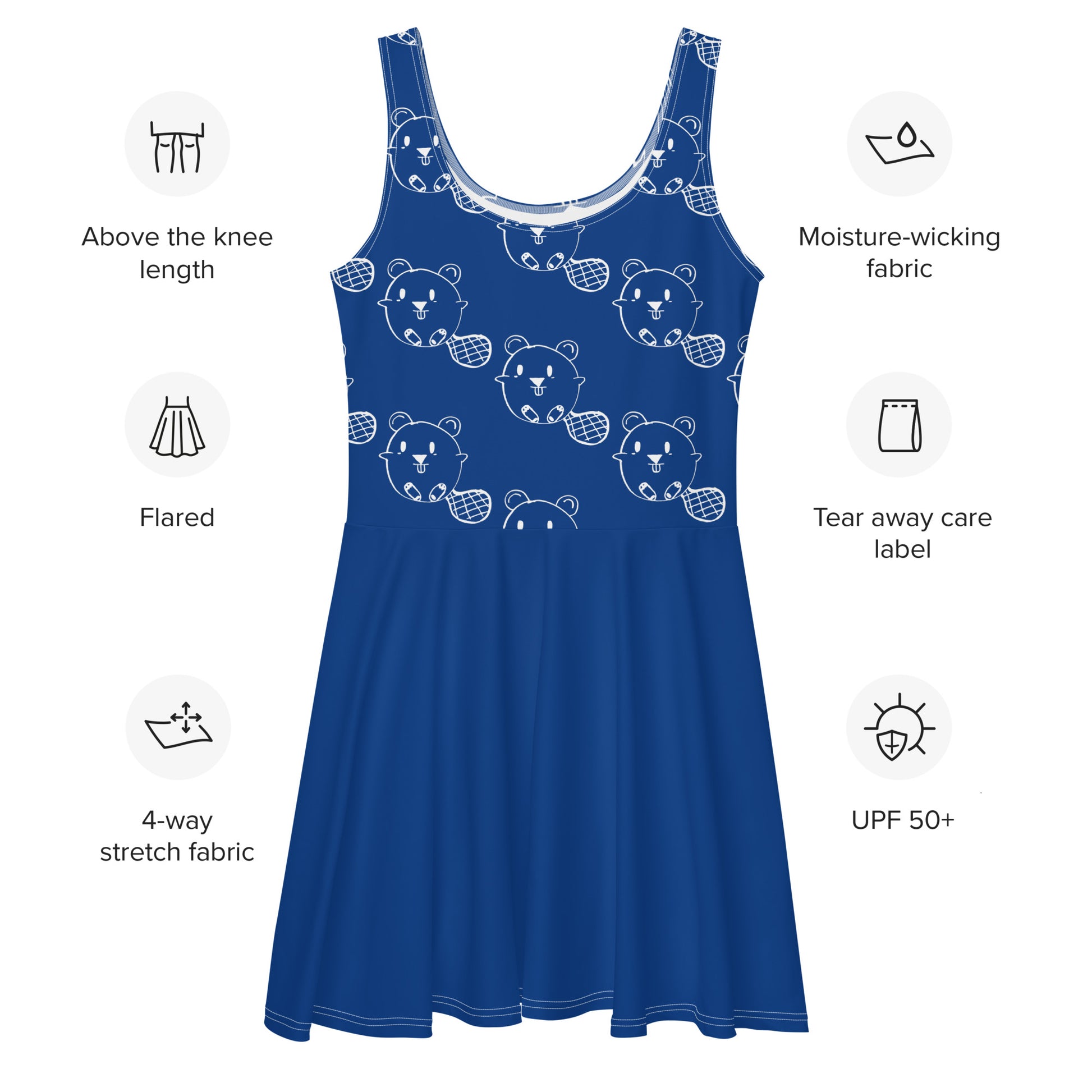 This charming skater dress features an adorable beaver pattern that adds a playful touch to a classic silhouette. The beavers are illustrated in a contrasting hue, creating a delightful and eye-catching design. This dress is perfect for those who love to make a statement with their wardrobe, combining a love for nature with a fun and flirty style. It's versatile enough for a casual day out or can be dressed up for a unique evening look. Dress to impress with this sleeveless skater dress! The soft fabric and flared skirt give it an elegant twist that brings out the intricate design with a beautiful vibrancy.