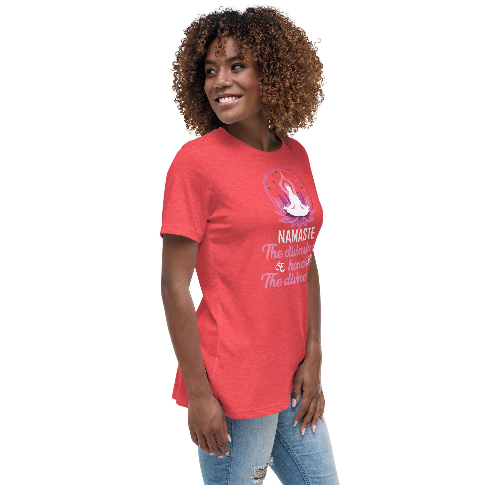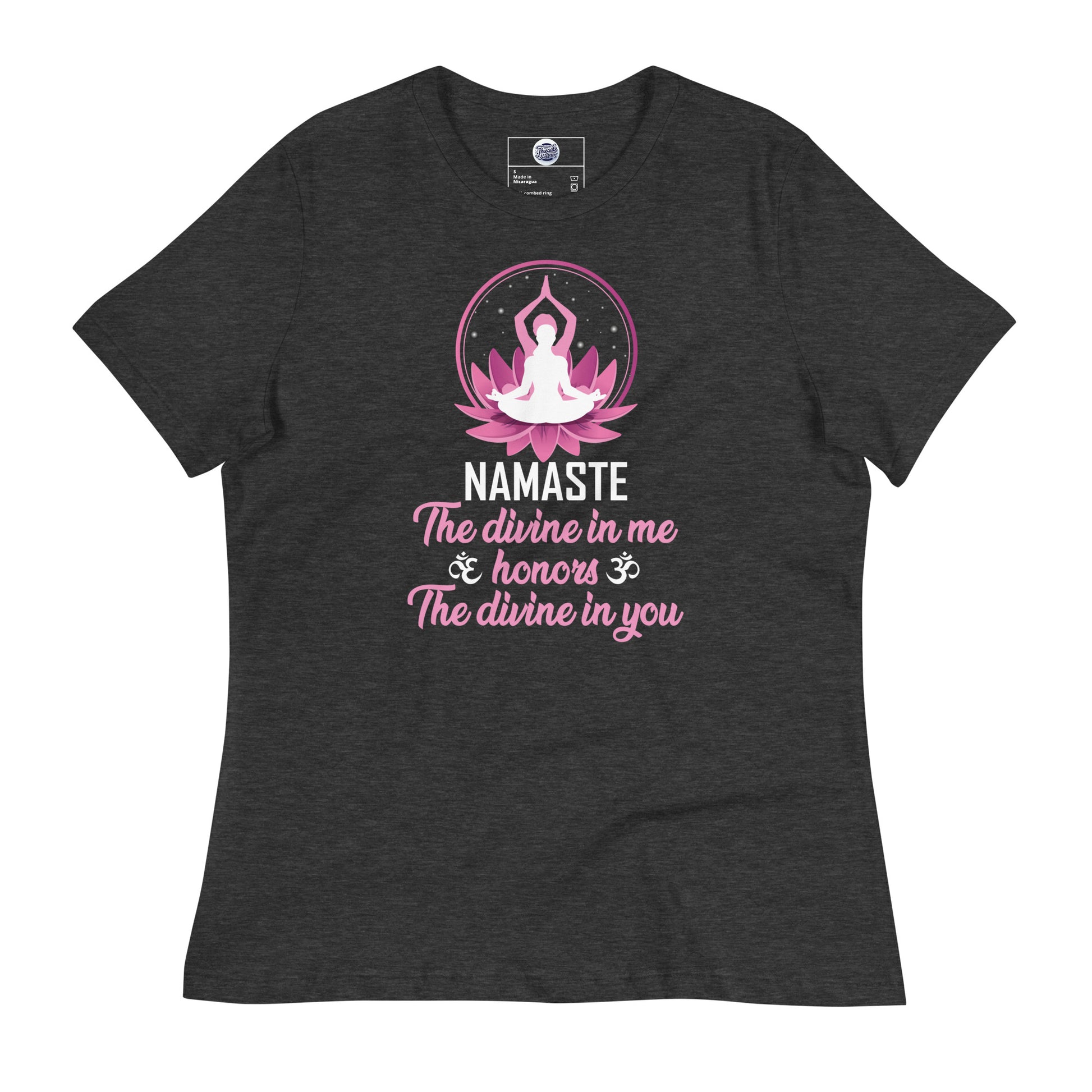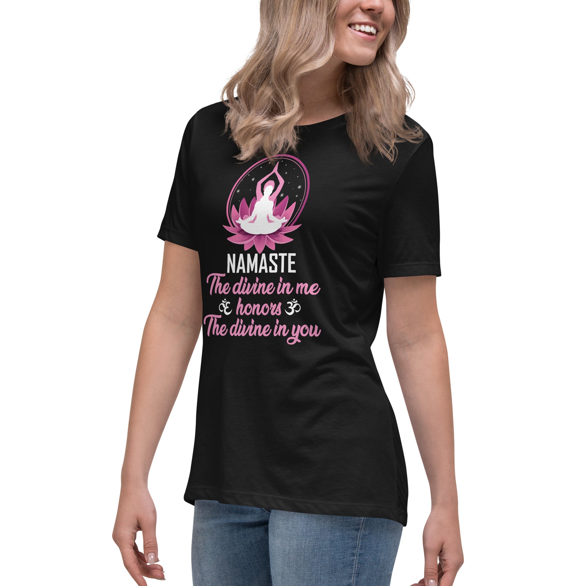 Dress in the essence of serenity with the Divine Harmony T-Shirt. This isn't just any tee; it's a symbol of unity and inner peace, eloquently sharing a universal truth: 'Namaste - The divine in me honors the divine in you.' It's a wearable reminder to live a life of recognition and respect for the spirit that connects us all. Light and comfortable, it's perfect for yoga sessions under the open sky or reflective moments at home. Let this T-shirt be a beacon of your commitment to harmony and mindful living. This just might be the softest and most comfortable women's t-shirt you'll ever own. Combine the relaxed fit and smooth fabric of this tee with jeans to create an effortless every-day outfit, or dress it up with a jacket and dress pants for a business casual look.