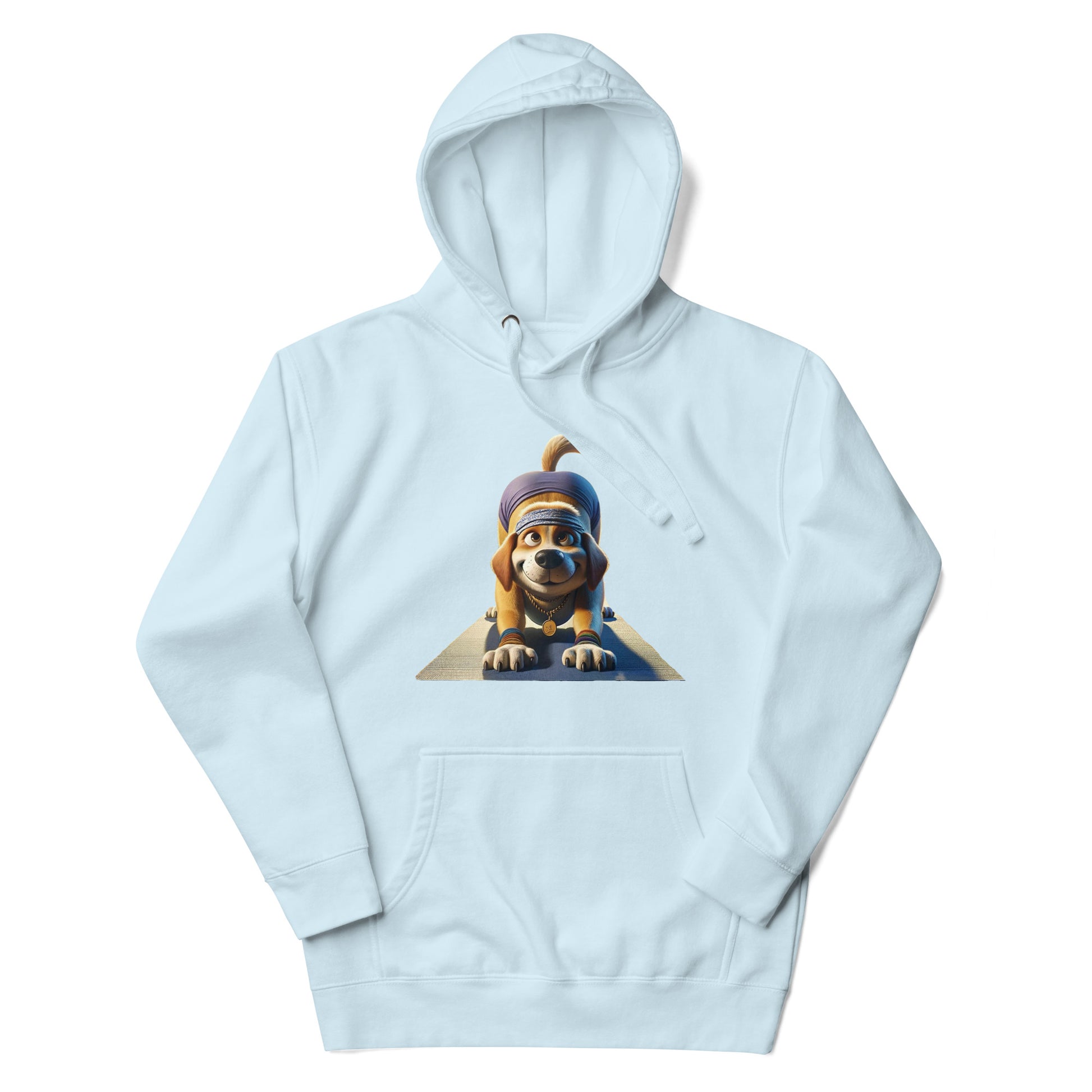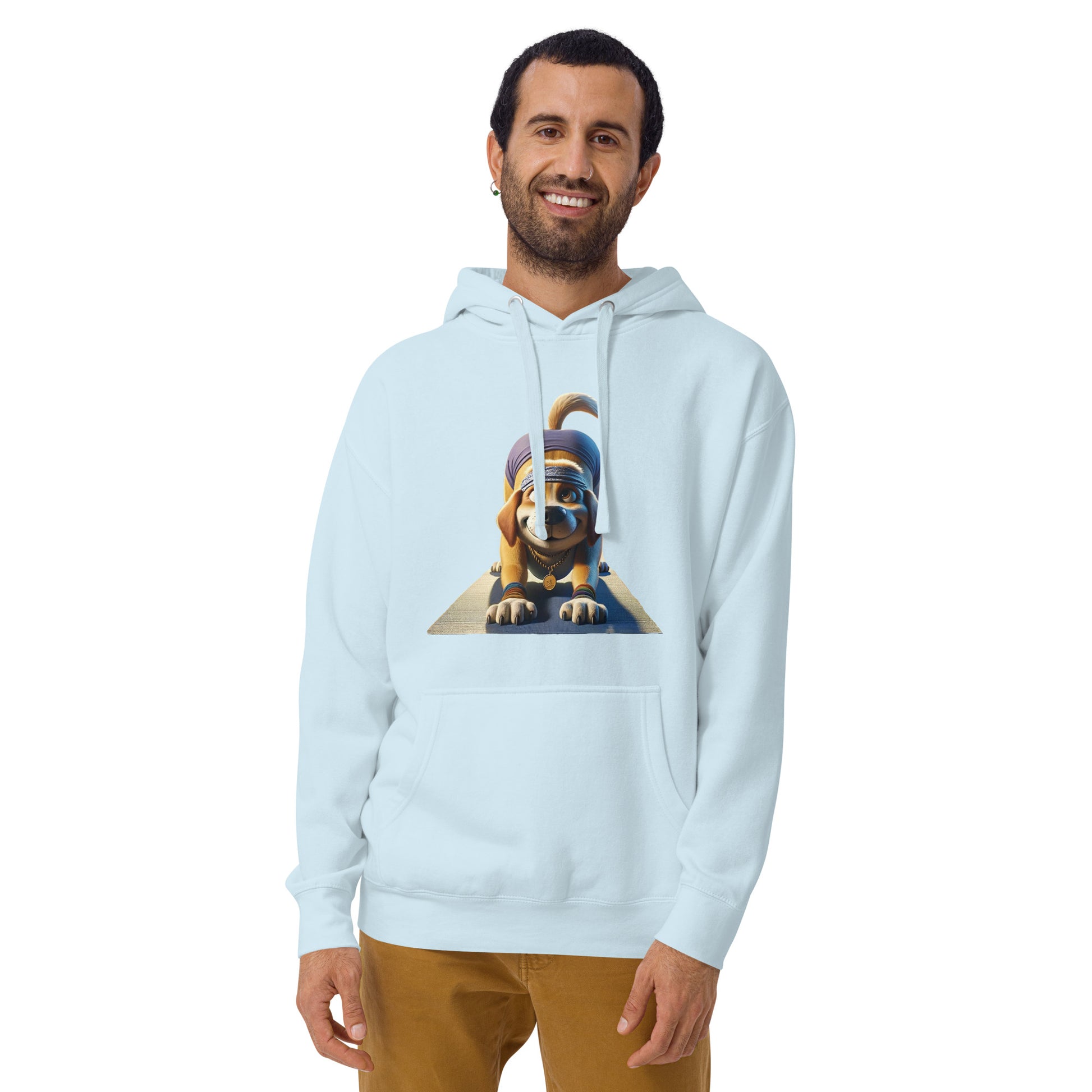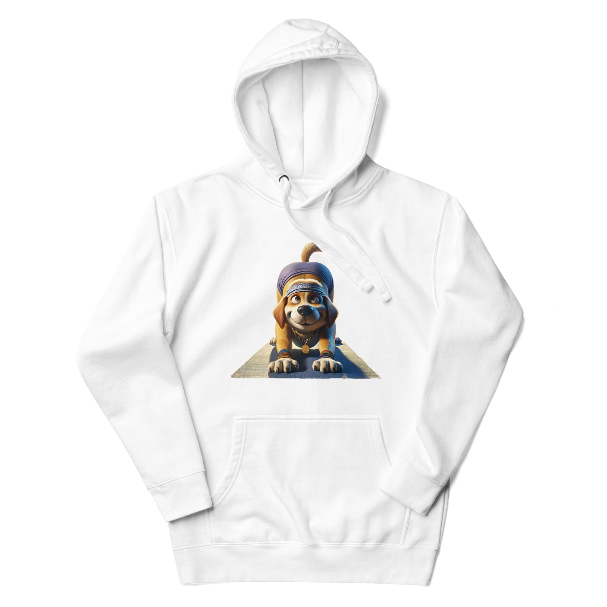 Embrace the chill and find your center with the 'Downward Dawg Hoodie'. Snuggle into serenity with our zen master pup leading the way to cozy enlightenment. Perfect for a cool-down session after hot yoga or a tranquil trail walk with your four-legged friend. It's your cuddly companion in the quest for calm and comfort. Who knew that the softest hoodie you'll ever own comes with such a cool design. You won't regret buying this classic streetwear piece of apparel with a convenient pouch pocket and warm hood for chilly evenings.