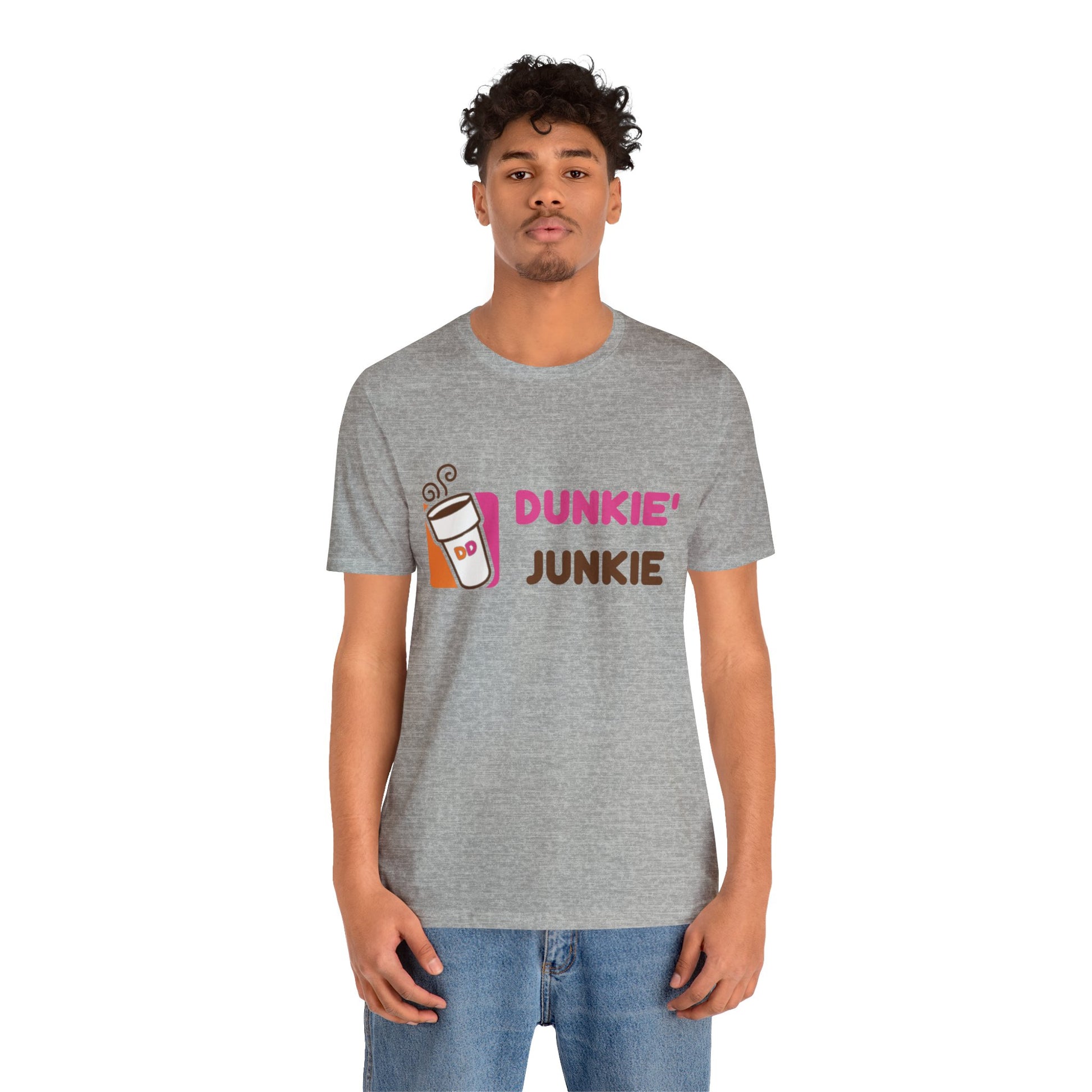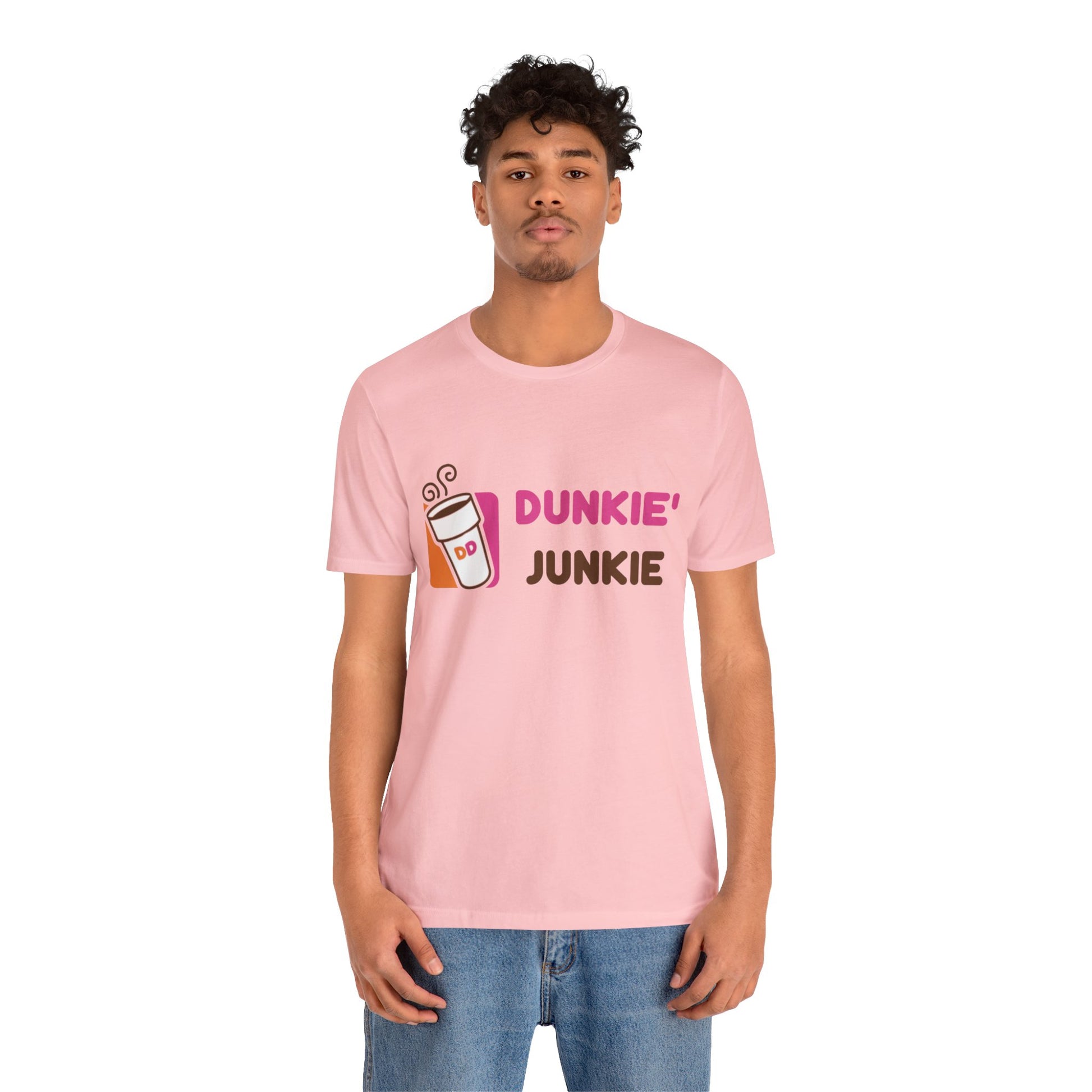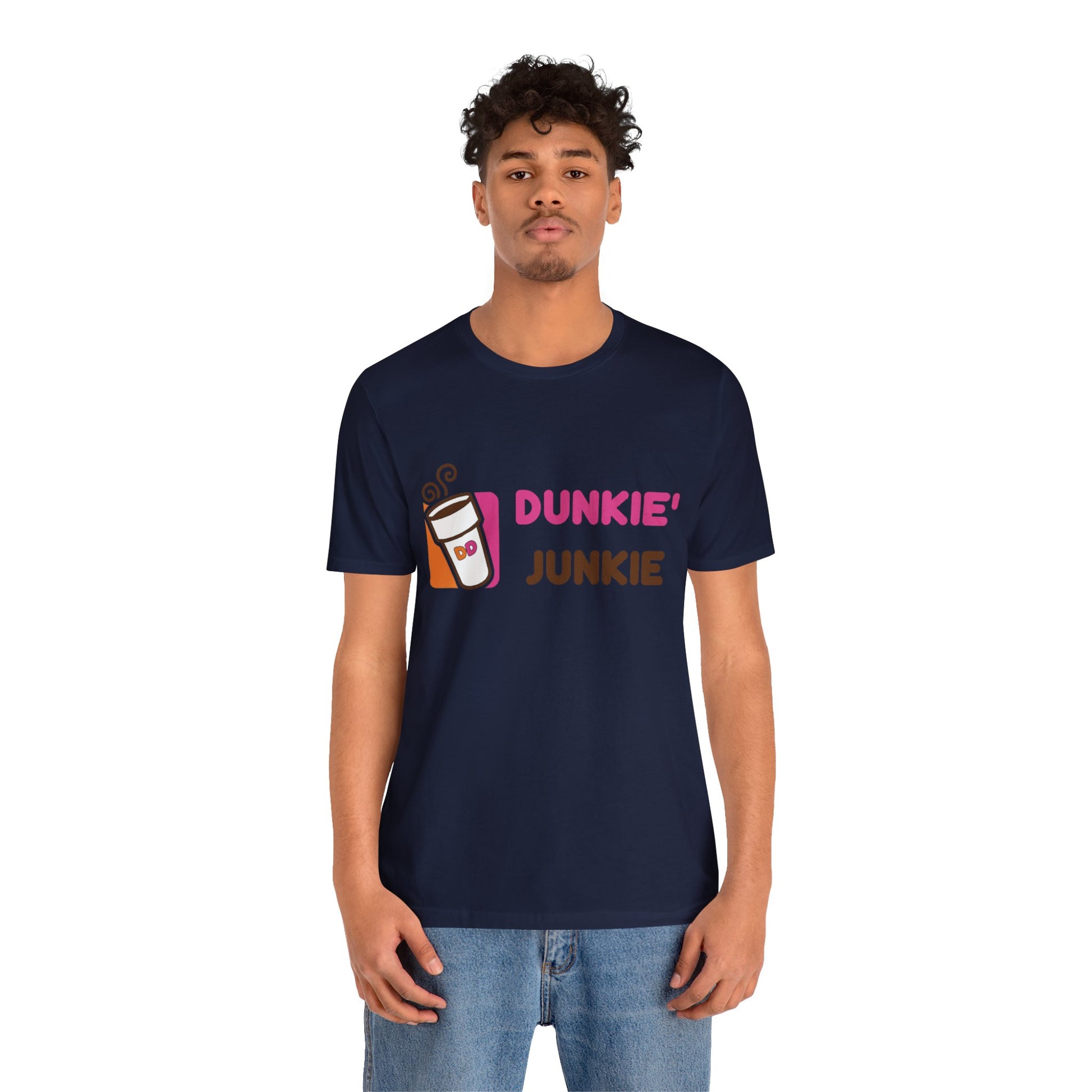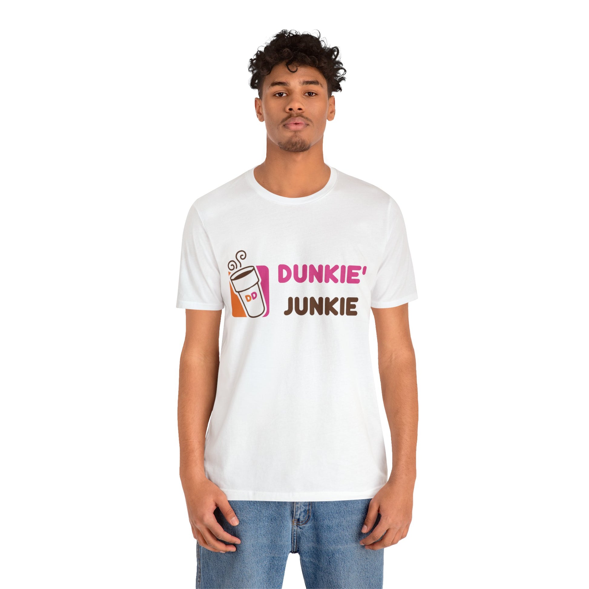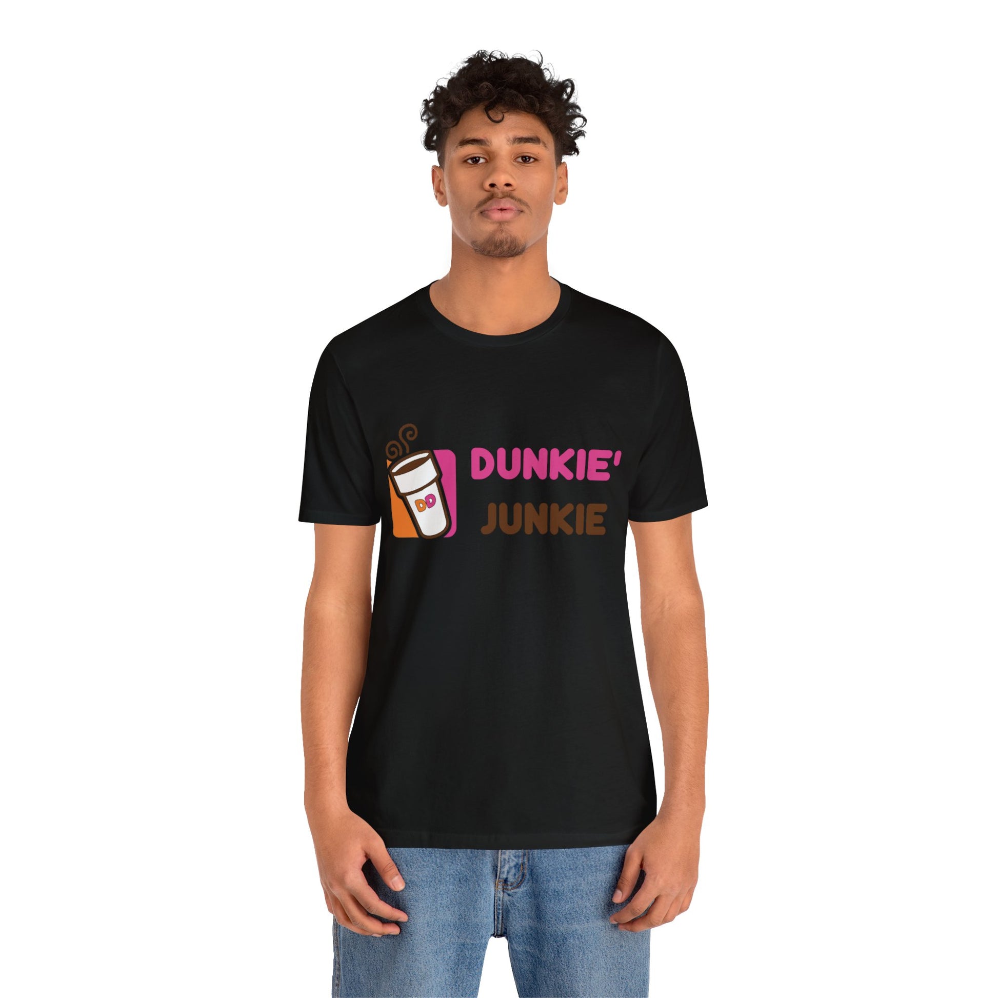 with the 'Dunkie' Junkie T-Shirt, a must-have for the donut-and-coffee duo aficionados. This tee isn't just a garment; it's a statement of delicious proportions. Made for those who believe in the power of a good dunk, it's the perfect conversation starter at your local coffee shop or a sweet addition to your casual wear. Embrace the light-hearted side of life, and wear your cravings on your sleeve – or in this case, on your chest. This classic unisex jersey short sleeve tee fits like a well-loved favorite. Soft cotton and quality print make users fall in love with it over and over again. These t-shirts have-ribbed knit collars to bolster shaping. The shoulders are tapered for a better fit over time. Dual side seams hold the garment's shape for longer.