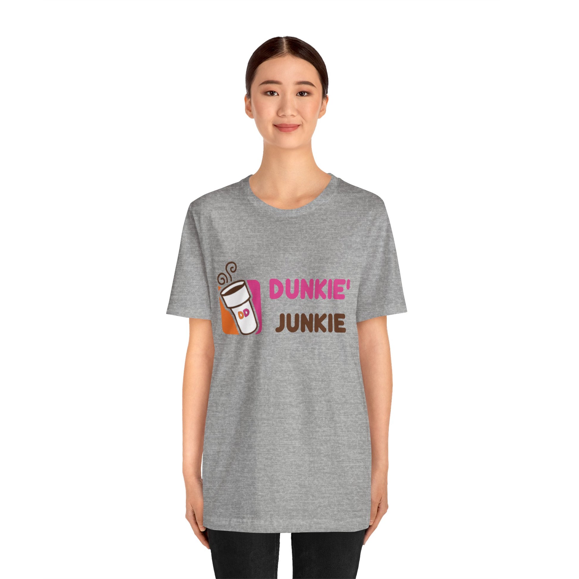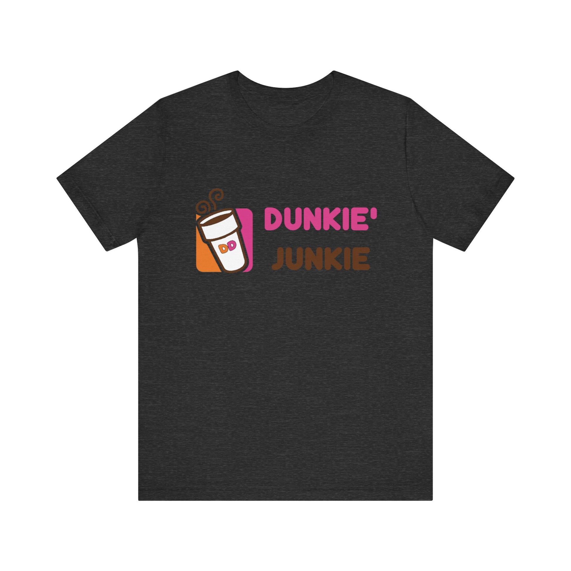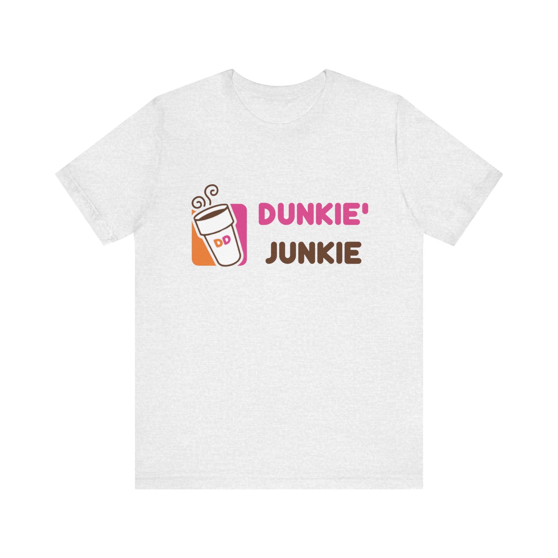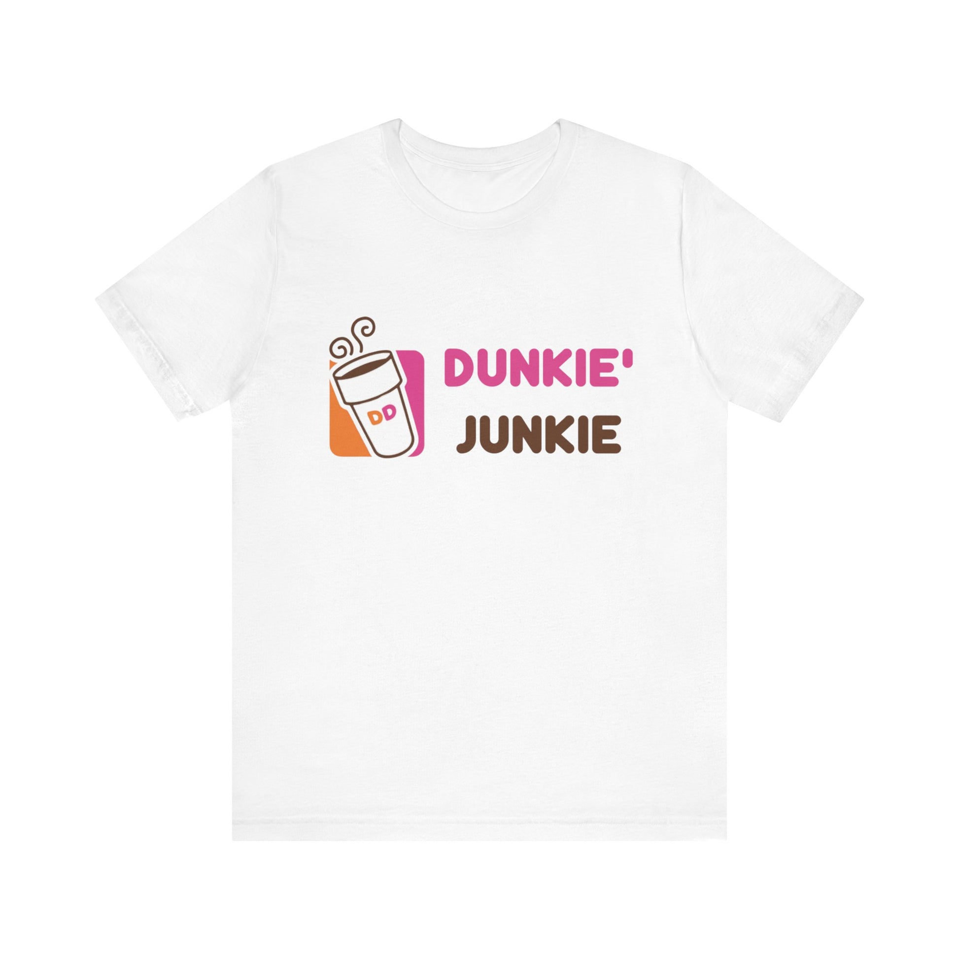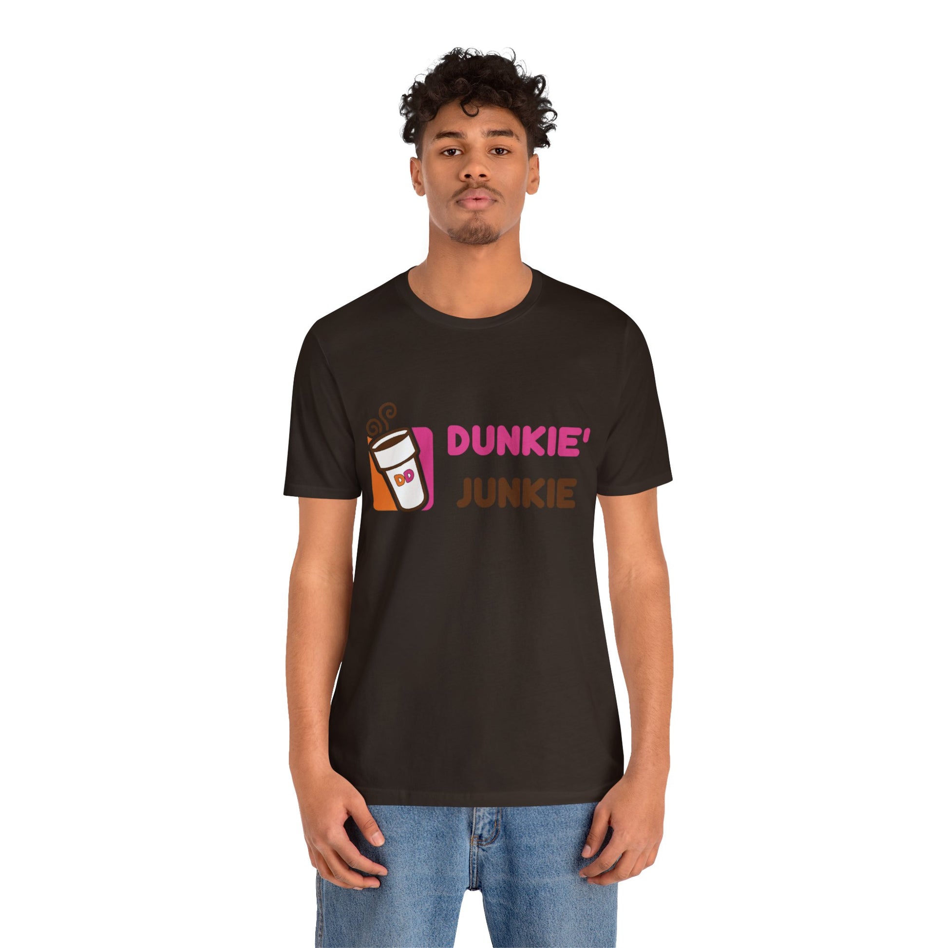 with the 'Dunkie' Junkie T-Shirt, a must-have for the donut-and-coffee duo aficionados. This tee isn't just a garment; it's a statement of delicious proportions. Made for those who believe in the power of a good dunk, it's the perfect conversation starter at your local coffee shop or a sweet addition to your casual wear. Embrace the light-hearted side of life, and wear your cravings on your sleeve – or in this case, on your chest. This classic unisex jersey short sleeve tee fits like a well-loved favorite. Soft cotton and quality print make users fall in love with it over and over again. These t-shirts have-ribbed knit collars to bolster shaping. The shoulders are tapered for a better fit over time. Dual side seams hold the garment's shape for longer.