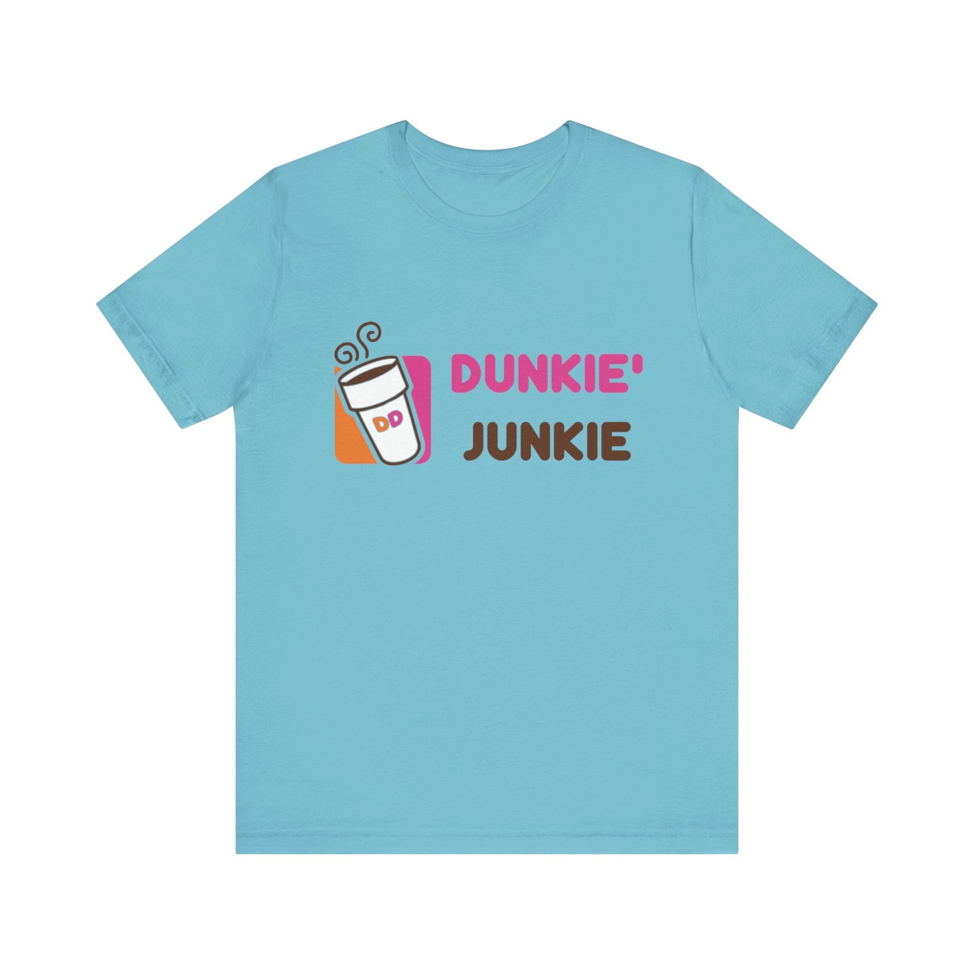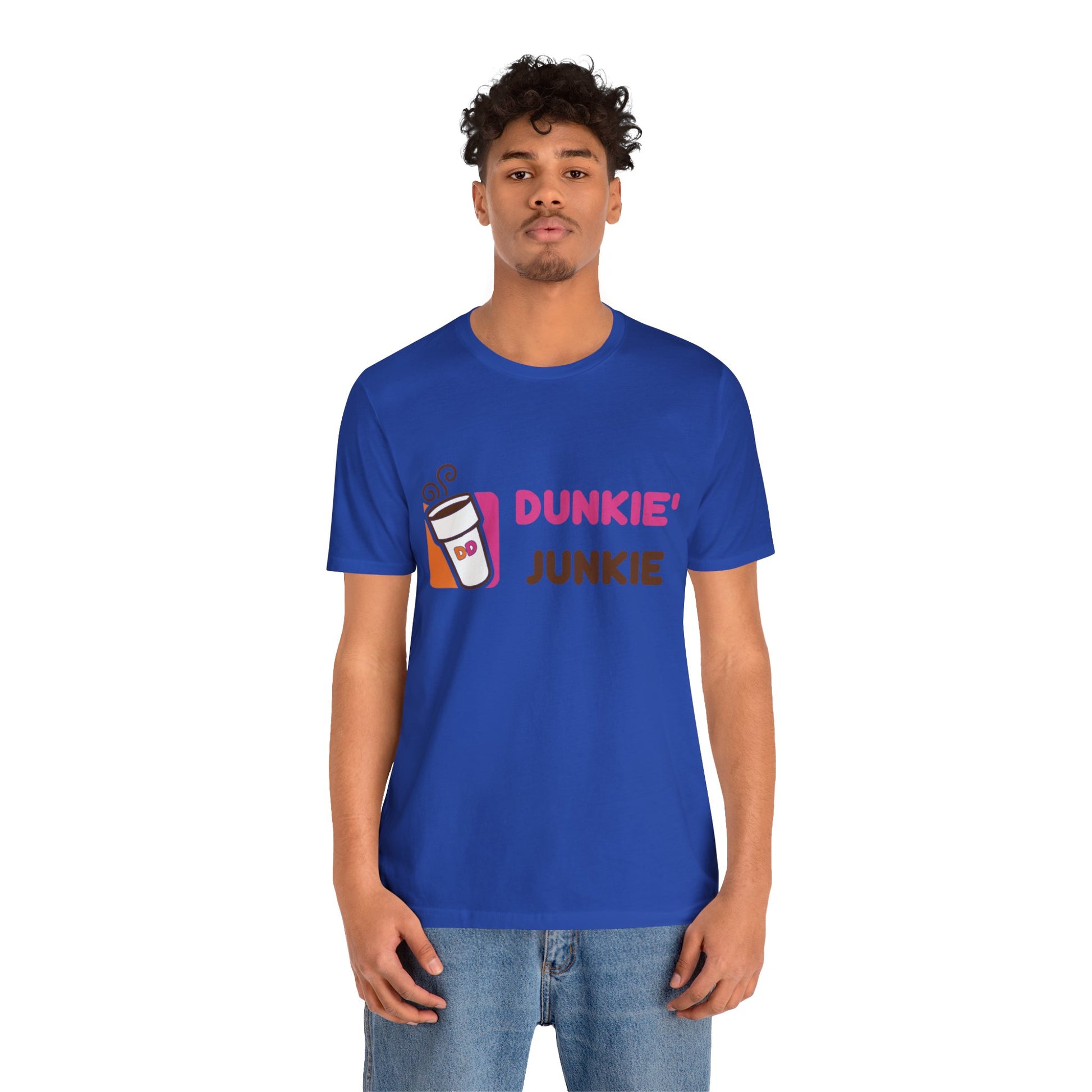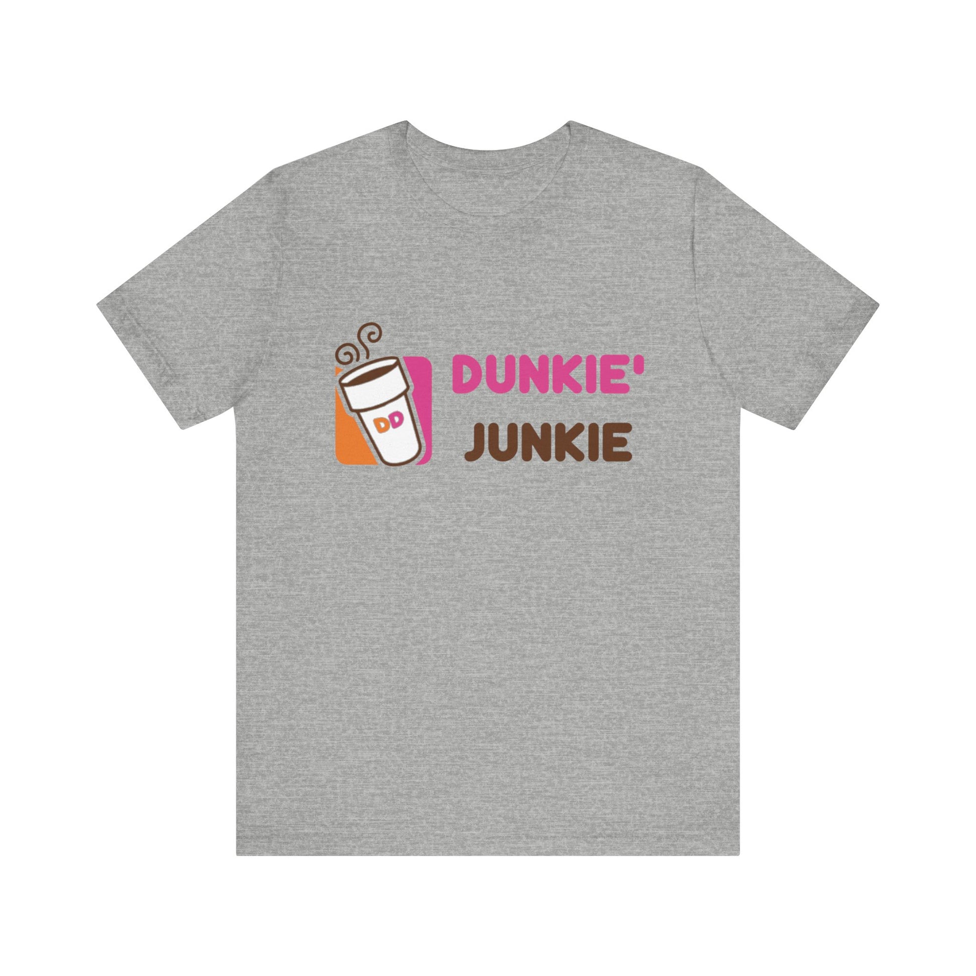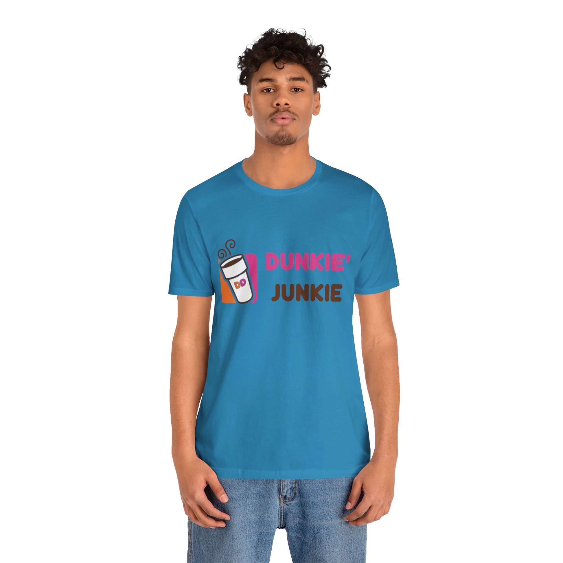 with the 'Dunkie' Junkie T-Shirt, a must-have for the donut-and-coffee duo aficionados. This tee isn't just a garment; it's a statement of delicious proportions. Made for those who believe in the power of a good dunk, it's the perfect conversation starter at your local coffee shop or a sweet addition to your casual wear. Embrace the light-hearted side of life, and wear your cravings on your sleeve – or in this case, on your chest. This classic unisex jersey short sleeve tee fits like a well-loved favorite. Soft cotton and quality print make users fall in love with it over and over again. These t-shirts have-ribbed knit collars to bolster shaping. The shoulders are tapered for a better fit over time. Dual side seams hold the garment's shape for longer.