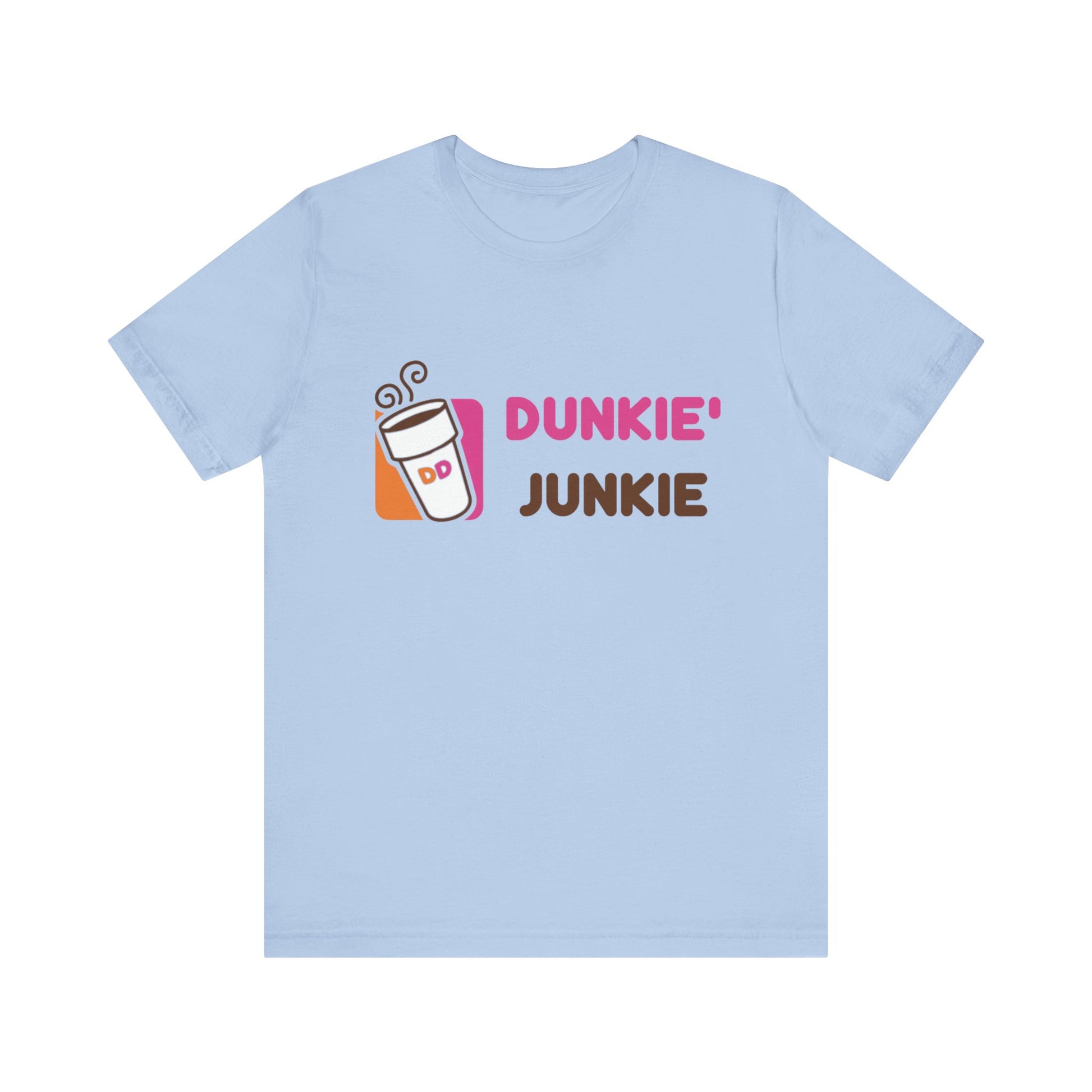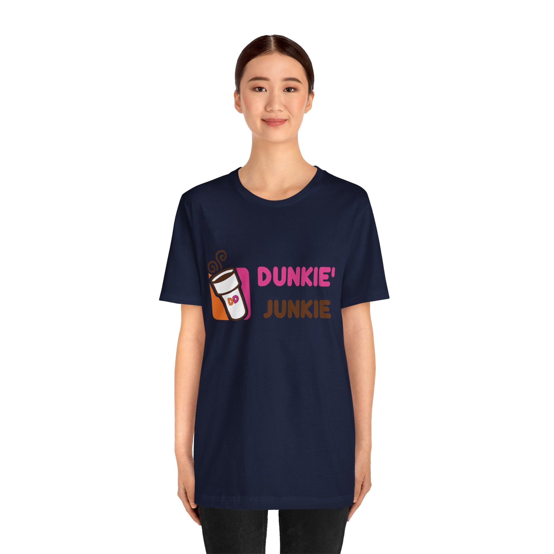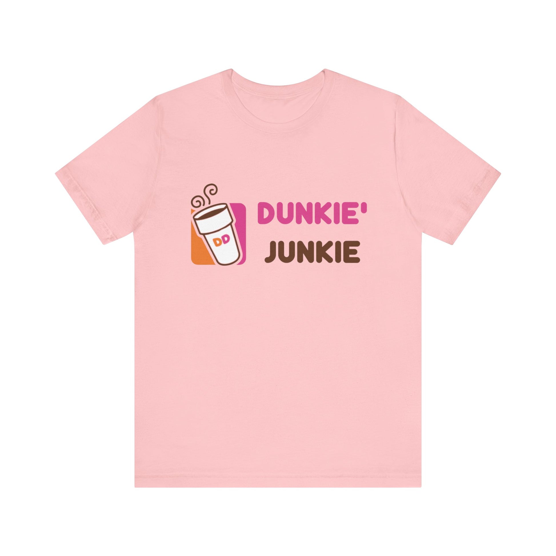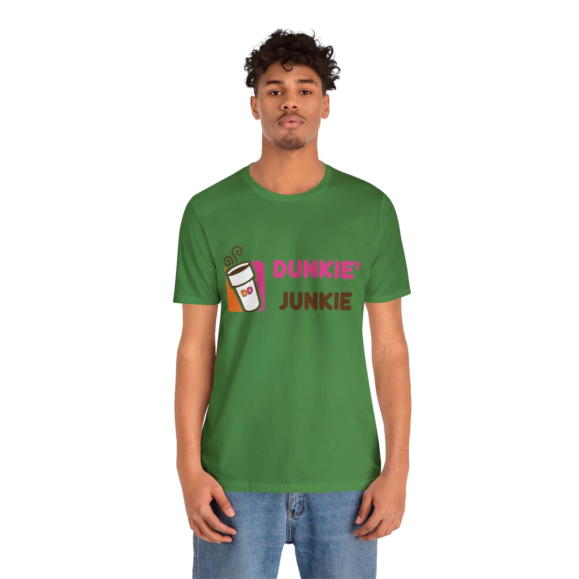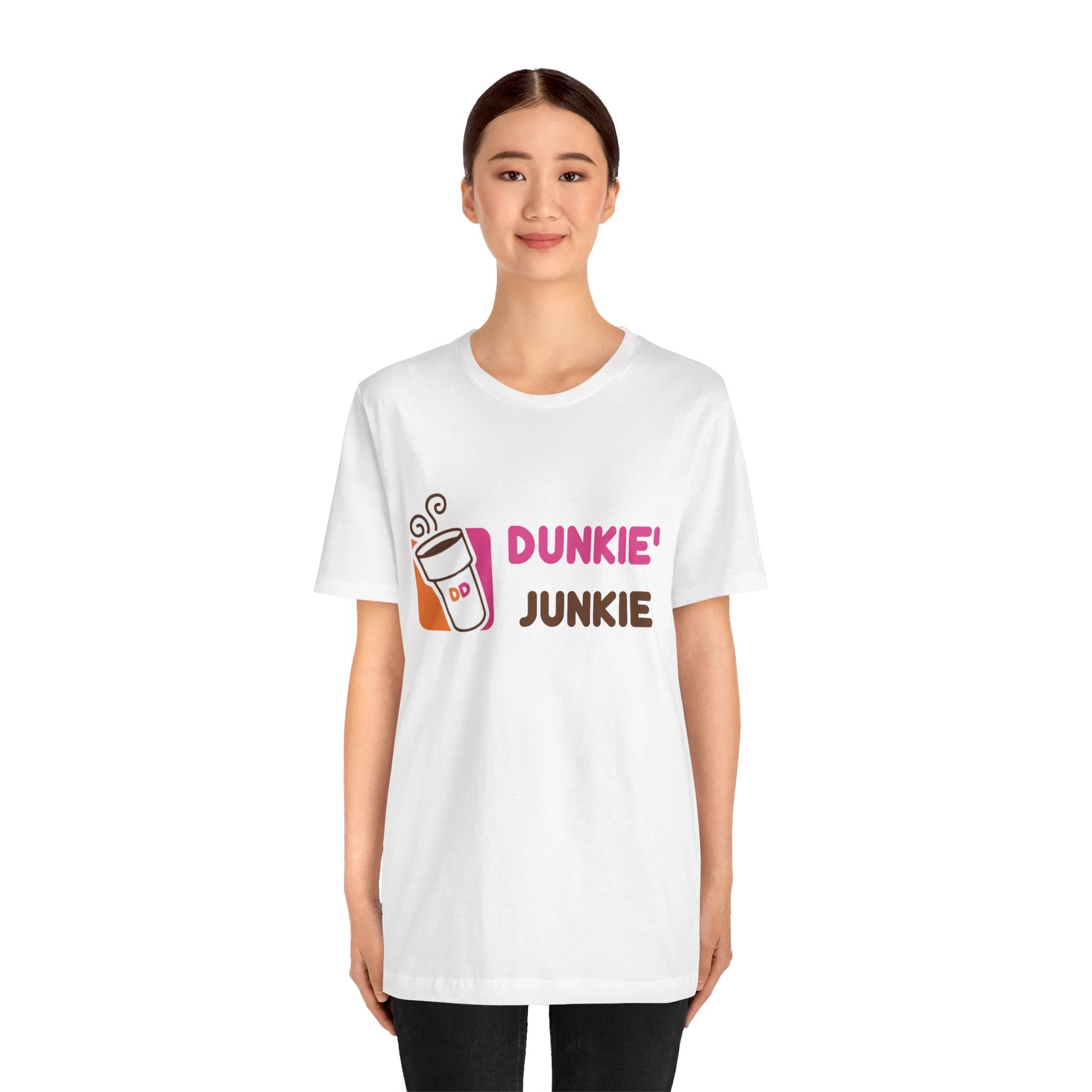 with the 'Dunkie' Junkie T-Shirt, a must-have for the donut-and-coffee duo aficionados. This tee isn't just a garment; it's a statement of delicious proportions. Made for those who believe in the power of a good dunk, it's the perfect conversation starter at your local coffee shop or a sweet addition to your casual wear. Embrace the light-hearted side of life, and wear your cravings on your sleeve – or in this case, on your chest. This classic unisex jersey short sleeve tee fits like a well-loved favorite. Soft cotton and quality print make users fall in love with it over and over again. These t-shirts have-ribbed knit collars to bolster shaping. The shoulders are tapered for a better fit over time. Dual side seams hold the garment's shape for longer.