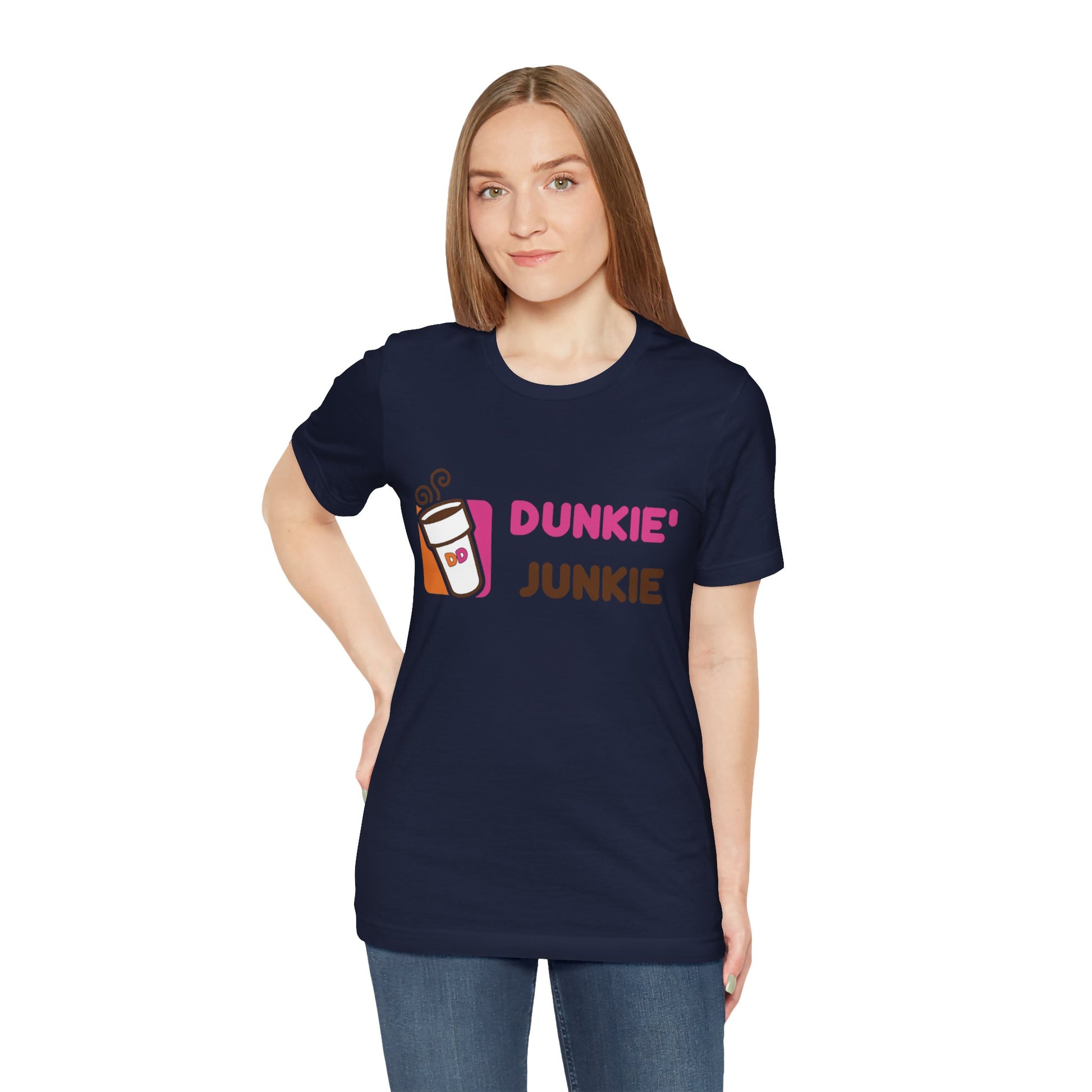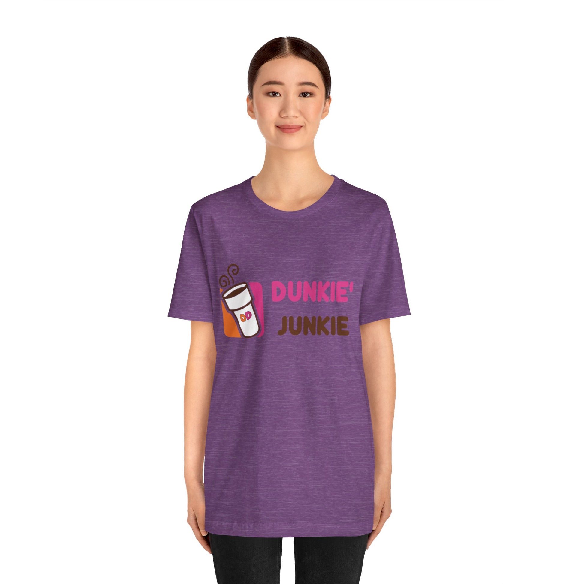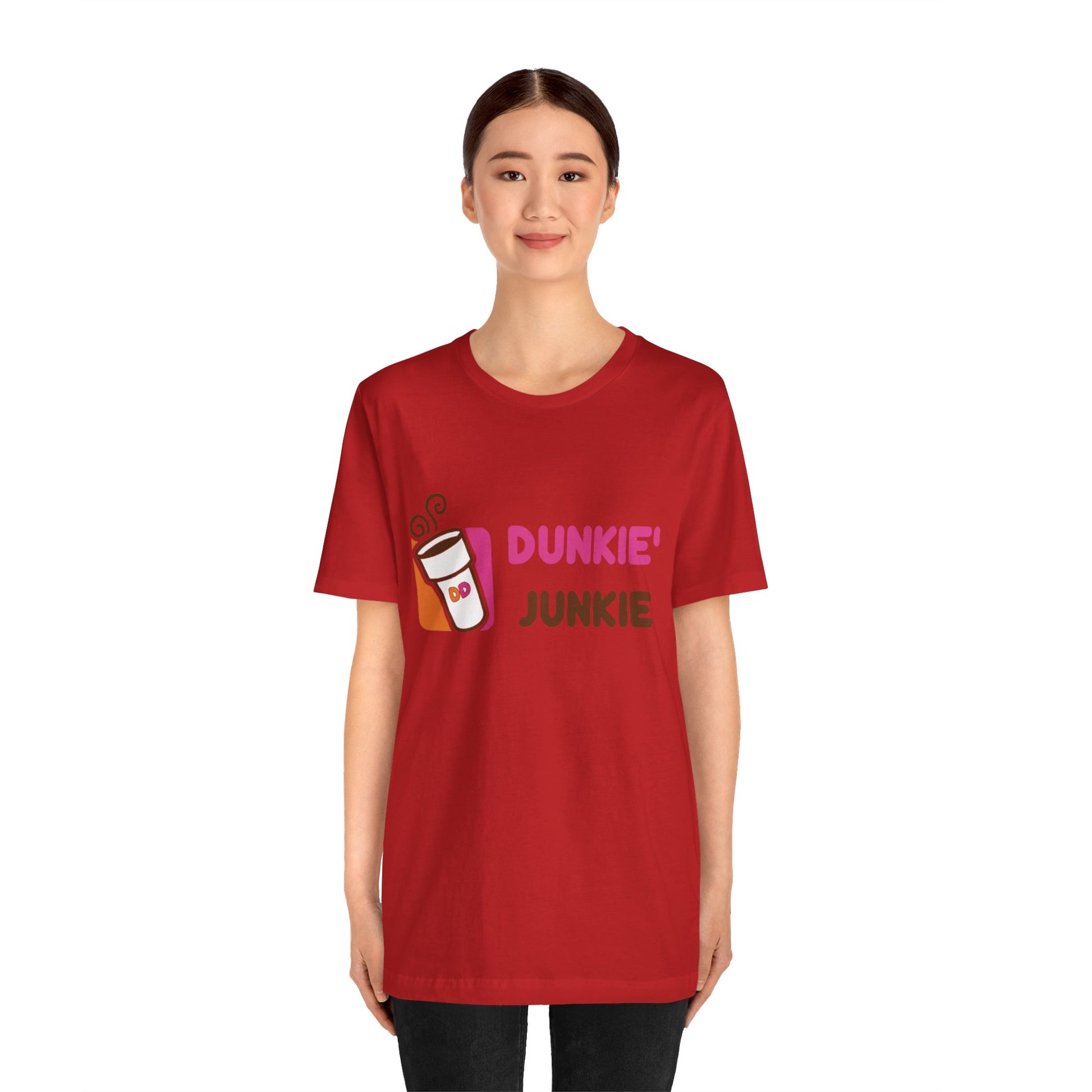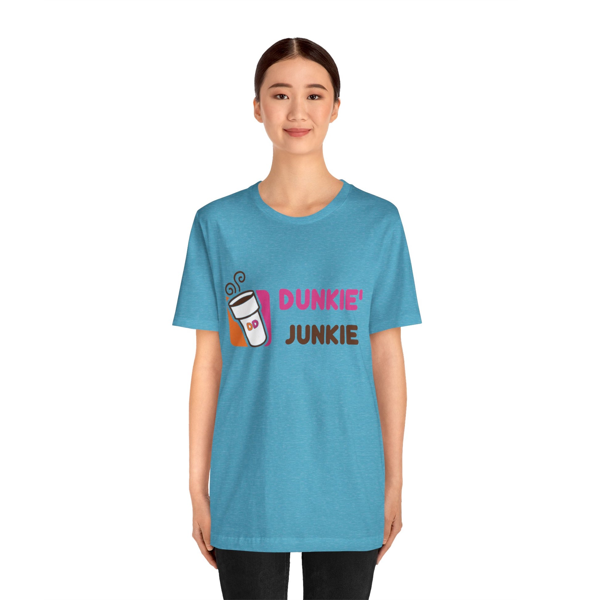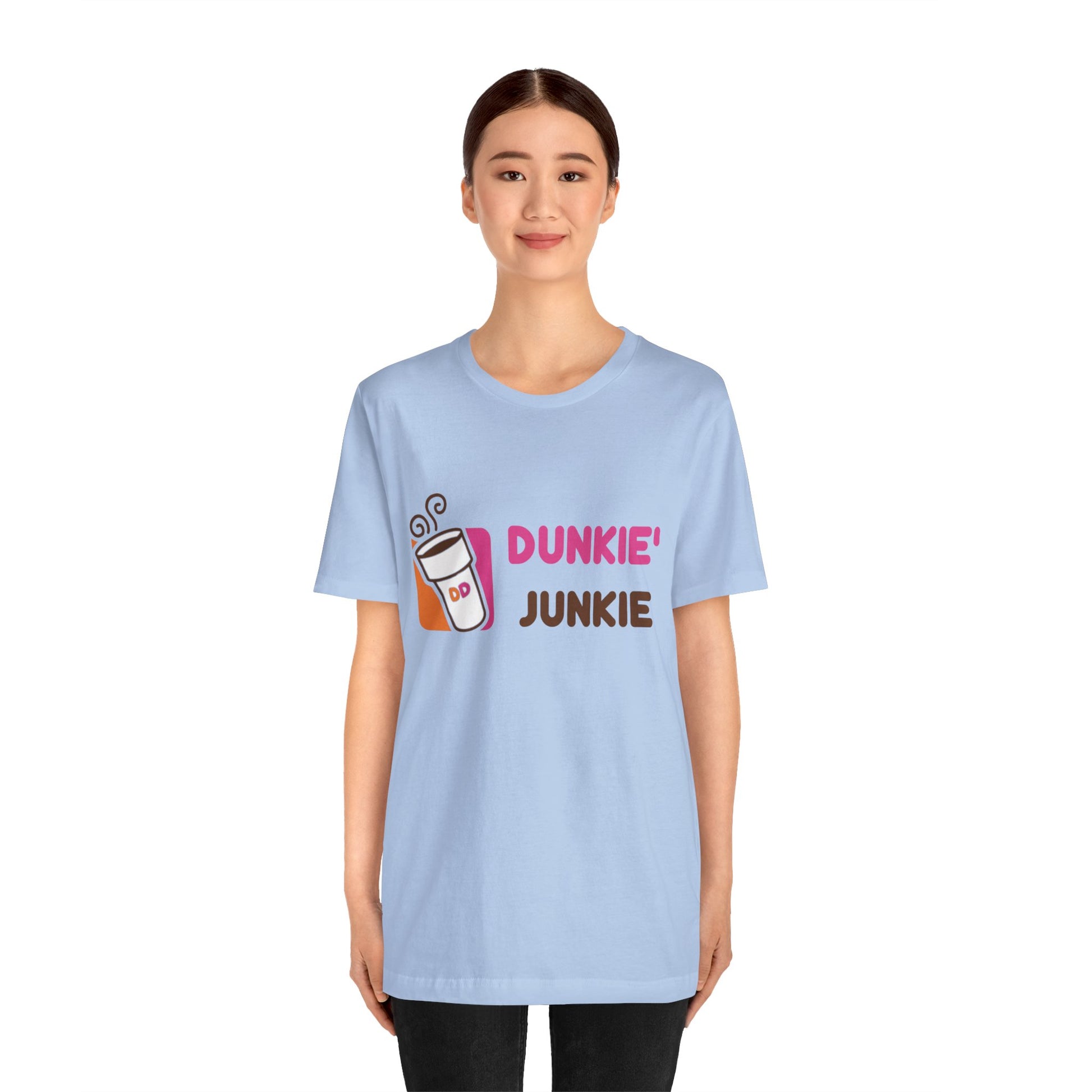 with the 'Dunkie' Junkie T-Shirt, a must-have for the donut-and-coffee duo aficionados. This tee isn't just a garment; it's a statement of delicious proportions. Made for those who believe in the power of a good dunk, it's the perfect conversation starter at your local coffee shop or a sweet addition to your casual wear. Embrace the light-hearted side of life, and wear your cravings on your sleeve – or in this case, on your chest. This classic unisex jersey short sleeve tee fits like a well-loved favorite. Soft cotton and quality print make users fall in love with it over and over again. These t-shirts have-ribbed knit collars to bolster shaping. The shoulders are tapered for a better fit over time. Dual side seams hold the garment's shape for longer.