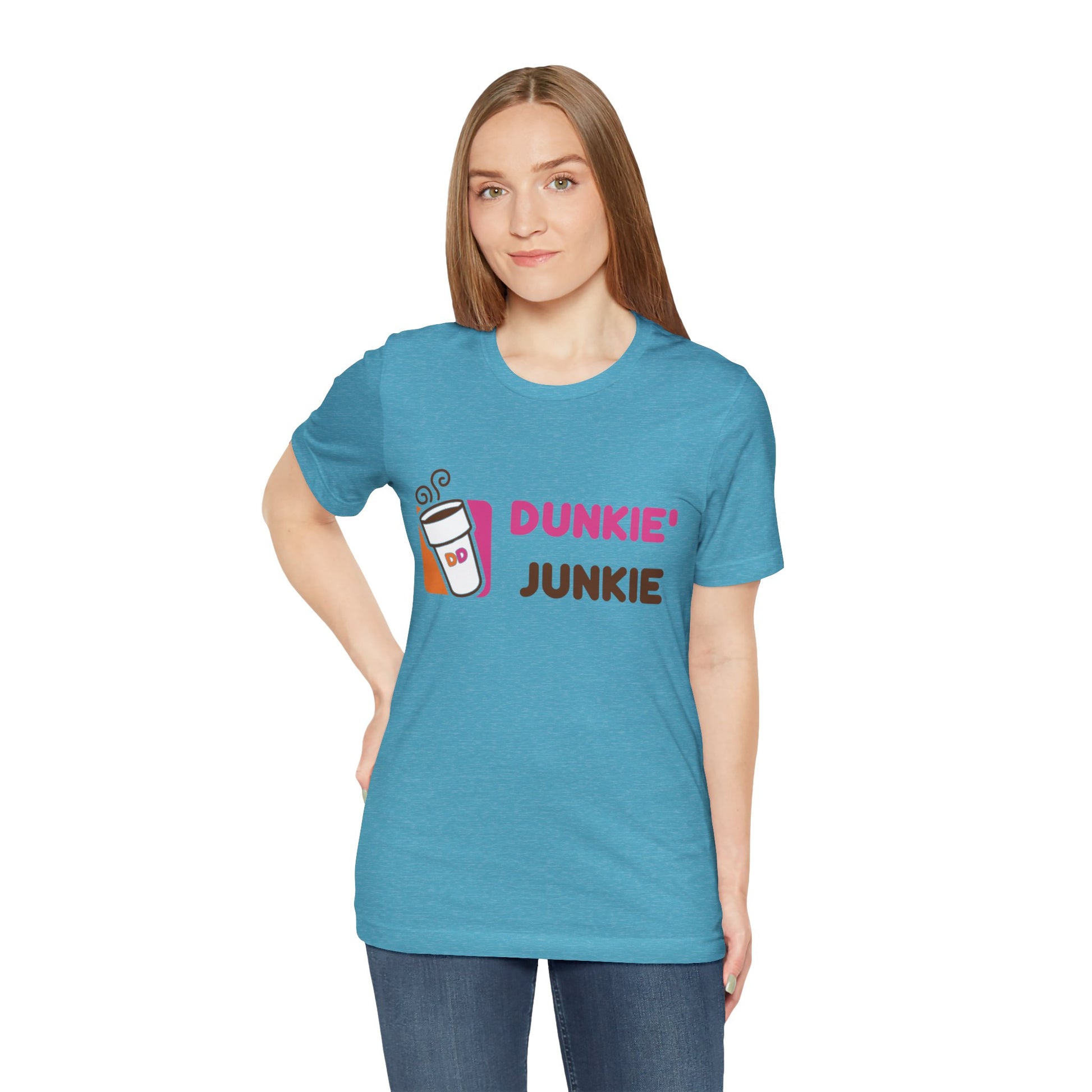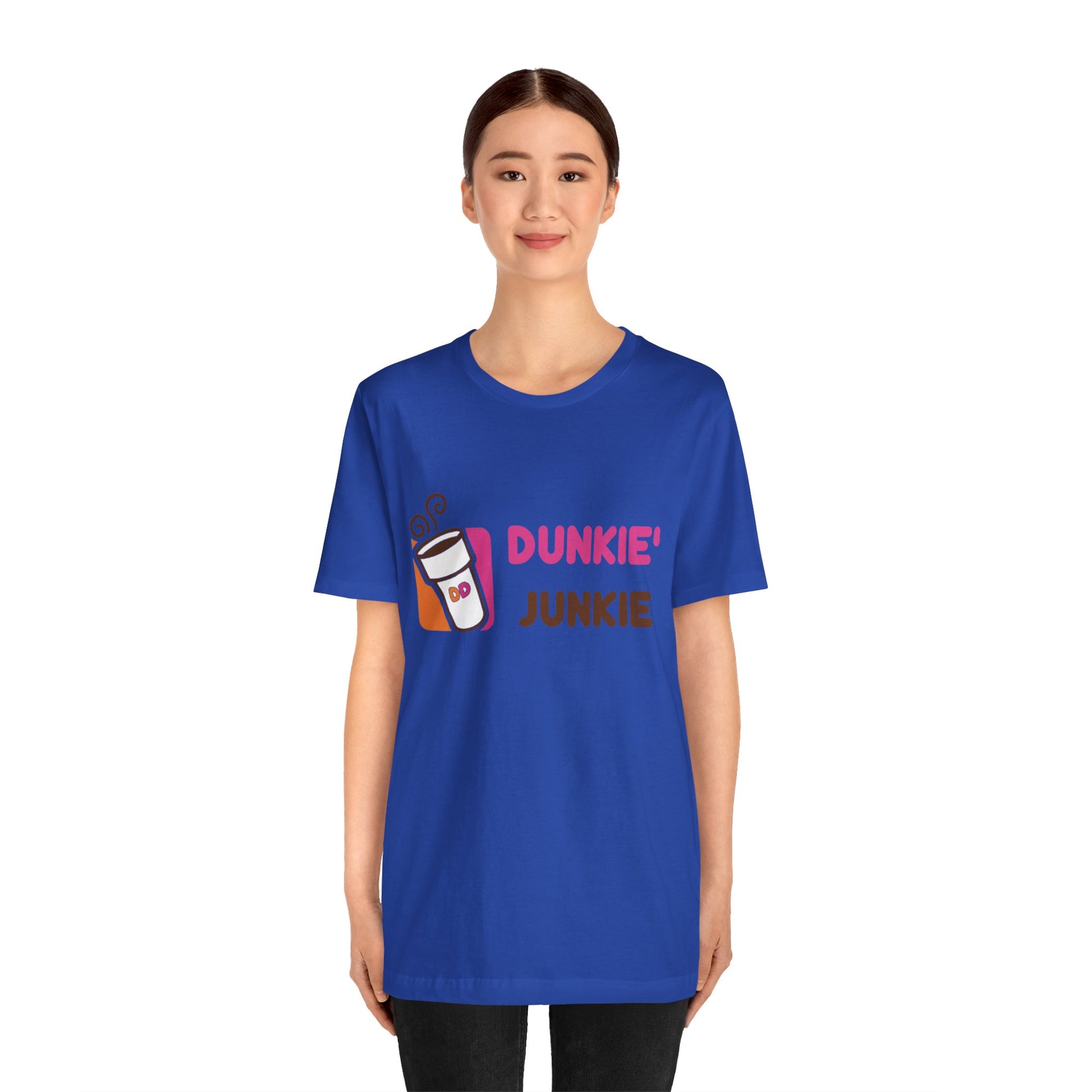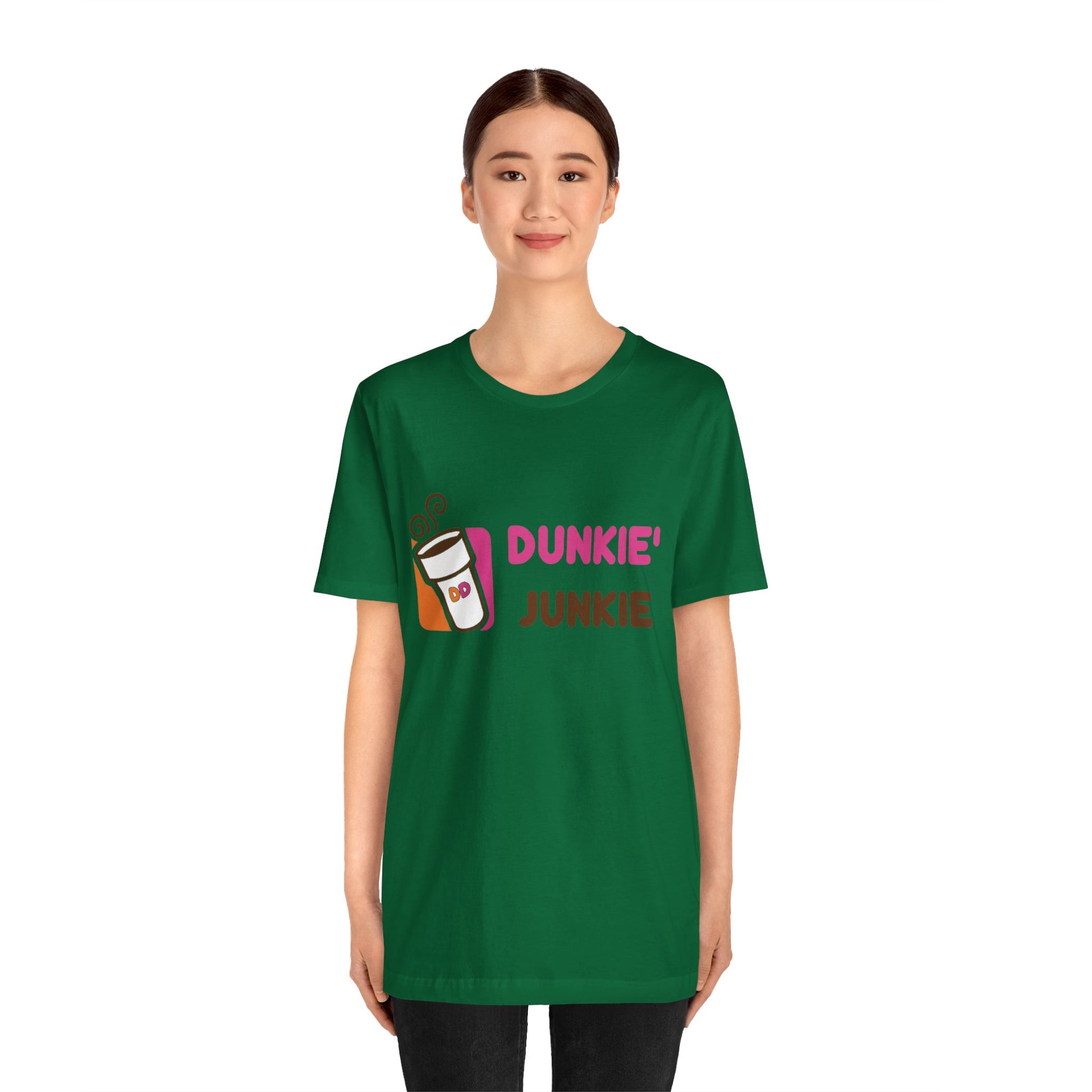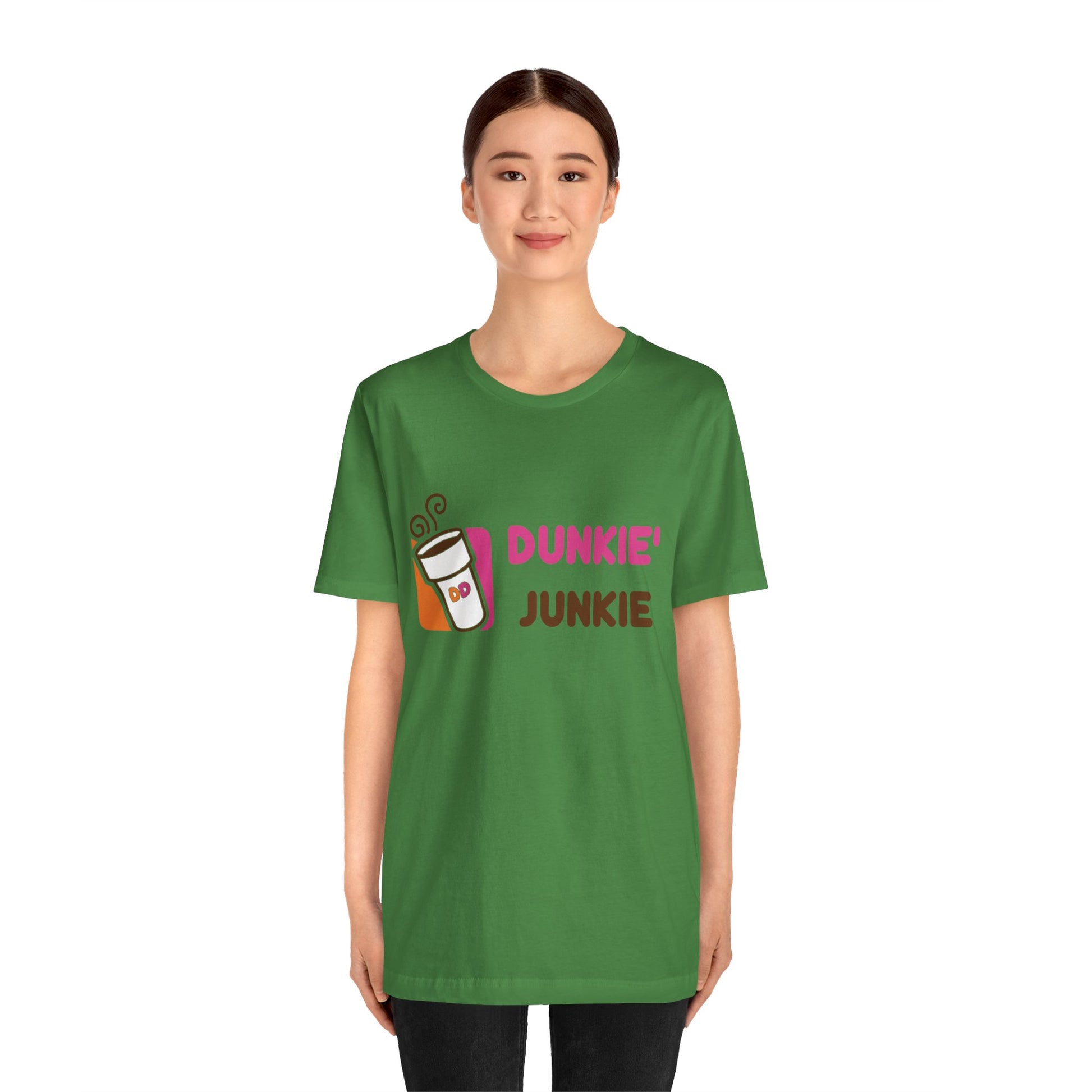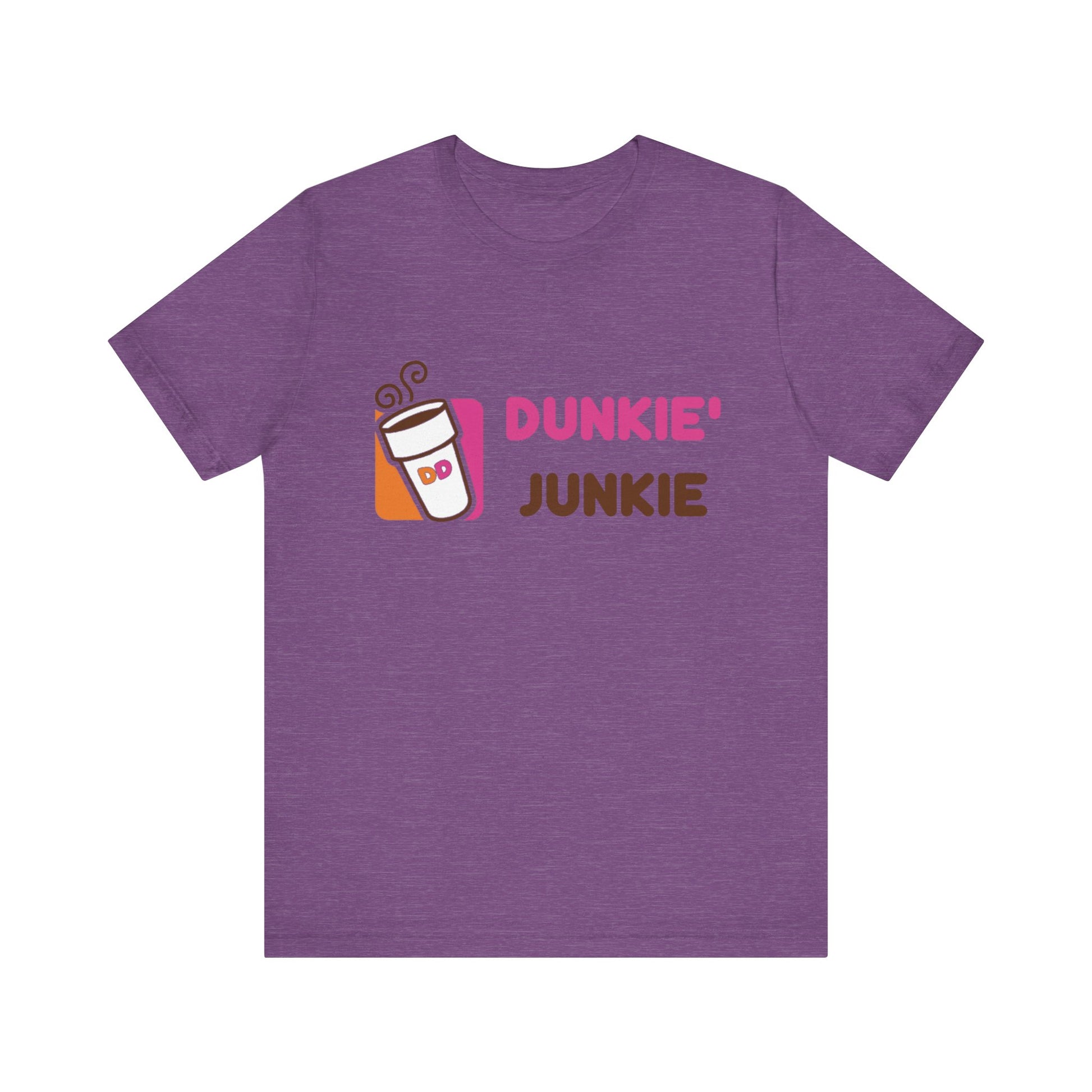 with the 'Dunkie' Junkie T-Shirt, a must-have for the donut-and-coffee duo aficionados. This tee isn't just a garment; it's a statement of delicious proportions. Made for those who believe in the power of a good dunk, it's the perfect conversation starter at your local coffee shop or a sweet addition to your casual wear. Embrace the light-hearted side of life, and wear your cravings on your sleeve – or in this case, on your chest. This classic unisex jersey short sleeve tee fits like a well-loved favorite. Soft cotton and quality print make users fall in love with it over and over again. These t-shirts have-ribbed knit collars to bolster shaping. The shoulders are tapered for a better fit over time. Dual side seams hold the garment's shape for longer.