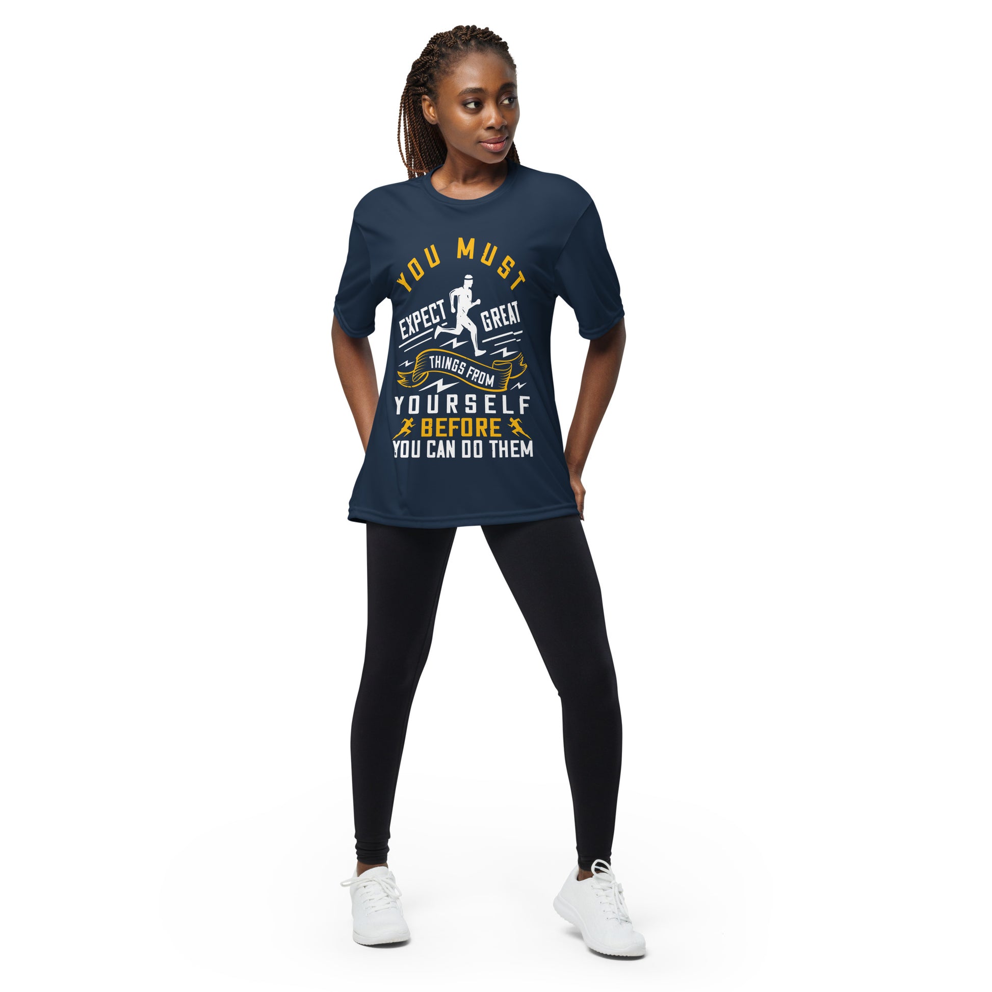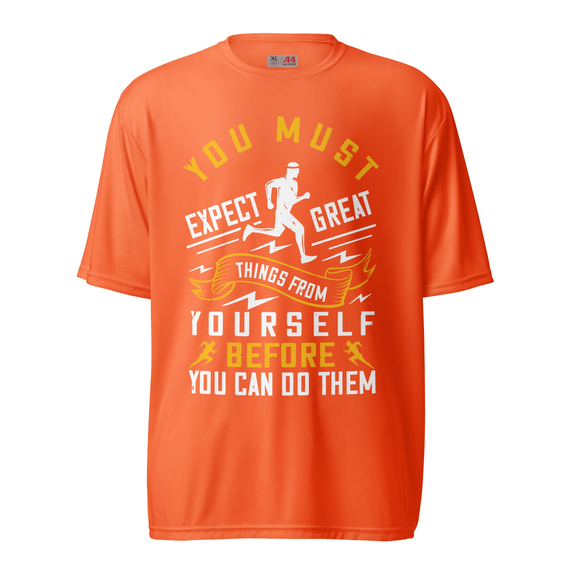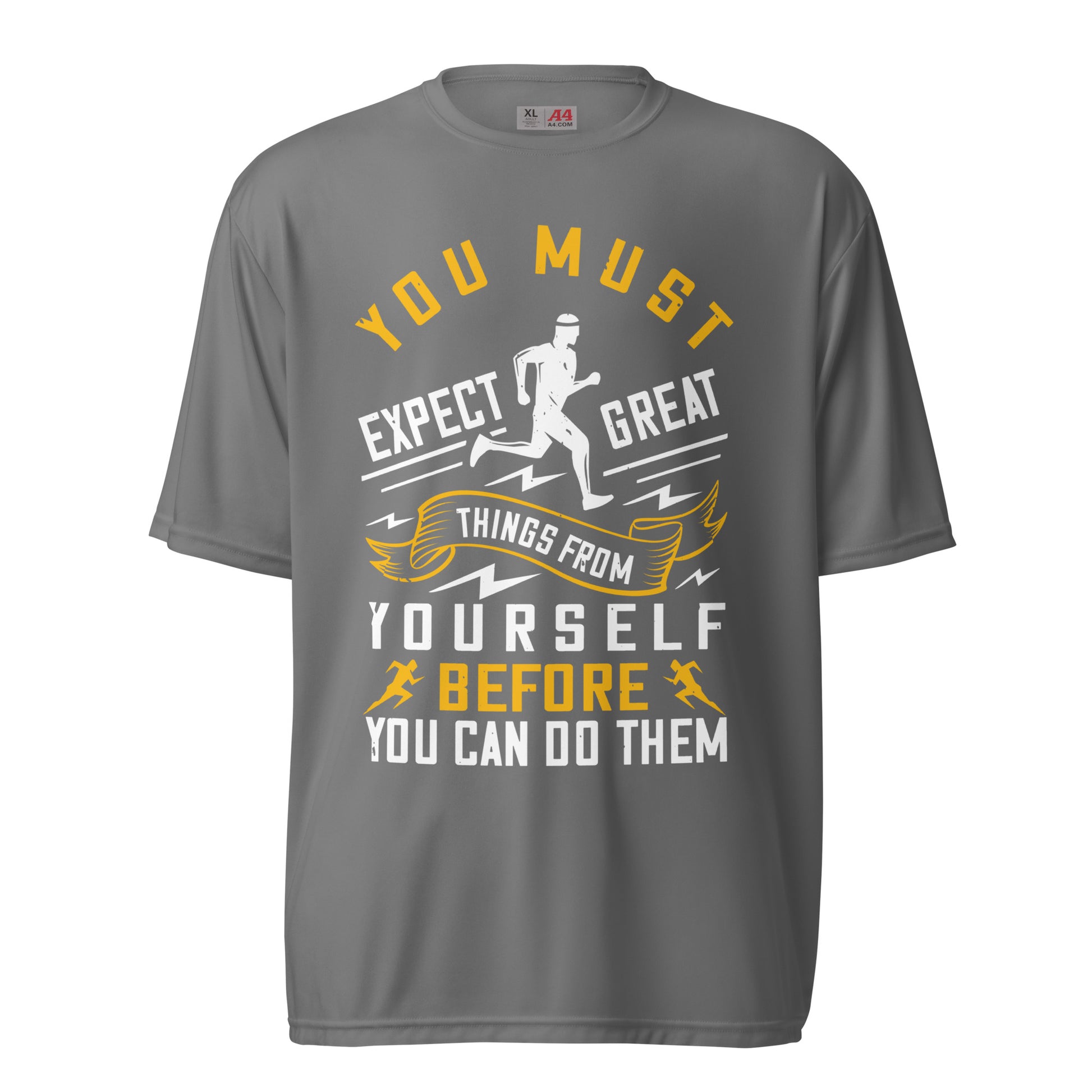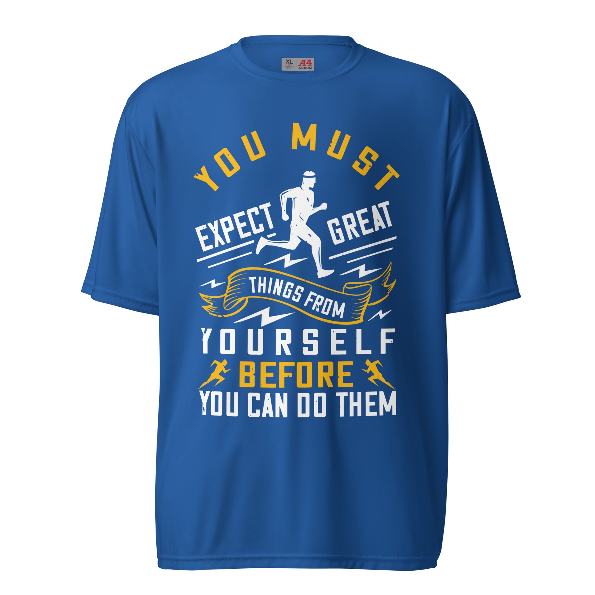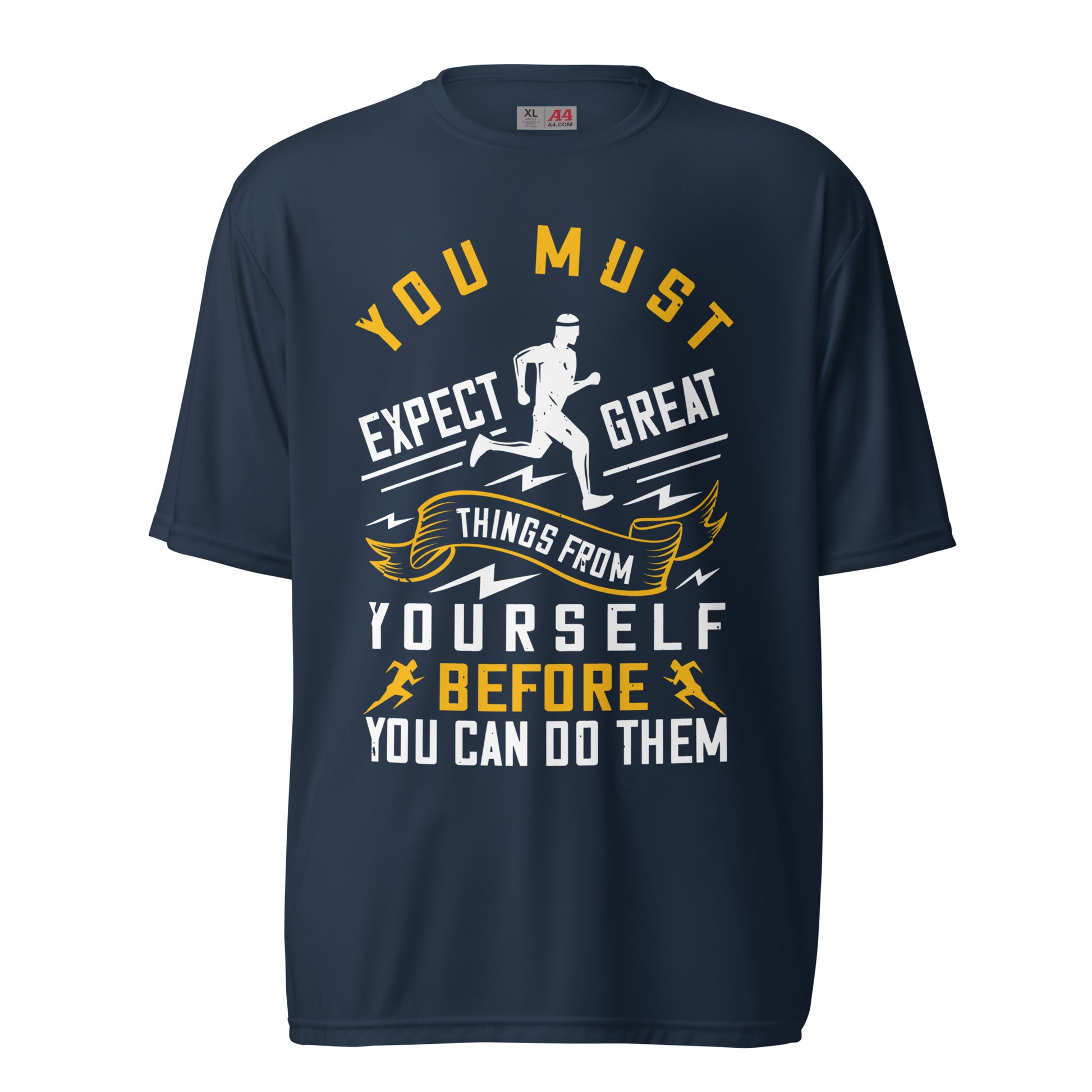 Our "Expect Excellence Performance Shirt" is your secret weapon in the battle against mediocrity. Tailored for the relentless, this shirt is a wearable coach, whispering that victory lap is yours for the taking. Perfect for those who run marathons like they’re errands, this is the only tee that won’t judge you for sprinting past snails and racing your own shadow. Stay cool, dry, and confident even during the most intense activities in this unisex performance crew neck t-shirt. Made from premium, moisture-wicking fabric with odor resistance, stain release, and UV protection, this shirt’s perfect for going to the gym, playing sports, hiking, or any other activity.