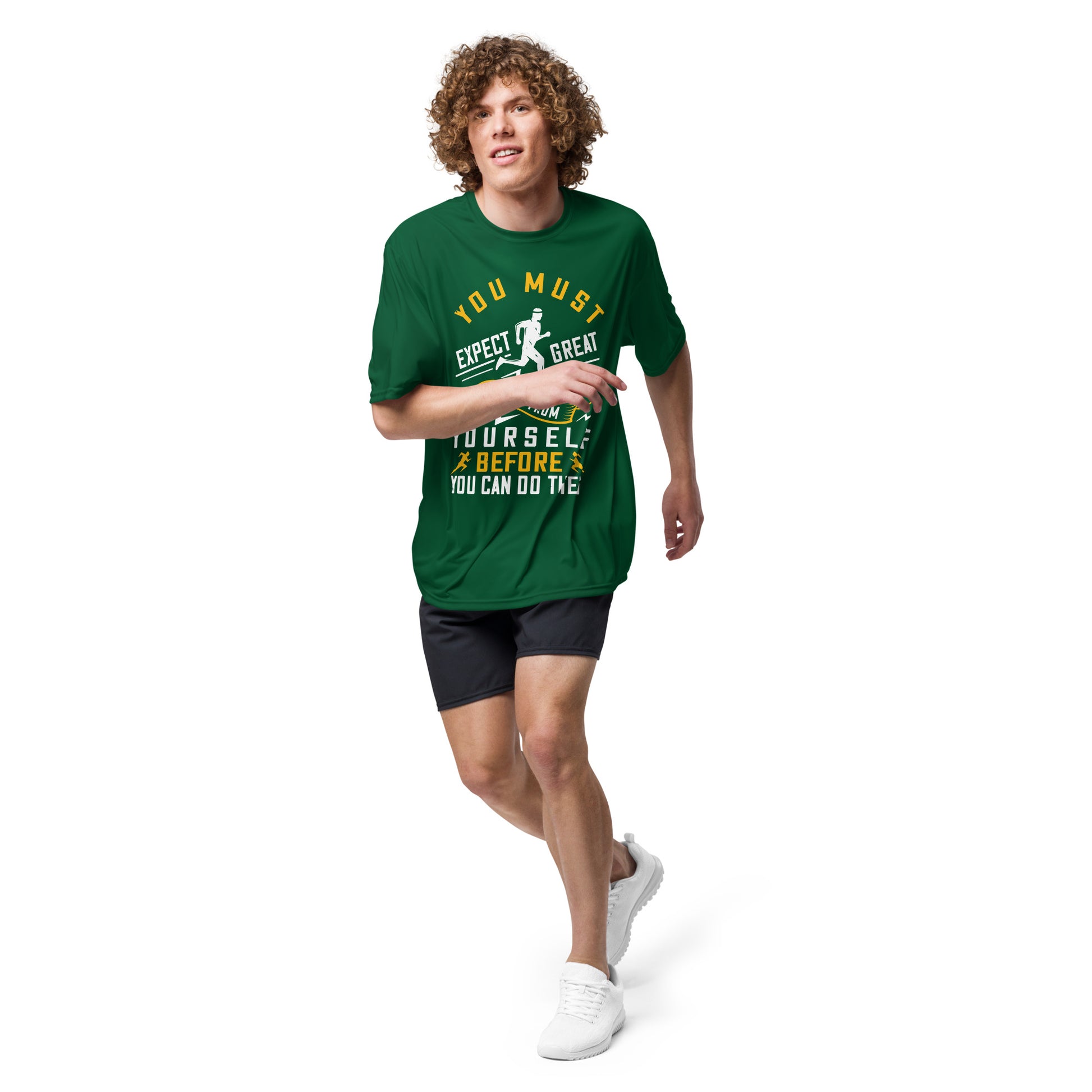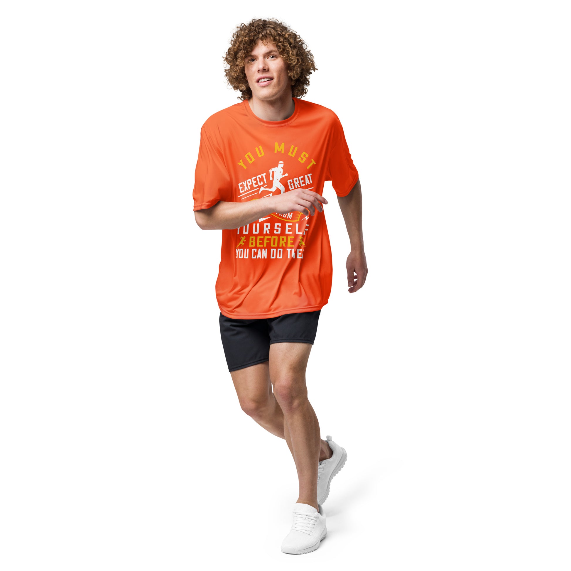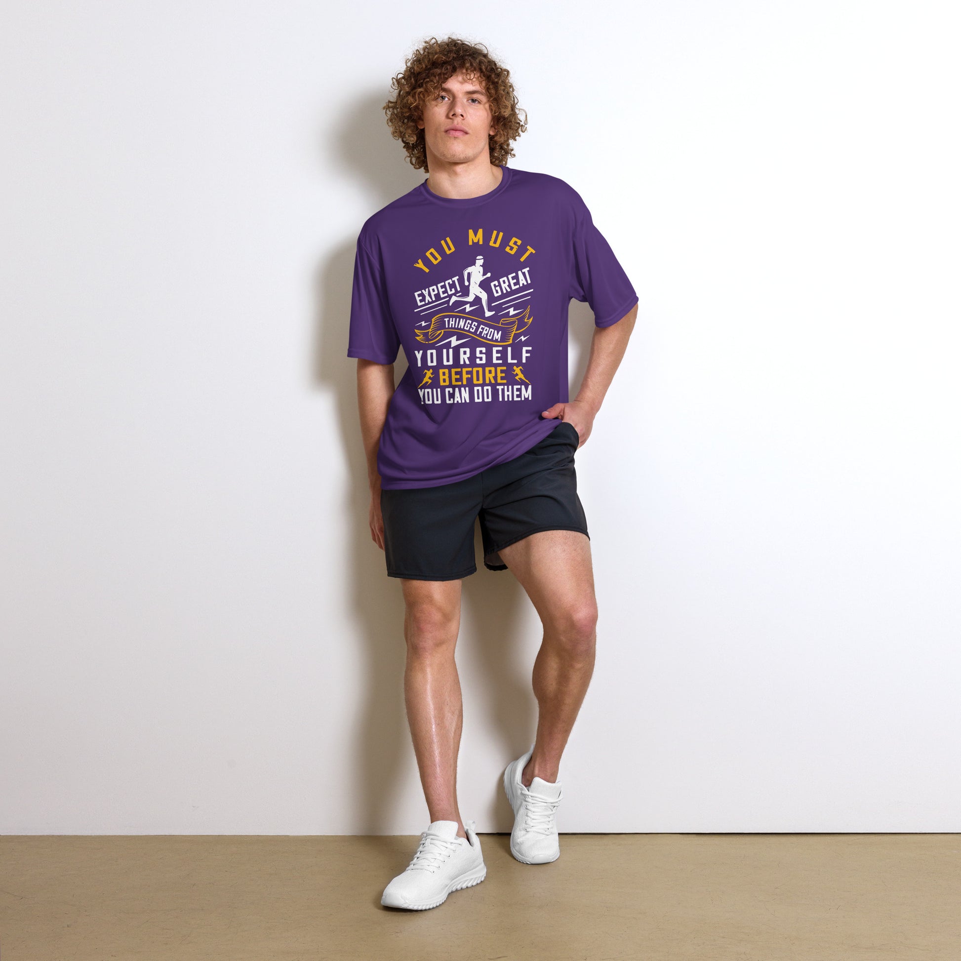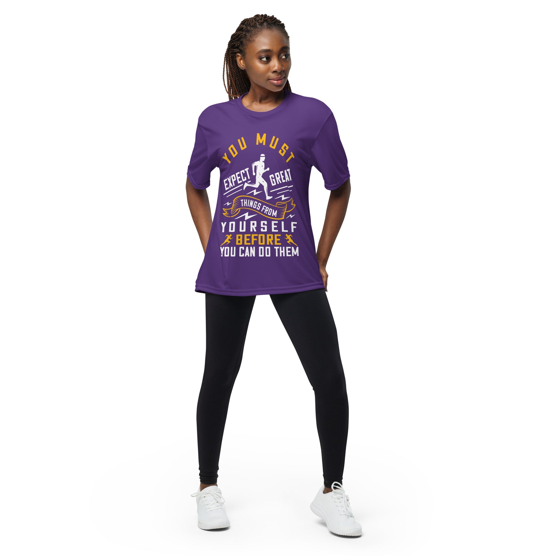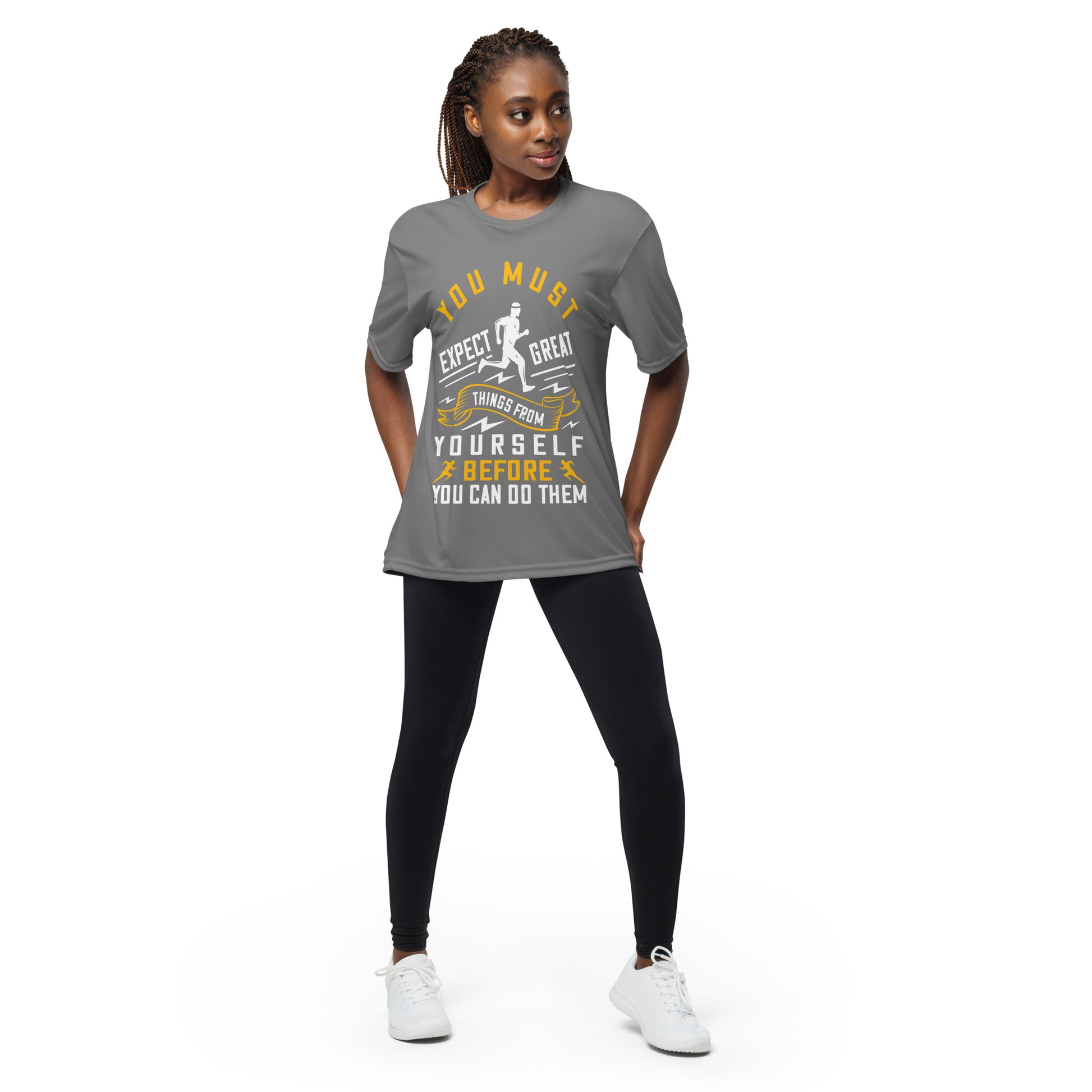 Our "Expect Excellence Performance Shirt" is your secret weapon in the battle against mediocrity. Tailored for the relentless, this shirt is a wearable coach, whispering that victory lap is yours for the taking. Perfect for those who run marathons like they’re errands, this is the only tee that won’t judge you for sprinting past snails and racing your own shadow. Stay cool, dry, and confident even during the most intense activities in this unisex performance crew neck t-shirt. Made from premium, moisture-wicking fabric with odor resistance, stain release, and UV protection, this shirt’s perfect for going to the gym, playing sports, hiking, or any other activity.