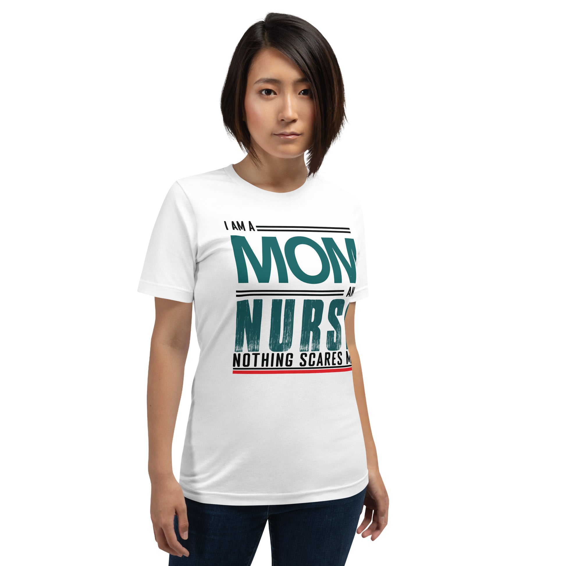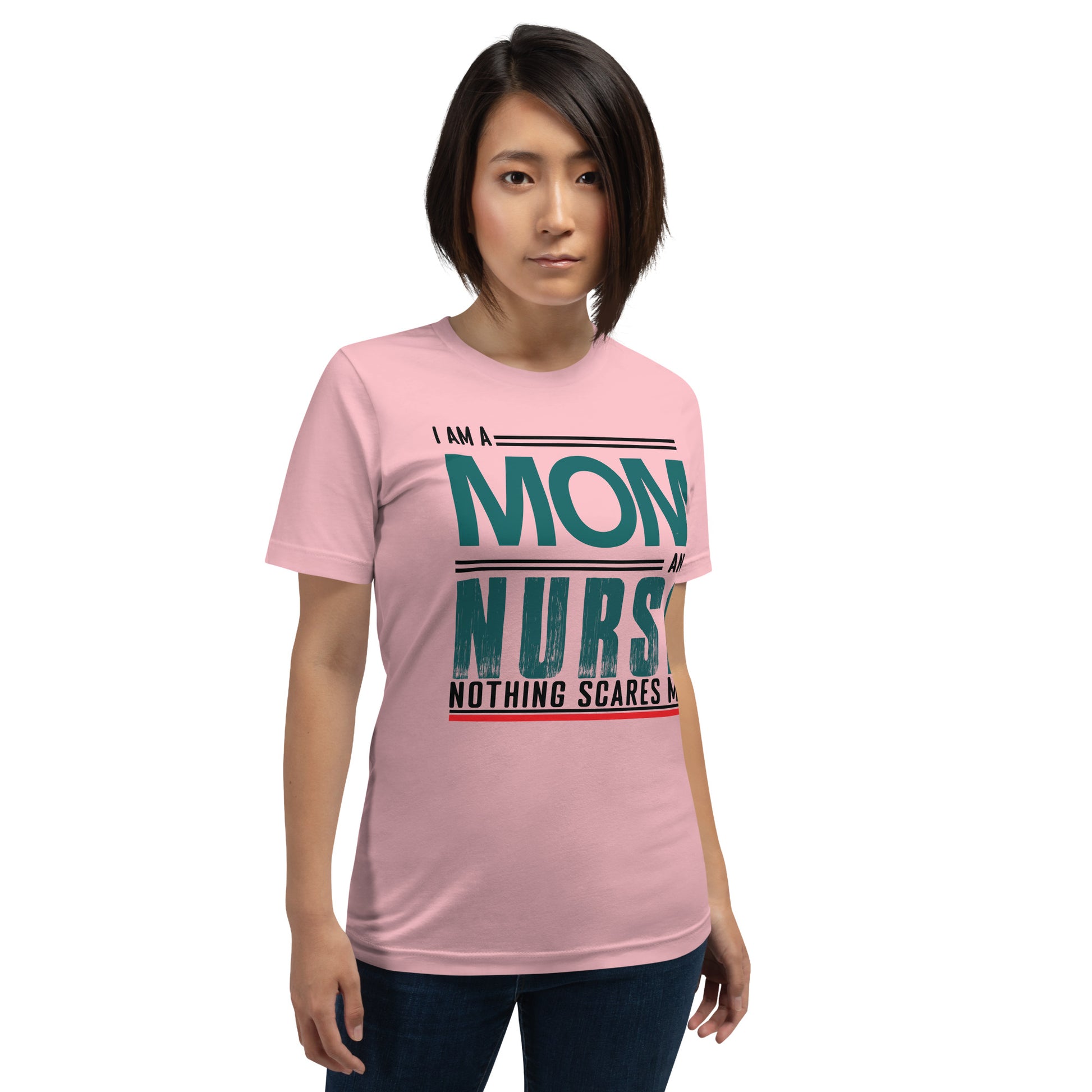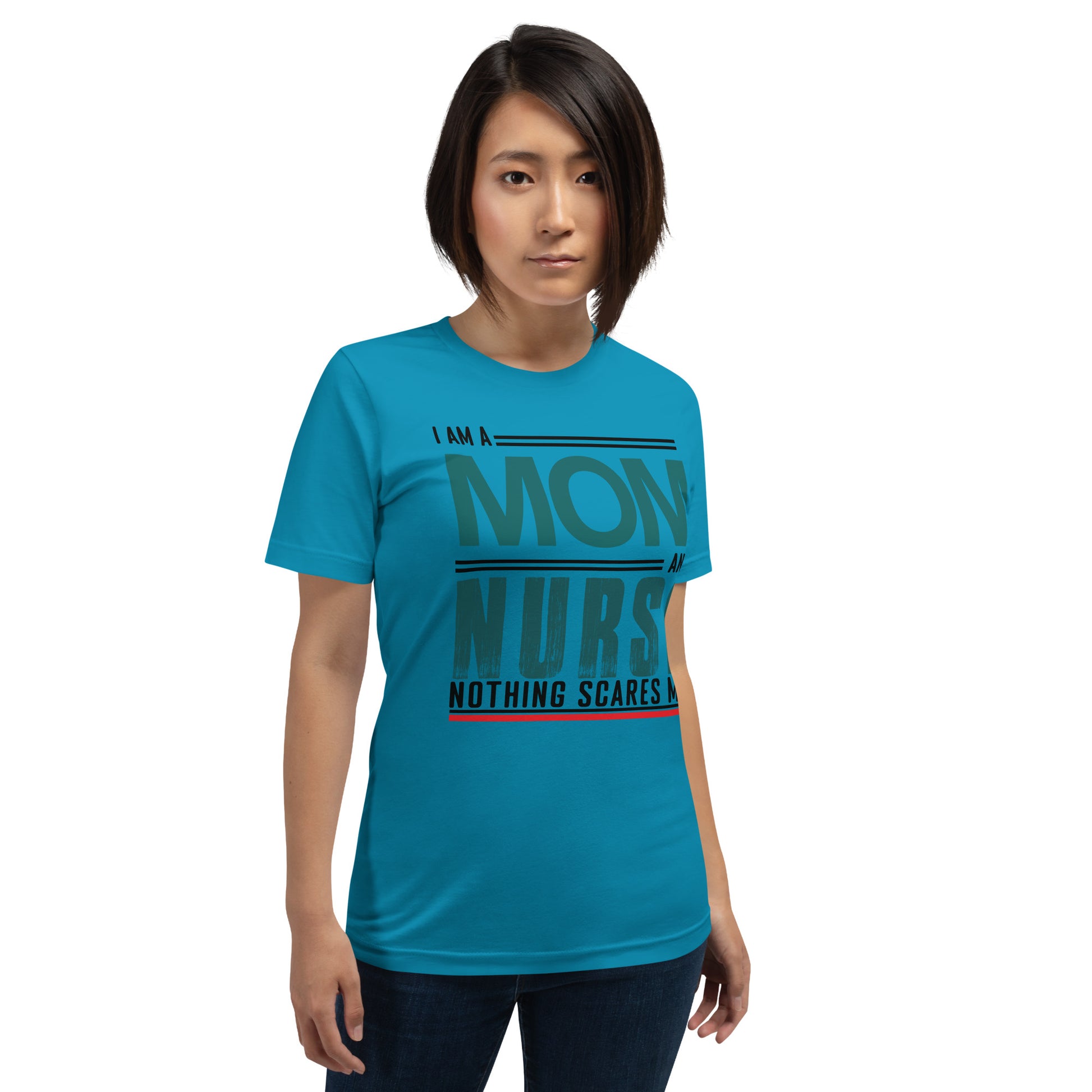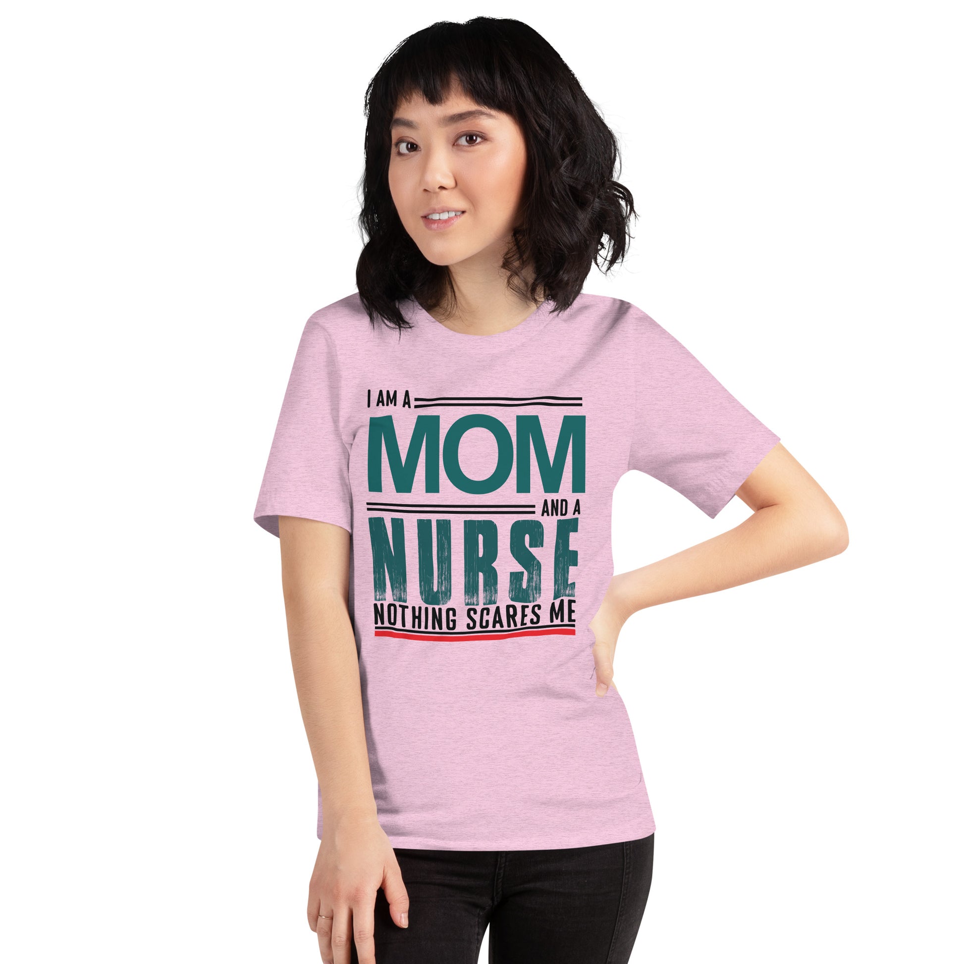 The "Fearless Mom-Nurse Tee" is for the superhero in scrubs, the champion of care, the mother who manages mayhem both at home and in the hospital. This shirt celebrates the double-duty courage that comes with being a mom and a nurse, where every day is an adventure and nothing, absolutely nothing, is too daunting. Wear it with pride, wear it with strength, for you are the epitome of bravery in every heartbeat. This t-shirt is everything you've dreamed of and more. It feels soft and lightweight, with the right amount of stretch. It's comfortable and flattering for all.