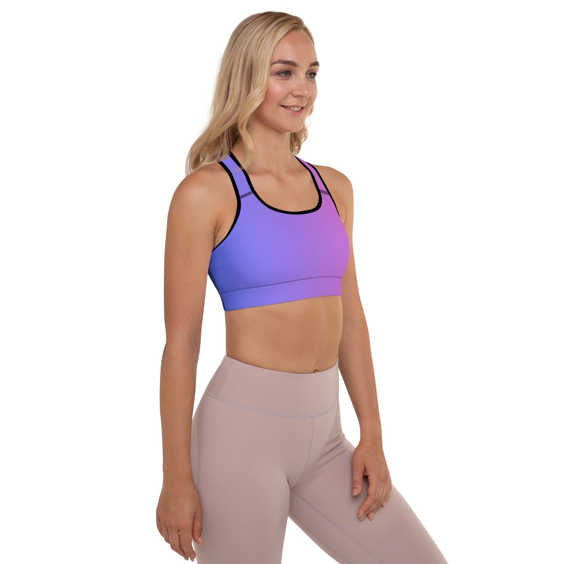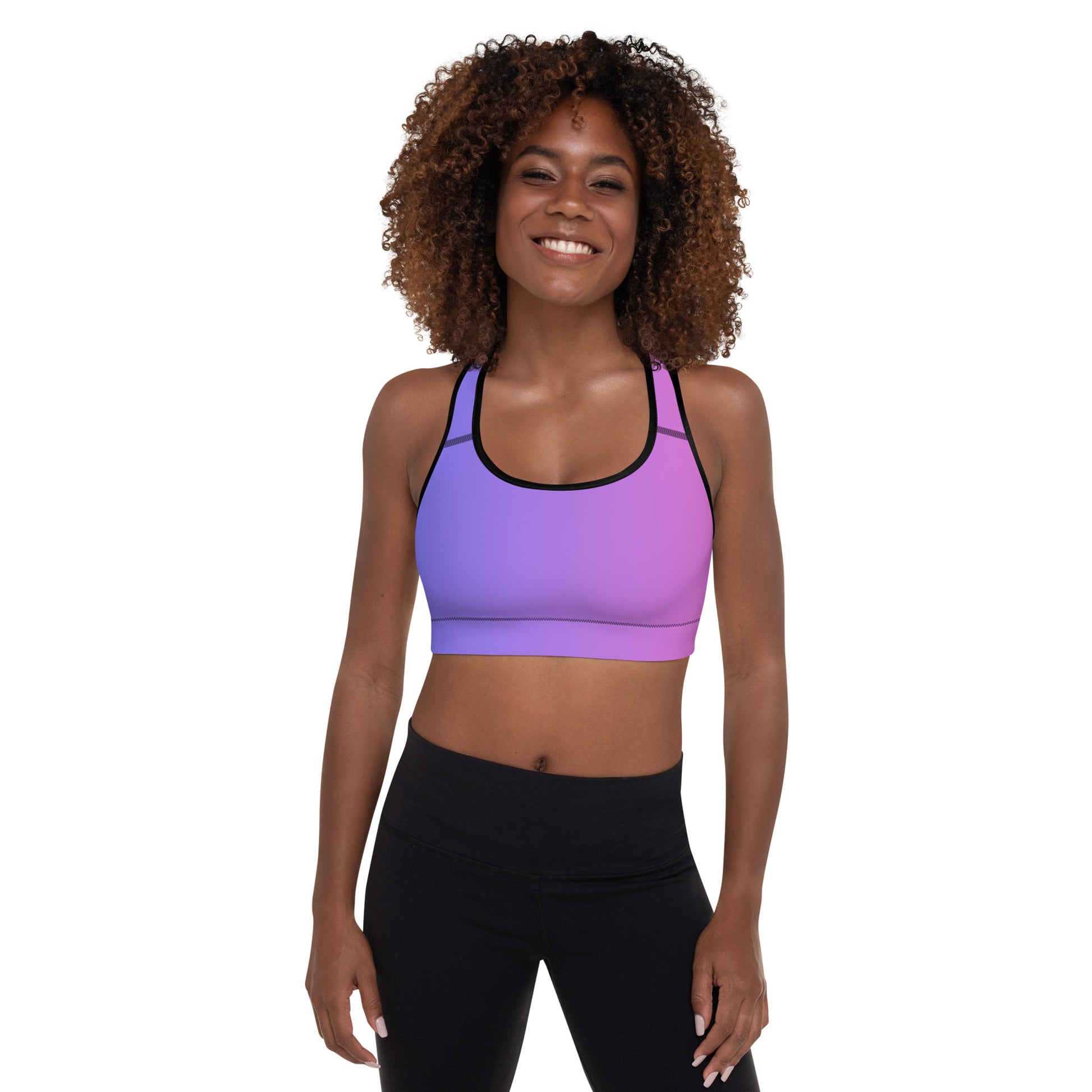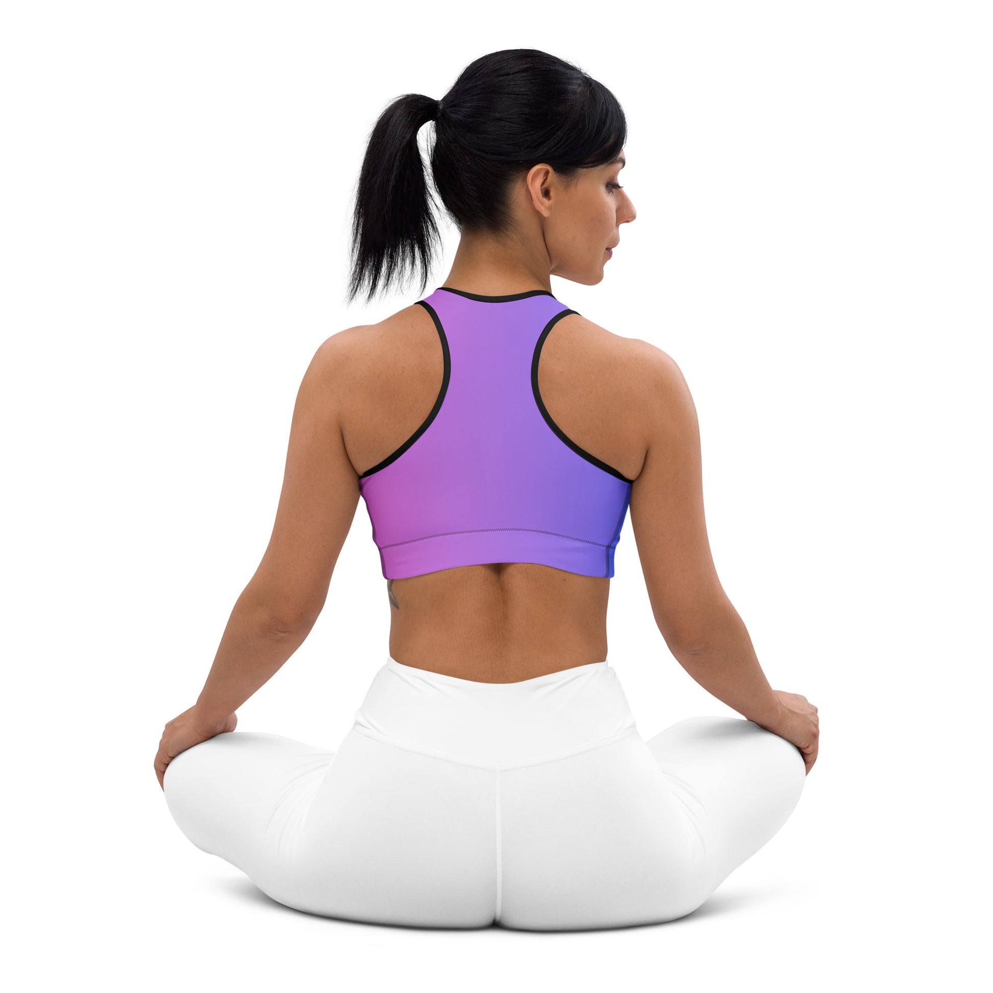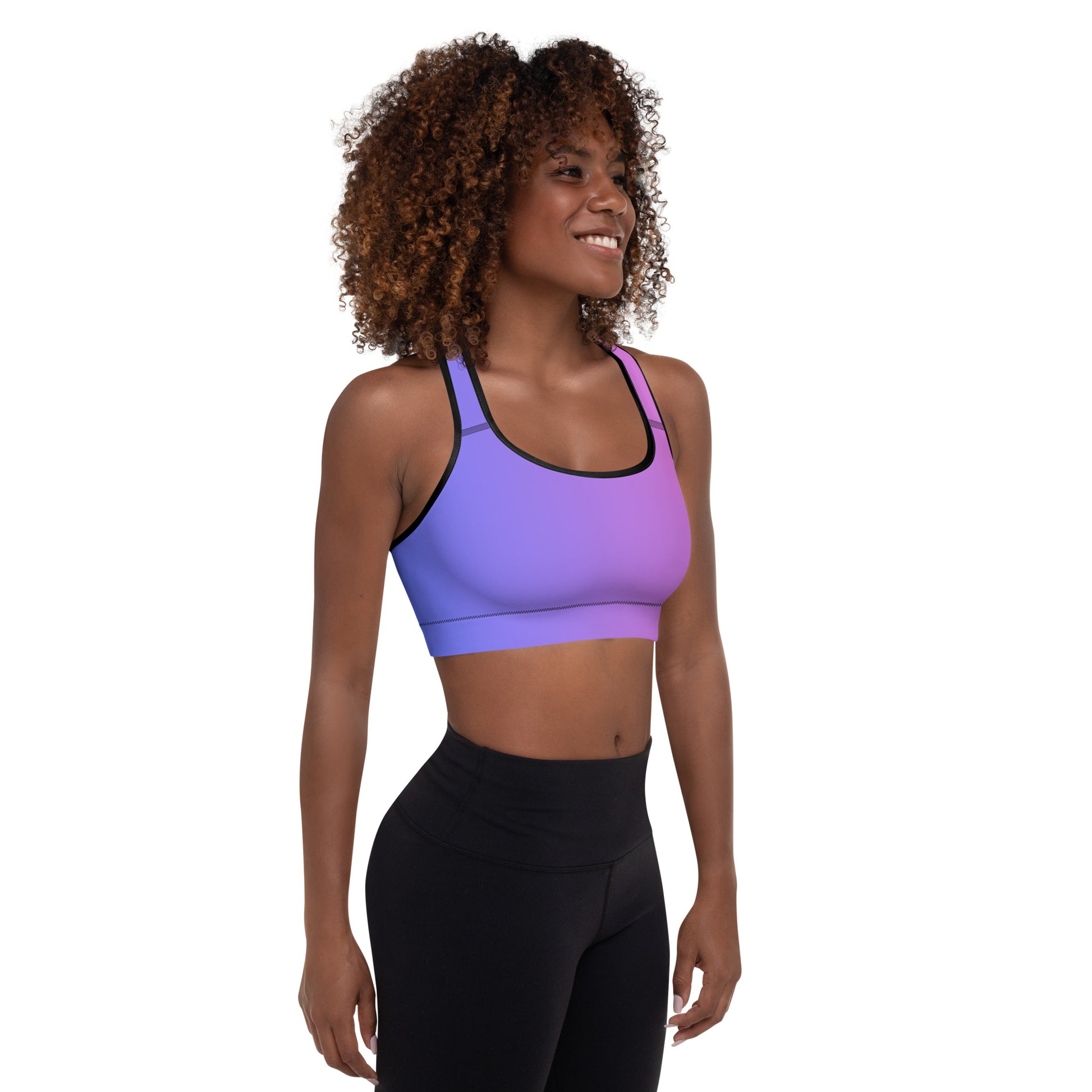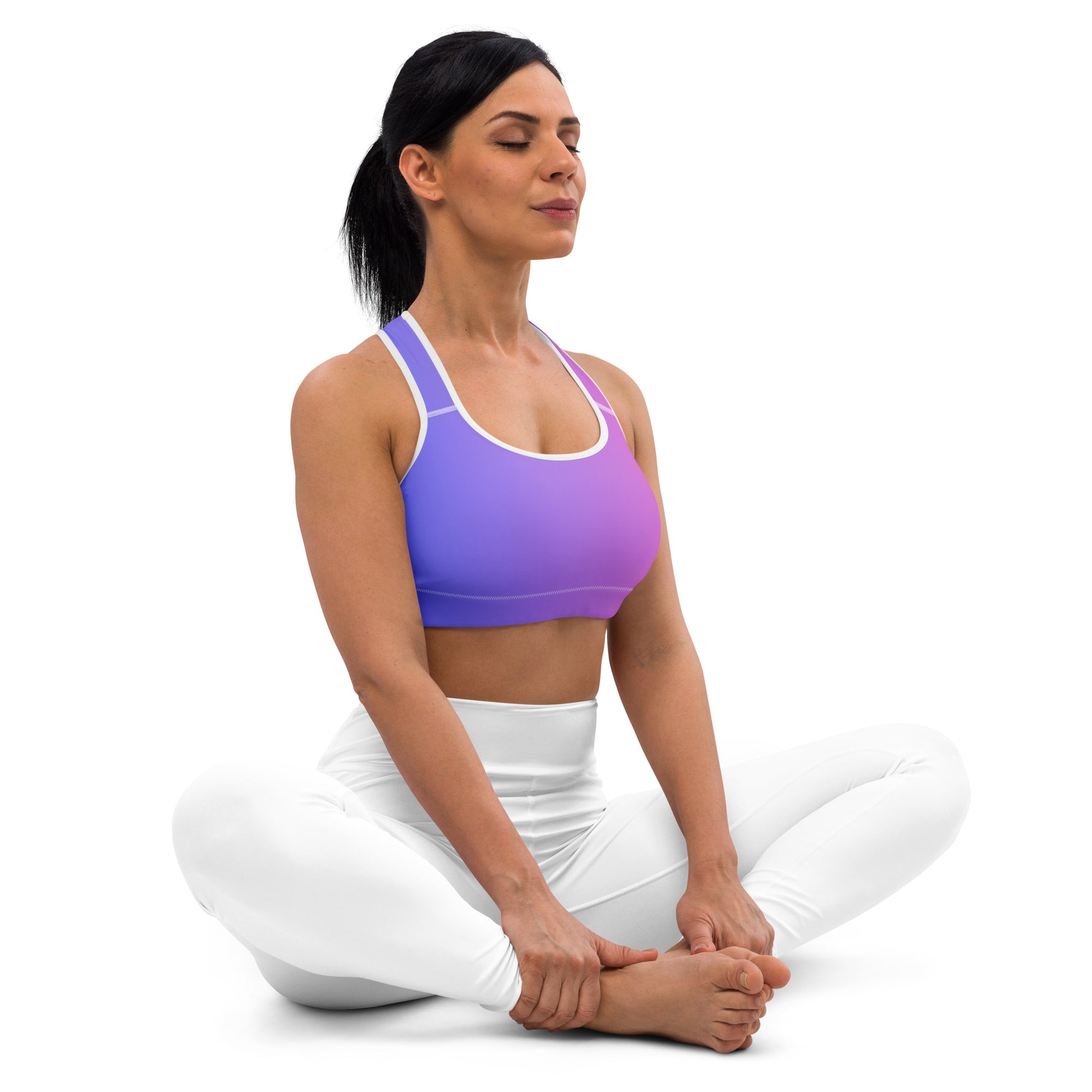 Meet the 'Gradient Glam Bra', your new partner in creating bold, beautiful workouts. Imagine the sky at dusk, with shades of purple melting into the night – that's the inspiration behind your next essential gym wear. Tailored for both strength and stretch, this sports bra is for those who paint their power with every rep. From sun salutations to sunset runs, the Gradient Glam Bra has you covered, blending comfort and confidence into a masterpiece of activewear. Who says you can't sparkle while you squat? It's time to radiate resilience and shine with every stride. Get the perfect bra for your workouts! This comfy bra has a soft moisture-wicking fabric, extra materials in shoulder straps, and removable padding for maximum support.