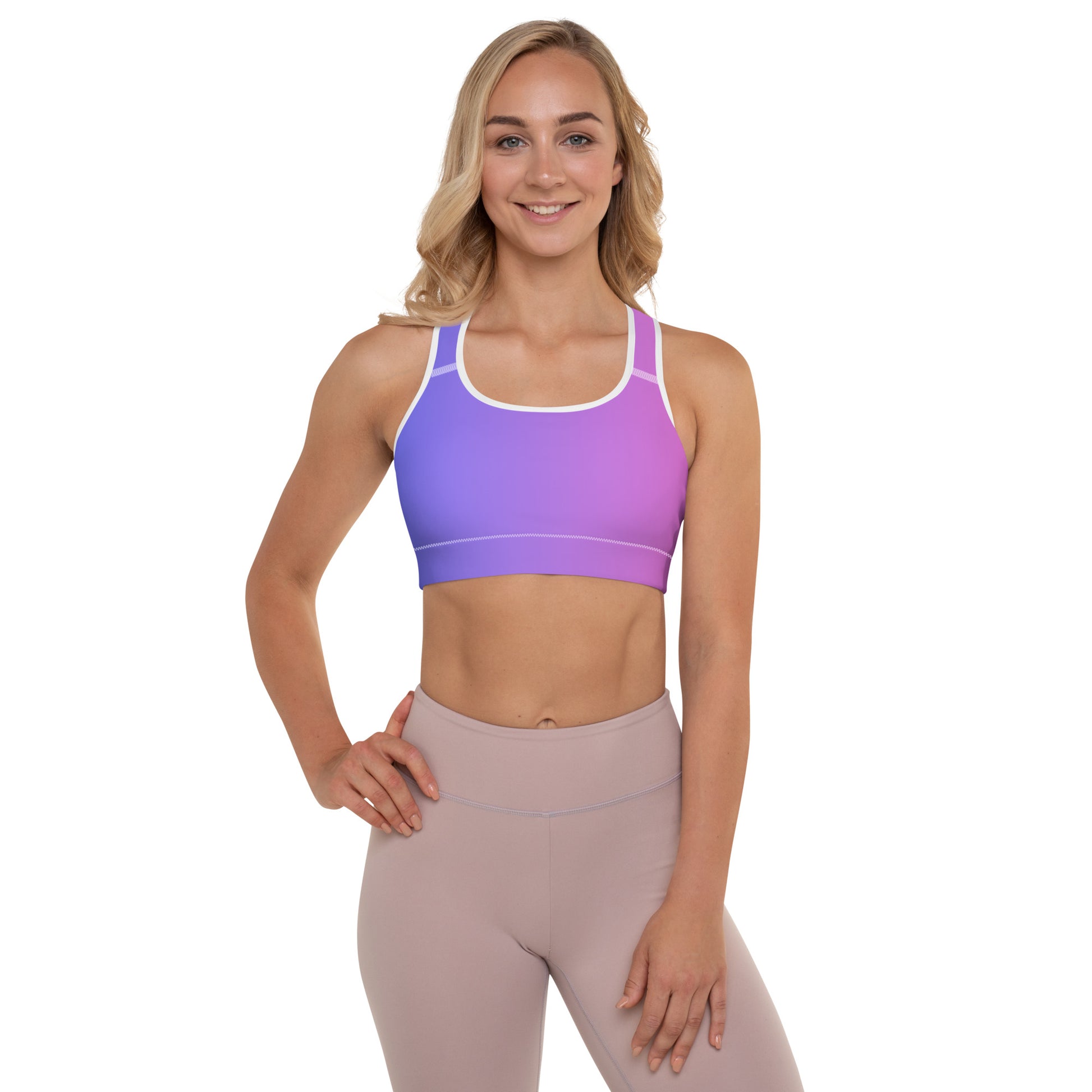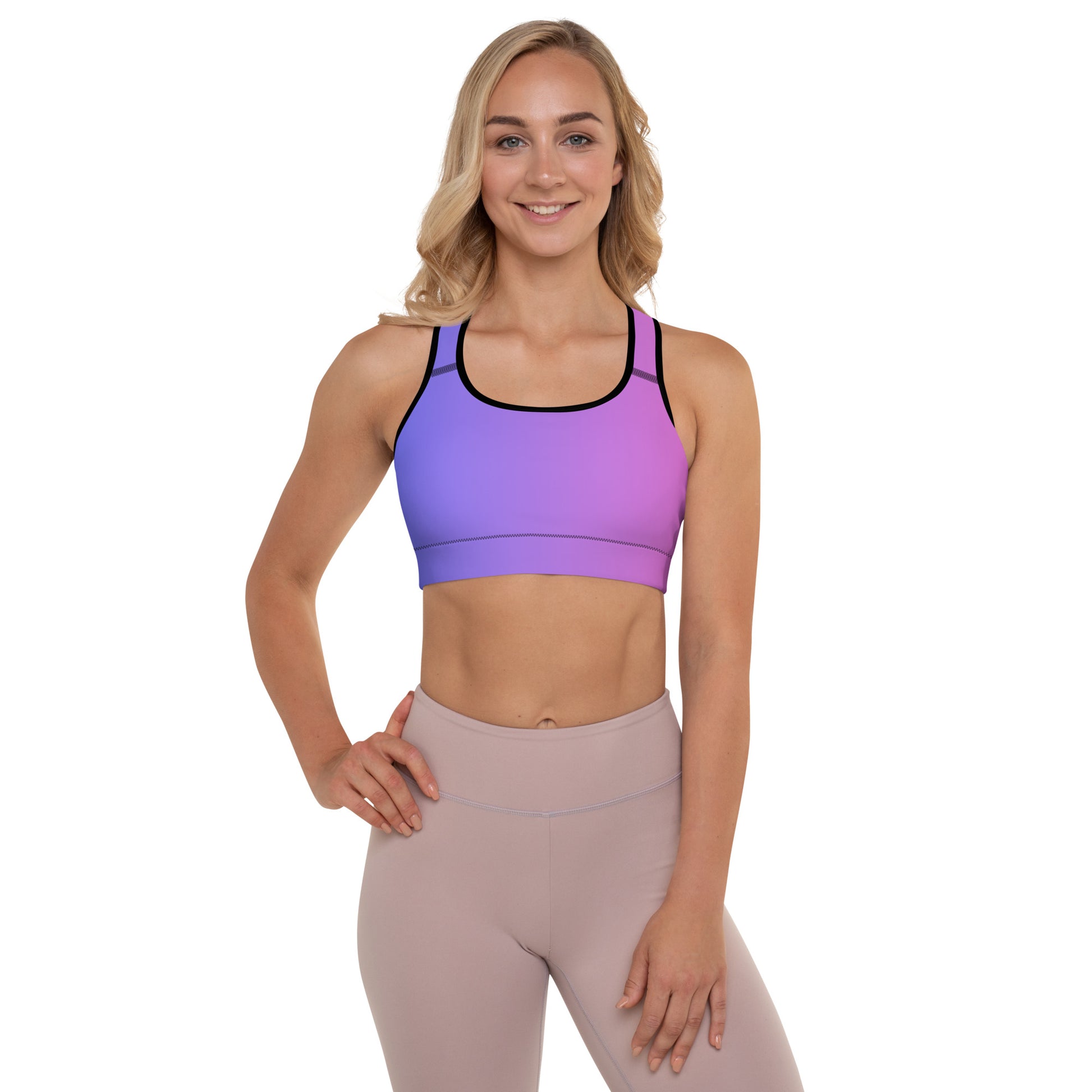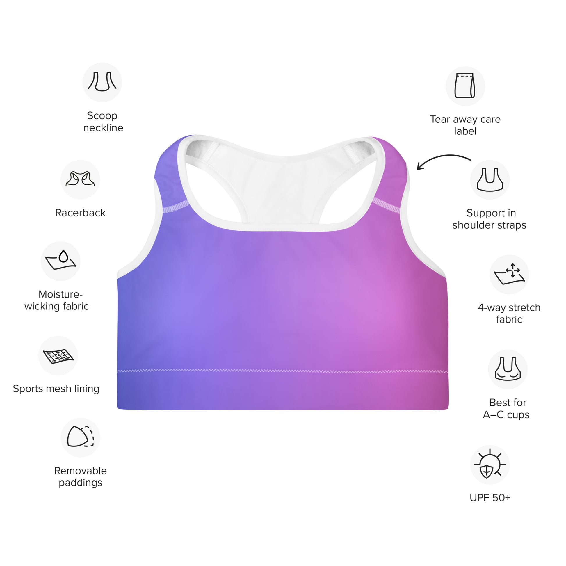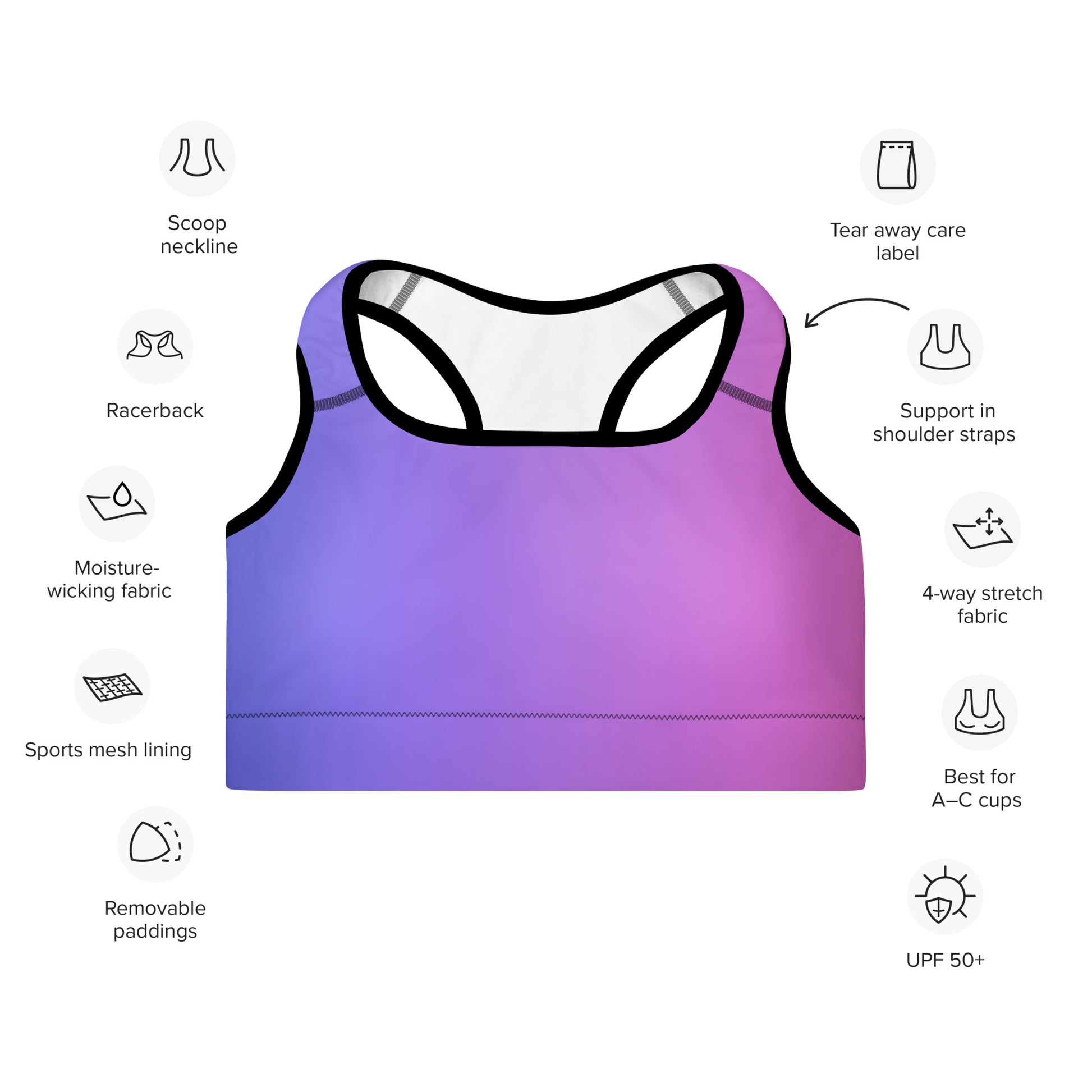 Meet the 'Gradient Glam Bra', your new partner in creating bold, beautiful workouts. Imagine the sky at dusk, with shades of purple melting into the night – that's the inspiration behind your next essential gym wear. Tailored for both strength and stretch, this sports bra is for those who paint their power with every rep. From sun salutations to sunset runs, the Gradient Glam Bra has you covered, blending comfort and confidence into a masterpiece of activewear. Who says you can't sparkle while you squat? It's time to radiate resilience and shine with every stride. Get the perfect bra for your workouts! This comfy bra has a soft moisture-wicking fabric, extra materials in shoulder straps, and removable padding for maximum support.