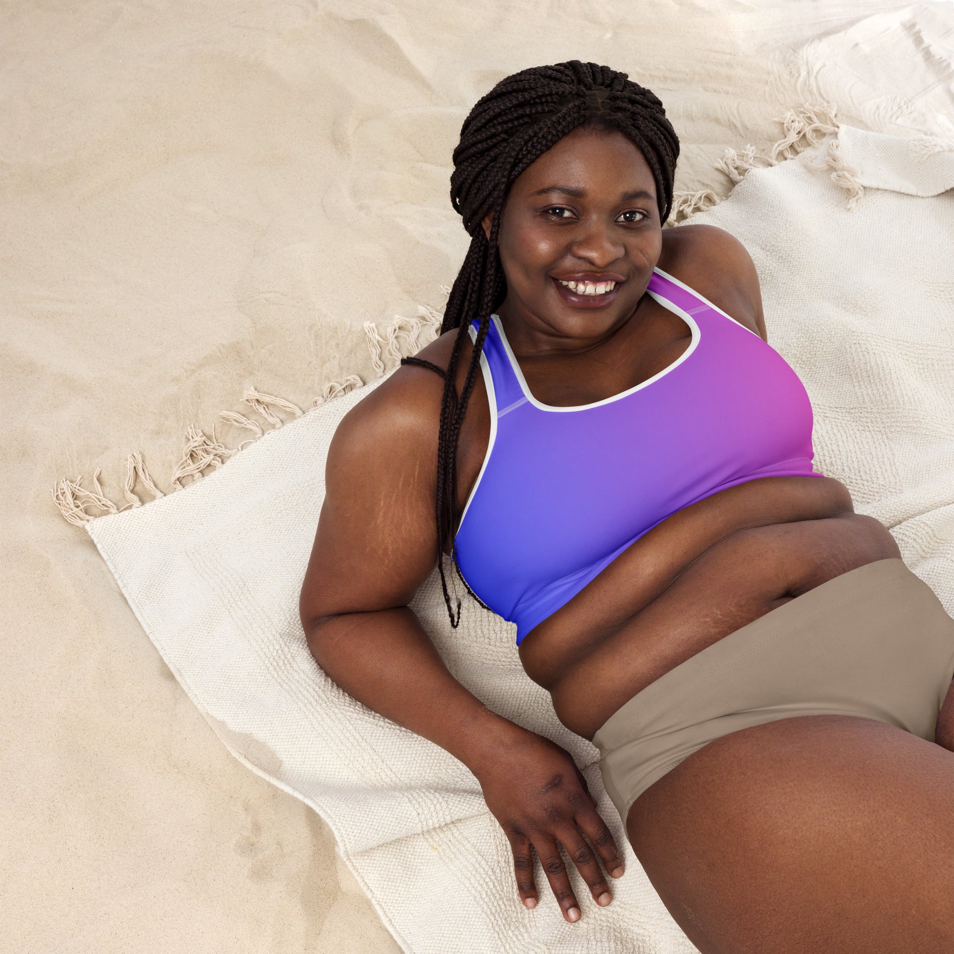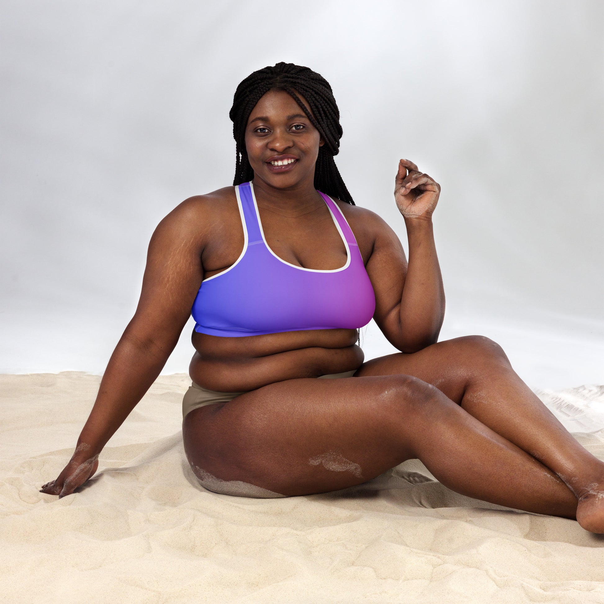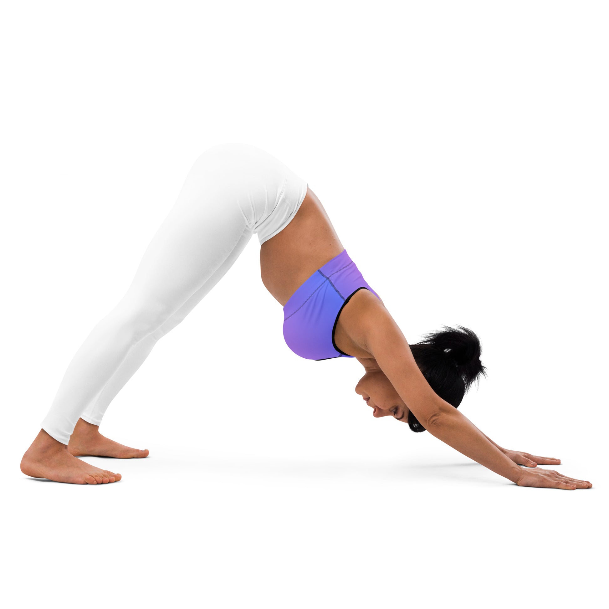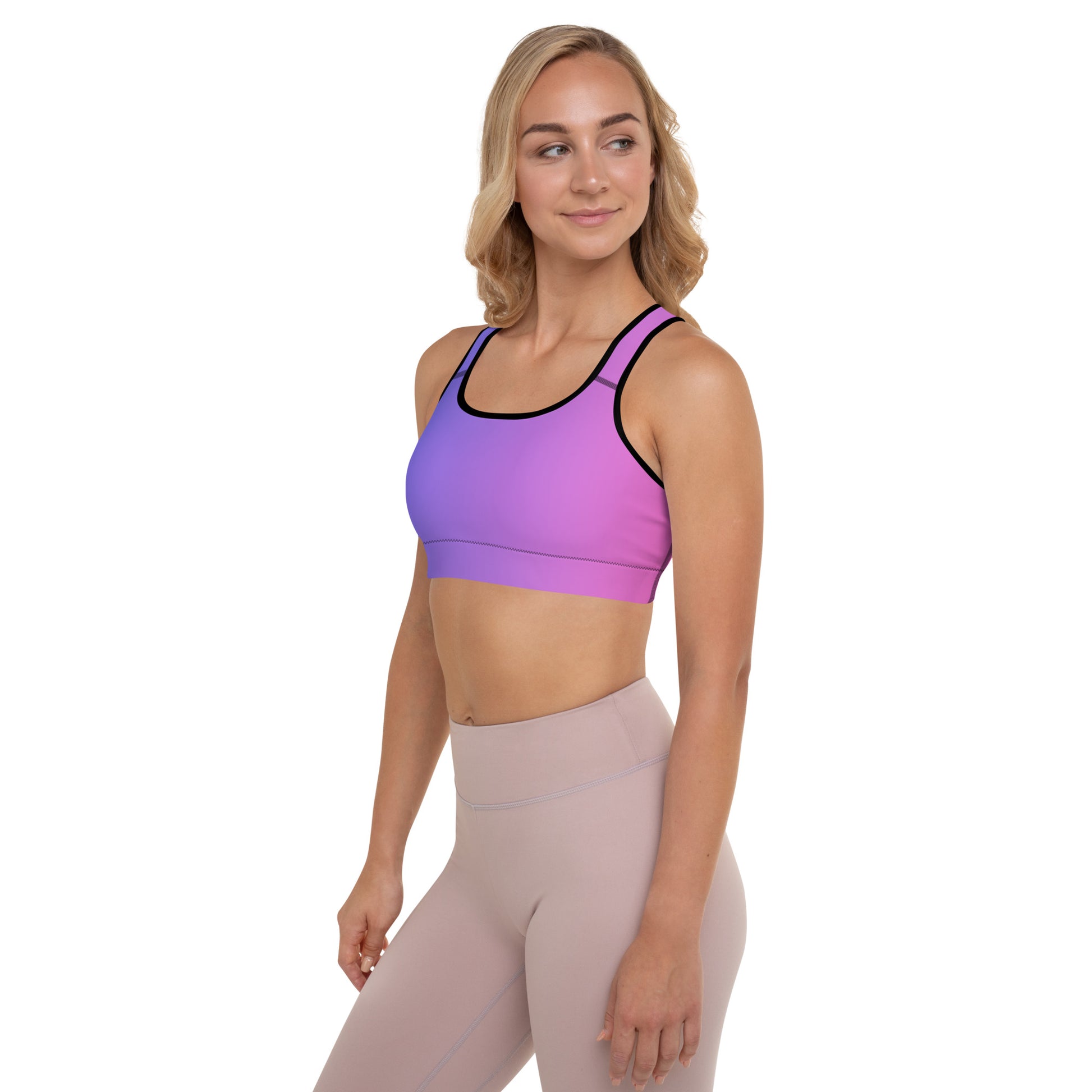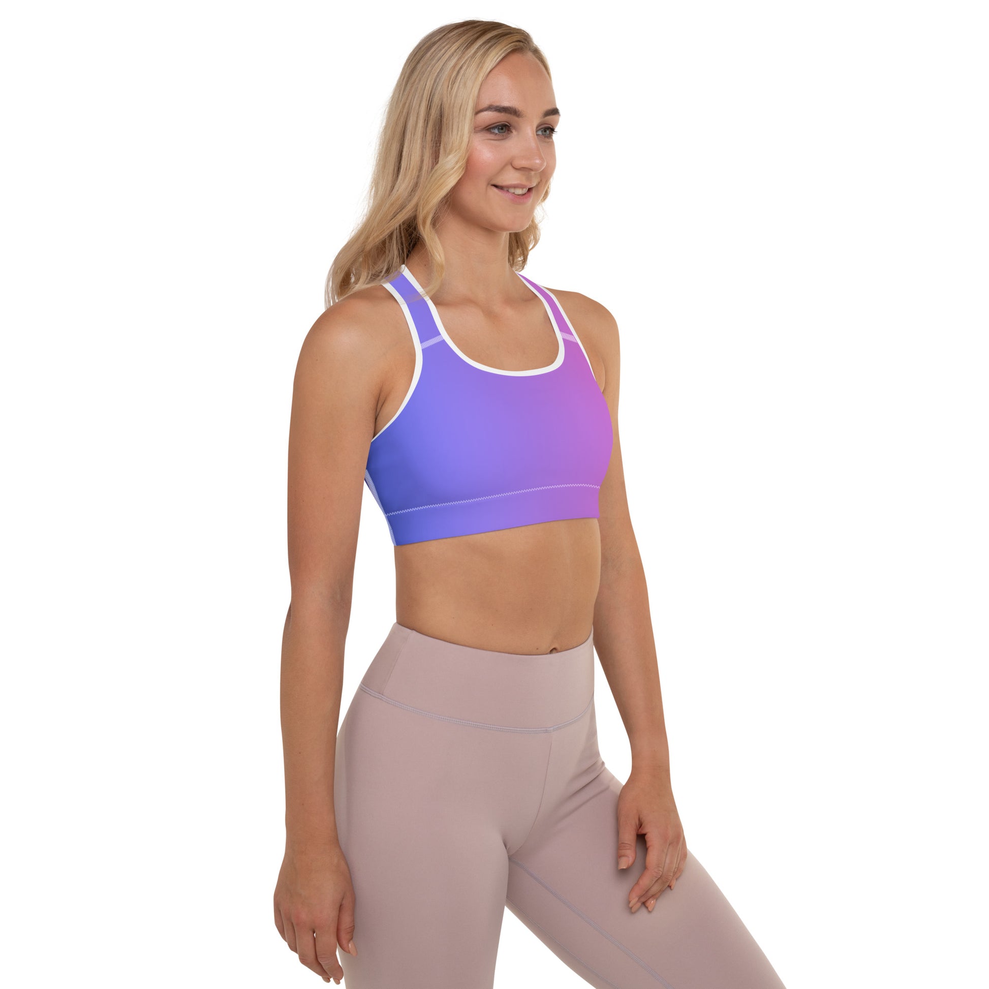 Meet the 'Gradient Glam Bra', your new partner in creating bold, beautiful workouts. Imagine the sky at dusk, with shades of purple melting into the night – that's the inspiration behind your next essential gym wear. Tailored for both strength and stretch, this sports bra is for those who paint their power with every rep. From sun salutations to sunset runs, the Gradient Glam Bra has you covered, blending comfort and confidence into a masterpiece of activewear. Who says you can't sparkle while you squat? It's time to radiate resilience and shine with every stride. Get the perfect bra for your workouts! This comfy bra has a soft moisture-wicking fabric, extra materials in shoulder straps, and removable padding for maximum support.