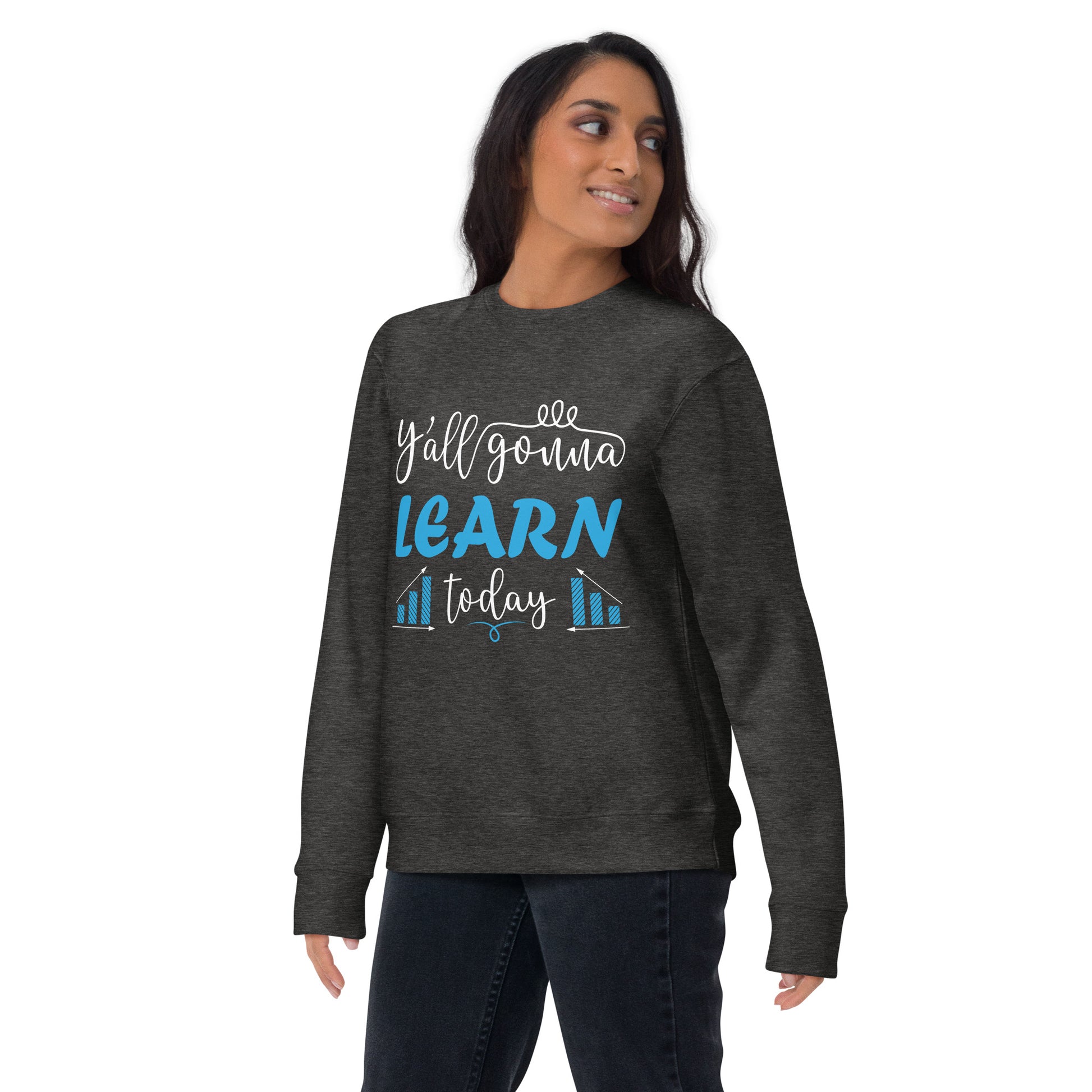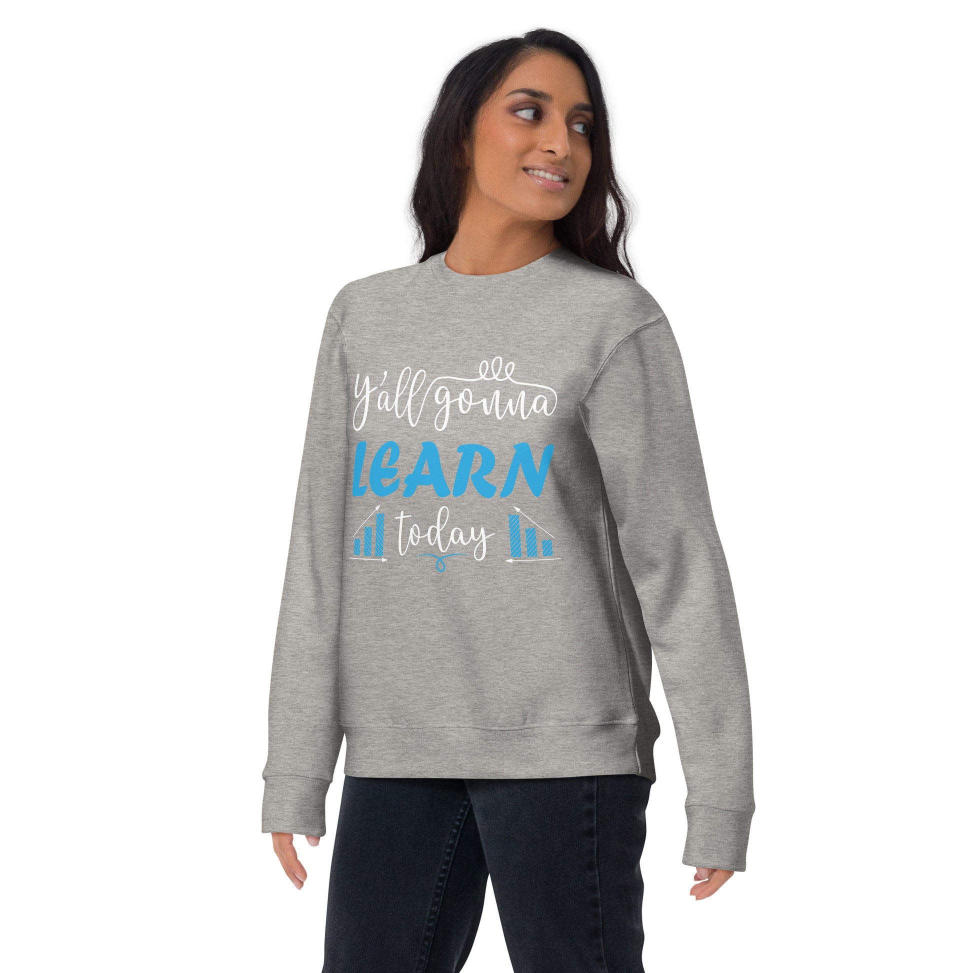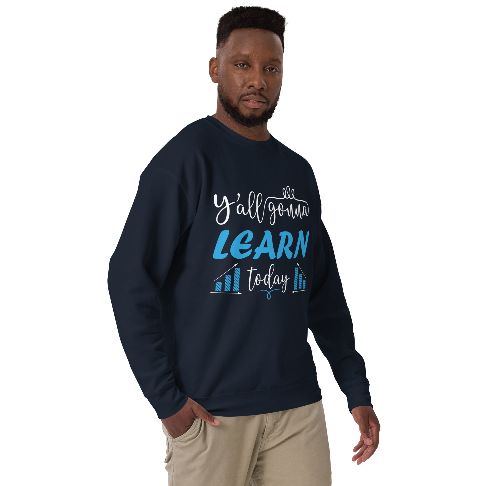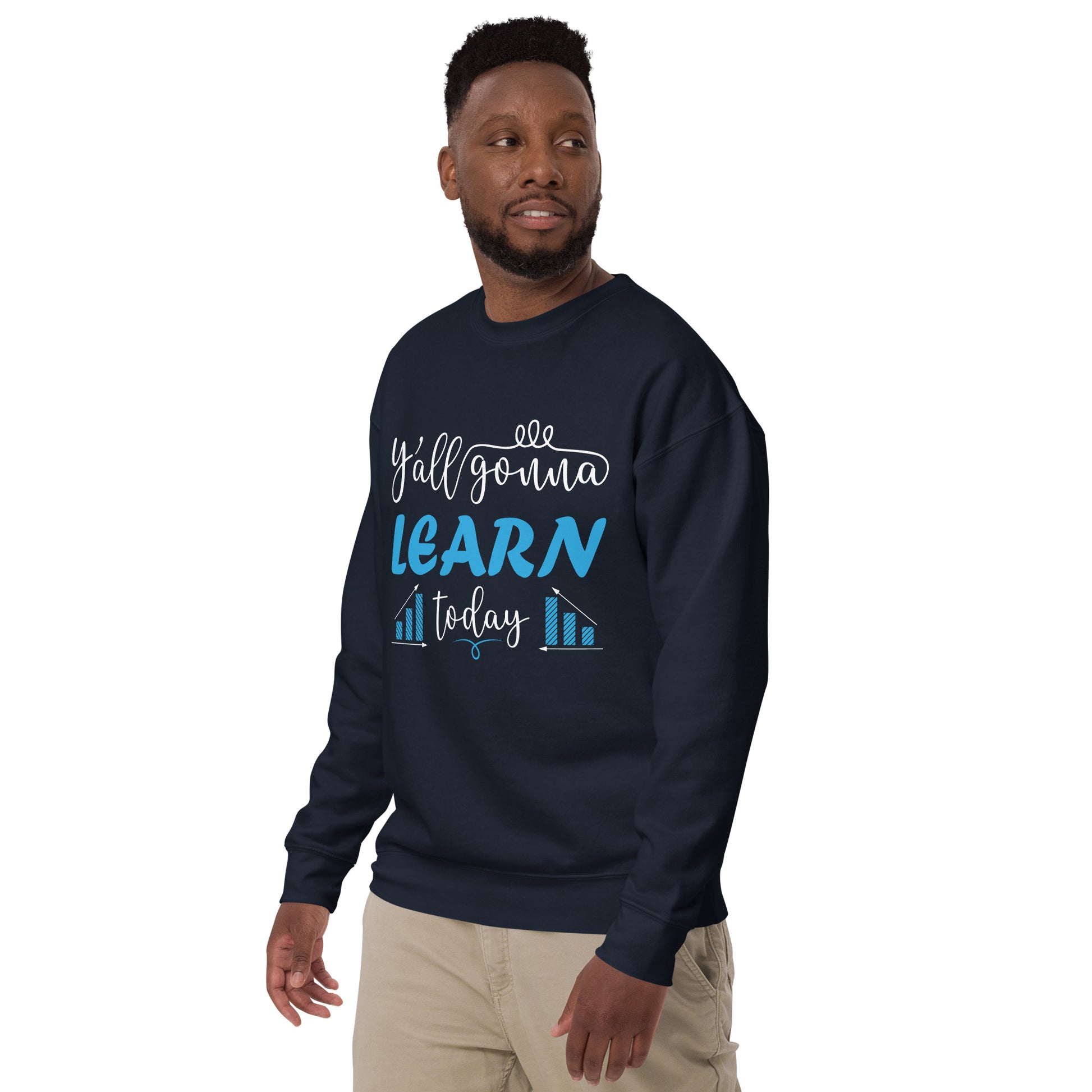 Embrace the charm of the classroom with our "Learn Today" sweatshirt, where wit meets wisdom in a cozy package. It's all about making a statement before the lesson begins with a playful "Y'all Gonna Learn Today." This sweatshirt marries comfort with a dash of down-home humor, perfect for the educator who brings a touch of colloquial charm to the serious business of learning. Whether you're leading a bustling classroom, grading papers on a quiet porch, or inspiring young minds with the gift of gab, this top is a lighthearted nod to the joy of teaching and the unique flair you bring to it. Don this sweatshirt and let your students know that education can be as enjoyable as a sunny day down South, with a side of serious scholarship. Rock a classic sweatshirt silhouette with ribbed crew neck, long sleeve cuffs, and a flat hem. Layer it up or wear it on its own for a contemporary streetwear look. With the soft fleece inside and comfortable fit, it’s sure to become your favorite everyday sweater right away!