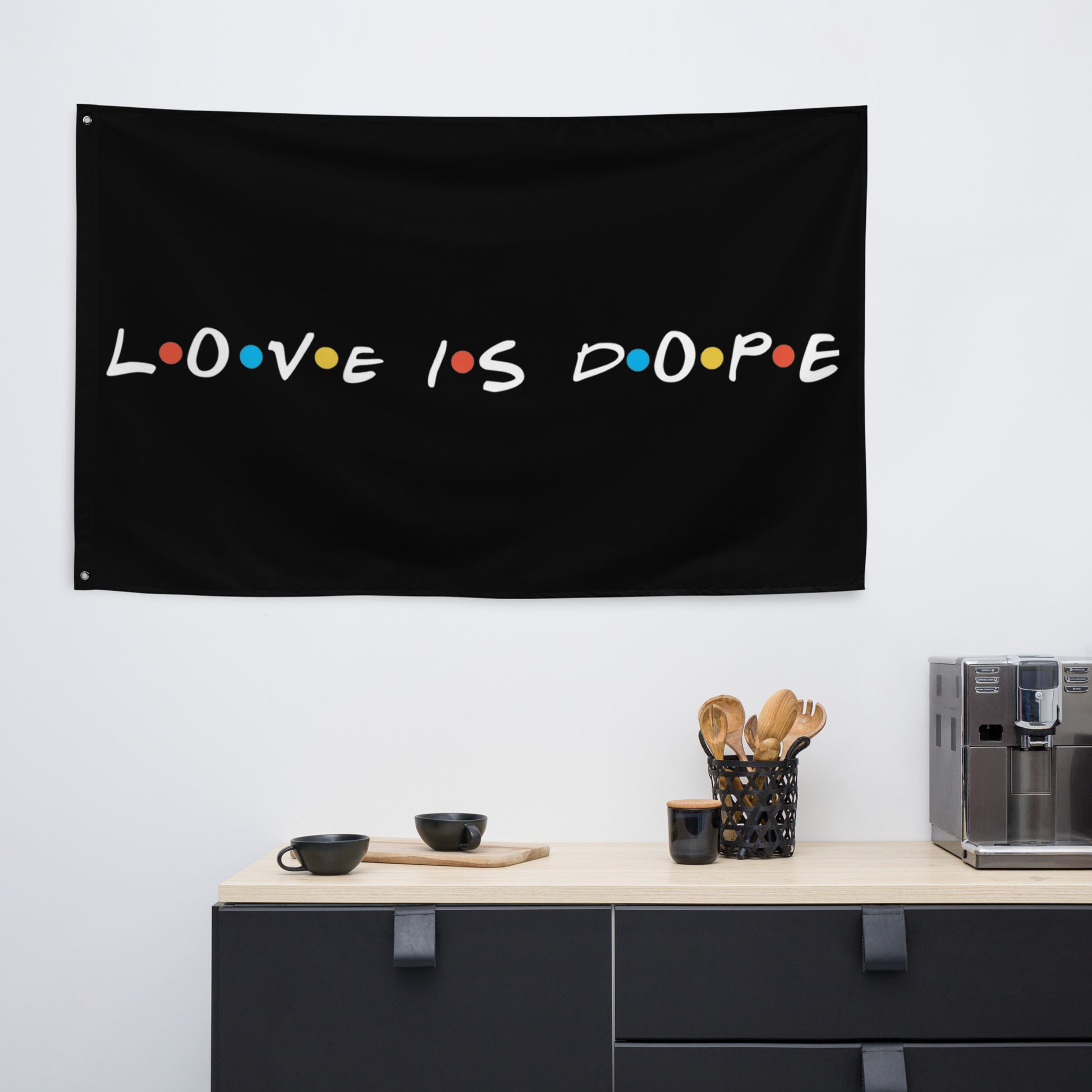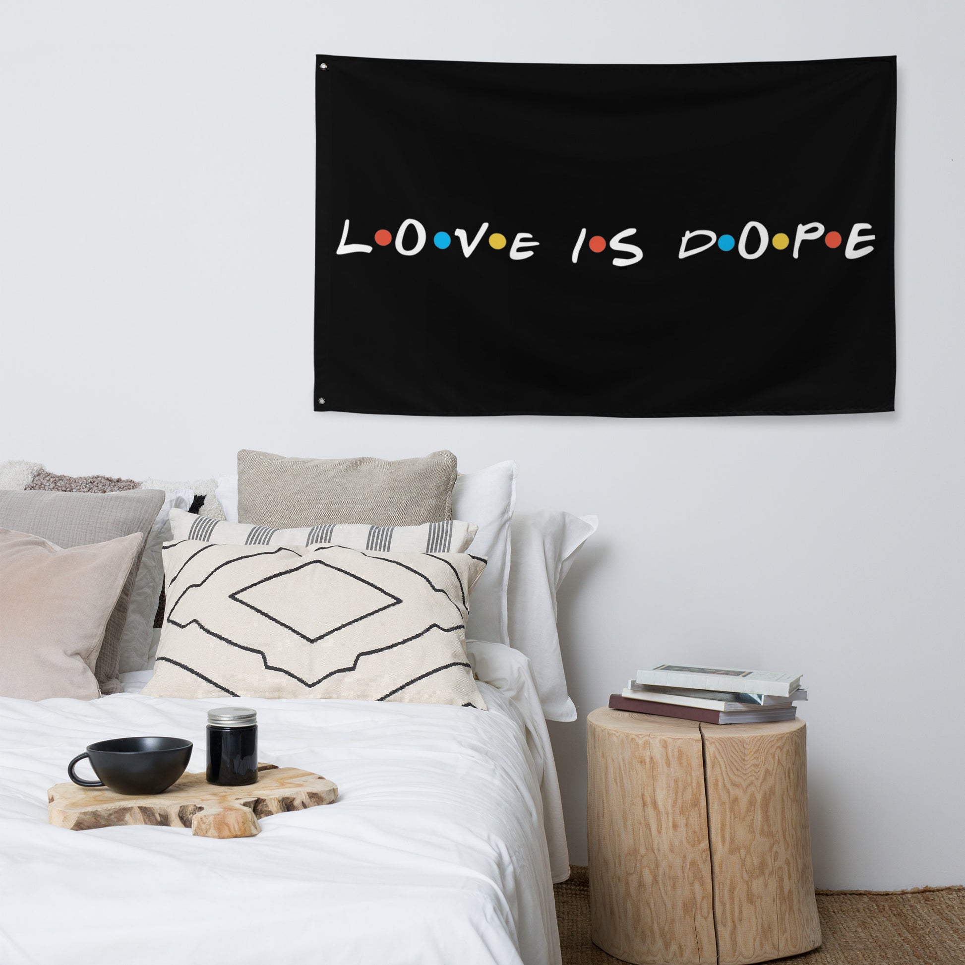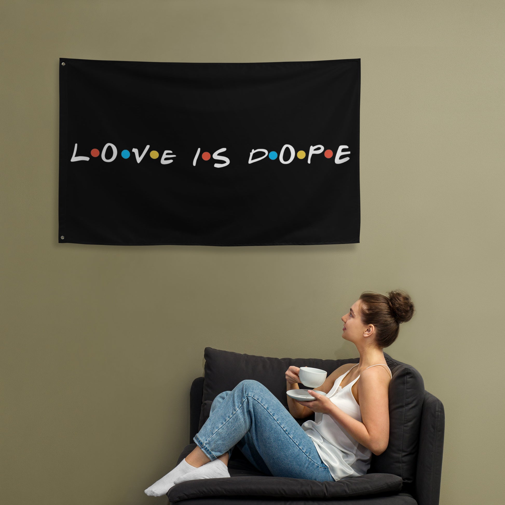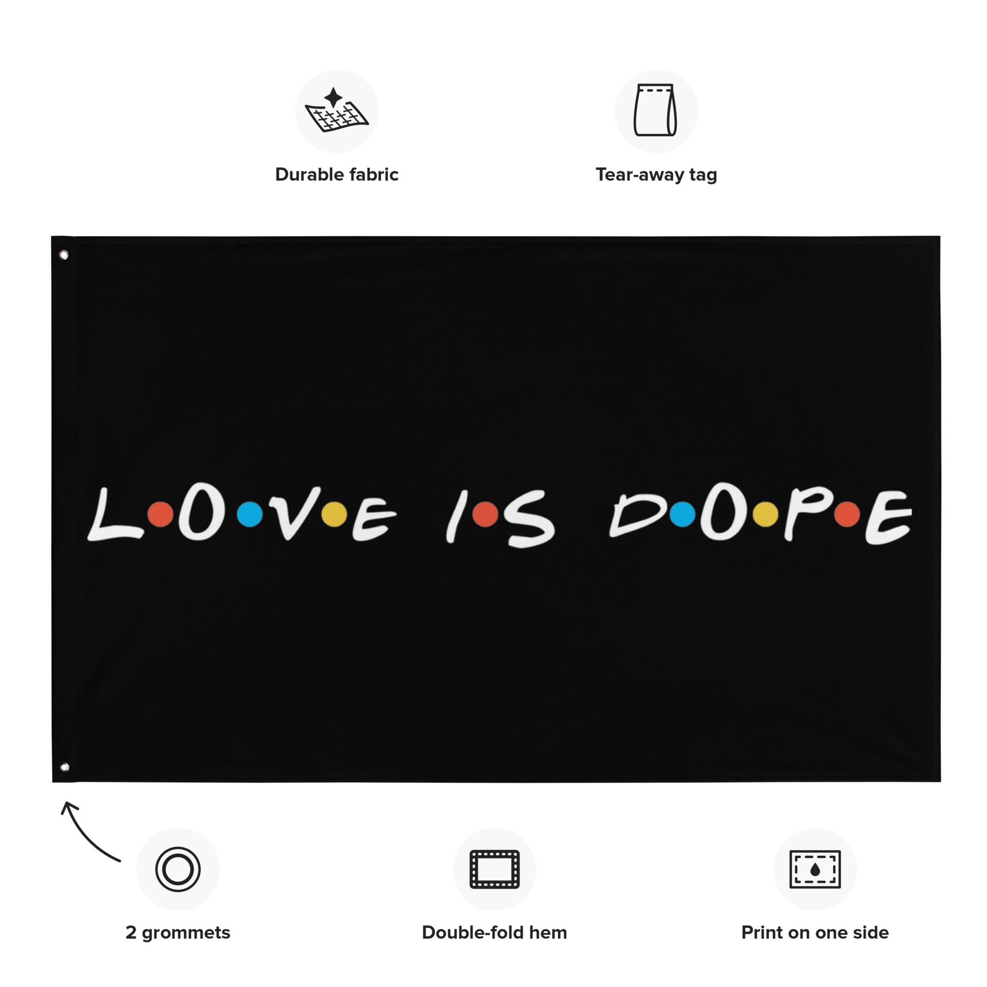 Fly high the 'Love is Dope Flag' and let it ripple with every breeze, a banner for the bold-hearted and the believers in love's coolness. More than just a flag, it's a declaration, a conversation piece, perfect for your dorm, your den, or your digital backdrop in Friends-style hangouts. It's a tribute to the love that laughs, lives, and lights up our lives, bringing a touch of wit and a wave of warmth to any space. Let this flag be your emblem, your signal to the world that when it comes to what matters, you’re all in, full heart, full fun. Who doesn’t want to turn their house into a home? Brighten up your space by adding this unique flag to your wall. Your flag won’t crease or shrink thanks to the polyester material and will last a long time.