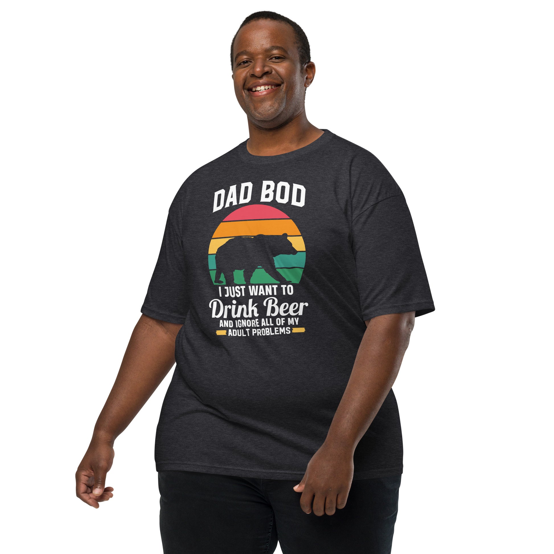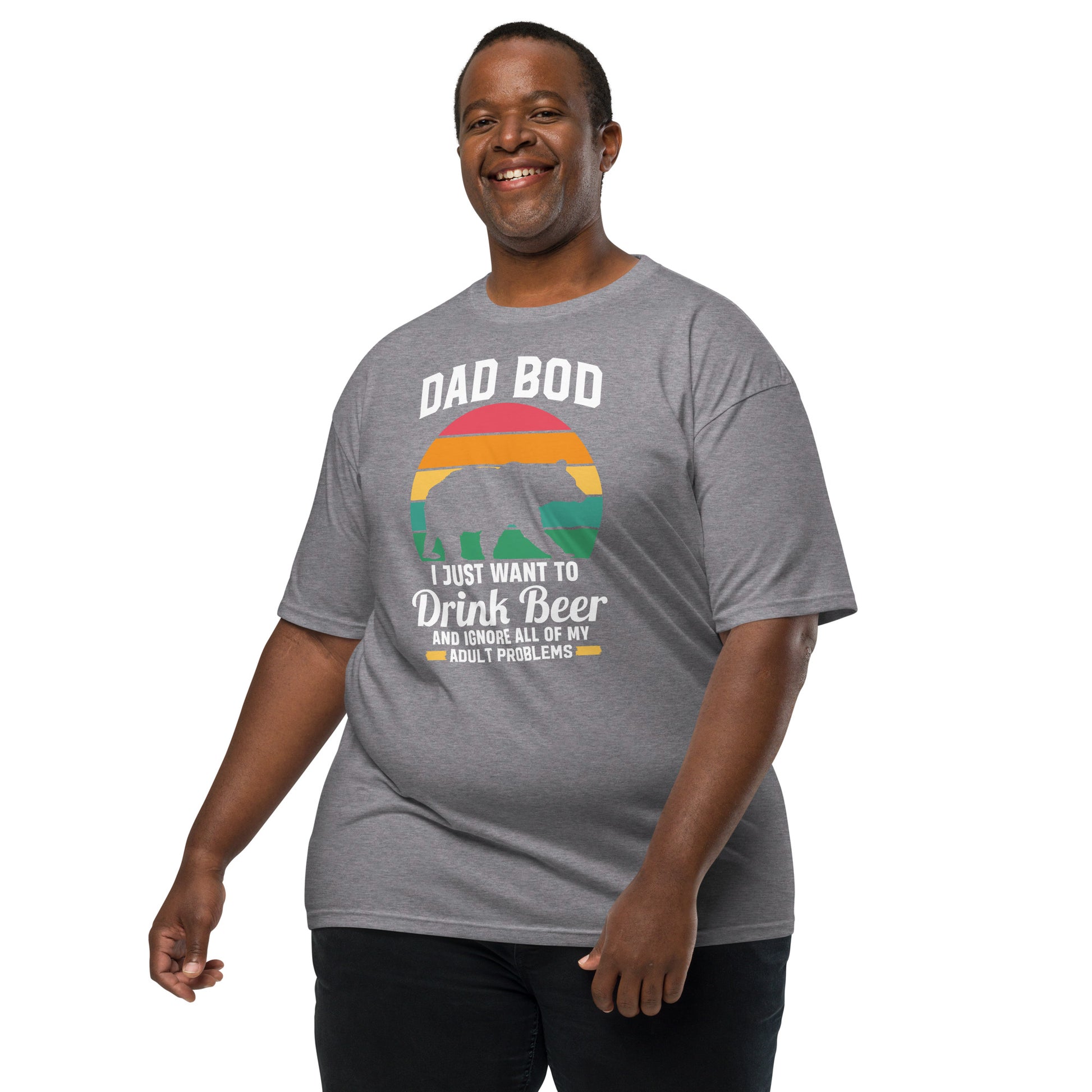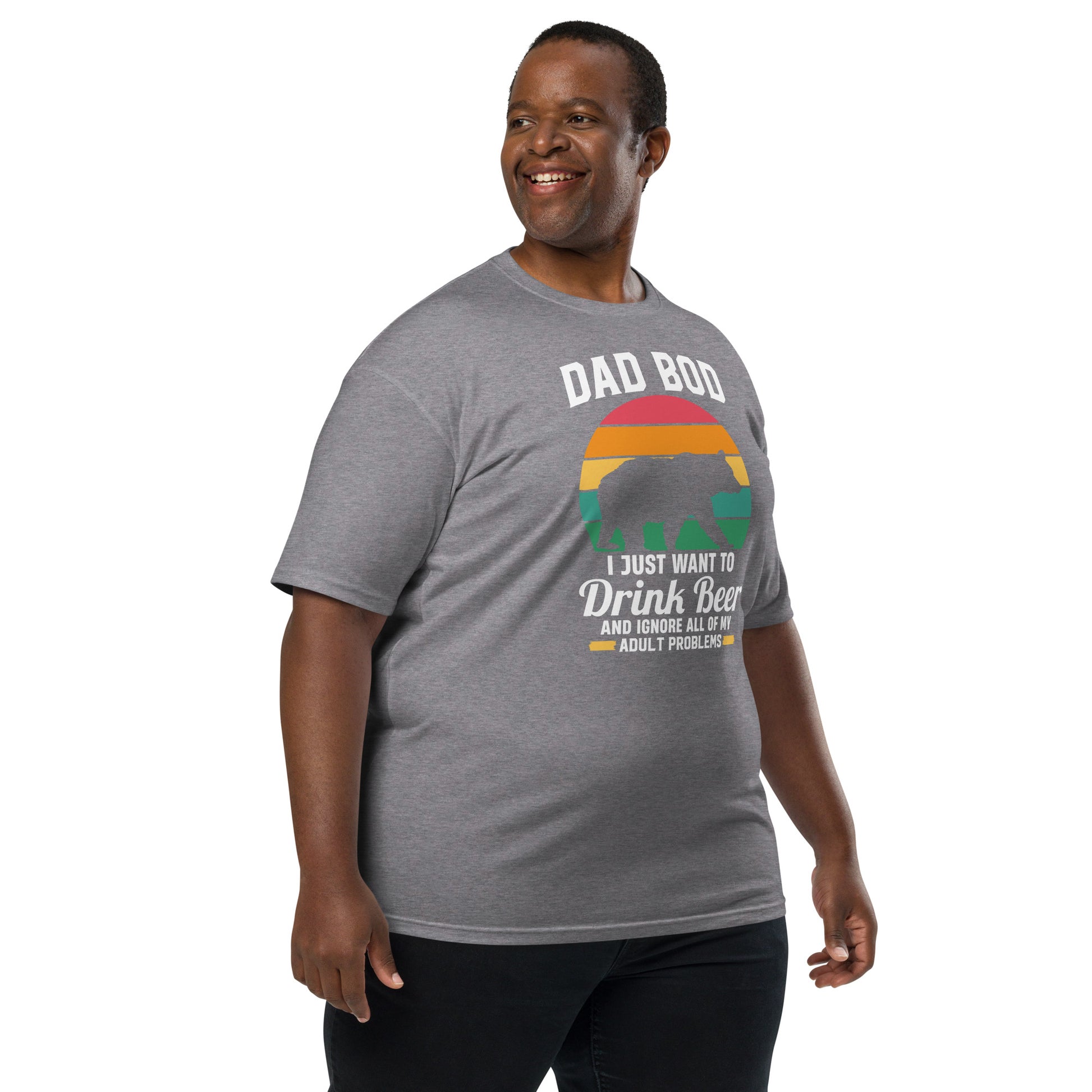 Embrace the laid-back lifestyle with our "Dad Bod" tee! Featuring a silhouette of a bear and a sunset backdrop, it's a humorous nod to those who prefer a cold brew over a gym session. Perfect for patio lounging or barbecue shenanigans, this shirt is your official pass to relax and let the dad bod thrive. Elevate your outfit with the men’s premium heavyweight tee. The tee has a structured, classy fit and is both durable and soft thanks to its ring-spun cotton material. Layer the t-shirt or wear it on its own and enjoy great looks with little effort!