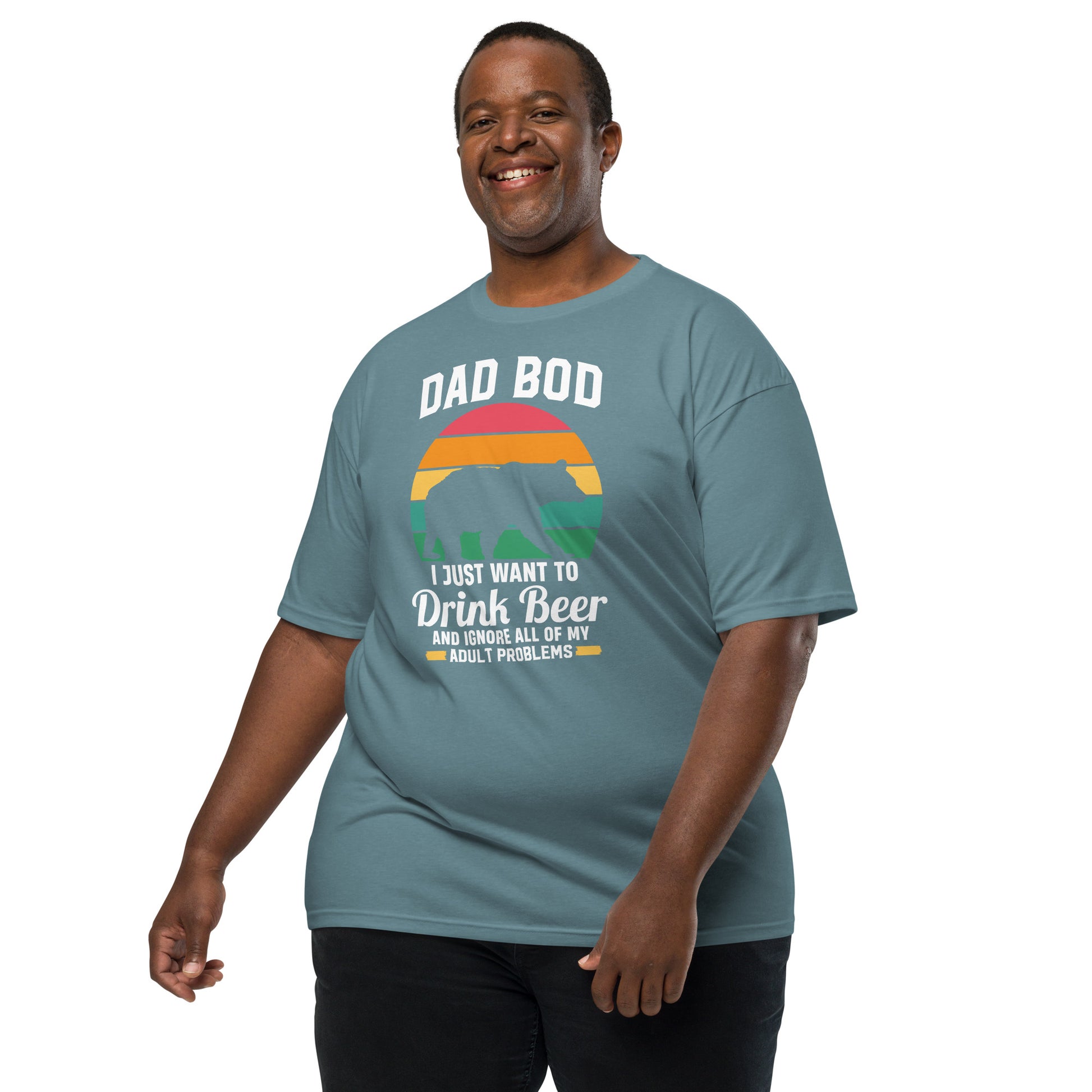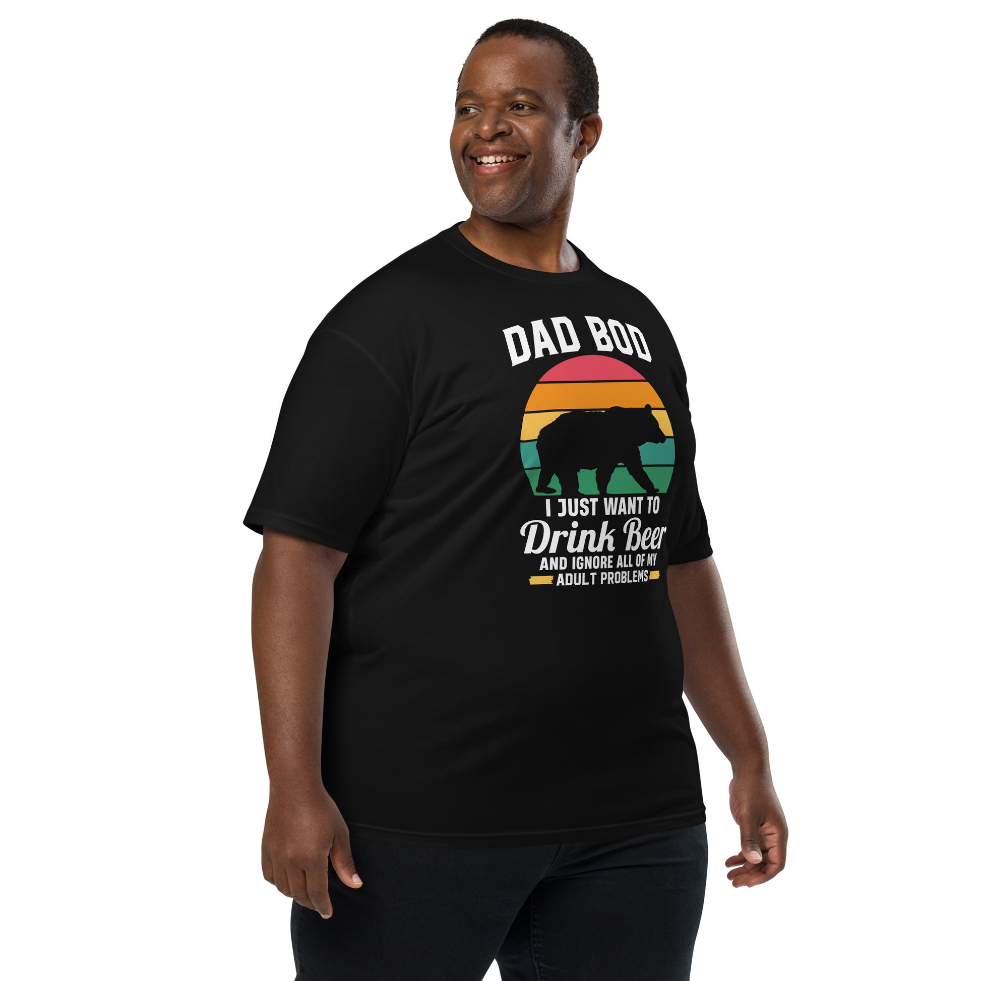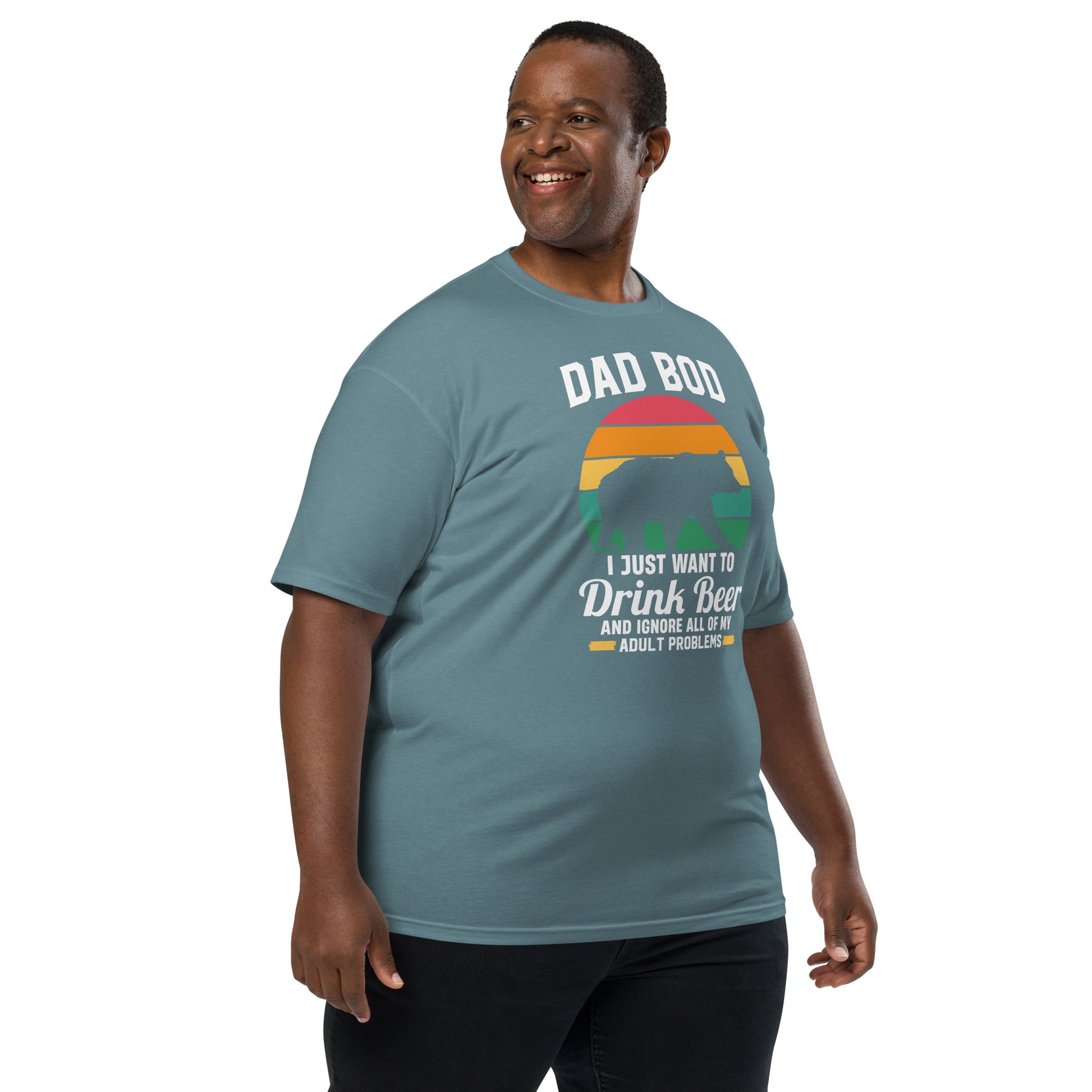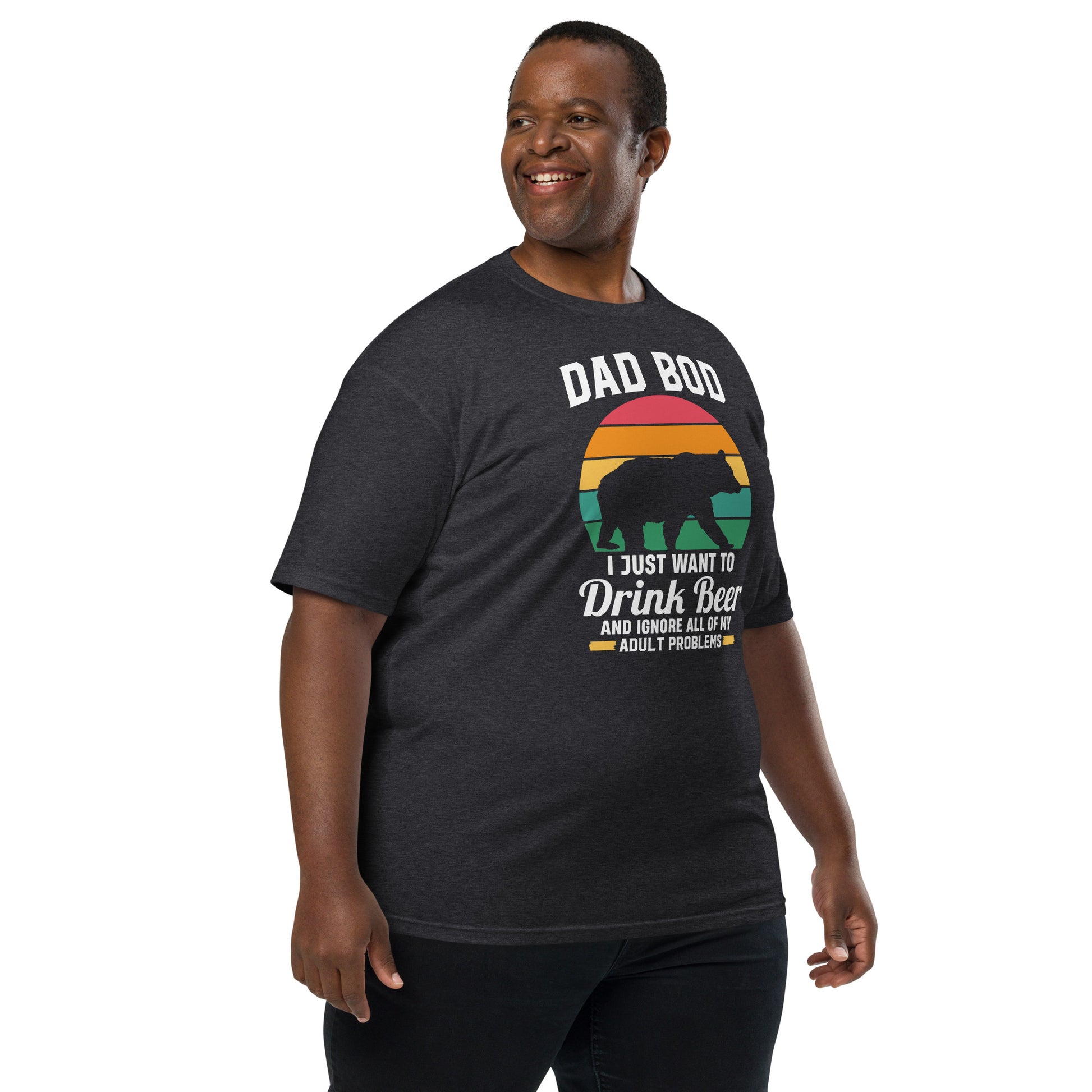 Embrace the laid-back lifestyle with our "Dad Bod" tee! Featuring a silhouette of a bear and a sunset backdrop, it's a humorous nod to those who prefer a cold brew over a gym session. Perfect for patio lounging or barbecue shenanigans, this shirt is your official pass to relax and let the dad bod thrive. Elevate your outfit with the men’s premium heavyweight tee. The tee has a structured, classy fit and is both durable and soft thanks to its ring-spun cotton material. Layer the t-shirt or wear it on its own and enjoy great looks with little effort!