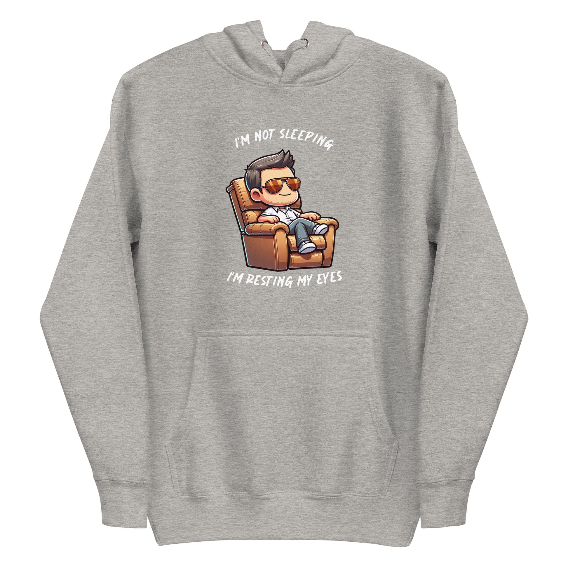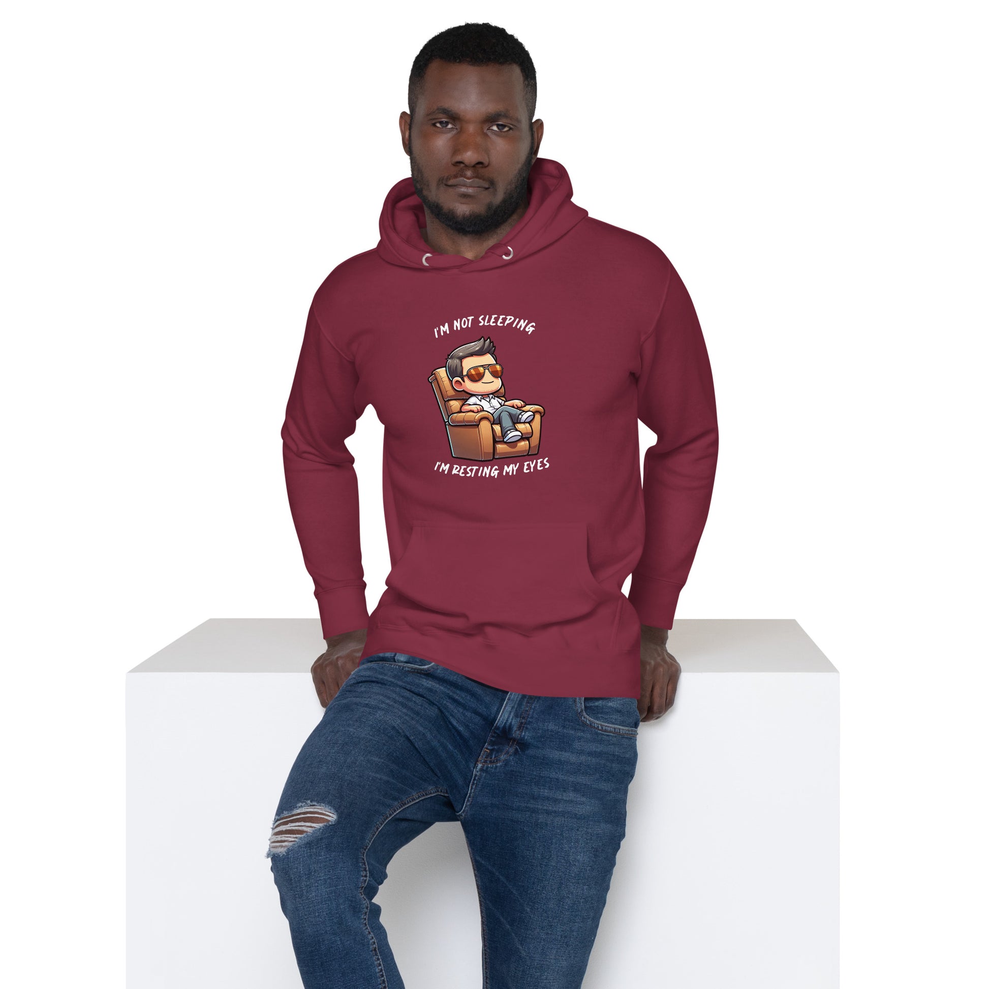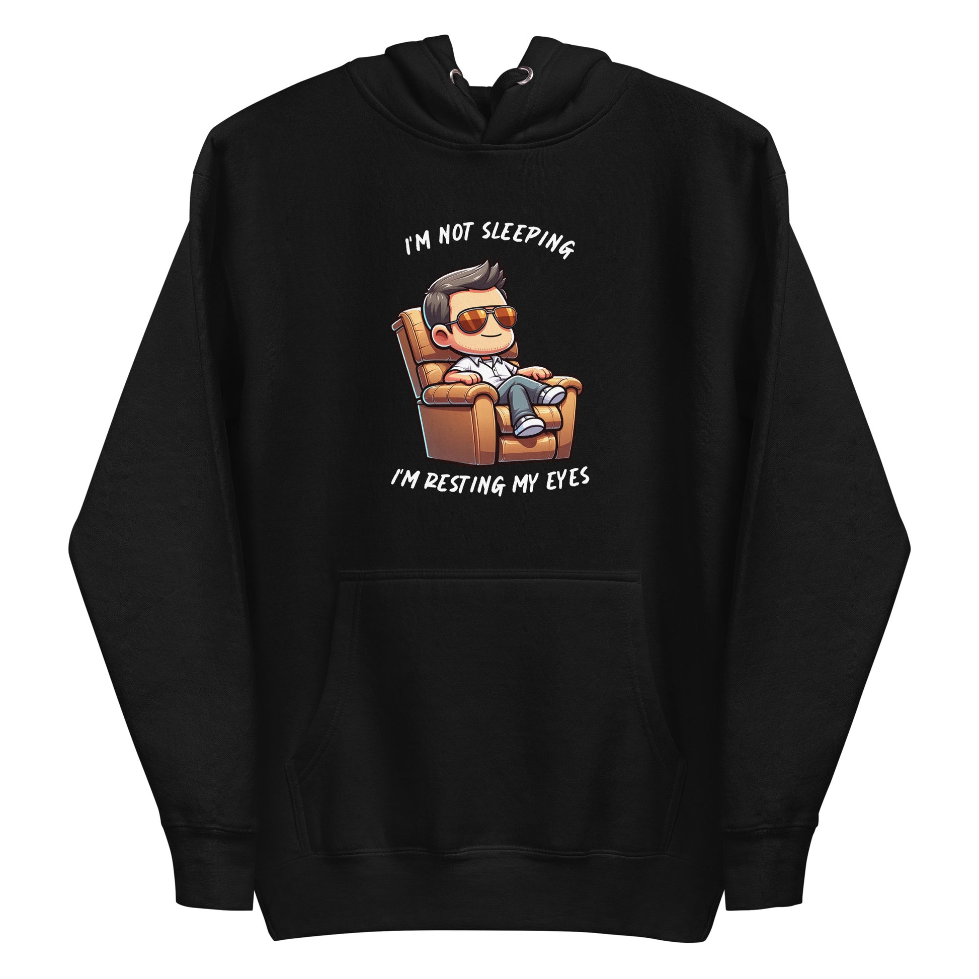 This hoodie features a lighthearted and relatable cartoon graphic of a person lounging in a recliner, accompanied by the witty phrase "I'm not sleeping, I'm resting my eyes." It perfectly encapsulates those moments of intended brief rest that accidentally turn into a nap. This hoodie is a fun addition to any casual wardrobe, offering both comfort and a touch of humor. It's an ideal pick for anyone who enjoys a good chuckle about the fine line between resting and napping. Who knew that the softest hoodie you'll ever own comes with such a cool design. You won't regret buying this classic streetwear piece of apparel with a convenient pouch pocket and warm hood for chilly evenings.