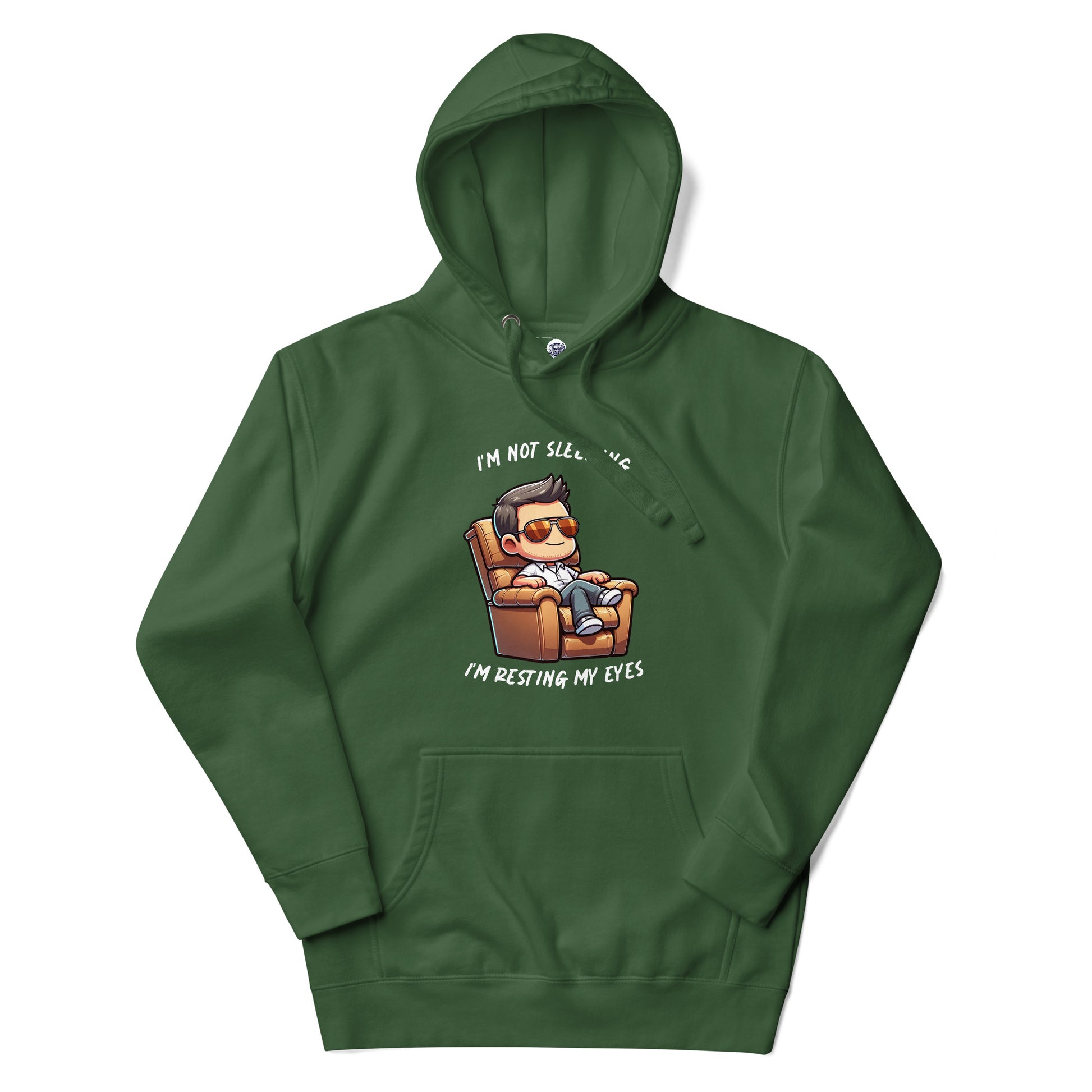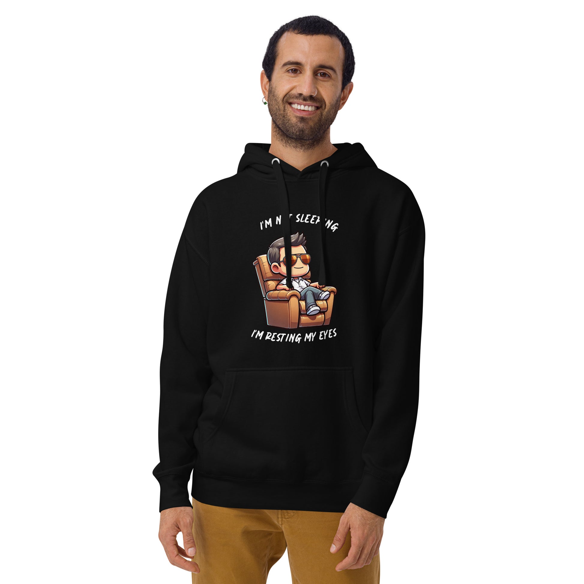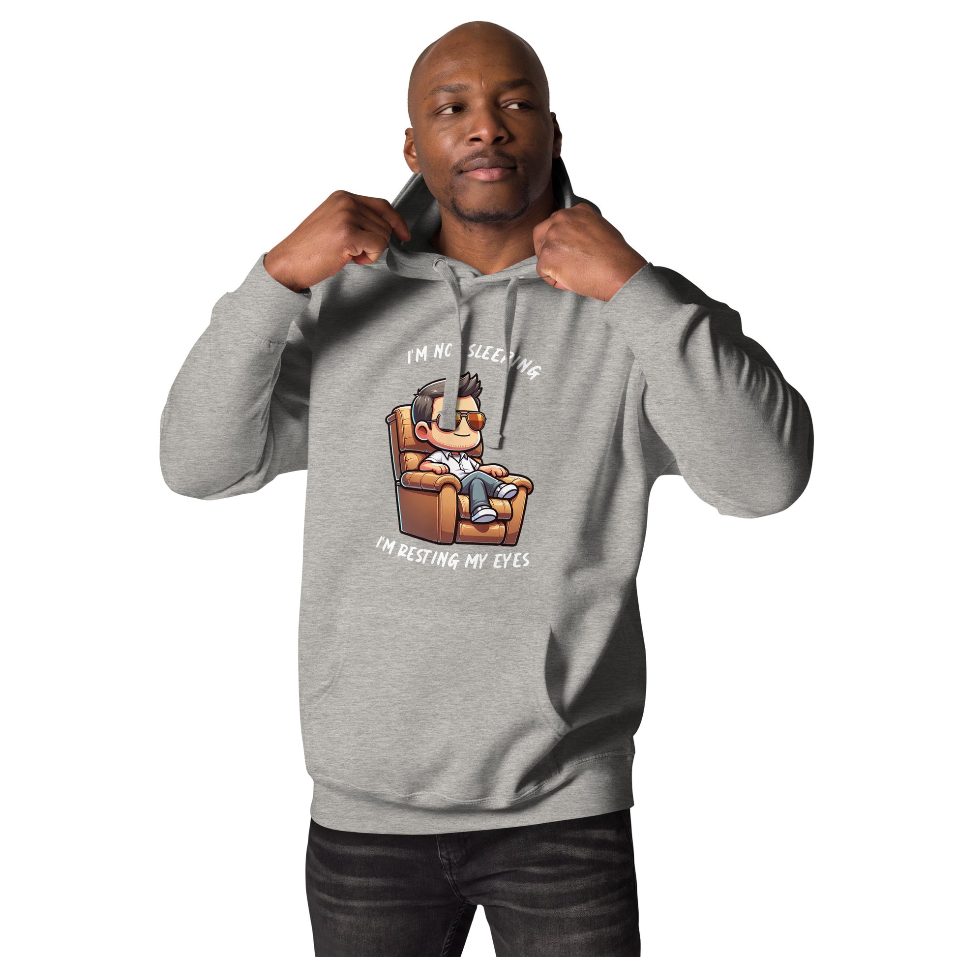 This hoodie features a lighthearted and relatable cartoon graphic of a person lounging in a recliner, accompanied by the witty phrase "I'm not sleeping, I'm resting my eyes." It perfectly encapsulates those moments of intended brief rest that accidentally turn into a nap. This hoodie is a fun addition to any casual wardrobe, offering both comfort and a touch of humor. It's an ideal pick for anyone who enjoys a good chuckle about the fine line between resting and napping. Who knew that the softest hoodie you'll ever own comes with such a cool design. You won't regret buying this classic streetwear piece of apparel with a convenient pouch pocket and warm hood for chilly evenings.