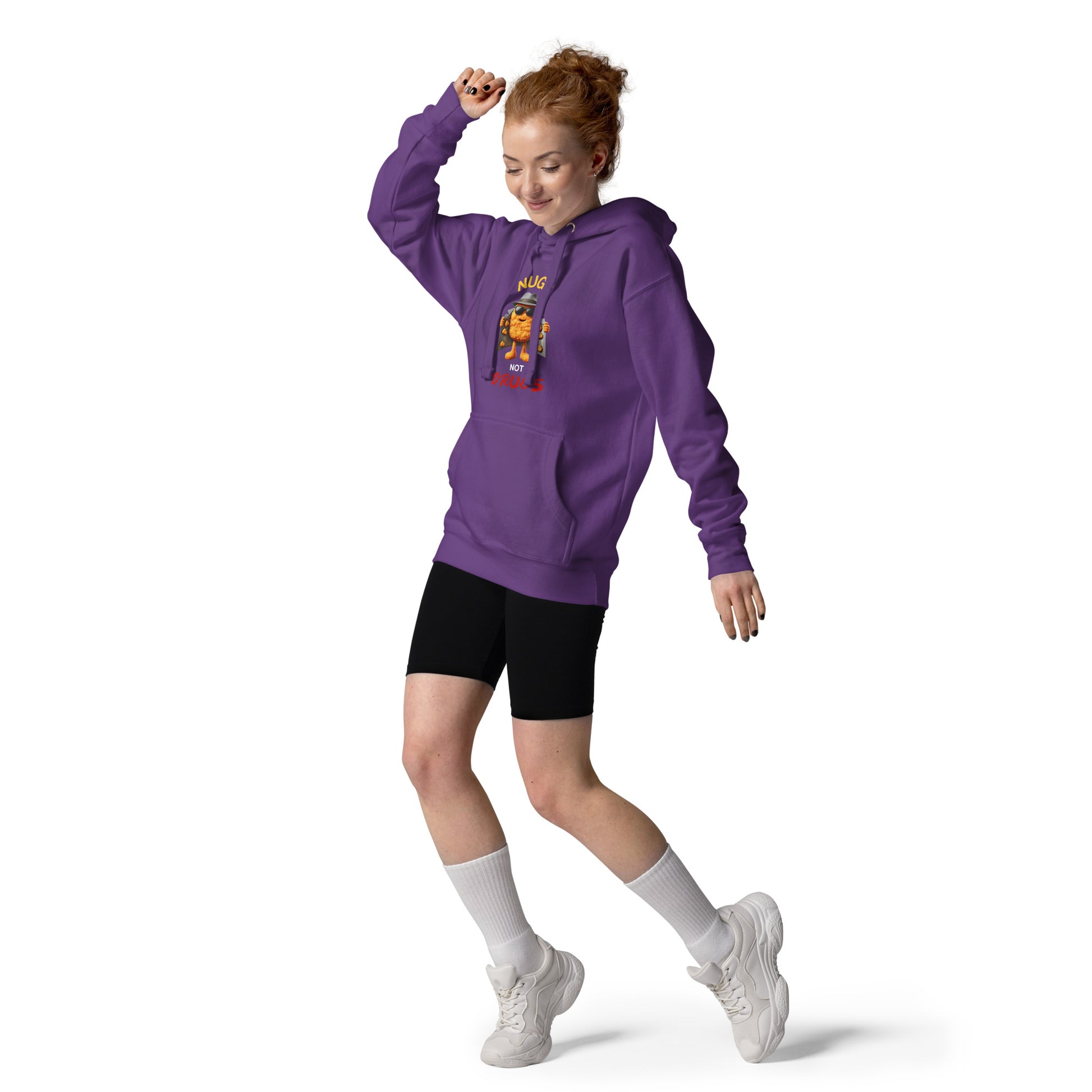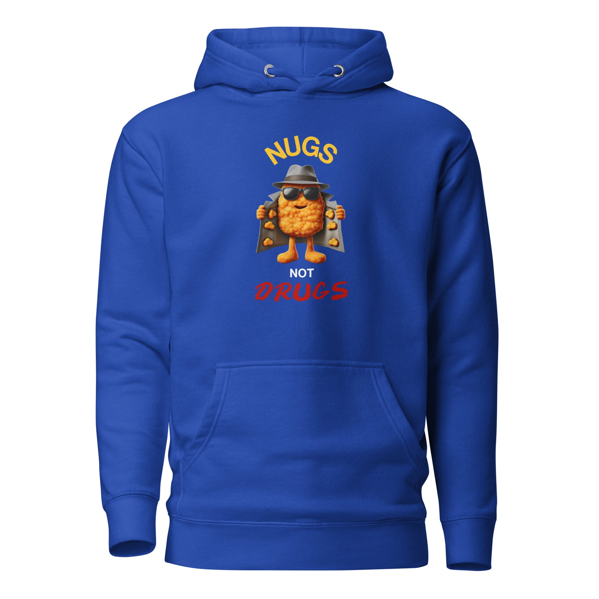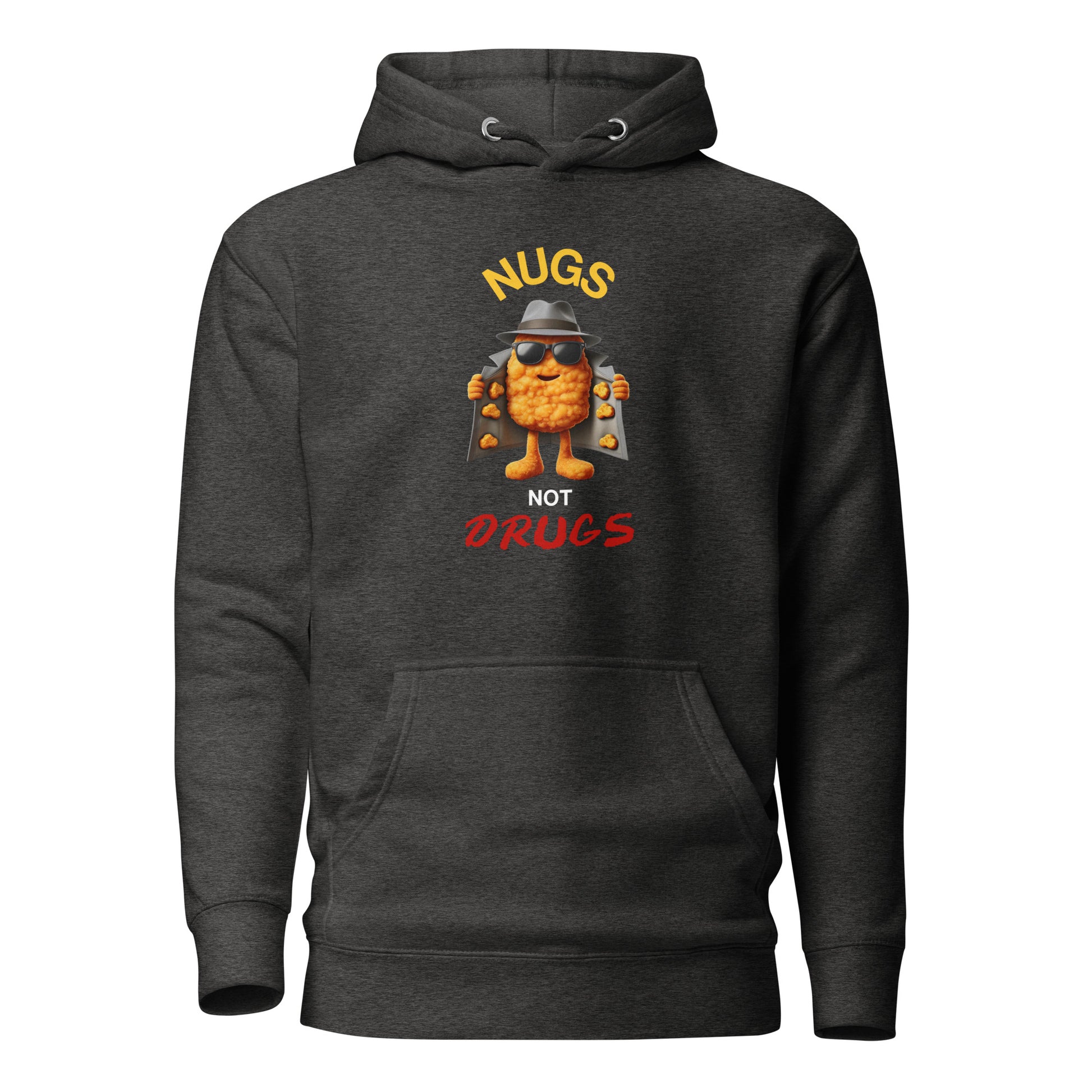 Stay warm and show off your love for chicken nuggets in this humorous hoodie featuring a nugget character in a trench coat and hat, holding up more nuggets. "NUGS NOT DRUGS" is printed in a whimsical font, making a funny play on words. Great for everyday wear or as a conversation starter. Crafted from a plush cotton blend fabric with a front pocket and drawstring hood. Who knew that the softest hoodie you'll ever own comes with such a cool design. You won't regret buying this classic streetwear piece of apparel with a convenient pouch pocket and warm hood for chilly evenings.