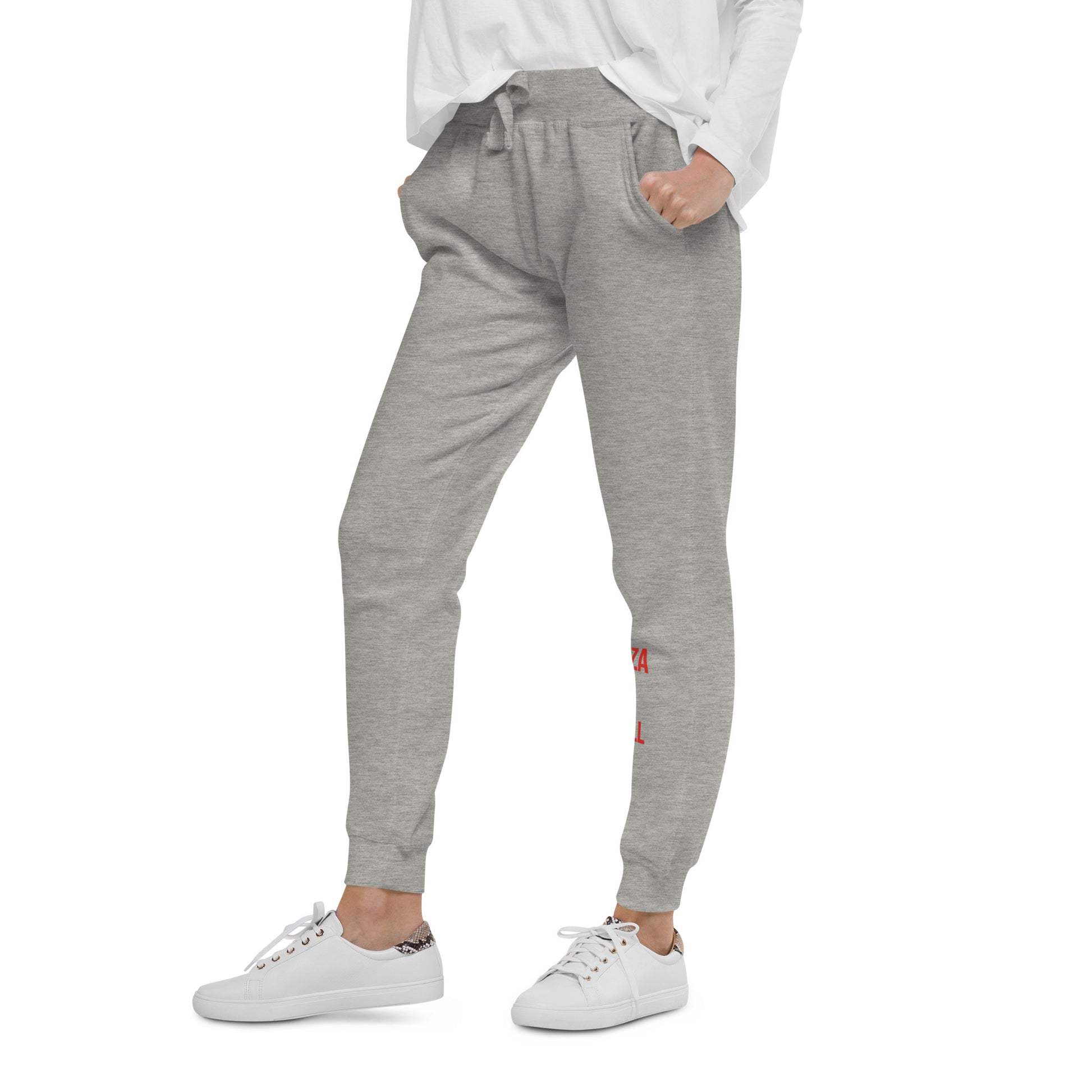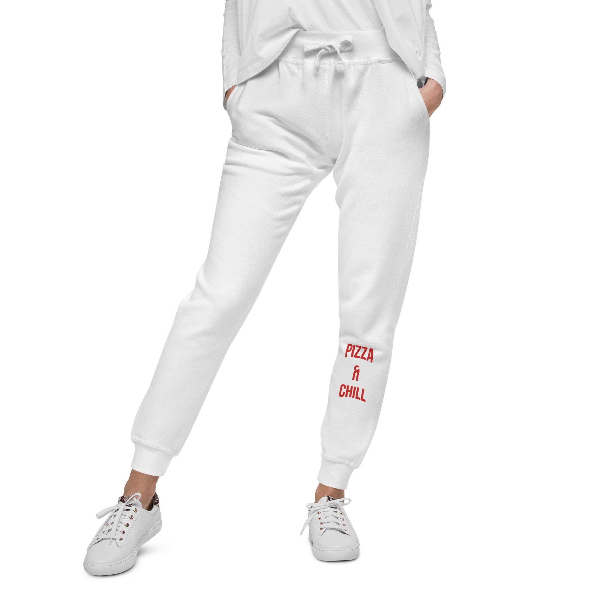 Roll out the dough and spread the sauce! The "Pizza & Chill" sweatpants is here to sprinkle some humor into your wardrobe. Baked to perfection for pizza aficionados and chill masters alike, this shirt is the cheese to your pepperoni. Made from cotton that's softer than a pizza lover's heart, this sweatpants flaunts a cheesy "Pizza & Chill" slogan that's saucier than your grandma's secret recipe. It's not just casual wear; it's a conversation starter that says, "I'm all about that base...pizza base." So slide into this tee like a hot slice into a box, and serve up your look with a side of laughs. Because life is too short for plain cheese when you can have the whole topping combo!Well-made and lined with fleece, these comfortable Unisex Fleece Sweatpants will be your first choice for a casual everyday outfit—all you need to add is a graphic tee and sneakers to finish off the look.