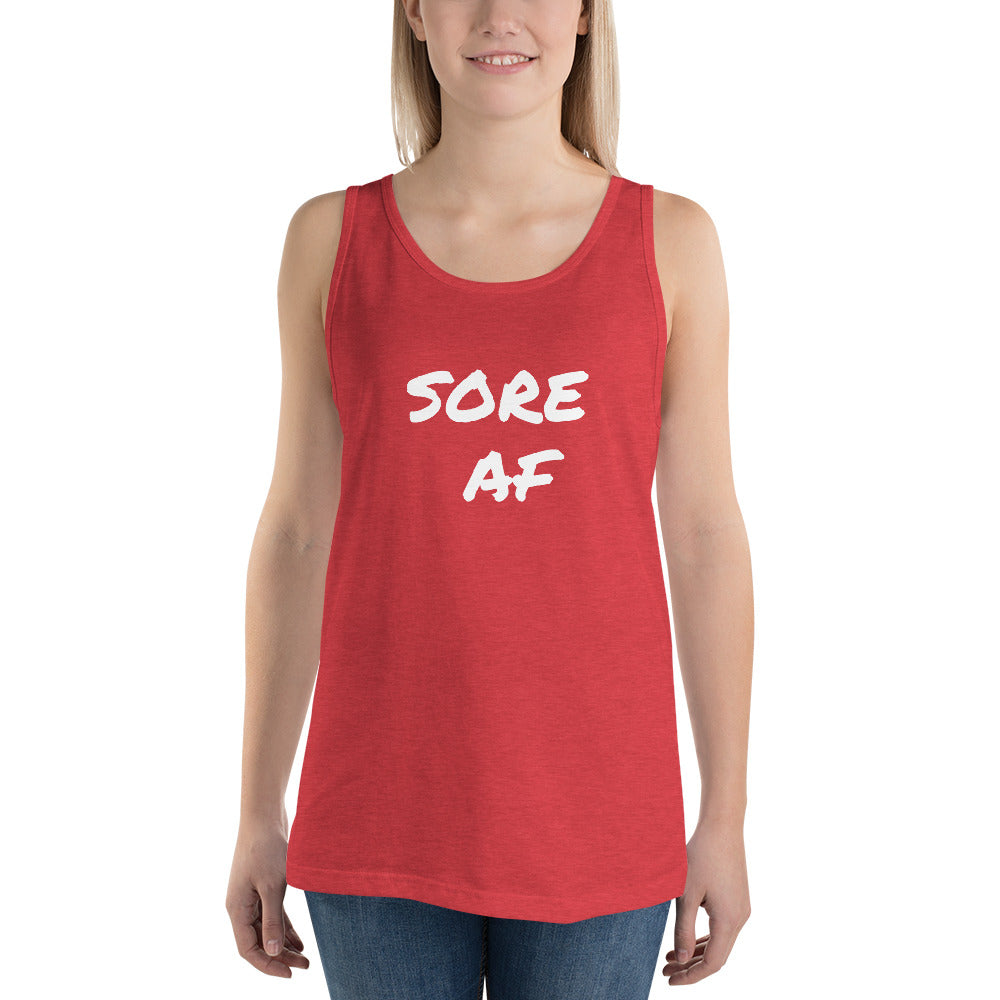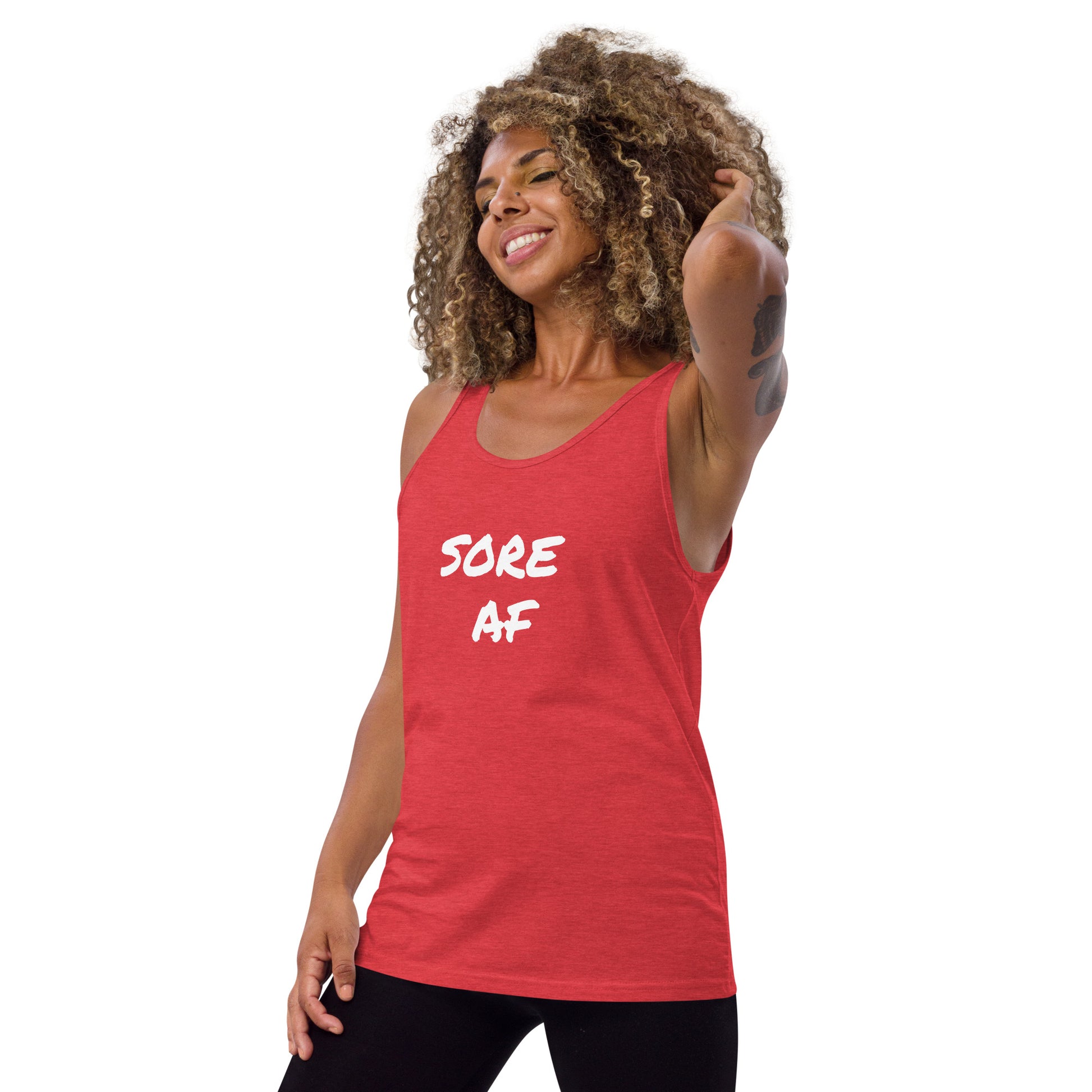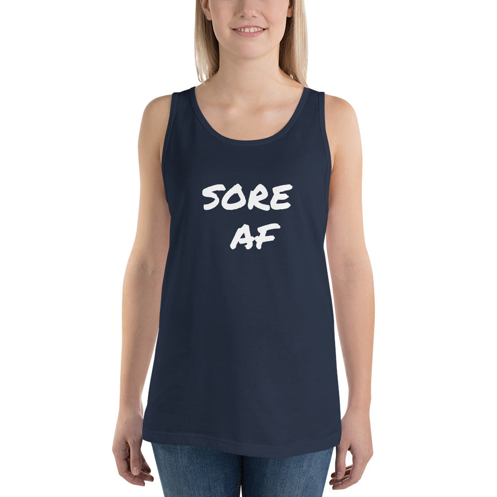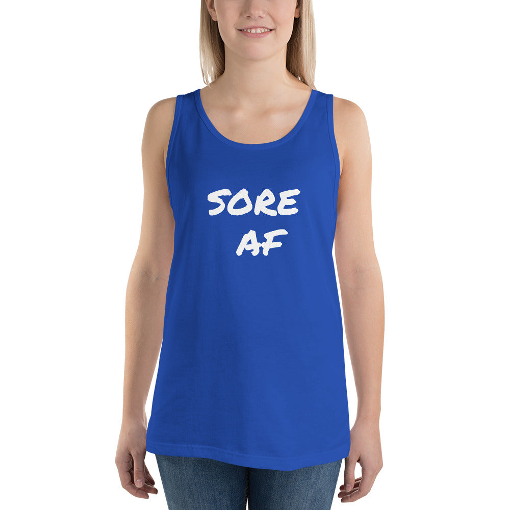 This "Sore AF" tank top is perfect for those hard-core workout days that leave you feeling the burn, or simply as a casual, humorous nod to the pains of staying fit. Its versatile and breathable design makes it ideal for both intense gym sessions and relaxed post-workout hangoutsA classic, staple tank top. A timeless classic intended for anyone looking for great quality and softness.