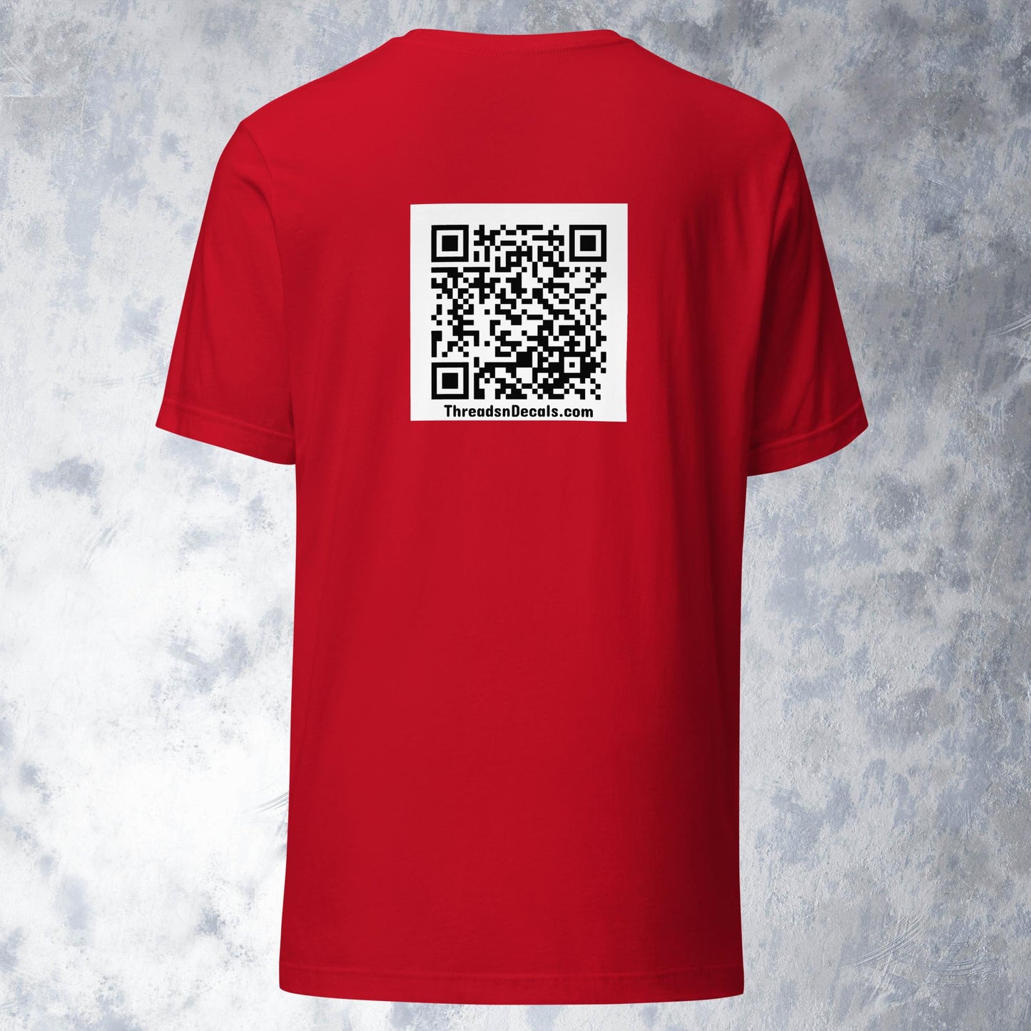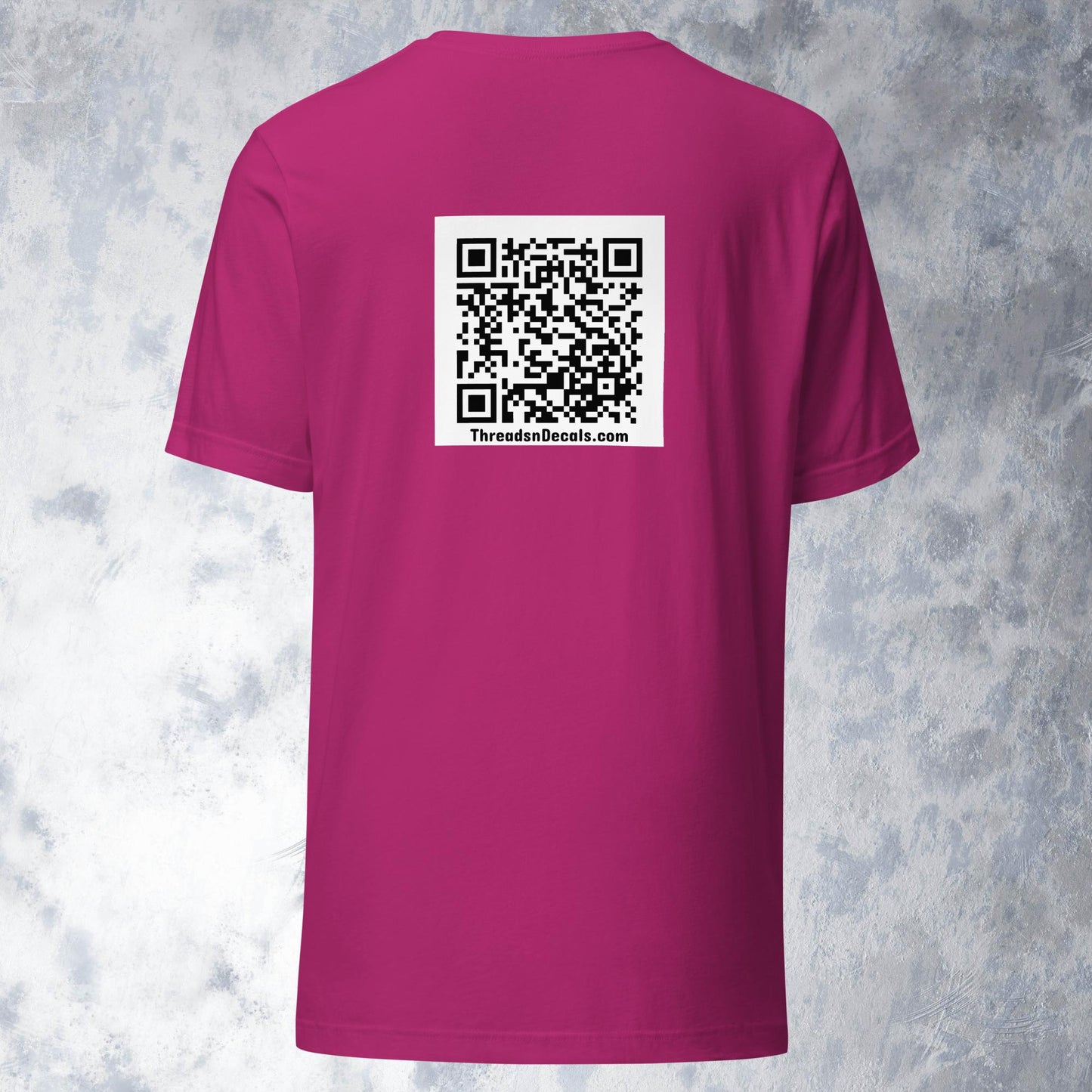 Get ready to turn heads with this unique QR code shirt. The clean front design keeps you casual, while the QR code on the back brings the person scanning it to an uplifting positive message.