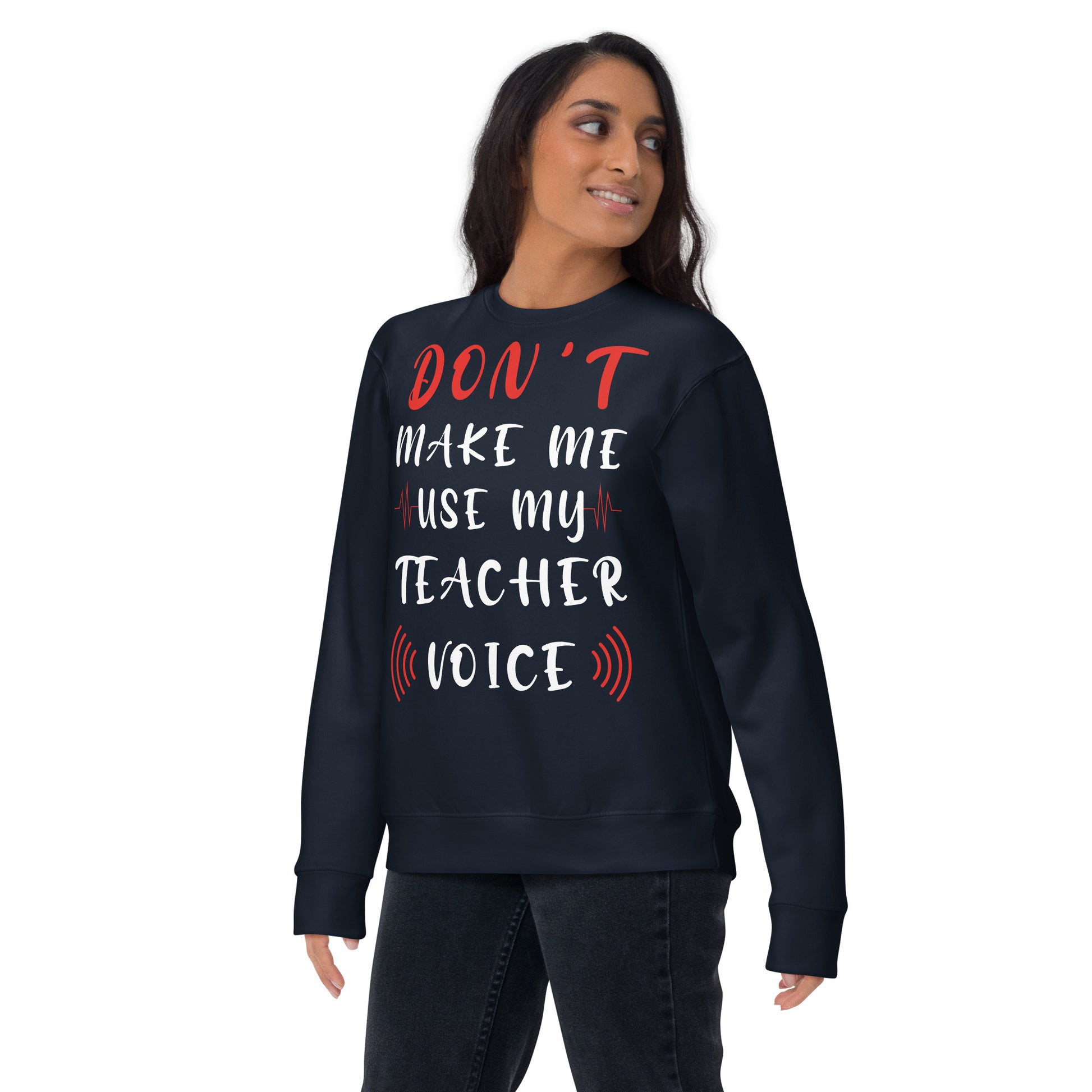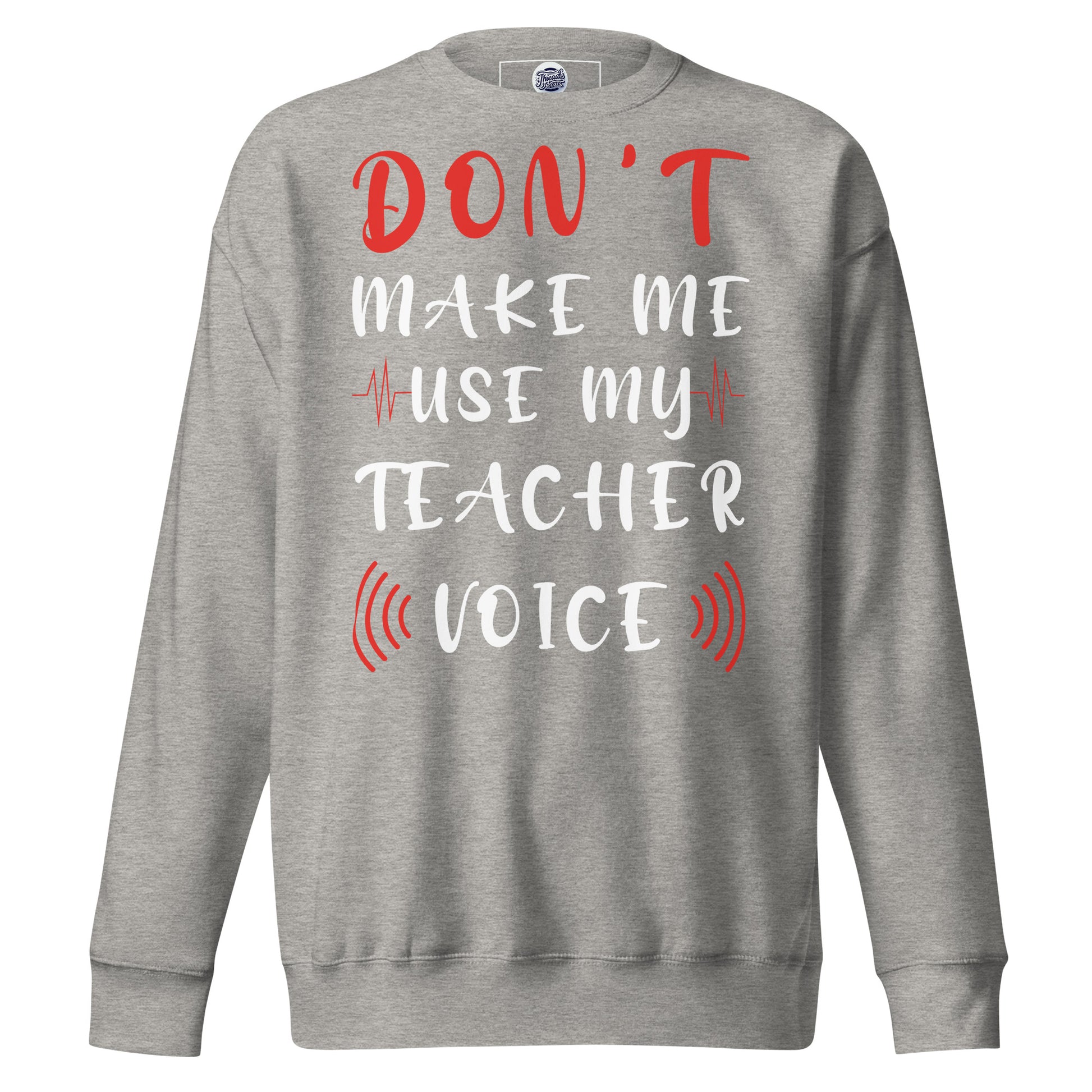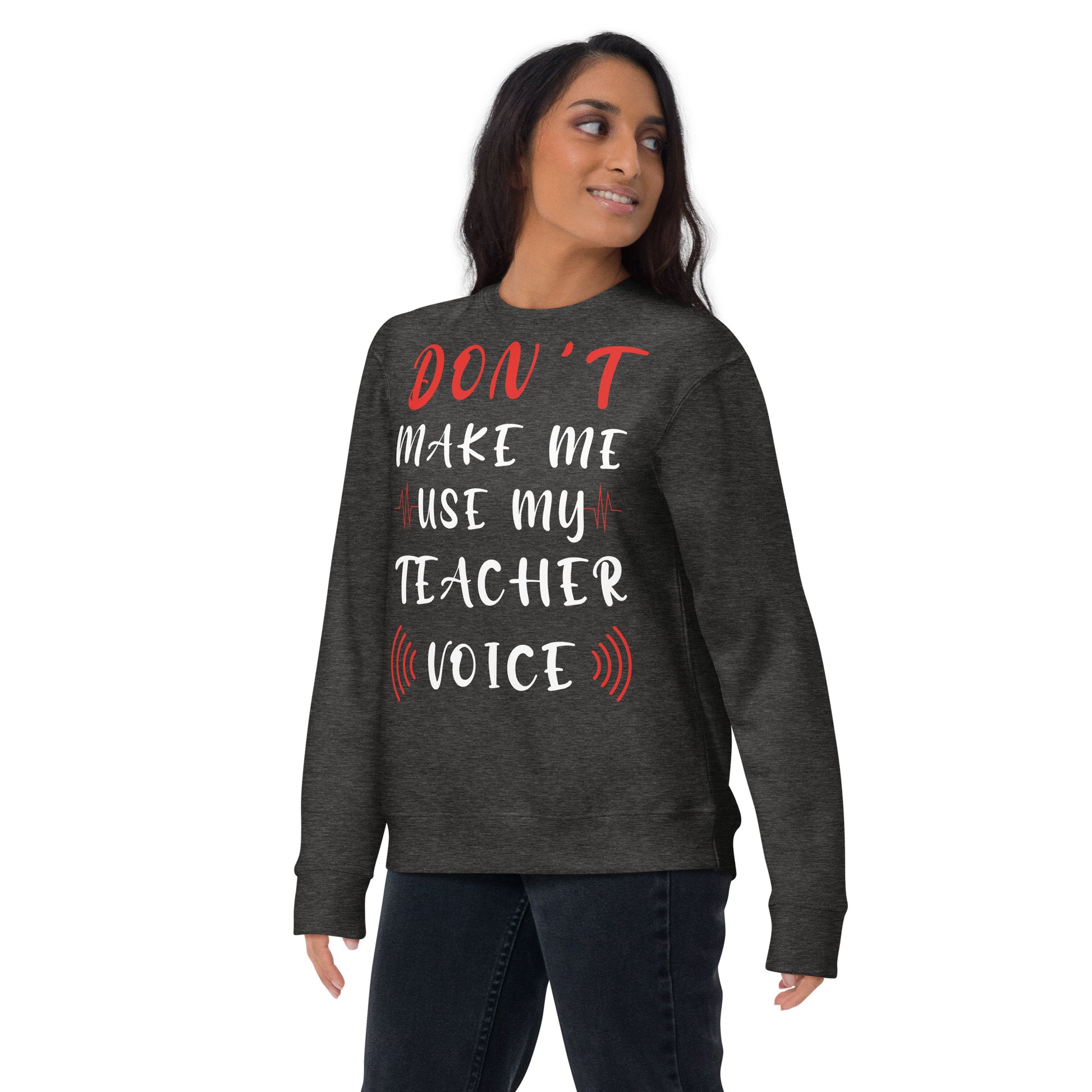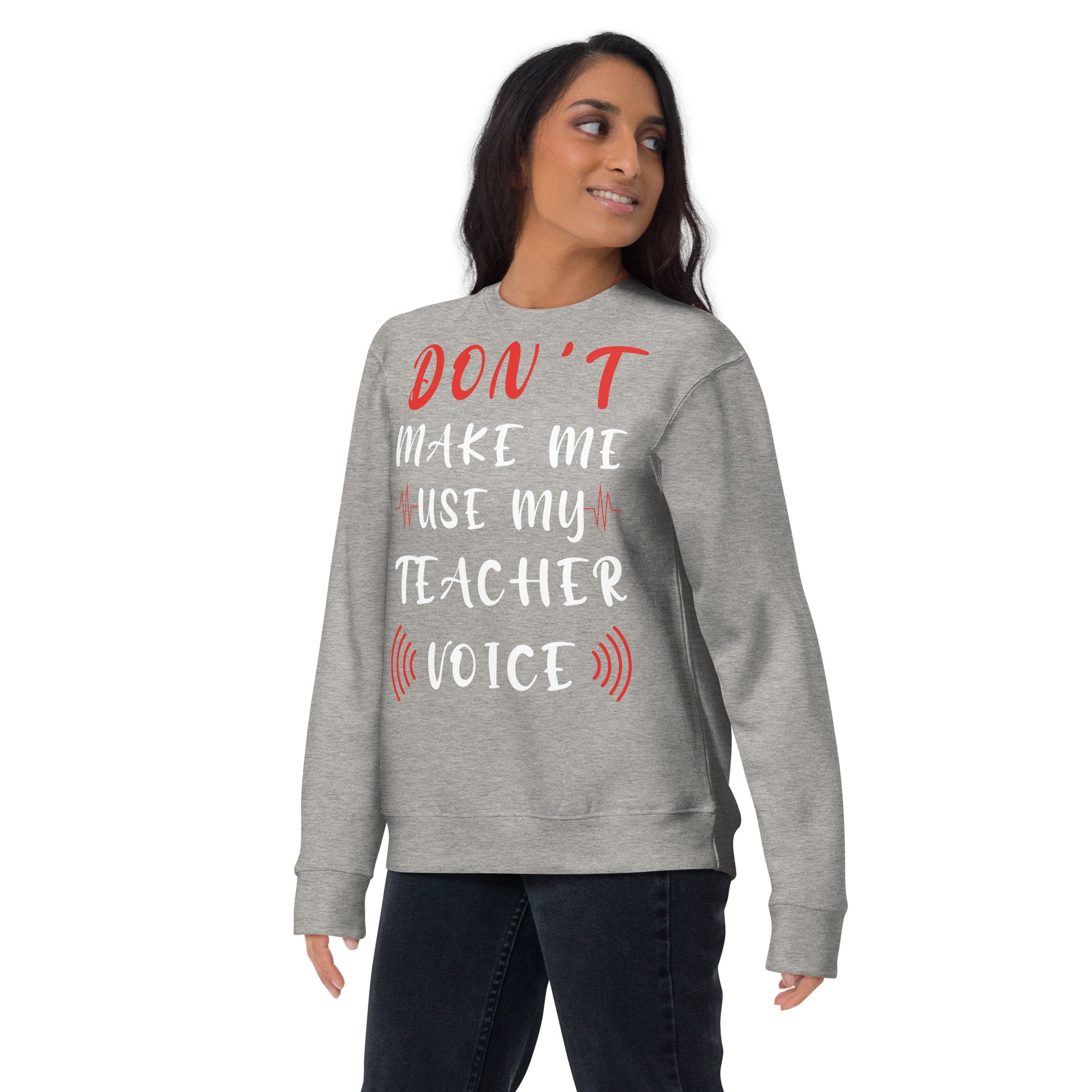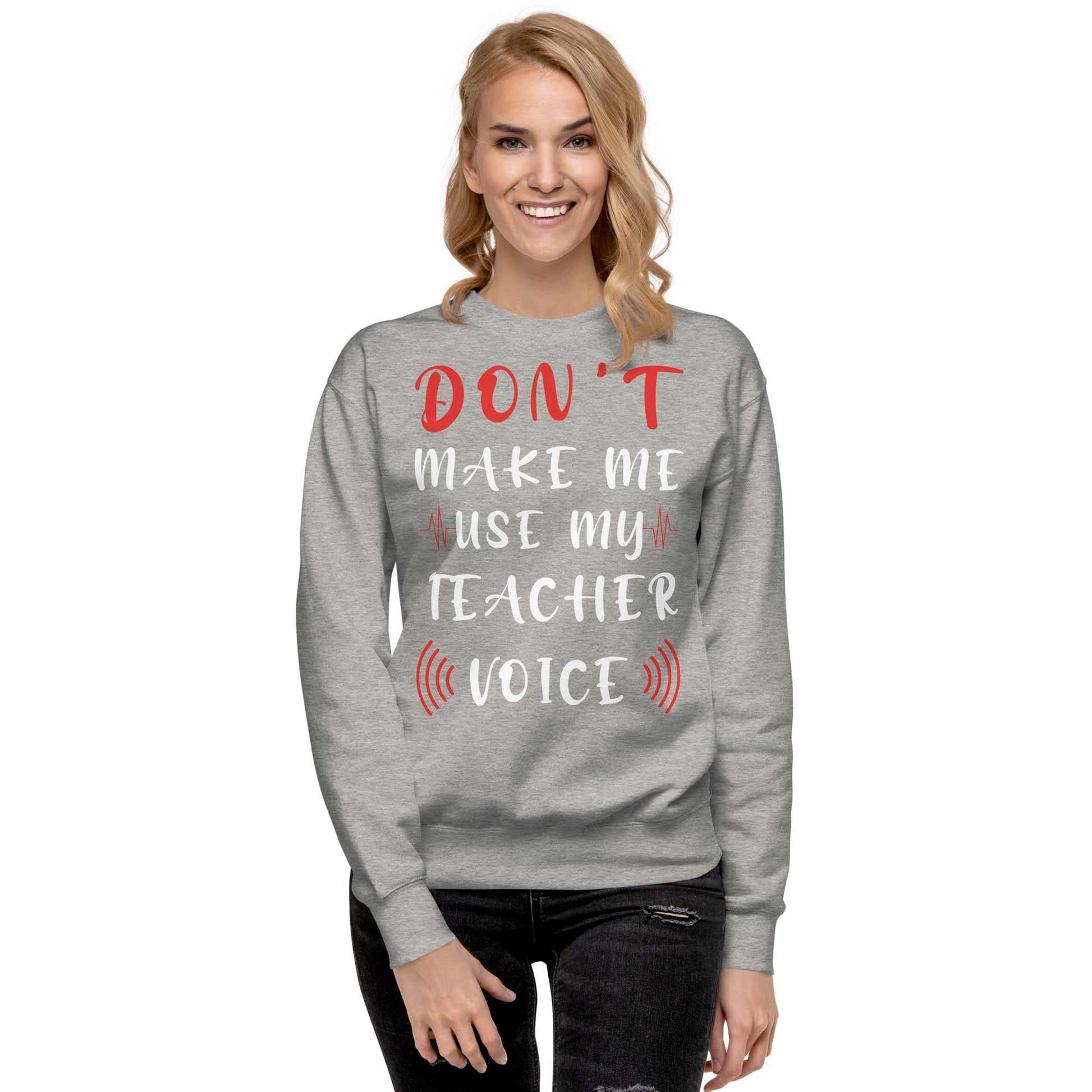 Stand at the head of the style class with our "Teacher Voice" sweatshirt, where humor meets command in a comfy cotton blend. The shirt playfully warns, "Don't Make Me Use My Teacher Voice," making it a wardrobe staple for educators with a sense of fun and a touch of sass. With its eye-catching mix of bold and cursive fonts, wrapped in a soundwave design, this sweatshirt is an all-day reminder of the power held within a teacher's call. It's for the moments when a look over the glasses just won't cut it, or when the classroom gets just a tad too rowdy. Perfect for in-service days, casual Fridays, or just a trip to the store, let this tee be your friendly reminder to the world: the voice that educates also resonates! Rock a classic sweatshirt silhouette with ribbed crew neck, long sleeve cuffs, and a flat hem. Layer it up or wear it on its own for a contemporary streetwear look. With the soft fleece inside and comfortable fit, it’s sure to become your favorite everyday sweater right away!