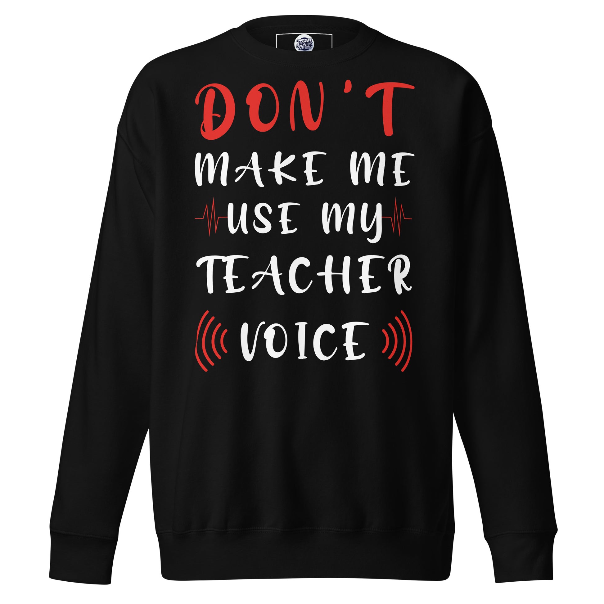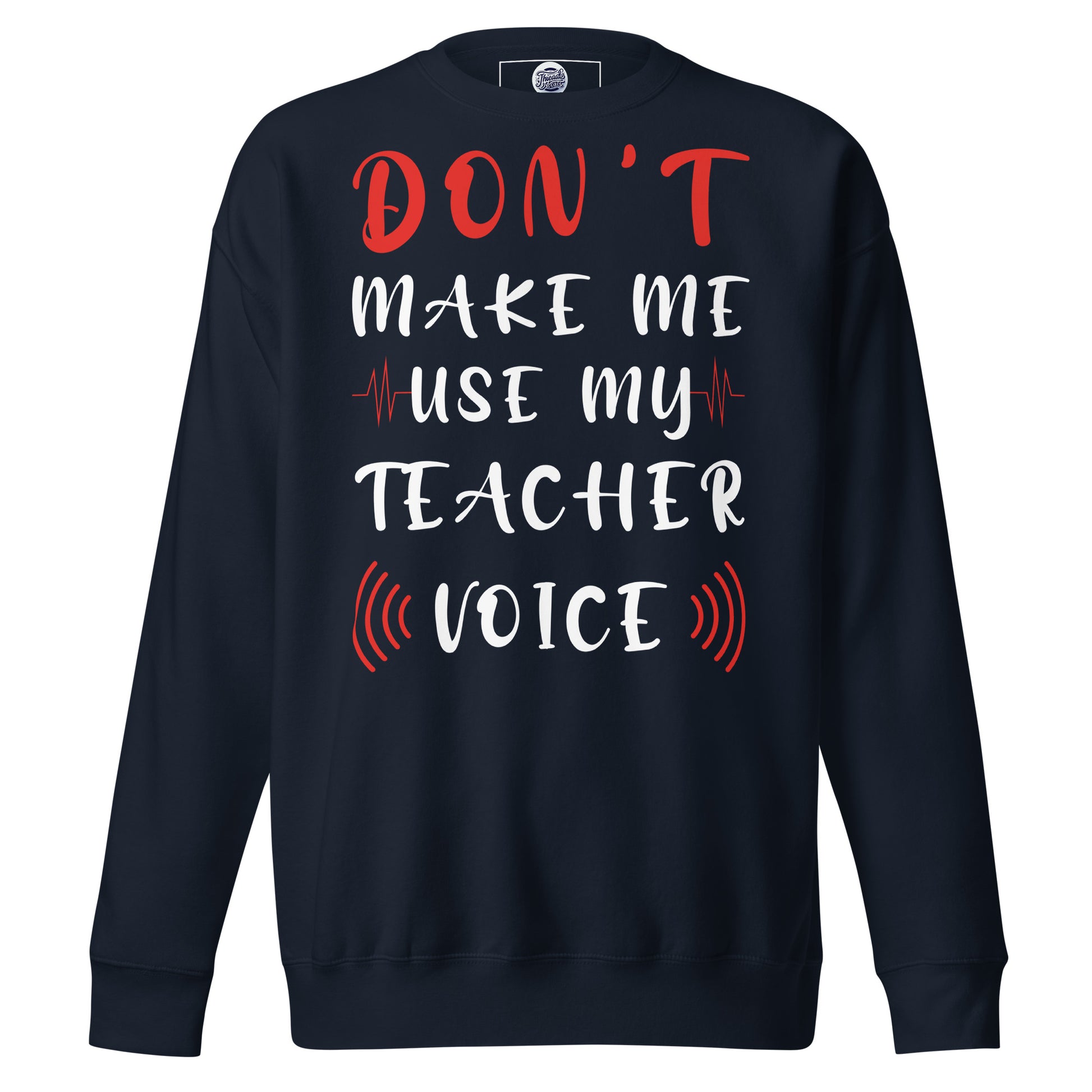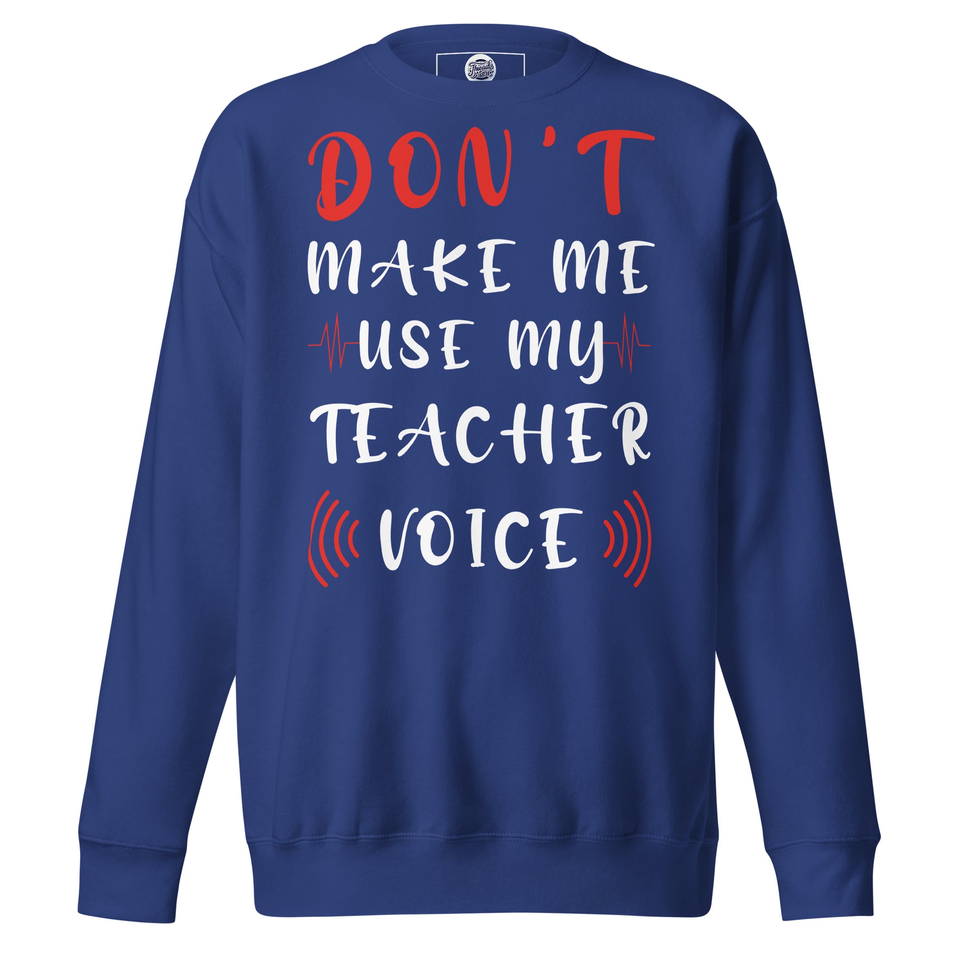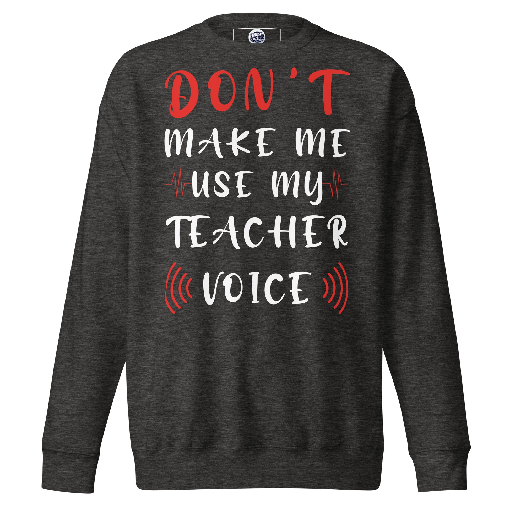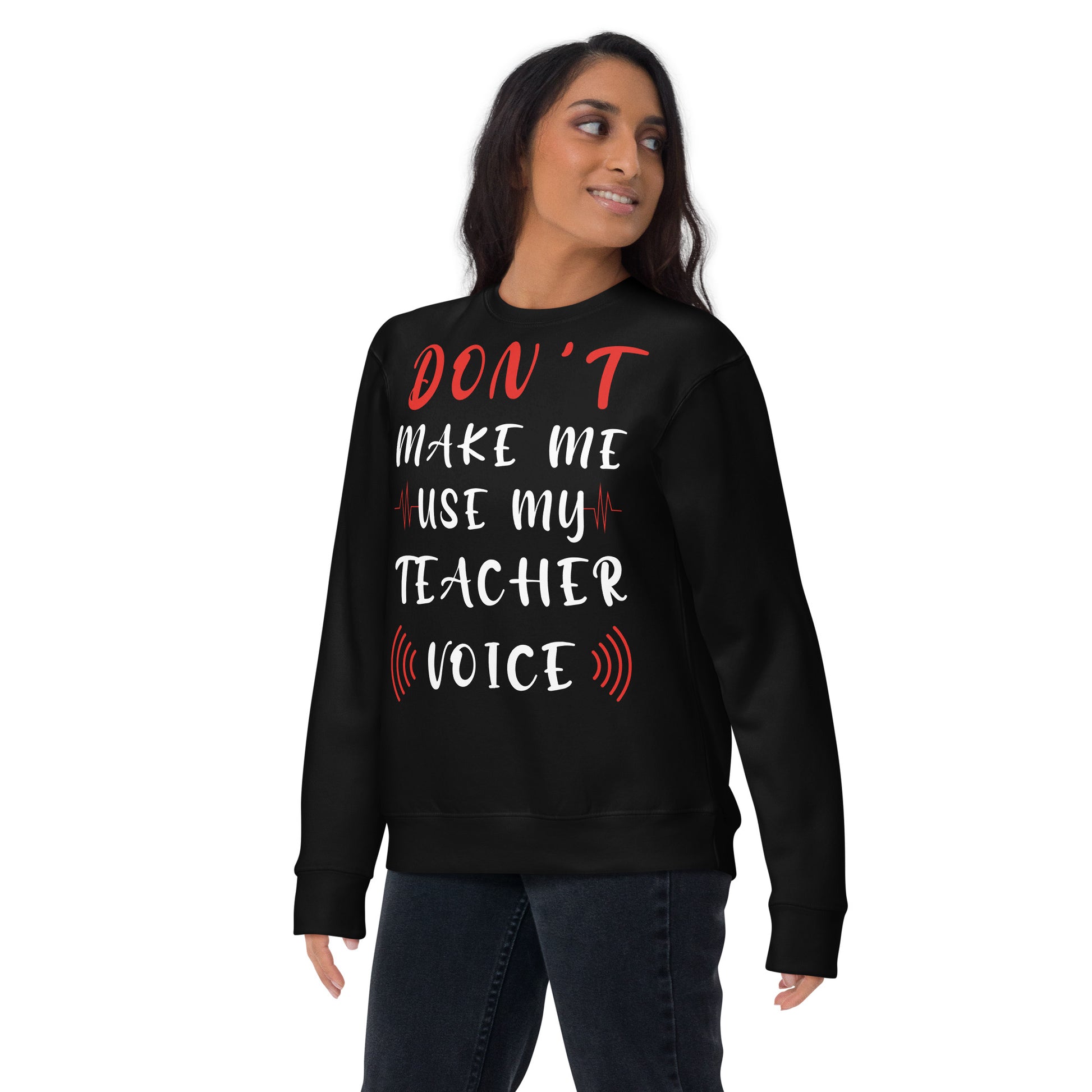 Stand at the head of the style class with our "Teacher Voice" sweatshirt, where humor meets command in a comfy cotton blend. The shirt playfully warns, "Don't Make Me Use My Teacher Voice," making it a wardrobe staple for educators with a sense of fun and a touch of sass. With its eye-catching mix of bold and cursive fonts, wrapped in a soundwave design, this sweatshirt is an all-day reminder of the power held within a teacher's call. It's for the moments when a look over the glasses just won't cut it, or when the classroom gets just a tad too rowdy. Perfect for in-service days, casual Fridays, or just a trip to the store, let this tee be your friendly reminder to the world: the voice that educates also resonates! Rock a classic sweatshirt silhouette with ribbed crew neck, long sleeve cuffs, and a flat hem. Layer it up or wear it on its own for a contemporary streetwear look. With the soft fleece inside and comfortable fit, it’s sure to become your favorite everyday sweater right away!