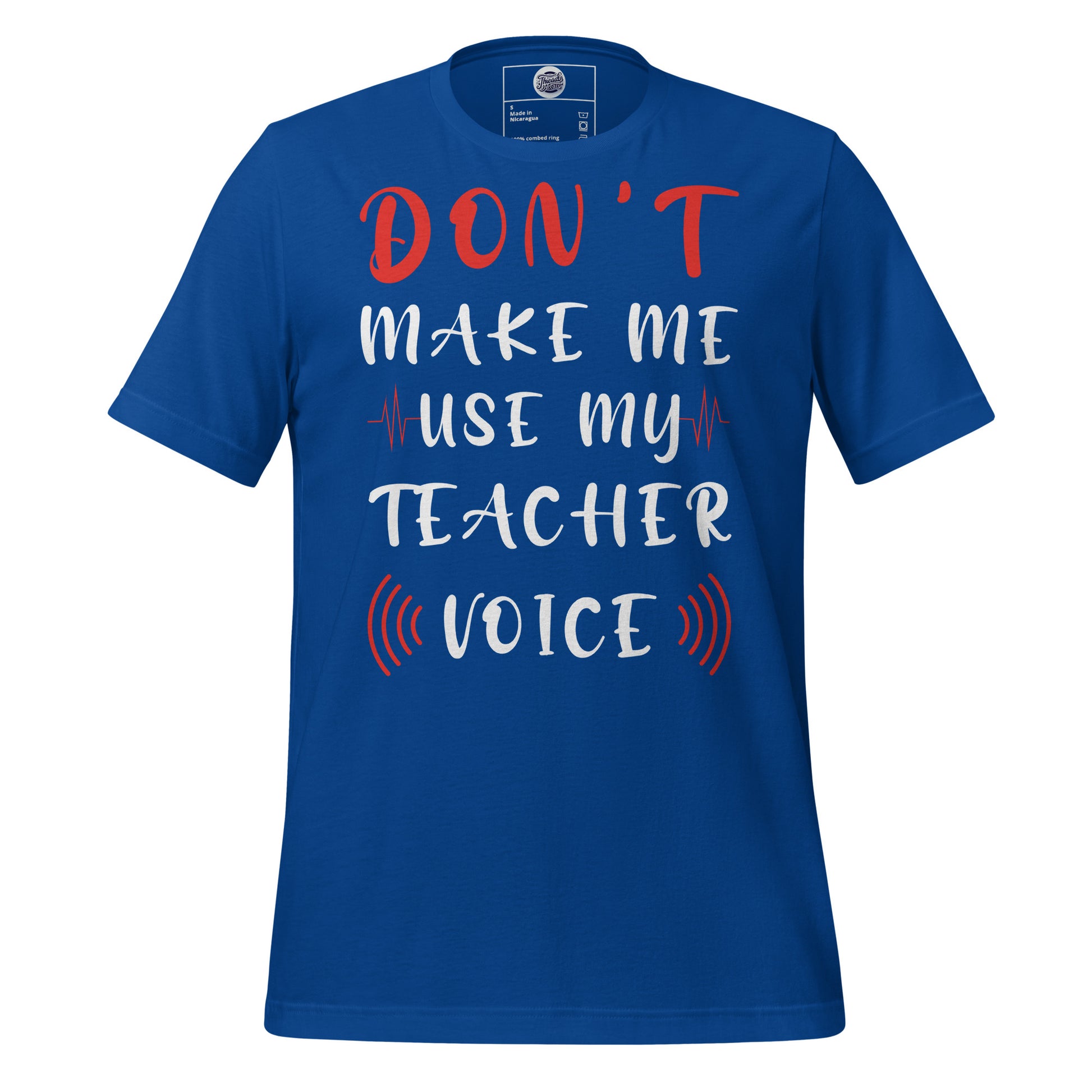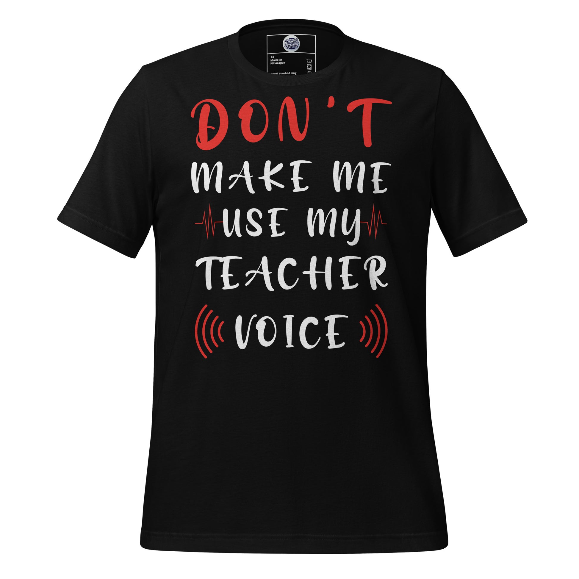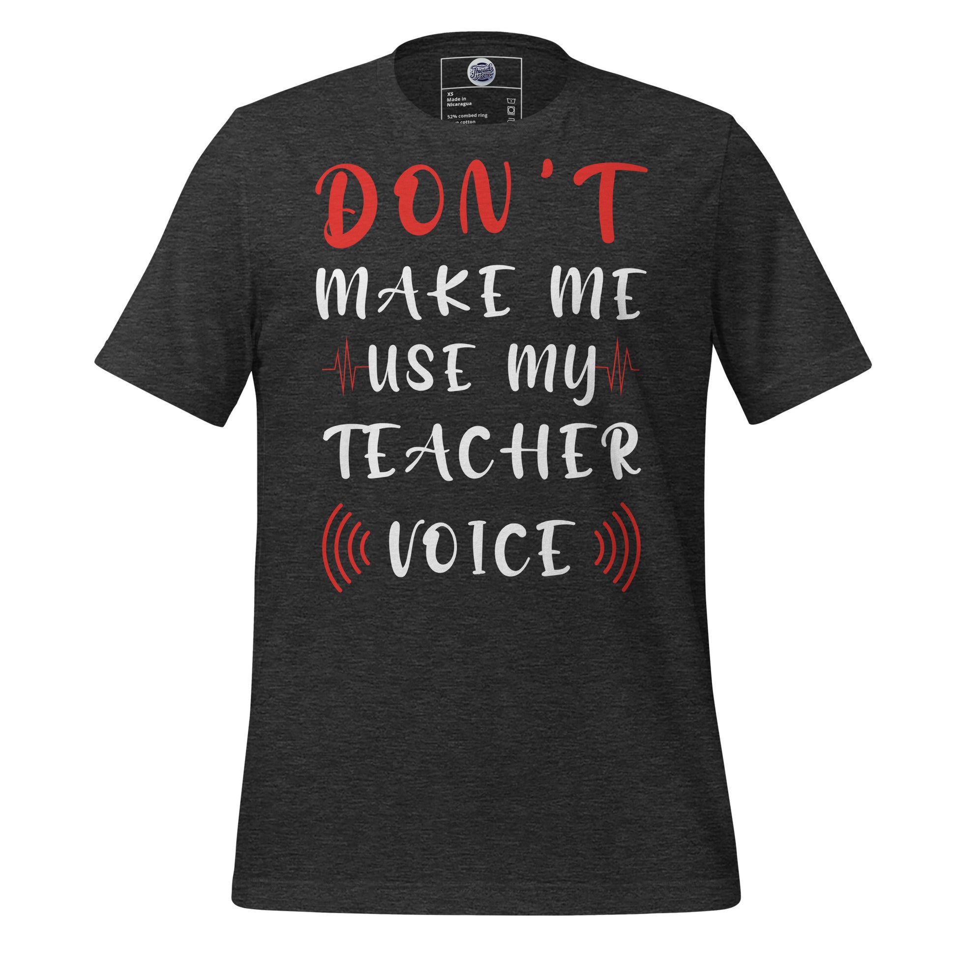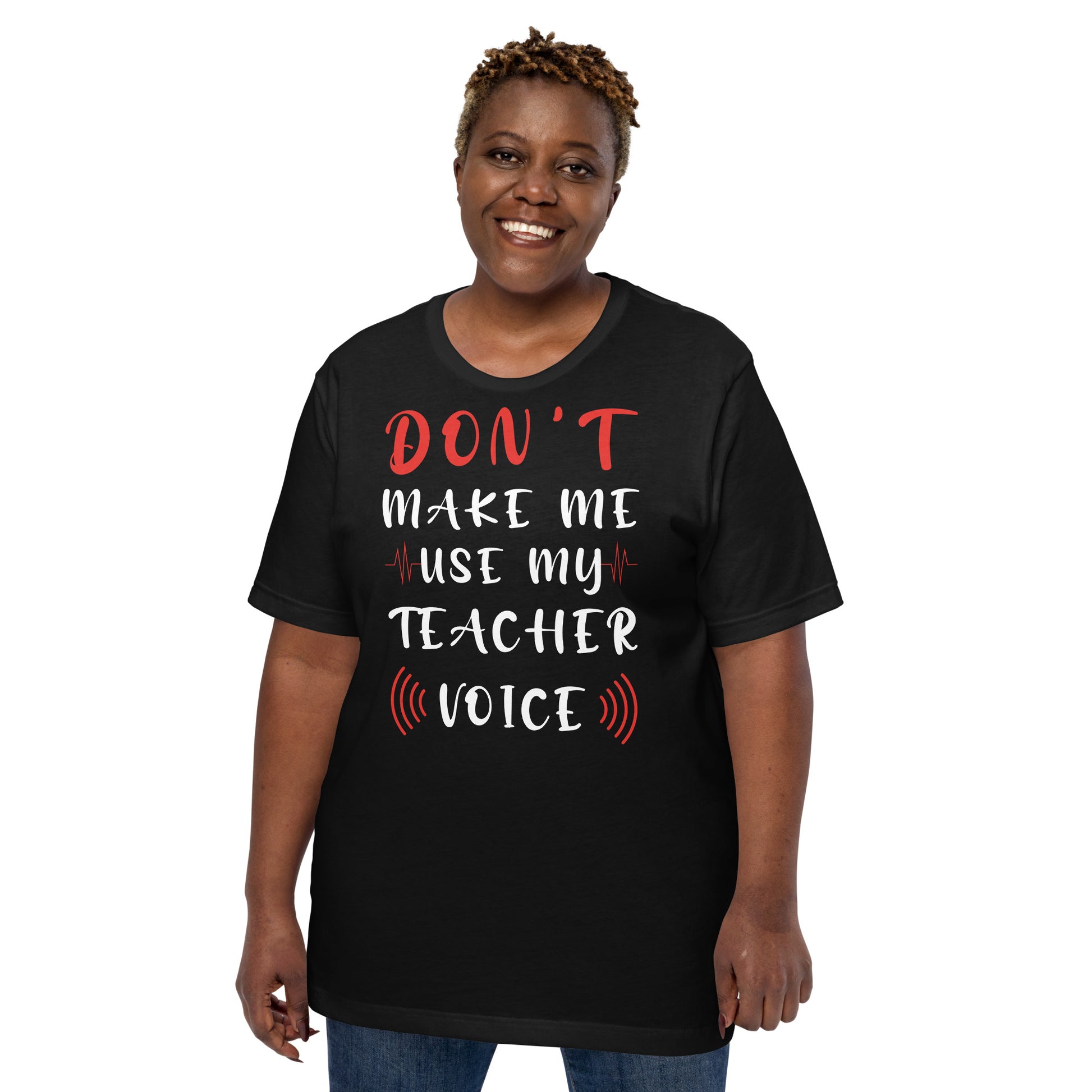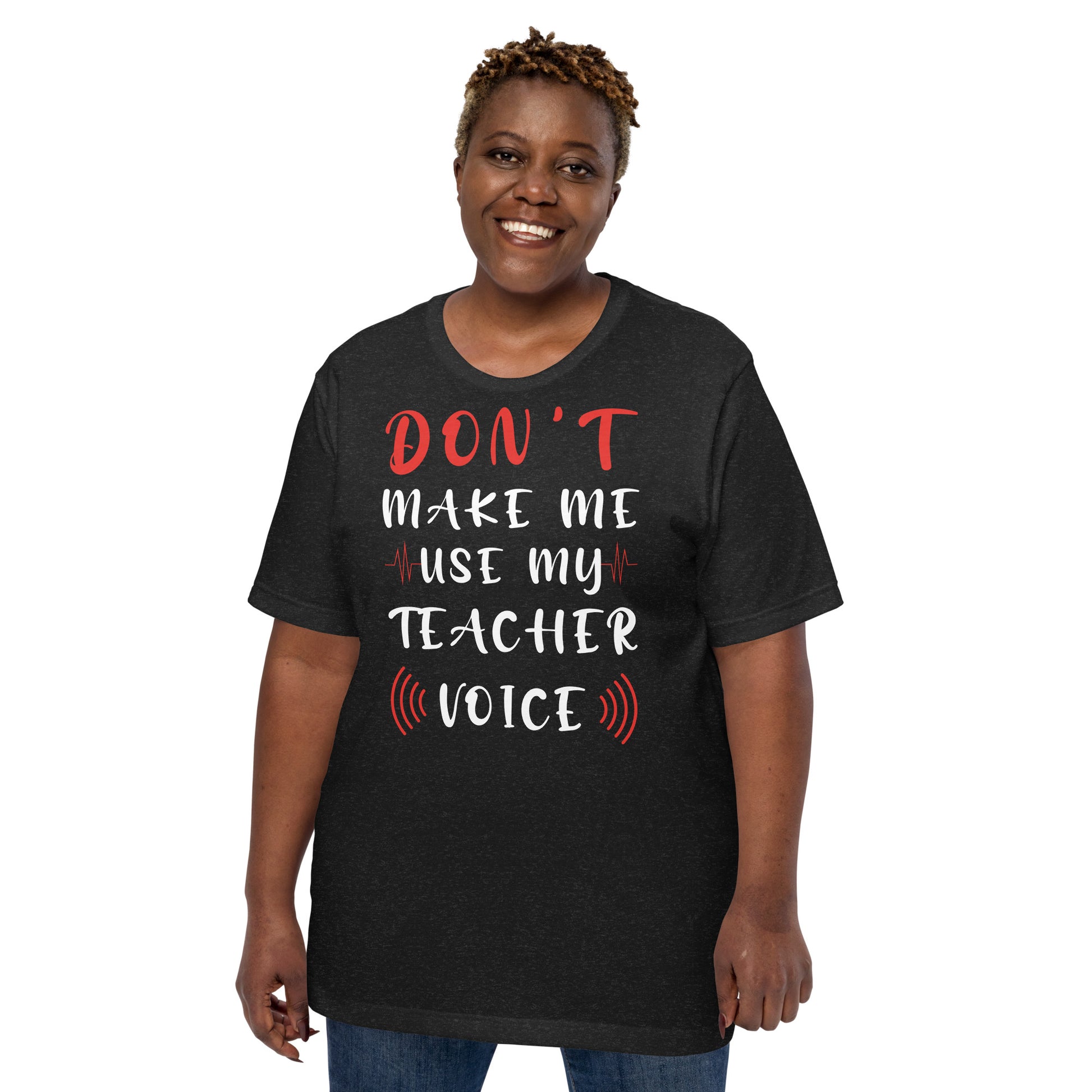 Stand at the head of the style class with our "Teacher Voice" tee, where humor meets command in a comfy cotton blend. The shirt playfully warns, "Don't Make Me Use My Teacher Voice," making it a wardrobe staple for educators with a sense of fun and a touch of sass. With its eye-catching mix of bold and cursive fonts, wrapped in a soundwave design, this tee is an all-day reminder of the power held within a teacher's call. It's for the moments when a look over the glasses just won't cut it, or when the classroom gets just a tad too rowdy. Perfect for in-service days, casual Fridays, or just a trip to the store, let this tee be your friendly reminder to the world: the voice that educates also resonates! This t-shirt is everything you've dreamed of and more. It feels soft and lightweight, with the right amount of stretch. It's comfortable and flattering for all.