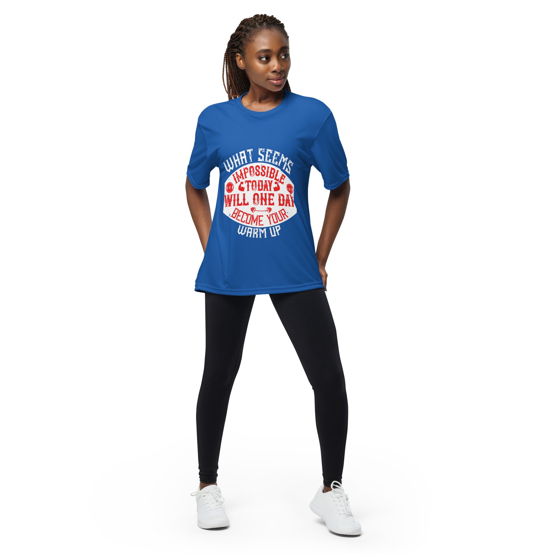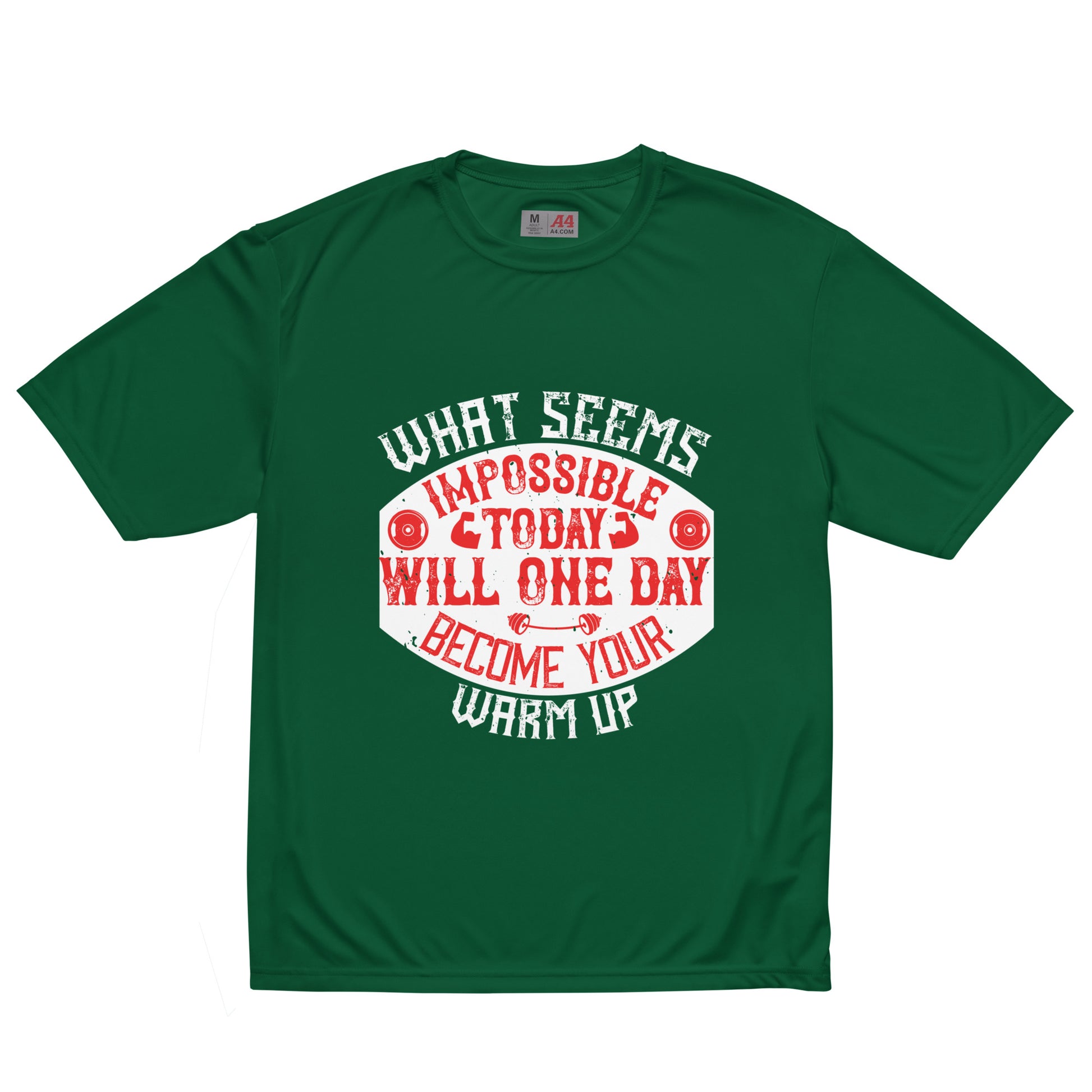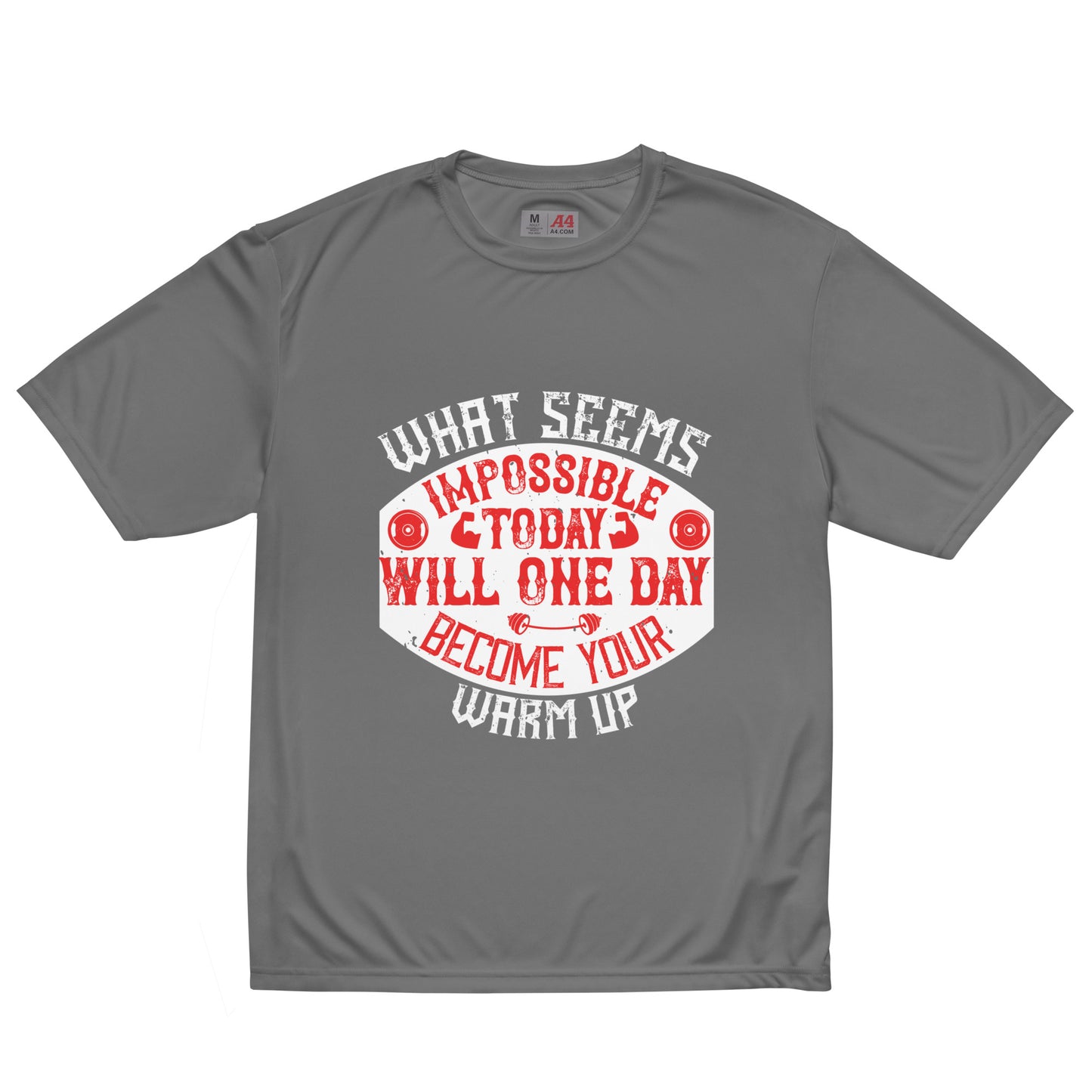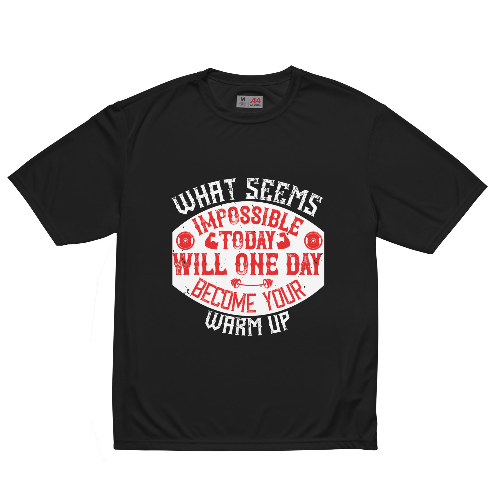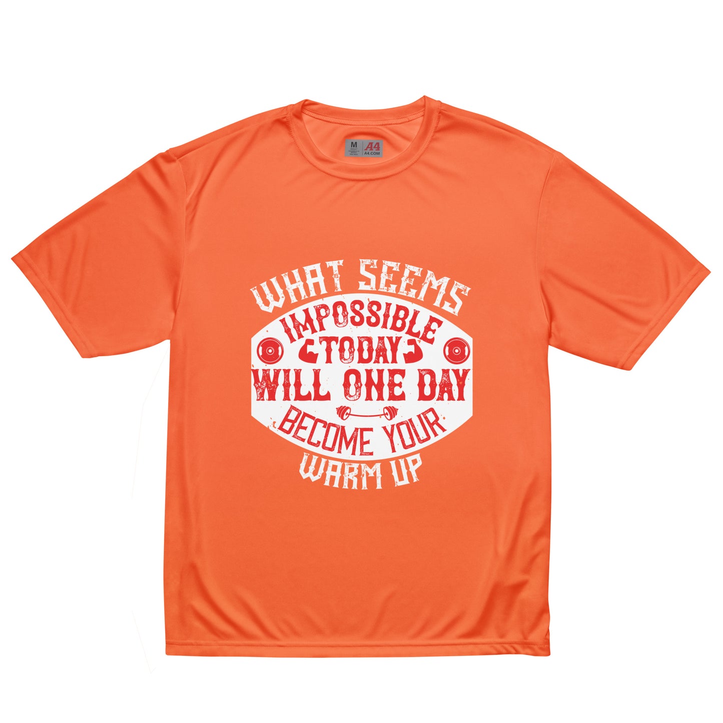 Throw on our "Warm-Up Wisdom" Performance T-Shirt, and get fired up for the transformation that awaits! This isn't just a hoodie; it's a banner of progress, boldly proclaiming, "What seems impossible today will one day become your warm-up." Wrapped in the fiery red of passion and the resilience of a warrior, this statement circles you with the energy of a thousand workouts. It's designed for those who see each day not as an obstacle but as an opportunity, for the dreamers who dare to warm up with weights that others only dream of lifting. As comfortable as the confidence you'll feel when you crush your goals, this hoodie is for the relentless, the unstoppable, the ones who know that every impossible is just an 'I'm possible' in disguise. Stay cool, dry, and confident even during the most intense activities in this unisex performance crew neck t-shirt. Made from premium, moisture-wicking fabric with odor resistance, stain release, and UV protection, this shirt’s perfect for going to the gym, playing sports, hiking, or any other activity.