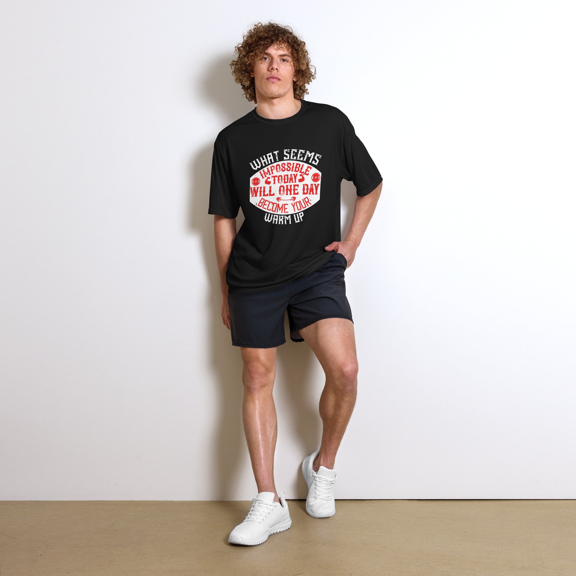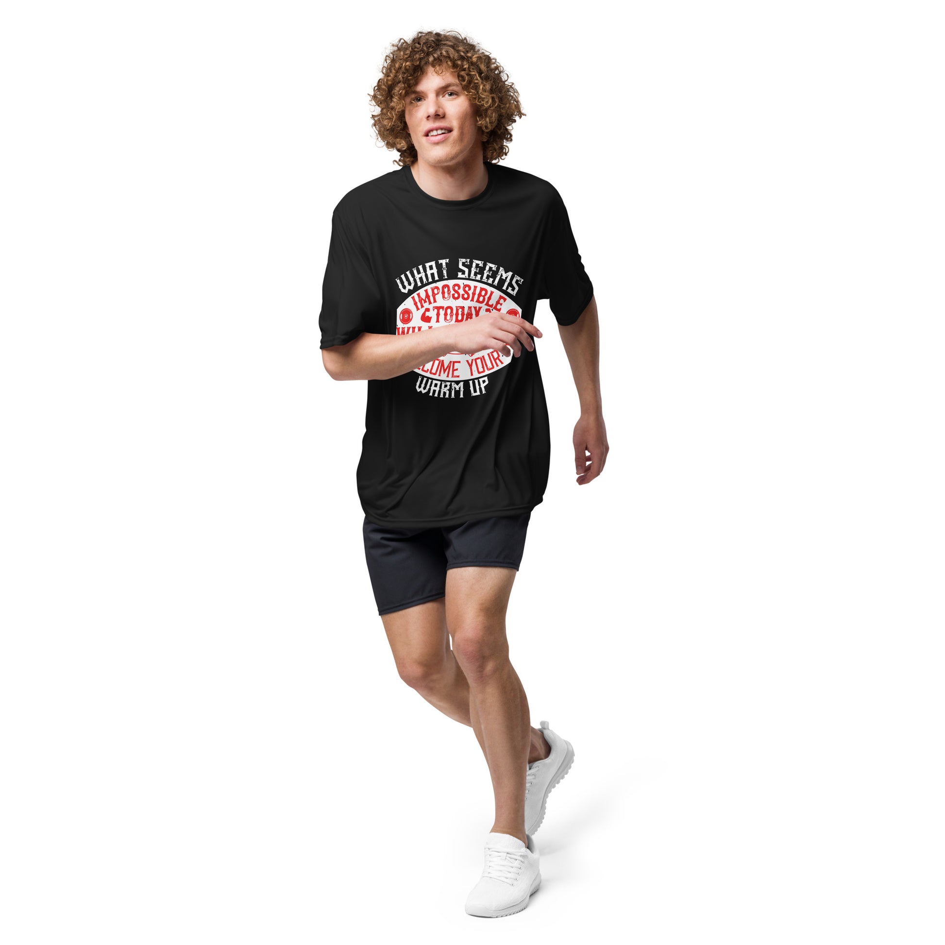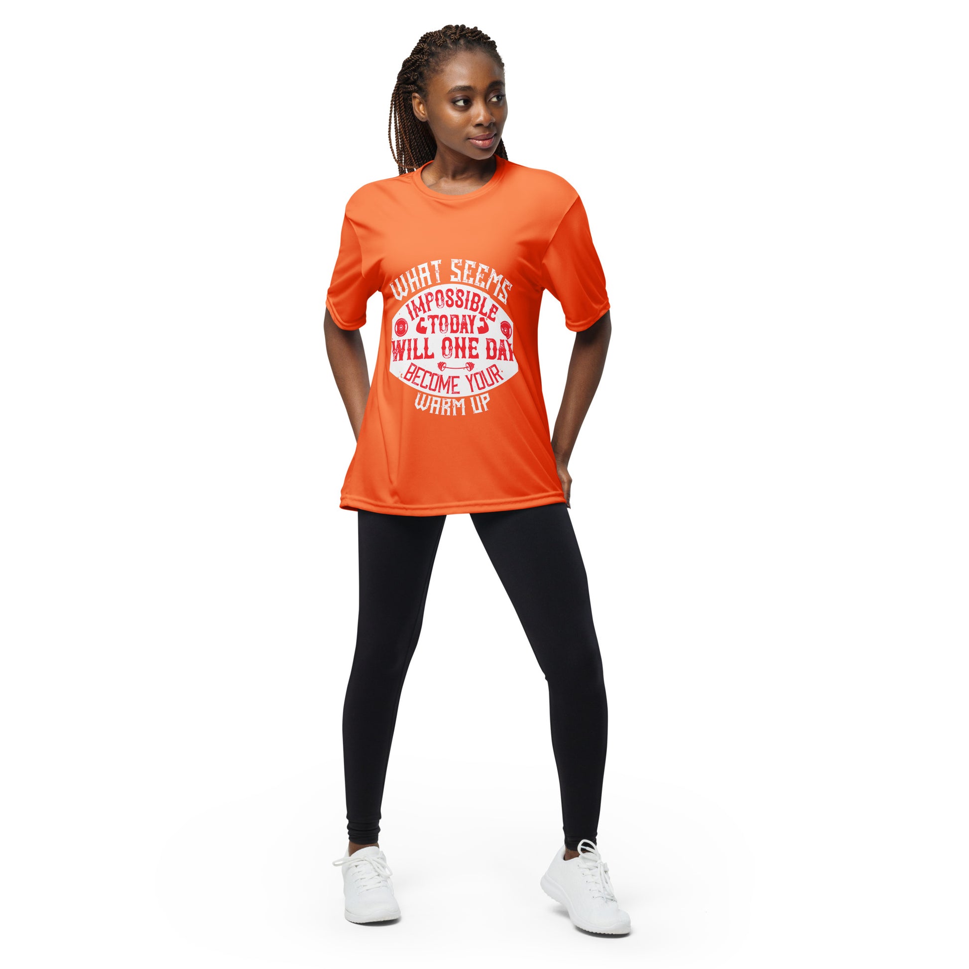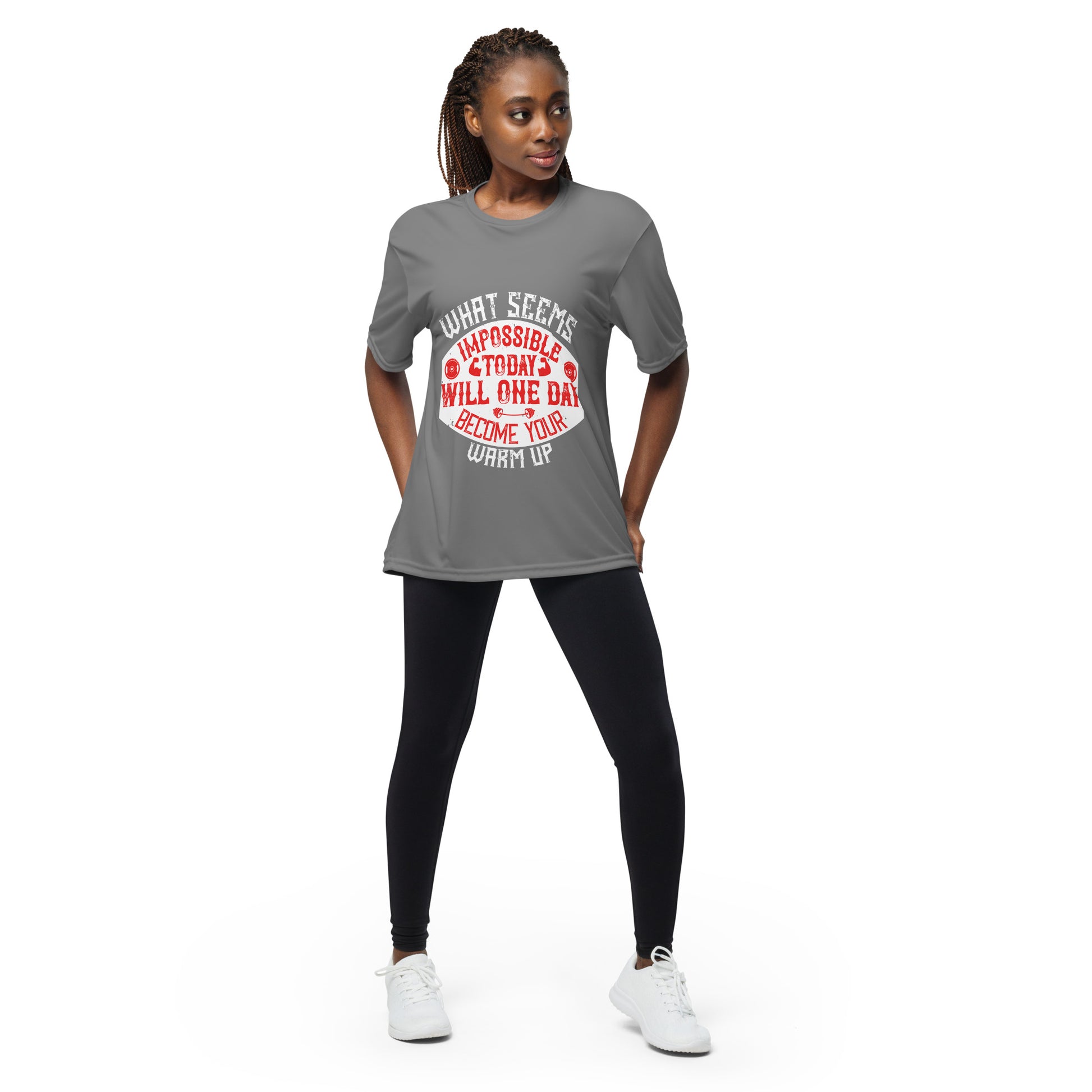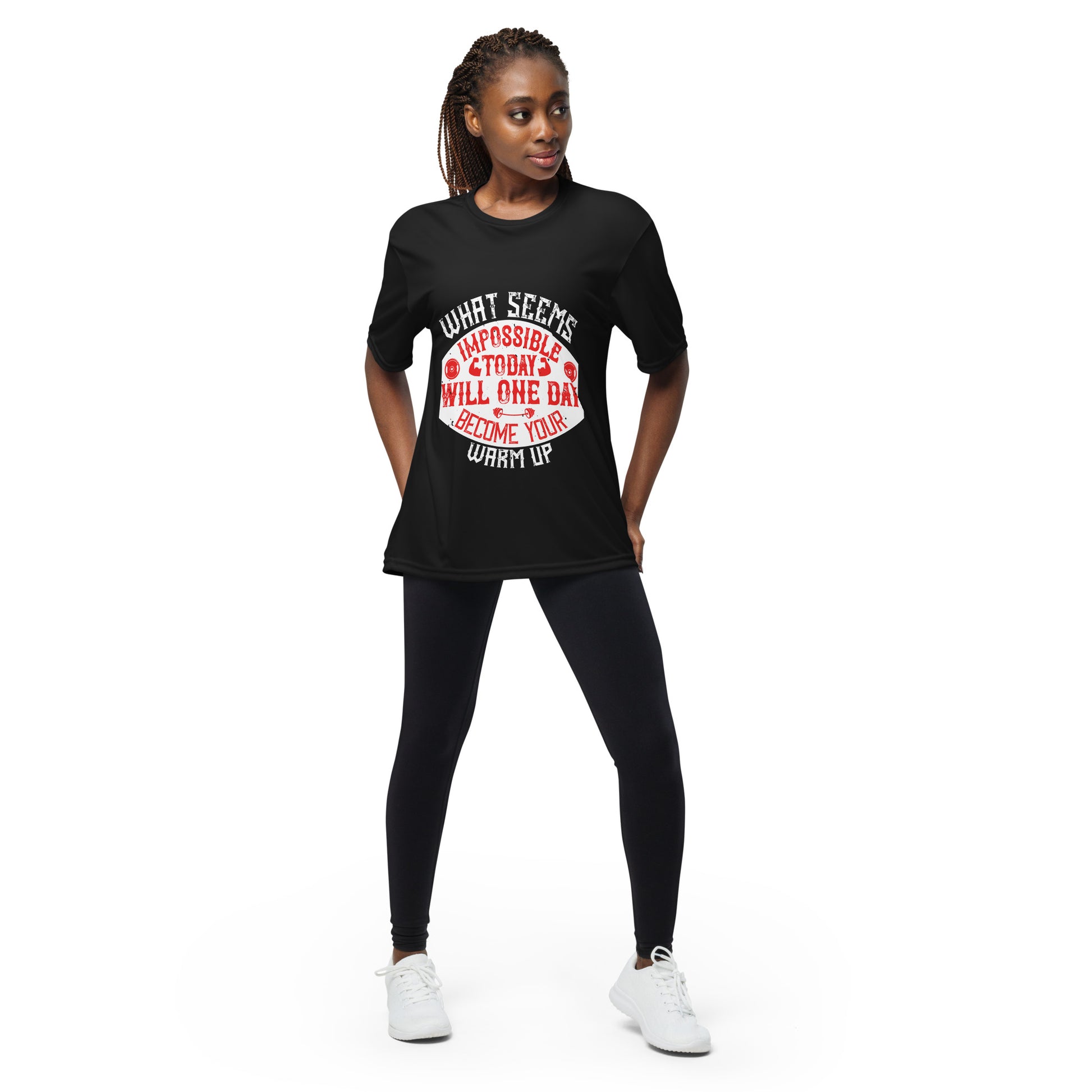 Throw on our "Warm-Up Wisdom" Performance T-Shirt, and get fired up for the transformation that awaits! This isn't just a hoodie; it's a banner of progress, boldly proclaiming, "What seems impossible today will one day become your warm-up." Wrapped in the fiery red of passion and the resilience of a warrior, this statement circles you with the energy of a thousand workouts. It's designed for those who see each day not as an obstacle but as an opportunity, for the dreamers who dare to warm up with weights that others only dream of lifting. As comfortable as the confidence you'll feel when you crush your goals, this hoodie is for the relentless, the unstoppable, the ones who know that every impossible is just an 'I'm possible' in disguise. Stay cool, dry, and confident even during the most intense activities in this unisex performance crew neck t-shirt. Made from premium, moisture-wicking fabric with odor resistance, stain release, and UV protection, this shirt’s perfect for going to the gym, playing sports, hiking, or any other activity.